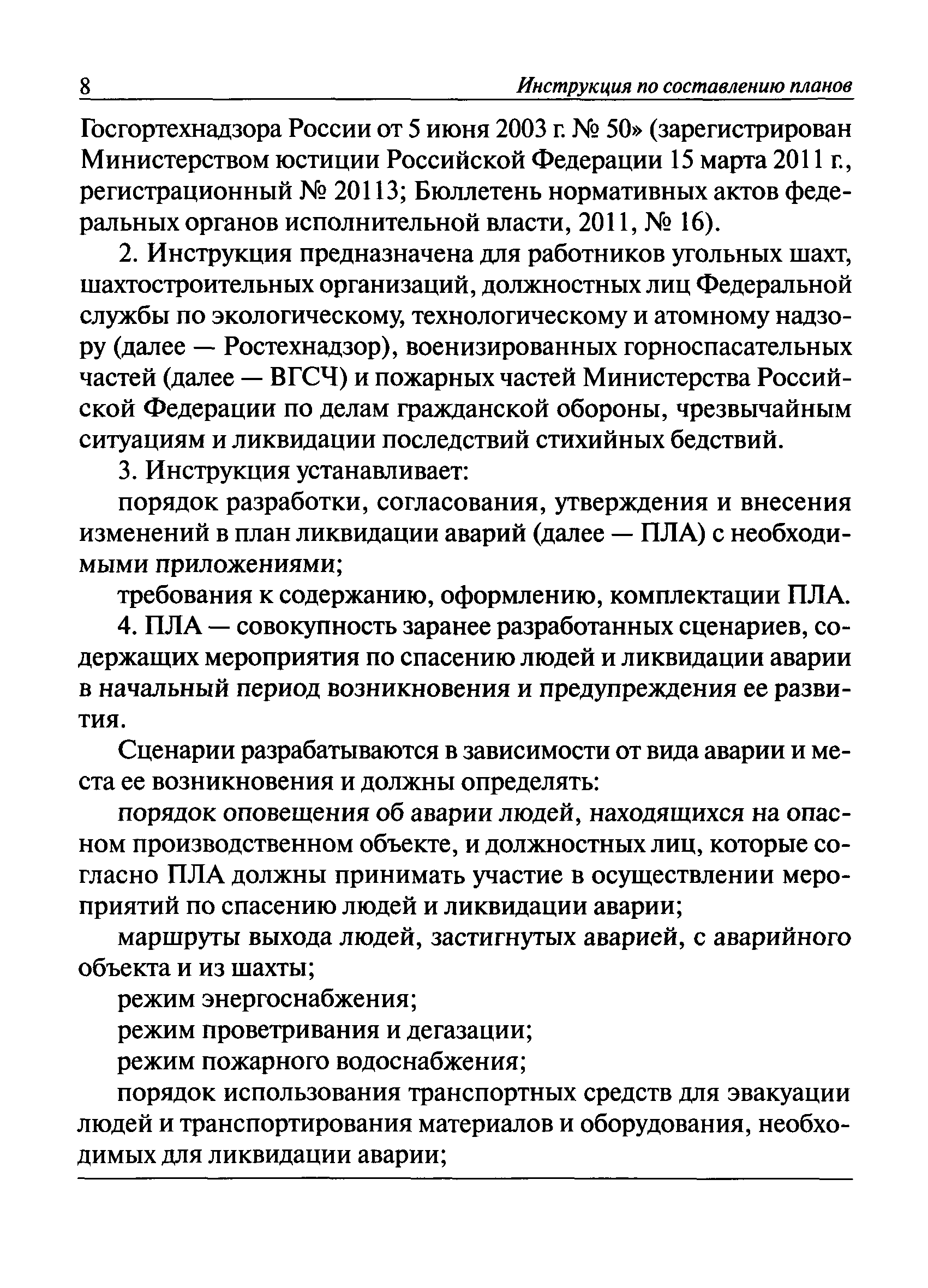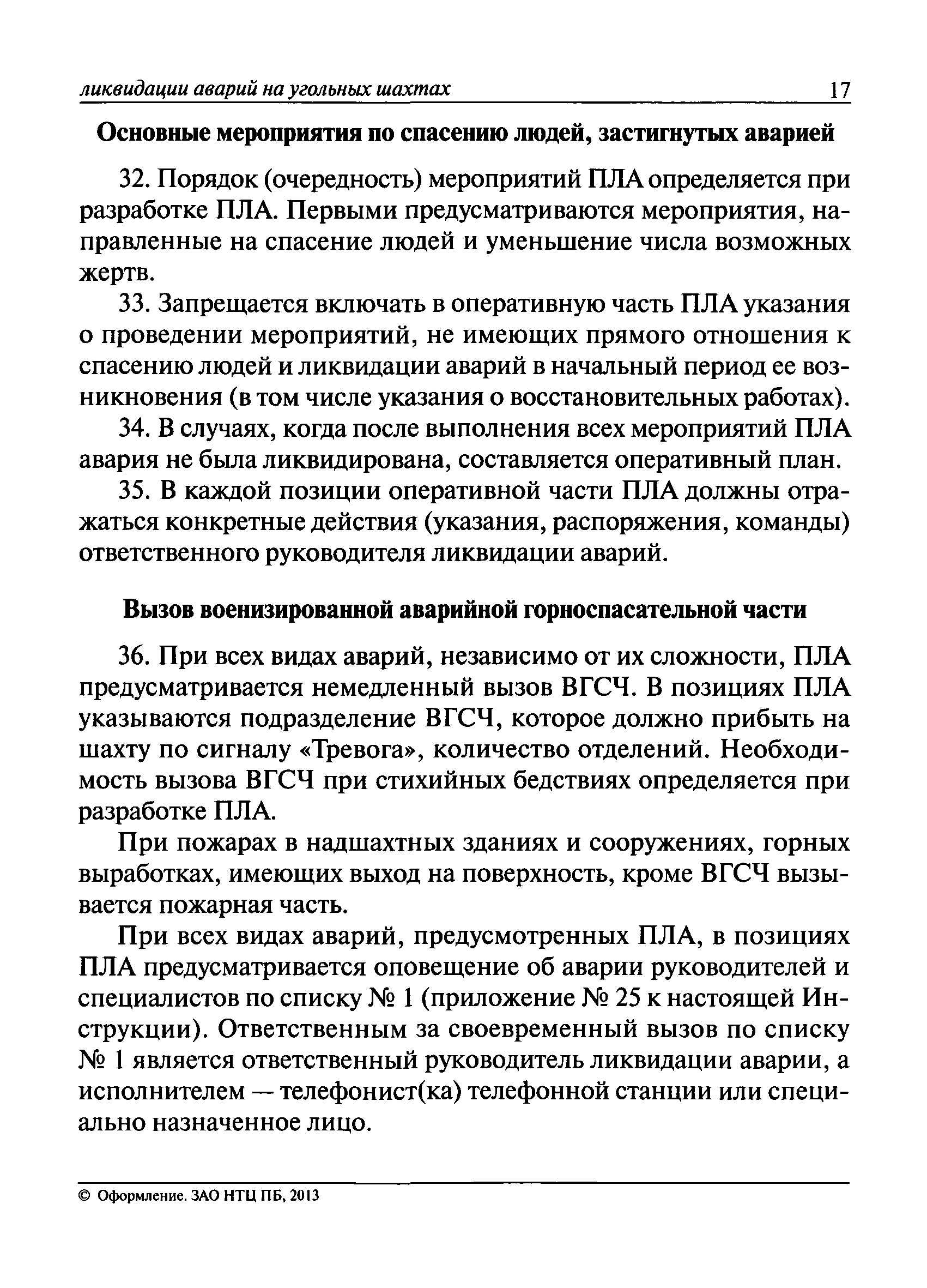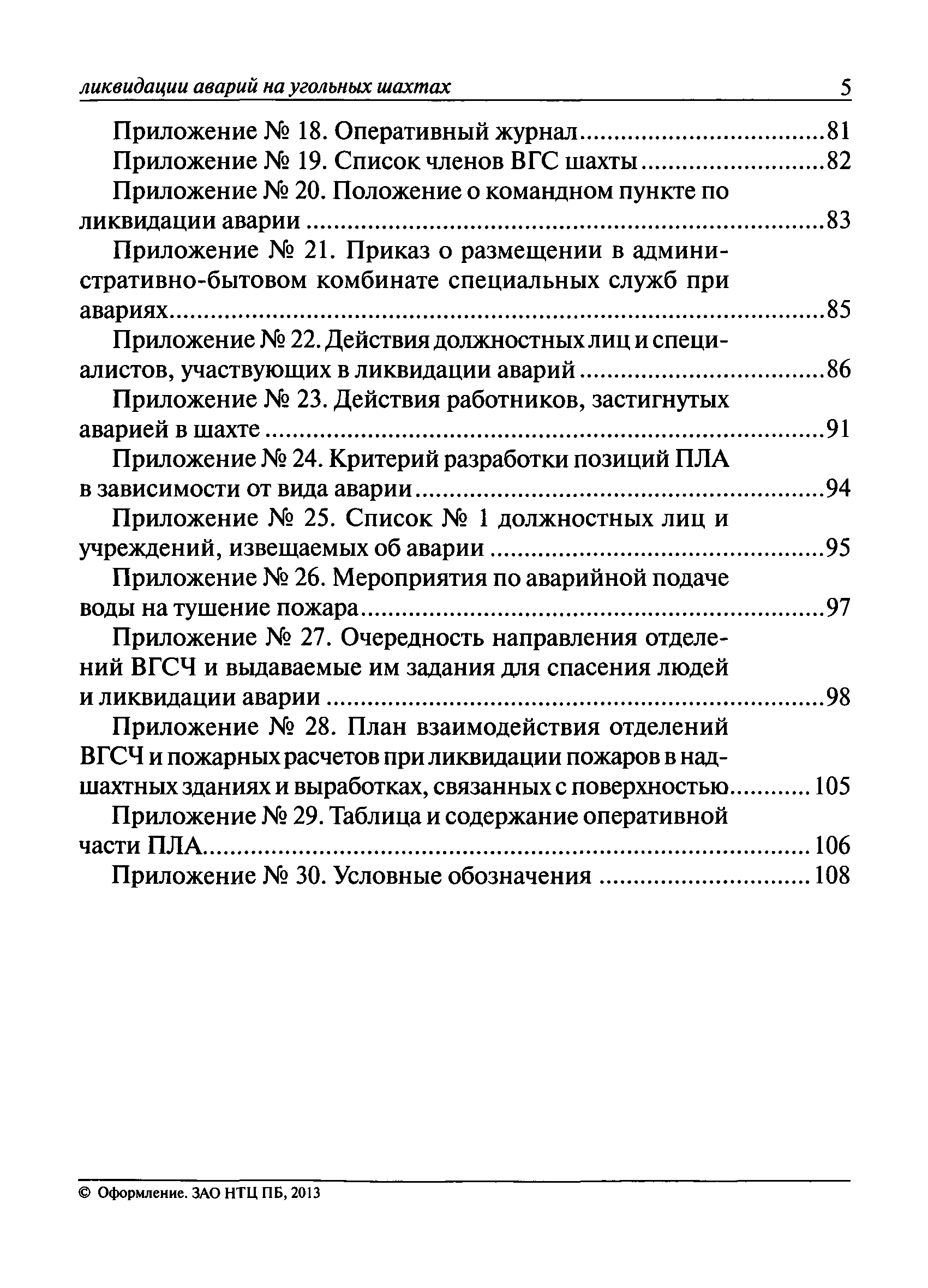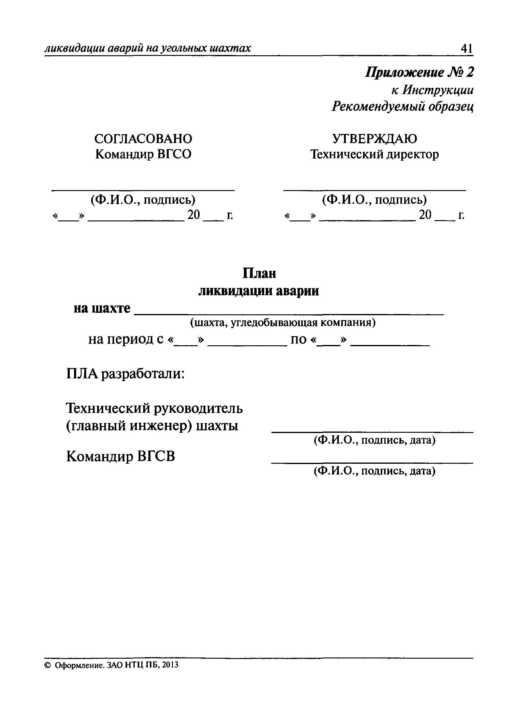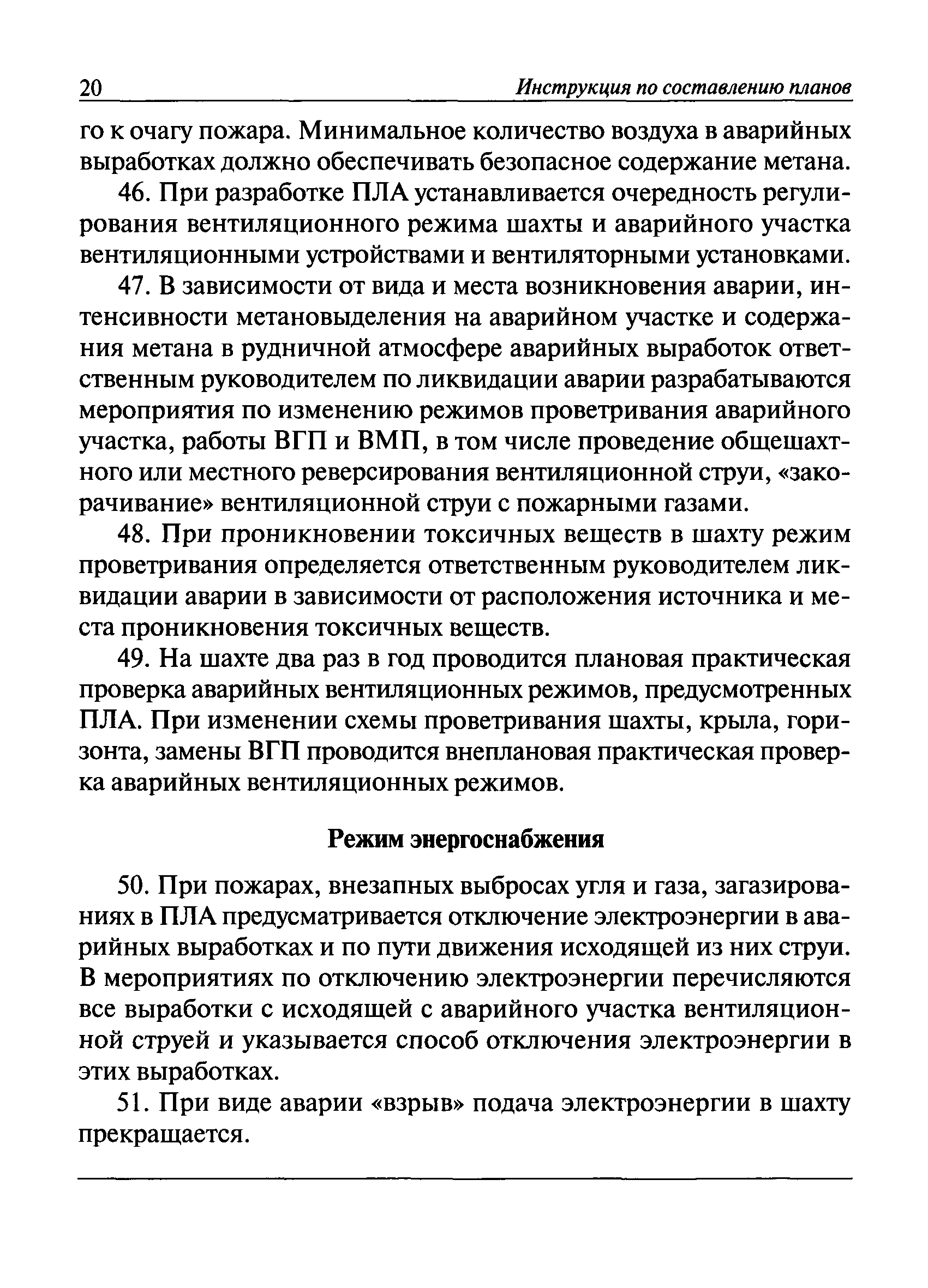 | Оглавление: | I. Общие положения II. Оперативная часть плана ликвидации аварий III. Графическая часть IV. Порядок внесения изменений и дополнений в план ликвидации аварий V. Мероприятия по спасению людей и ликвидации аварий, включаемые в общие для шахты позиции плана ликвидации аварий Приложение № 1. Заключение профилактической службы ВГСО о противоаварийной готовности шахты Приложение № 2. План ликвидации аварии на шахте Приложение № 3. Лист регистрации изменений Приложение № 4. Состав ПЛА Приложение № 5. Приказ о создании комиссий по организации проверок готовности шахты к согласованию ПЛА Приложение № 6. Протокол совещания по результатам проверок состояния противоаварийной защиты шахты Приложение № 7. Акт проверки обеспеченности шахты, ее горизонтов, панелей, очистных и подготовительных выработок запасными выходами, пригодности выработок шахты для передвижения и прохода горноспасателей в респираторах Приложение № 8. Акт проверки соответствия времени выхода людей на свежую струю воздуха сроку защитного действия самоспасателей, подготовленности работников к их использованию, возможности выполнения задач ПЛА отделениями ВГСЧ за время защитного действия штатных респираторов Приложение № 9. Акт определения времени загазирования тупиковых забоев в случае остановки вентиляторов местного проветривания Приложение № 10. Акт оценки газовой обстановки на выемочных участках с комбинированной схемой проветривания при возможных аварийных остановках ГОУ и их совместной работе с ВГП, работающими в аварийных режимах Приложение № 11. Акт проверки устойчивости вентиляционных режимов в горных выработках шахты и эффективности принятых мер по предотвращению самопроизвольного опрокидывания вентиляционной струи при пожаре Приложение № 12. Акт проверки состояния вентиляционных устройств и вентиляторных установок, а также возможности выполнения намечаемых вентиляционных режимов Приложение № 13. Акт проверки состояния средств связи, систем оповещения об аварии и средств поиска людей, застигнутых аварией Приложение № 14. Акт проверки ВГС Приложение № 15. Акт проверки обеспеченности шахты средствами пожаротушения и их состояния, оценки технической возможности реализации режимов водоснабжения шахты, предусматриваемых в позициях ПЛА, для организации подачи воды на цели пожаротушения Приложение № 16. Акт проверки аварийных вентиляционных режимов, предусмотренных ПЛА Приложение № 17. Протокол рассмотрения плана ликвидации аварии шахты Приложение № 18. Оперативный журнал Приложение № 19. Список членов ВГС шахты Приложение № 20. Положение о командном пункте по ликвидации аварии Приложение № 21. Приказ о размещении в административно-бытовом комбинате специальных служб при авариях Приложение № 22. Действия должностных лиц и специалистов, участвующих в ликвидации аварий Приложение № 23. Действия работников, застигнутых аварией в шахте Приложение № 24. Критерий разработки позиций ПЛА в зависимости от вида аварии Приложение № 25. Список № 1 должностных лиц и учреждений, извещаемых об аварии Приложение № 26. Мероприятия по аварийной подаче воды на тушение пожара Приложение № 27. Очередность направления отделений ВГСЧ и выдаваемые им задания для спасения людей и ликвидации аварии Приложение № 28. План взаимодействия отделений ВГСЧ и пожа