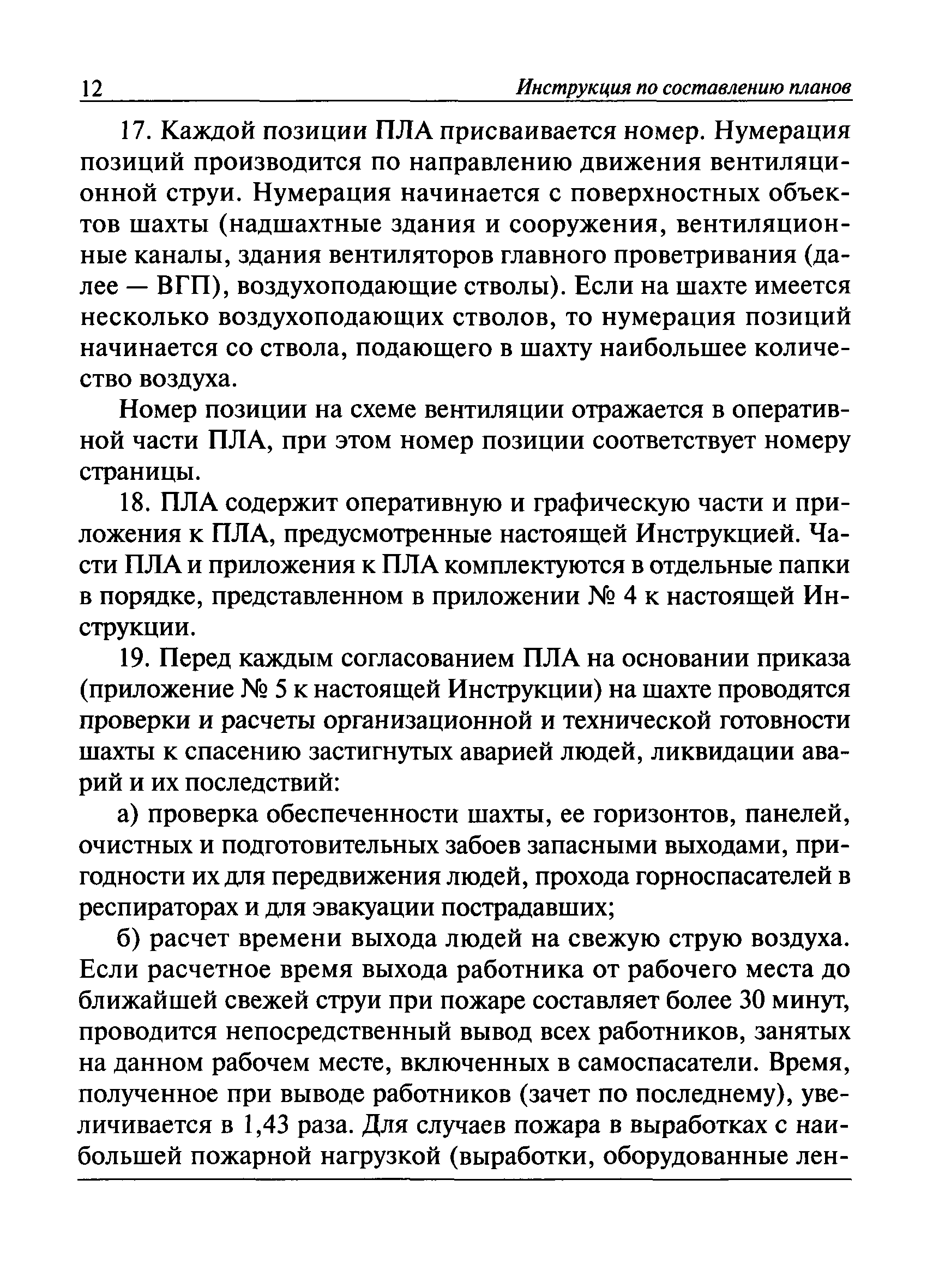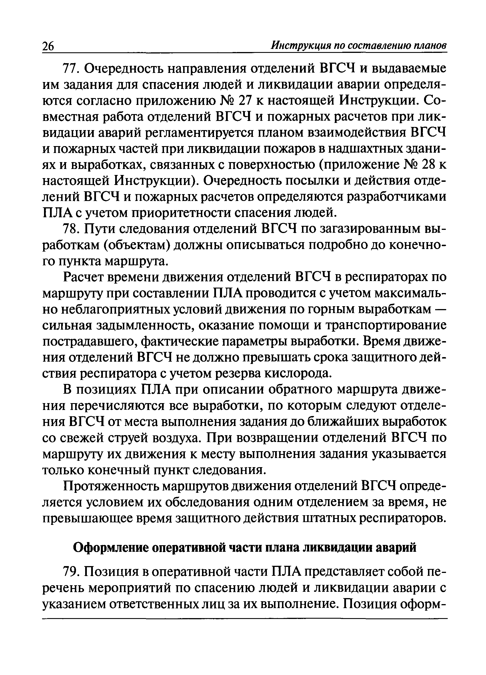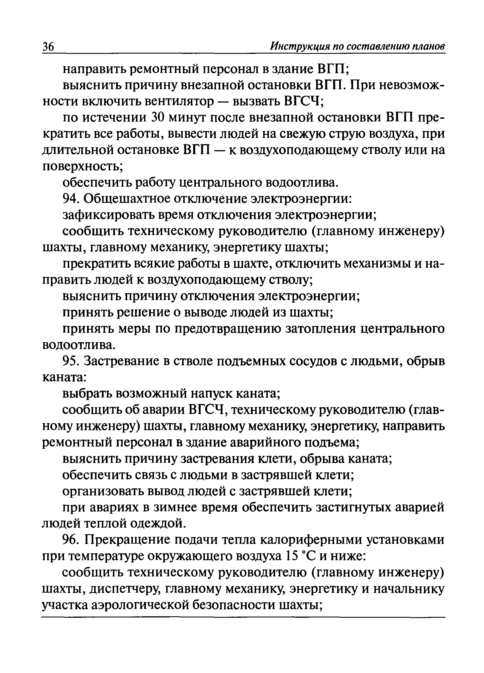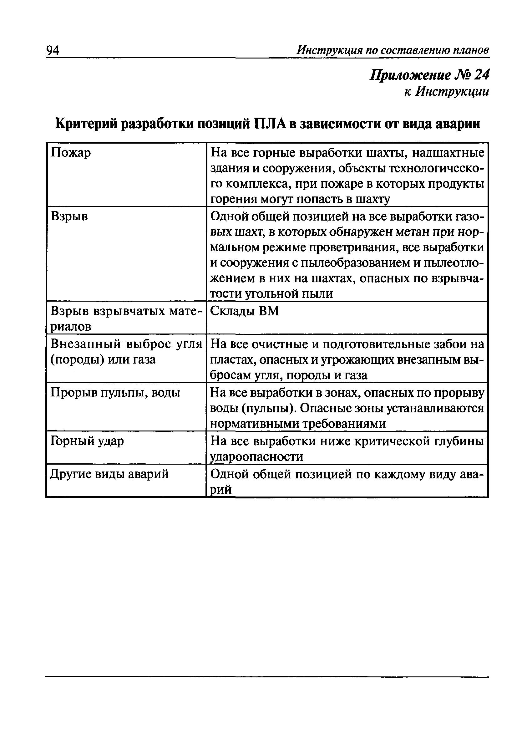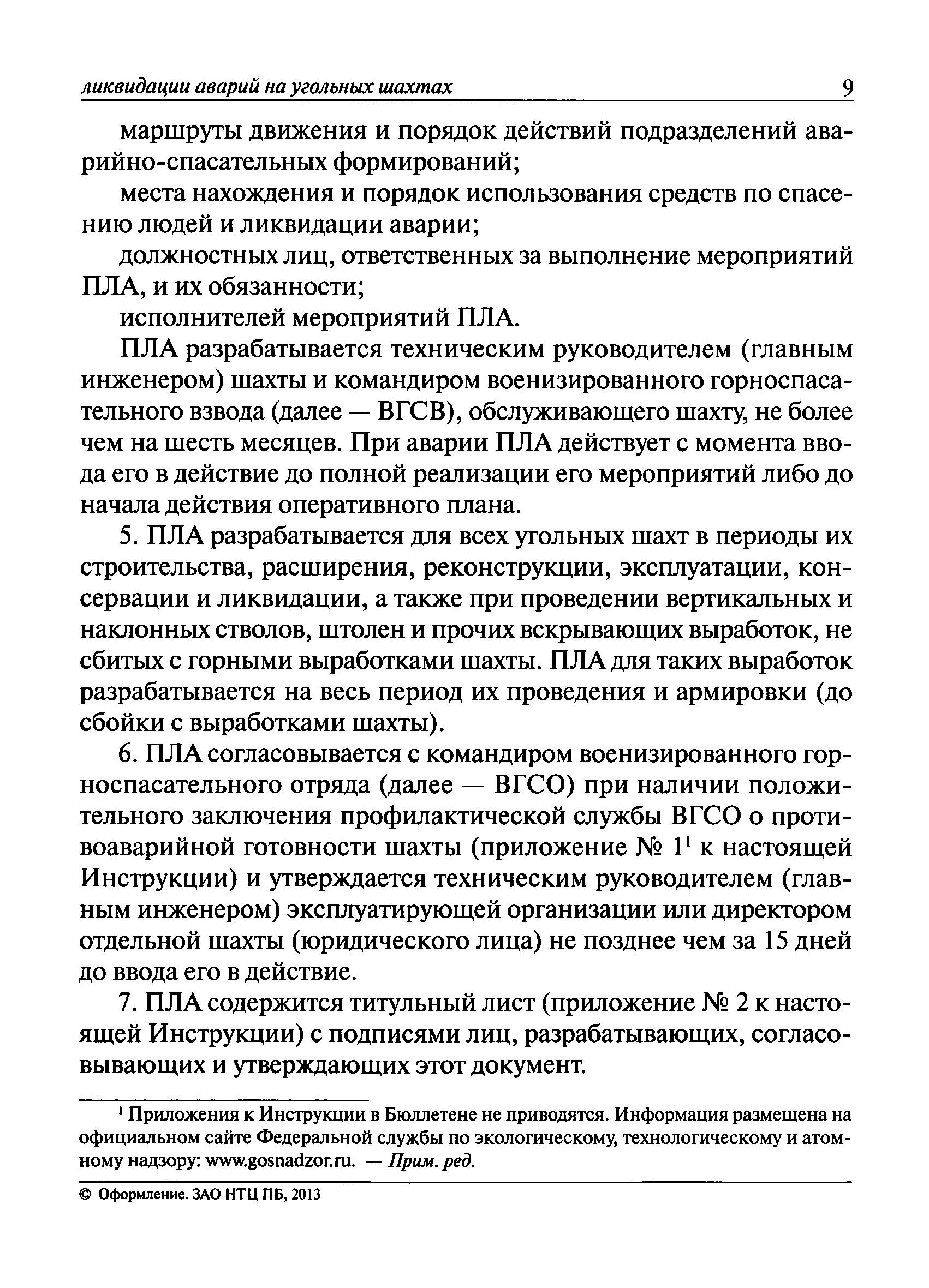 | Оглавление: | I. Общие положения II. Оперативная часть плана ликвидации аварий III. Графическая часть IV. Порядок внесения изменений и дополнений в план ликвидации аварий V. Мероприятия по спасению людей и ликвидации аварий, включаемые в общие для шахты позиции плана ликвидации аварий Приложение № 1. Заключение профилактической службы ВГСО о противоаварийной готовности шахты Приложение № 2. План ликвидации аварии на шахте Приложение № 3. Лист регистрации изменений Приложение № 4. Состав ПЛА Приложение № 5. Приказ о создании комиссий по организации проверок готовности шахты к согласованию ПЛА Приложение № 6. Протокол совещания по результатам проверок состояния противоаварийной защиты шахты Приложение № 7. Акт проверки обеспеченности шахты, ее горизонтов, панелей, очистных и подготовительных выработок запасными выходами, пригодности выработок шахты для передвижения и прохода горноспасателей в респираторах Приложение № 8. Акт проверки соответствия времени выхода людей на свежую струю воздуха сроку защитного действия самоспасателей, подготовленности работников к их использованию, возможности выполнения задач ПЛА отделениями ВГСЧ за время защитного действия штатных респираторов Приложение № 9. Акт определения времени загазирования тупиковых забоев в случае остановки вентиляторов местного проветривания Приложение № 10. Акт оценки газовой обстановки на выемочных участках с комбинированной схемой проветривания при возможных аварийных остановках ГОУ и их совместной работе с ВГП, работающими в аварийных режимах Приложение № 11. Акт проверки устойчивости вентиляционных режимов в горных выработках шахты и эффективности принятых мер по предотвращению самопроизвольного опрокидывания вентиляционной струи при пожаре Приложение № 12. Акт проверки состояния вентиляционных устройств и вентиляторных установок, а также возможности выполнения намечаемых вентиляционных режимов Приложение № 13. Акт проверки состояния средств связи, систем оповещения об аварии и средств поиска людей, застигнутых аварией Приложение № 14. Акт проверки ВГС Приложение № 15. Акт проверки обеспеченности шахты средствами пожаротушения и их состояния, оценки технической возможности реализации режимов водоснабжения шахты, предусматриваемых в позициях ПЛА, для организации подачи воды на цели пожаротушения Приложение № 16. Акт проверки аварийных вентиляционных режимов, предусмотренных ПЛА Приложение № 17. Протокол рассмотрения плана ликвидации аварии шахты Приложение № 18. Оперативный журнал Приложение № 19. Список членов ВГС шахты Приложение № 20. Положение о командном пункте по ликвидации аварии Приложение № 21. Приказ о размещении в административно-бытовом комбинате специальных служб при авариях Приложение № 22. Действия должностных лиц и специалистов, участвующих в ликвидации аварий Приложение № 23. Действия работников, застигнутых аварией в шахте Приложение № 24. Критерий разработки позиций ПЛА в зависимости от вида аварии Приложение № 25. Список № 1 должностных лиц и учреждений, извещаемых об аварии Приложение № 26. Мероприятия по аварийной подаче воды на тушение пожара Приложение № 27. Очередность направления отделений ВГСЧ и выдаваемые им задания для спасения людей и ликвидации аварии Приложение № 28. План взаимодействия отделений ВГСЧ и пожа