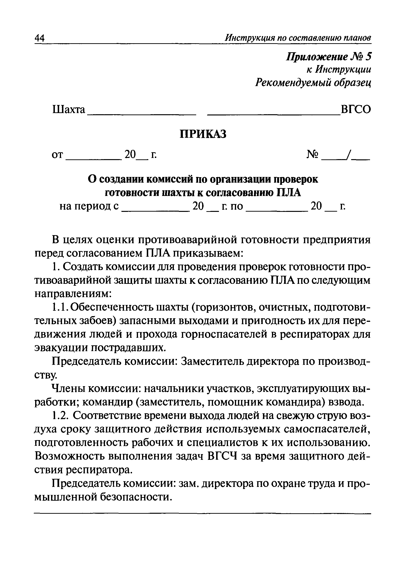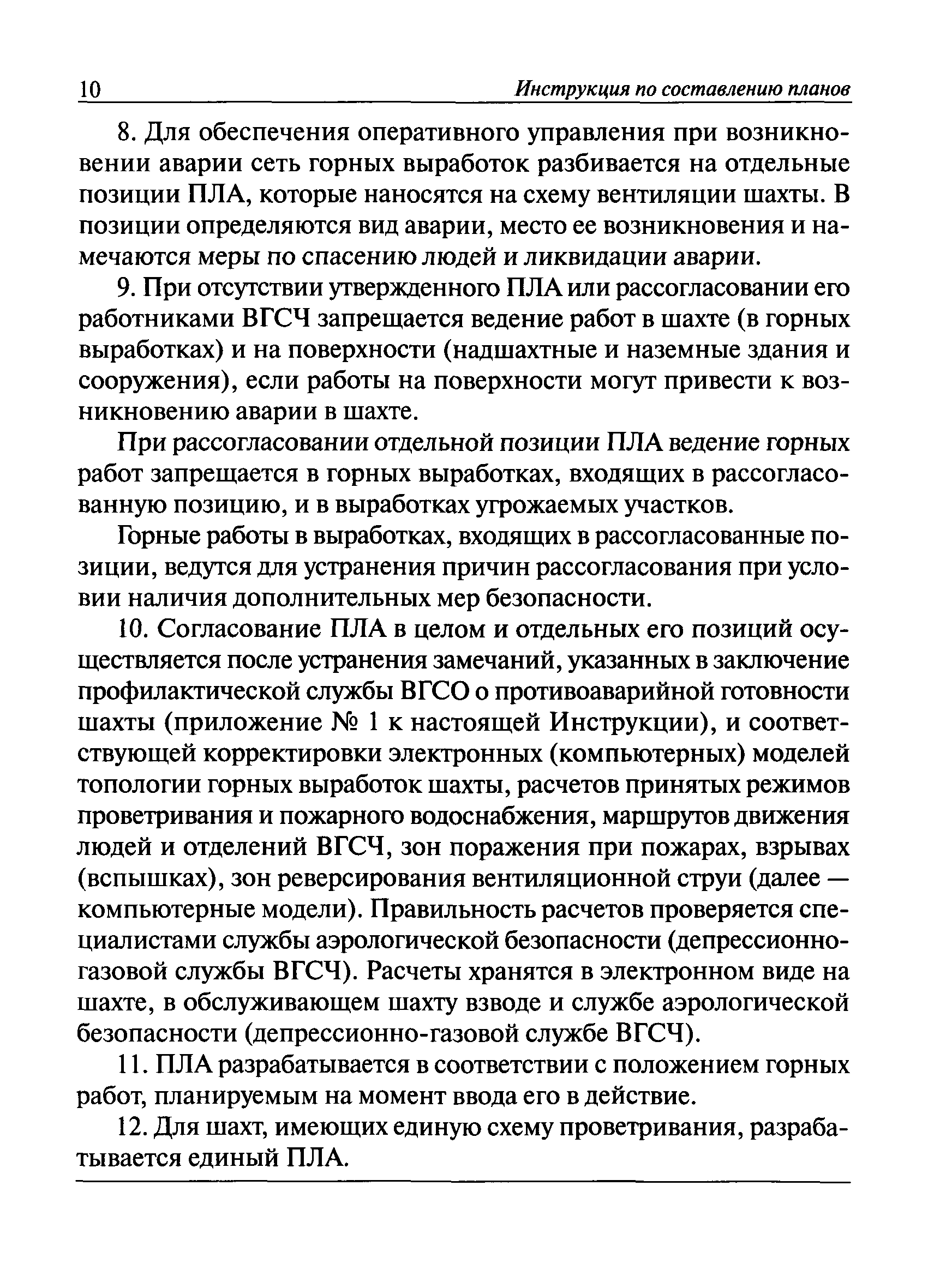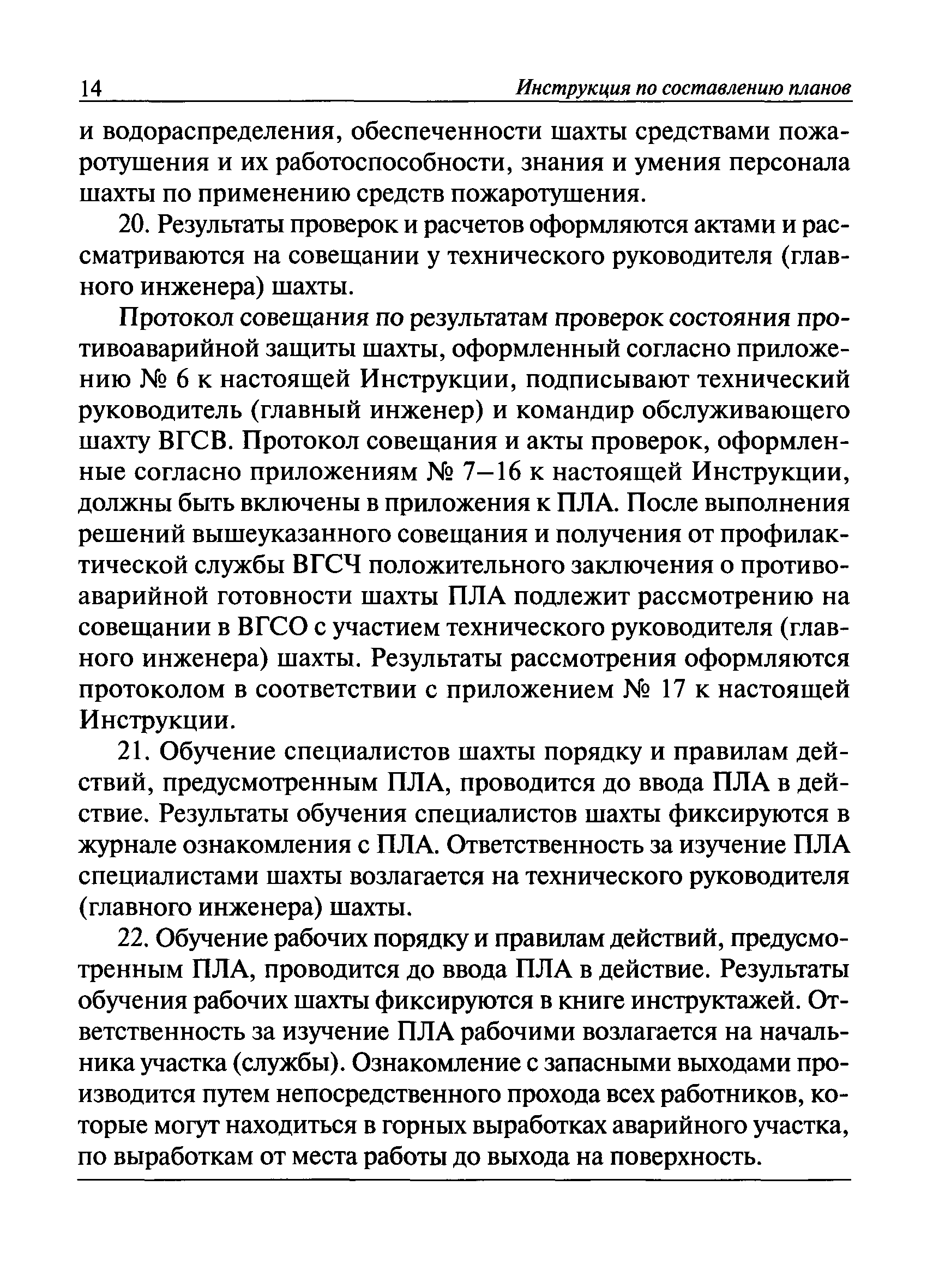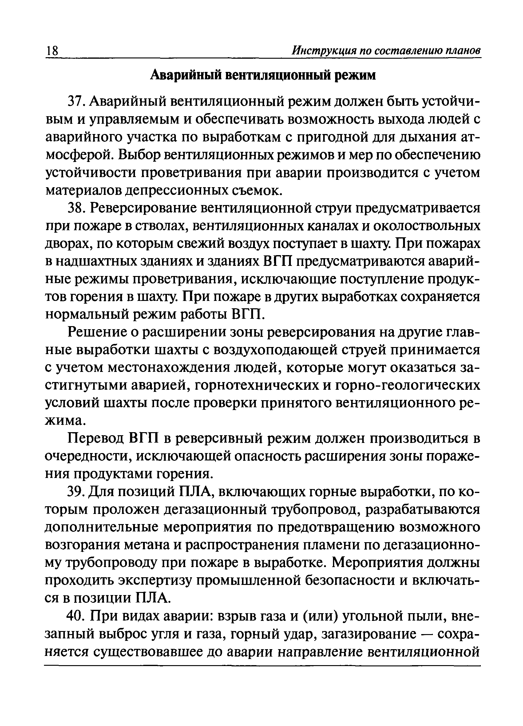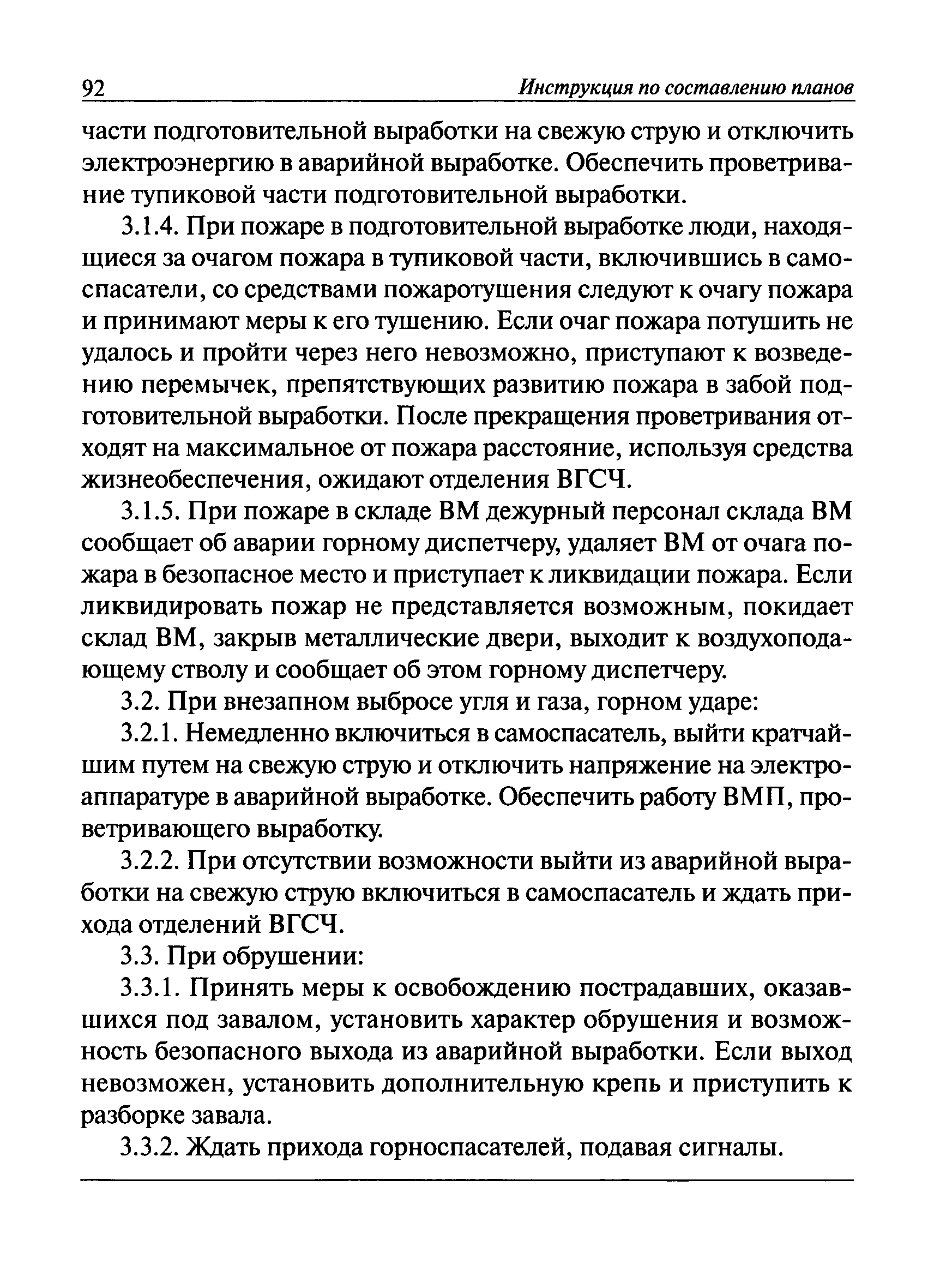 | Оглавление: | I. Общие положения II. Оперативная часть плана ликвидации аварий III. Графическая часть IV. Порядок внесения изменений и дополнений в план ликвидации аварий V. Мероприятия по спасению людей и ликвидации аварий, включаемые в общие для шахты позиции плана ликвидации аварий Приложение № 1. Заключение профилактической службы ВГСО о противоаварийной готовности шахты Приложение № 2. План ликвидации аварии на шахте Приложение № 3. Лист регистрации изменений Приложение № 4. Состав ПЛА Приложение № 5. Приказ о создании комиссий по организации проверок готовности шахты к согласованию ПЛА Приложение № 6. Протокол совещания по результатам проверок состояния противоаварийной защиты шахты Приложение № 7. Акт проверки обеспеченности шахты, ее горизонтов, панелей, очистных и подготовительных выработок запасными выходами, пригодности выработок шахты для передвижения и прохода горноспасателей в респираторах Приложение № 8. Акт проверки соответствия времени выхода людей на свежую струю воздуха сроку защитного действия самоспасателей, подготовленности работников к их использованию, возможности выполнения задач ПЛА отделениями ВГСЧ за время защитного действия штатных респираторов Приложение № 9. Акт определения времени загазирования тупиковых забоев в случае остановки вентиляторов местного проветривания Приложение № 10. Акт оценки газовой обстановки на выемочных участках с комбинированной схемой проветривания при возможных аварийных остановках ГОУ и их совместной работе с ВГП, работающими в аварийных режимах Приложение № 11. Акт проверки устойчивости вентиляционных режимов в горных выработках шахты и эффективности принятых мер по предотвращению самопроизвольного опрокидывания вентиляционной струи при пожаре Приложение № 12. Акт проверки состояния вентиляционных устройств и вентиляторных установок, а также возможности выполнения намечаемых вентиляционных режимов Приложение № 13. Акт проверки состояния средств связи, систем оповещения об аварии и средств поиска людей, застигнутых аварией Приложение № 14. Акт проверки ВГС Приложение № 15. Акт проверки обеспеченности шахты средствами пожаротушения и их состояния, оценки технической возможности реализации режимов водоснабжения шахты, предусматриваемых в позициях ПЛА, для организации подачи воды на цели пожаротушения Приложение № 16. Акт проверки аварийных вентиляционных режимов, предусмотренных ПЛА Приложение № 17. Протокол рассмотрения плана ликвидации аварии шахты Приложение № 18. Оперативный журнал Приложение № 19. Список членов ВГС шахты Приложение № 20. Положение о командном пункте по ликвидации аварии Приложение № 21. Приказ о размещении в административно-бытовом комбинате специальных служб при авариях Приложение № 22. Действия должностных лиц и специалистов, участвующих в ликвидации аварий Приложение № 23. Действия работников, застигнутых аварией в шахте Приложение № 24. Критерий разработки позиций ПЛА в зависимости от вида аварии Приложение № 25. Список № 1 должностных лиц и учреждений, извещаемых об аварии Приложение № 26. Мероприятия по аварийной подаче воды на тушение пожара Приложение № 27. Очередность направления отделений ВГСЧ и выдаваемые им задания для спасения людей и ликвидации аварии Приложение № 28. План взаимодействия отделений ВГСЧ и пожа