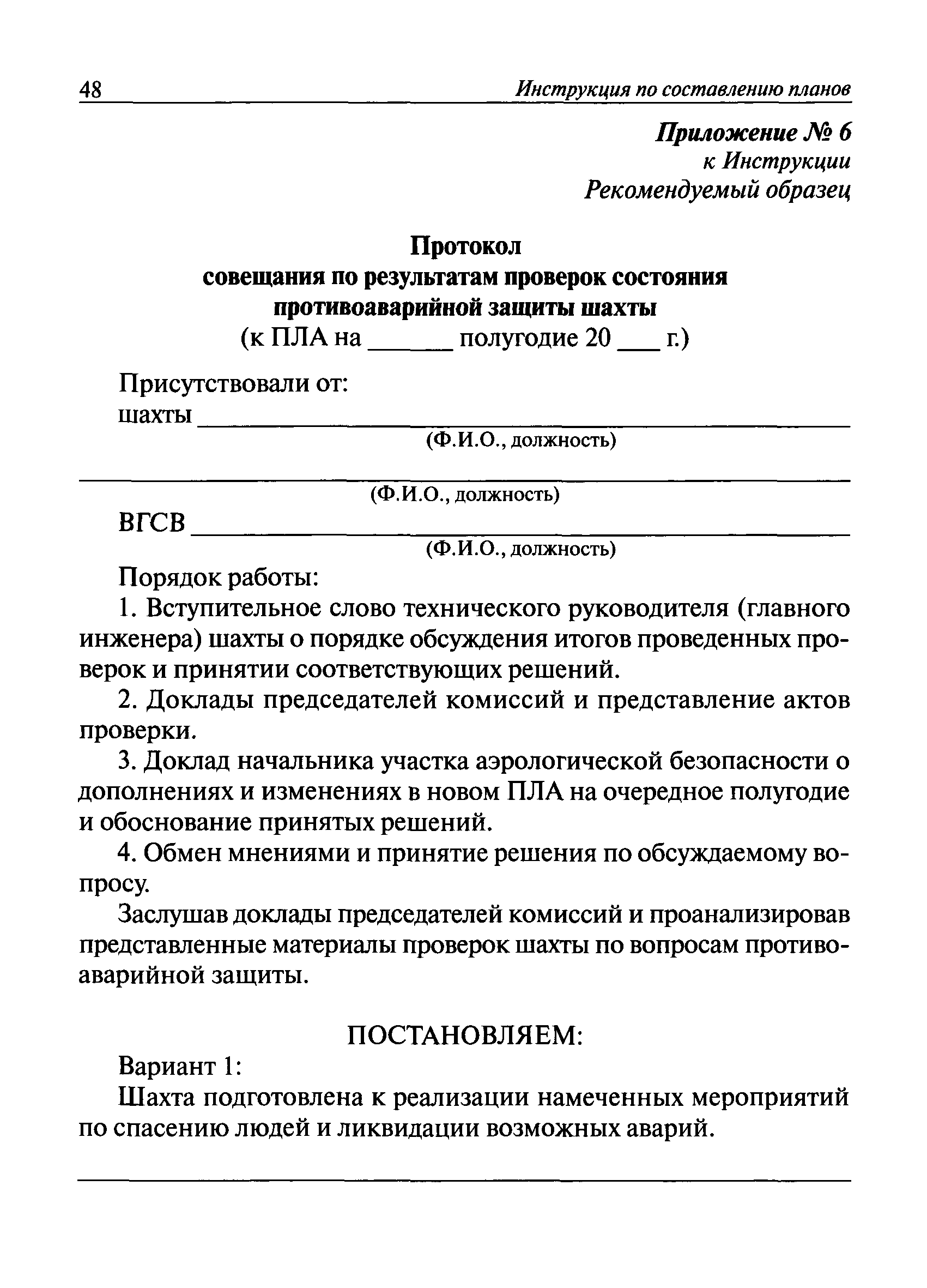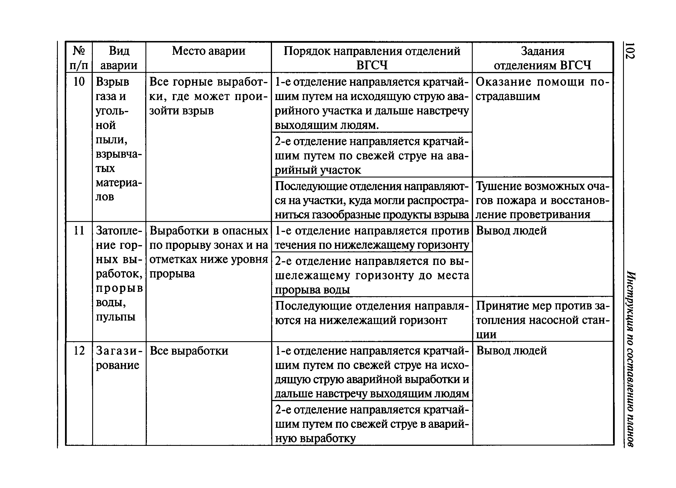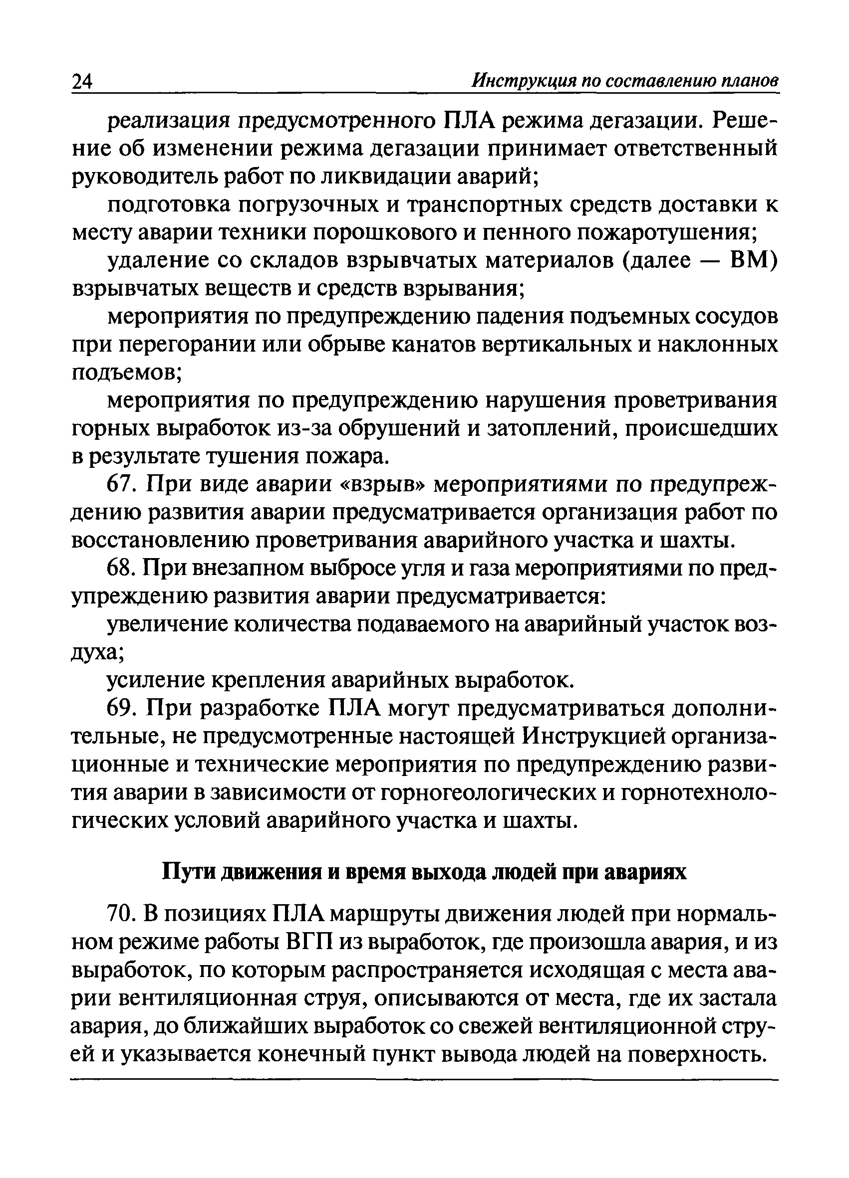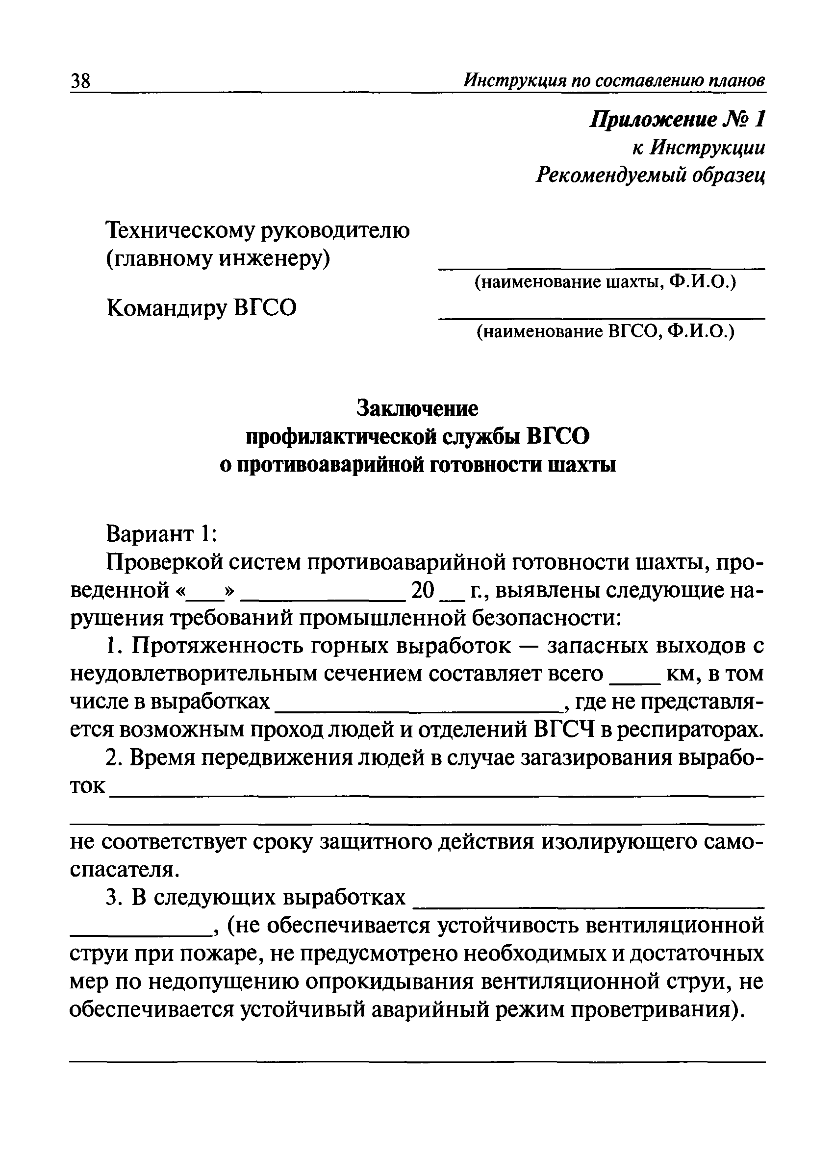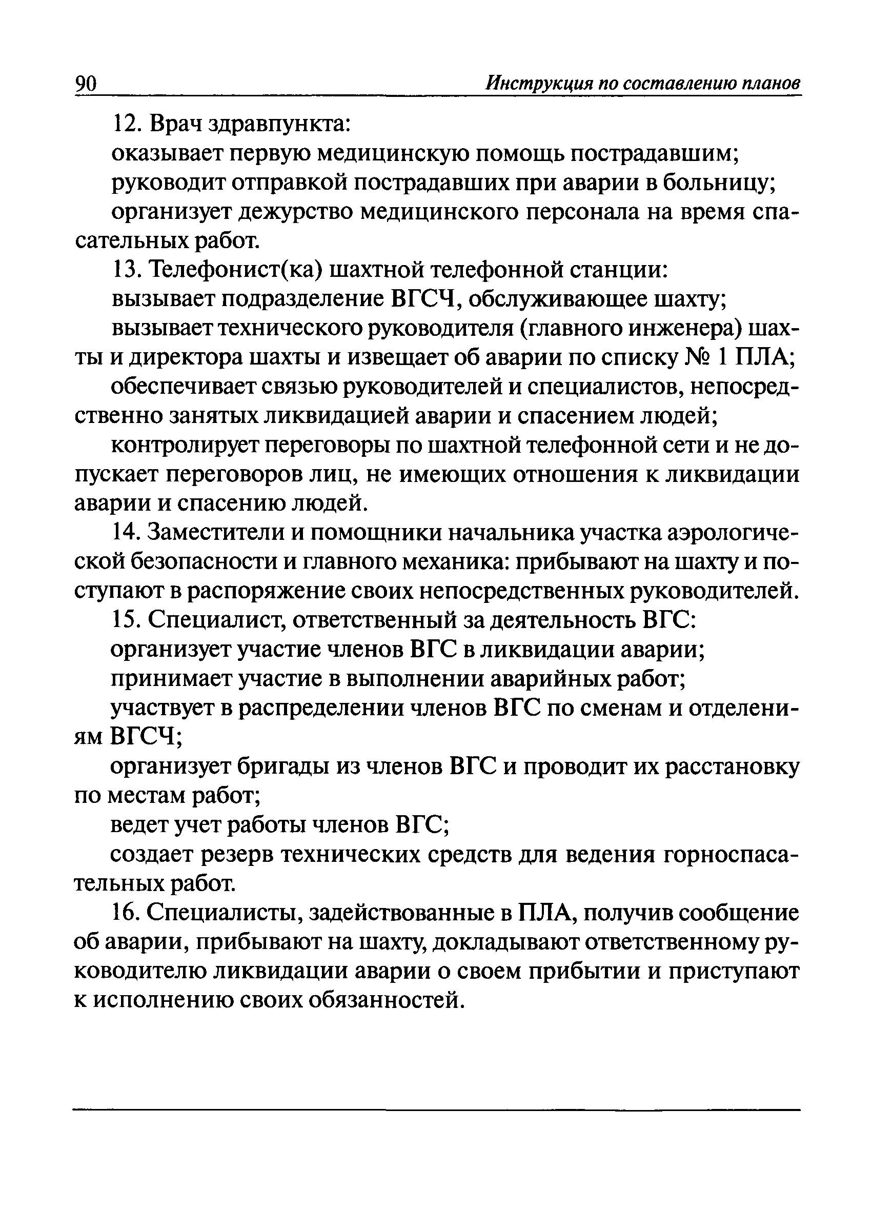 | Оглавление: | I. Общие положения II. Оперативная часть плана ликвидации аварий III. Графическая часть IV. Порядок внесения изменений и дополнений в план ликвидации аварий V. Мероприятия по спасению людей и ликвидации аварий, включаемые в общие для шахты позиции плана ликвидации аварий Приложение № 1. Заключение профилактической службы ВГСО о противоаварийной готовности шахты Приложение № 2. План ликвидации аварии на шахте Приложение № 3. Лист регистрации изменений Приложение № 4. Состав ПЛА Приложение № 5. Приказ о создании комиссий по организации проверок готовности шахты к согласованию ПЛА Приложение № 6. Протокол совещания по результатам проверок состояния противоаварийной защиты шахты Приложение № 7. Акт проверки обеспеченности шахты, ее горизонтов, панелей, очистных и подготовительных выработок запасными выходами, пригодности выработок шахты для передвижения и прохода горноспасателей в респираторах Приложение № 8. Акт проверки соответствия времени выхода людей на свежую струю воздуха сроку защитного действия самоспасателей, подготовленности работников к их использованию, возможности выполнения задач ПЛА отделениями ВГСЧ за время защитного действия штатных респираторов Приложение № 9. Акт определения времени загазирования тупиковых забоев в случае остановки вентиляторов местного проветривания Приложение № 10. Акт оценки газовой обстановки на выемочных участках с комбинированной схемой проветривания при возможных аварийных остановках ГОУ и их совместной работе с ВГП, работающими в аварийных режимах Приложение № 11. Акт проверки устойчивости вентиляционных режимов в горных выработках шахты и эффективности принятых мер по предотвращению самопроизвольного опрокидывания вентиляционной струи при пожаре Приложение № 12. Акт проверки состояния вентиляционных устройств и вентиляторных установок, а также возможности выполнения намечаемых вентиляционных режимов Приложение № 13. Акт проверки состояния средств связи, систем оповещения об аварии и средств поиска людей, застигнутых аварией Приложение № 14. Акт проверки ВГС Приложение № 15. Акт проверки обеспеченности шахты средствами пожаротушения и их состояния, оценки технической возможности реализации режимов водоснабжения шахты, предусматриваемых в позициях ПЛА, для организации подачи воды на цели пожаротушения Приложение № 16. Акт проверки аварийных вентиляционных режимов, предусмотренных ПЛА Приложение № 17. Протокол рассмотрения плана ликвидации аварии шахты Приложение № 18. Оперативный журнал Приложение № 19. Список членов ВГС шахты Приложение № 20. Положение о командном пункте по ликвидации аварии Приложение № 21. Приказ о размещении в административно-бытовом комбинате специальных служб при авариях Приложение № 22. Действия должностных лиц и специалистов, участвующих в ликвидации аварий Приложение № 23. Действия работников, застигнутых аварией в шахте Приложение № 24. Критерий разработки позиций ПЛА в зависимости от вида аварии Приложение № 25. Список № 1 должностных лиц и учреждений, извещаемых об аварии Приложение № 26. Мероприятия по аварийной подаче воды на тушение пожара Приложение № 27. Очередность направления отделений ВГСЧ и выдаваемые им задания для спасения людей и ликвидации аварии Приложение № 28. План взаимодействия отделений ВГСЧ и пожа