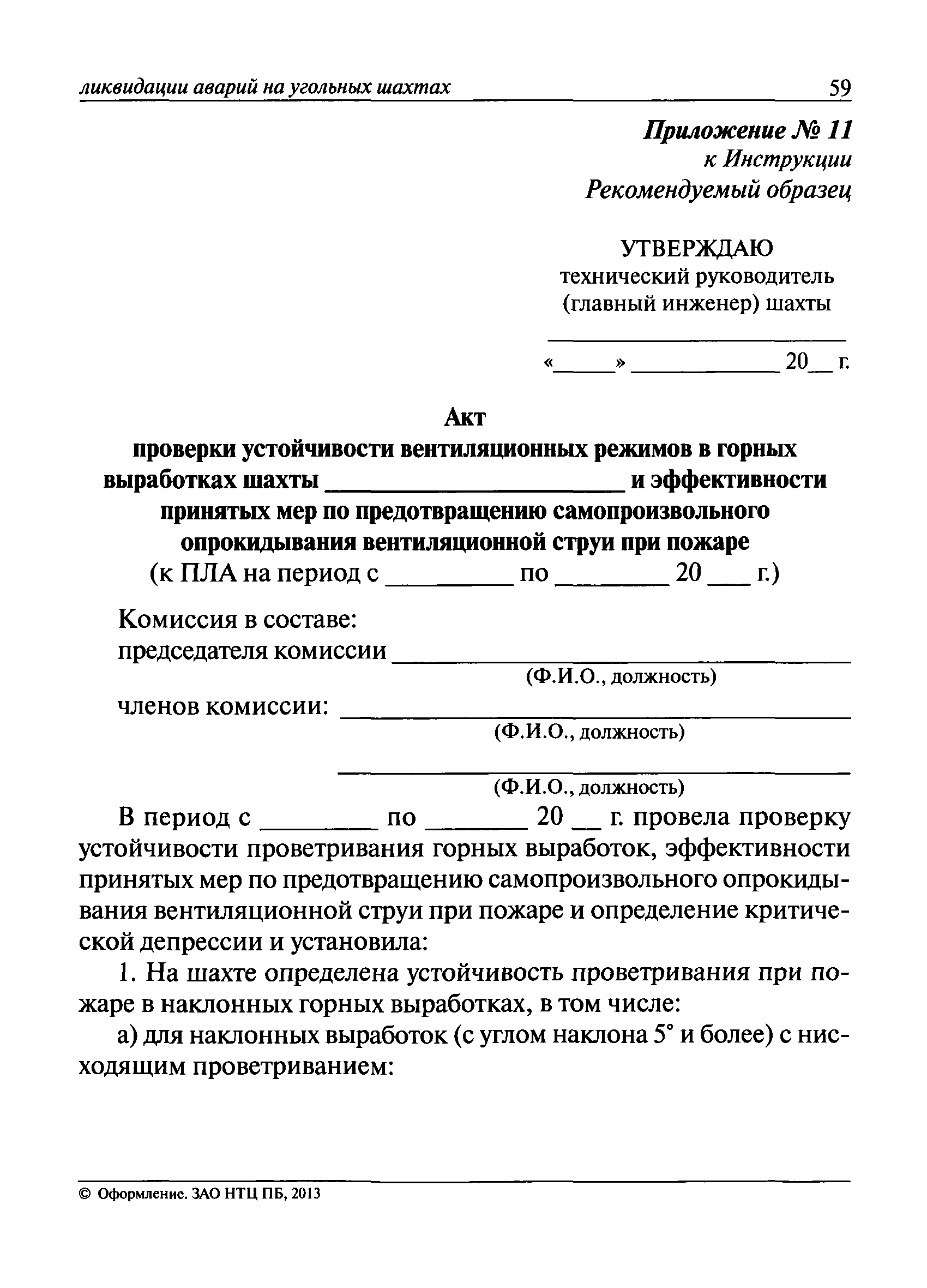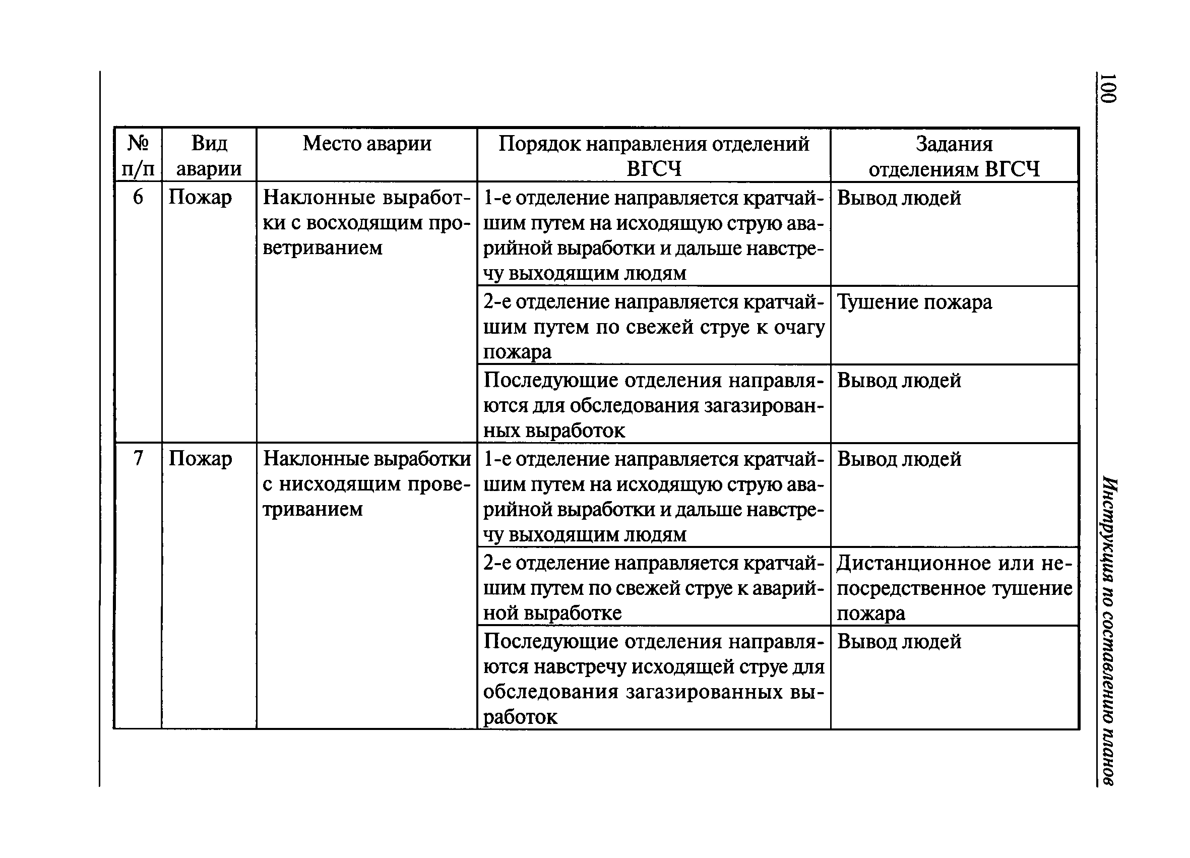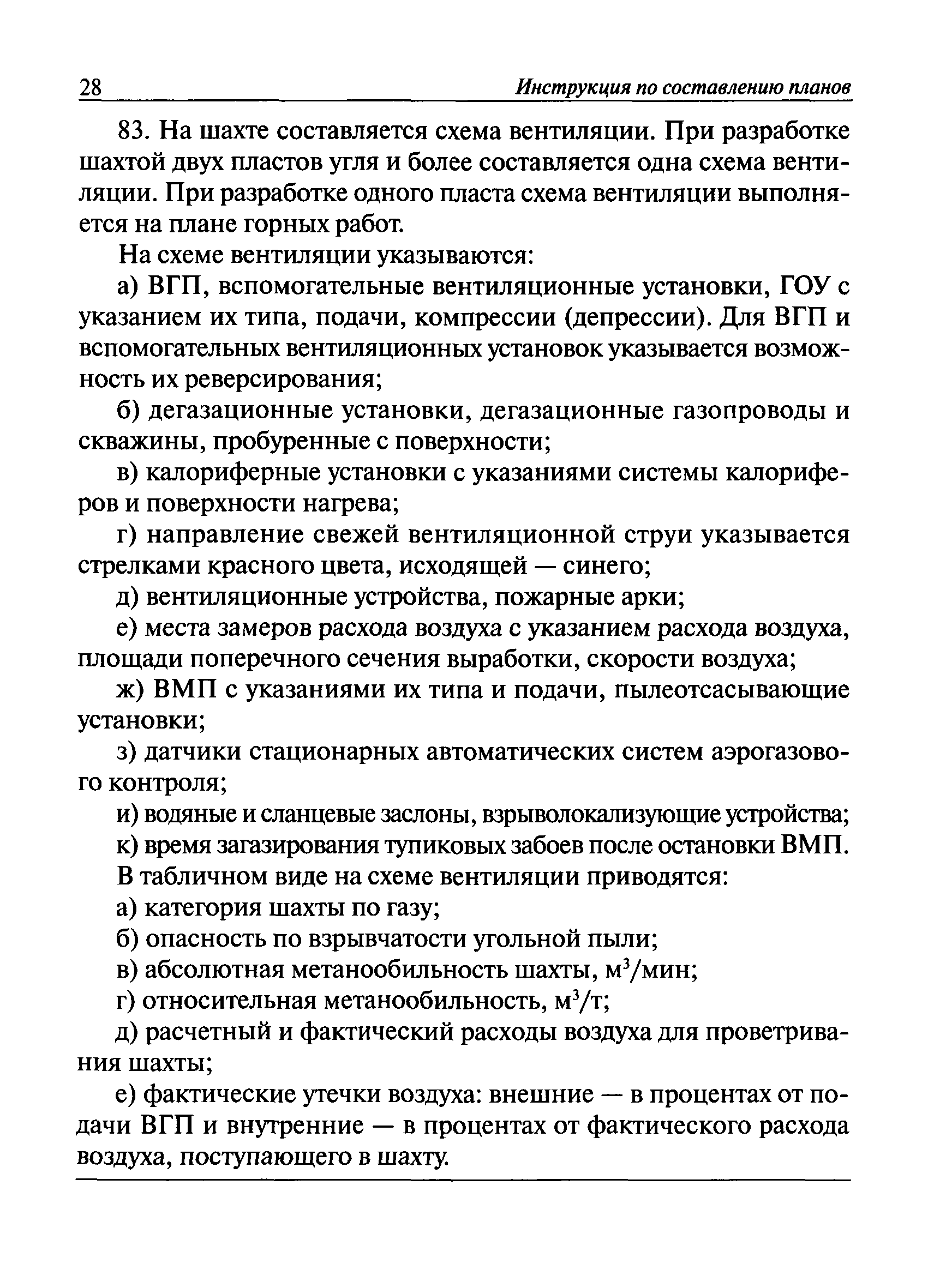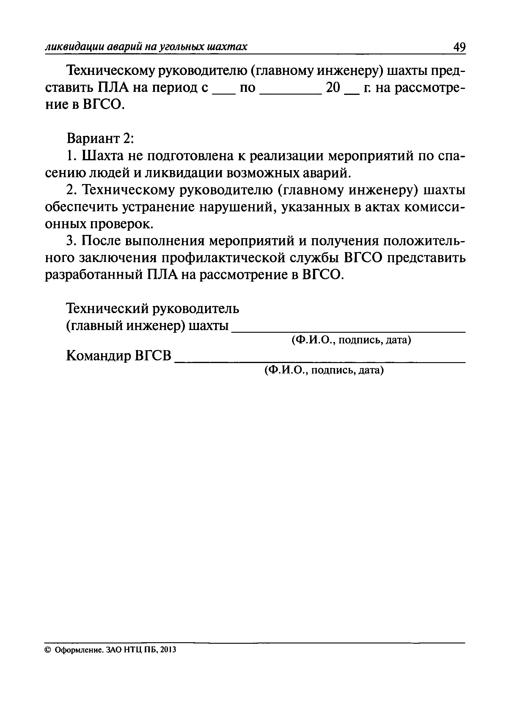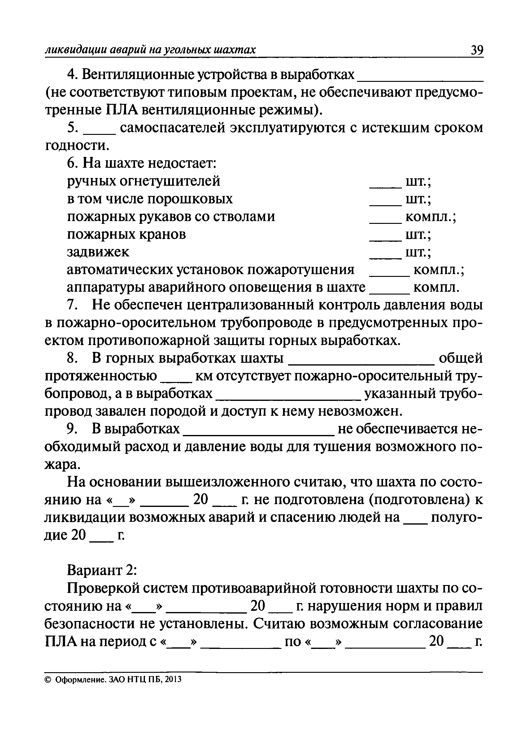 | Оглавление: | I. Общие положения II. Оперативная часть плана ликвидации аварий III. Графическая часть IV. Порядок внесения изменений и дополнений в план ликвидации аварий V. Мероприятия по спасению людей и ликвидации аварий, включаемые в общие для шахты позиции плана ликвидации аварий Приложение № 1. Заключение профилактической службы ВГСО о противоаварийной готовности шахты Приложение № 2. План ликвидации аварии на шахте Приложение № 3. Лист регистрации изменений Приложение № 4. Состав ПЛА Приложение № 5. Приказ о создании комиссий по организации проверок готовности шахты к согласованию ПЛА Приложение № 6. Протокол совещания по результатам проверок состояния противоаварийной защиты шахты Приложение № 7. Акт проверки обеспеченности шахты, ее горизонтов, панелей, очистных и подготовительных выработок запасными выходами, пригодности выработок шахты для передвижения и прохода горноспасателей в респираторах Приложение № 8. Акт проверки соответствия времени выхода людей на свежую струю воздуха сроку защитного действия самоспасателей, подготовленности работников к их использованию, возможности выполнения задач ПЛА отделениями ВГСЧ за время защитного действия штатных респираторов Приложение № 9. Акт определения времени загазирования тупиковых забоев в случае остановки вентиляторов местного проветривания Приложение № 10. Акт оценки газовой обстановки на выемочных участках с комбинированной схемой проветривания при возможных аварийных остановках ГОУ и их совместной работе с ВГП, работающими в аварийных режимах Приложение № 11. Акт проверки устойчивости вентиляционных режимов в горных выработках шахты и эффективности принятых мер по предотвращению самопроизвольного опрокидывания вентиляционной струи при пожаре Приложение № 12. Акт проверки состояния вентиляционных устройств и вентиляторных установок, а также возможности выполнения намечаемых вентиляционных режимов Приложение № 13. Акт проверки состояния средств связи, систем оповещения об аварии и средств поиска людей, застигнутых аварией Приложение № 14. Акт проверки ВГС Приложение № 15. Акт проверки обеспеченности шахты средствами пожаротушения и их состояния, оценки технической возможности реализации режимов водоснабжения шахты, предусматриваемых в позициях ПЛА, для организации подачи воды на цели пожаротушения Приложение № 16. Акт проверки аварийных вентиляционных режимов, предусмотренных ПЛА Приложение № 17. Протокол рассмотрения плана ликвидации аварии шахты Приложение № 18. Оперативный журнал Приложение № 19. Список членов ВГС шахты Приложение № 20. Положение о командном пункте по ликвидации аварии Приложение № 21. Приказ о размещении в административно-бытовом комбинате специальных служб при авариях Приложение № 22. Действия должностных лиц и специалистов, участвующих в ликвидации аварий Приложение № 23. Действия работников, застигнутых аварией в шахте Приложение № 24. Критерий разработки позиций ПЛА в зависимости от вида аварии Приложение № 25. Список № 1 должностных лиц и учреждений, извещаемых об аварии Приложение № 26. Мероприятия по аварийной подаче воды на тушение пожара Приложение № 27. Очередность направления отделений ВГСЧ и выдаваемые им задания для спасения людей и ликвидации аварии Приложение № 28. План взаимодействия отделений ВГСЧ и пожа