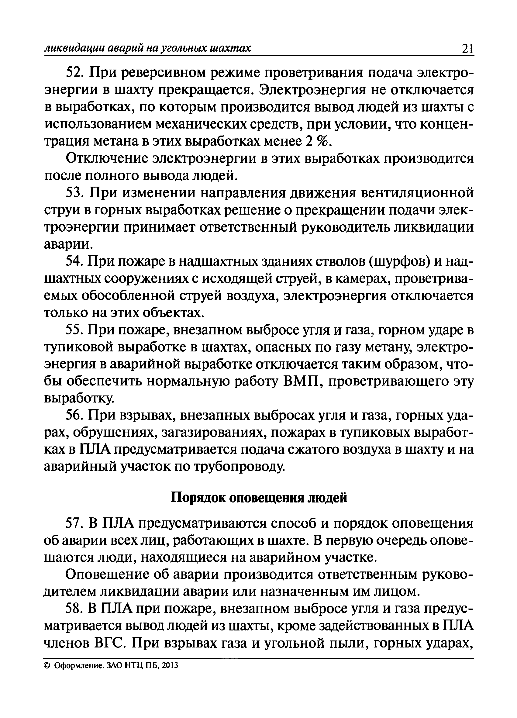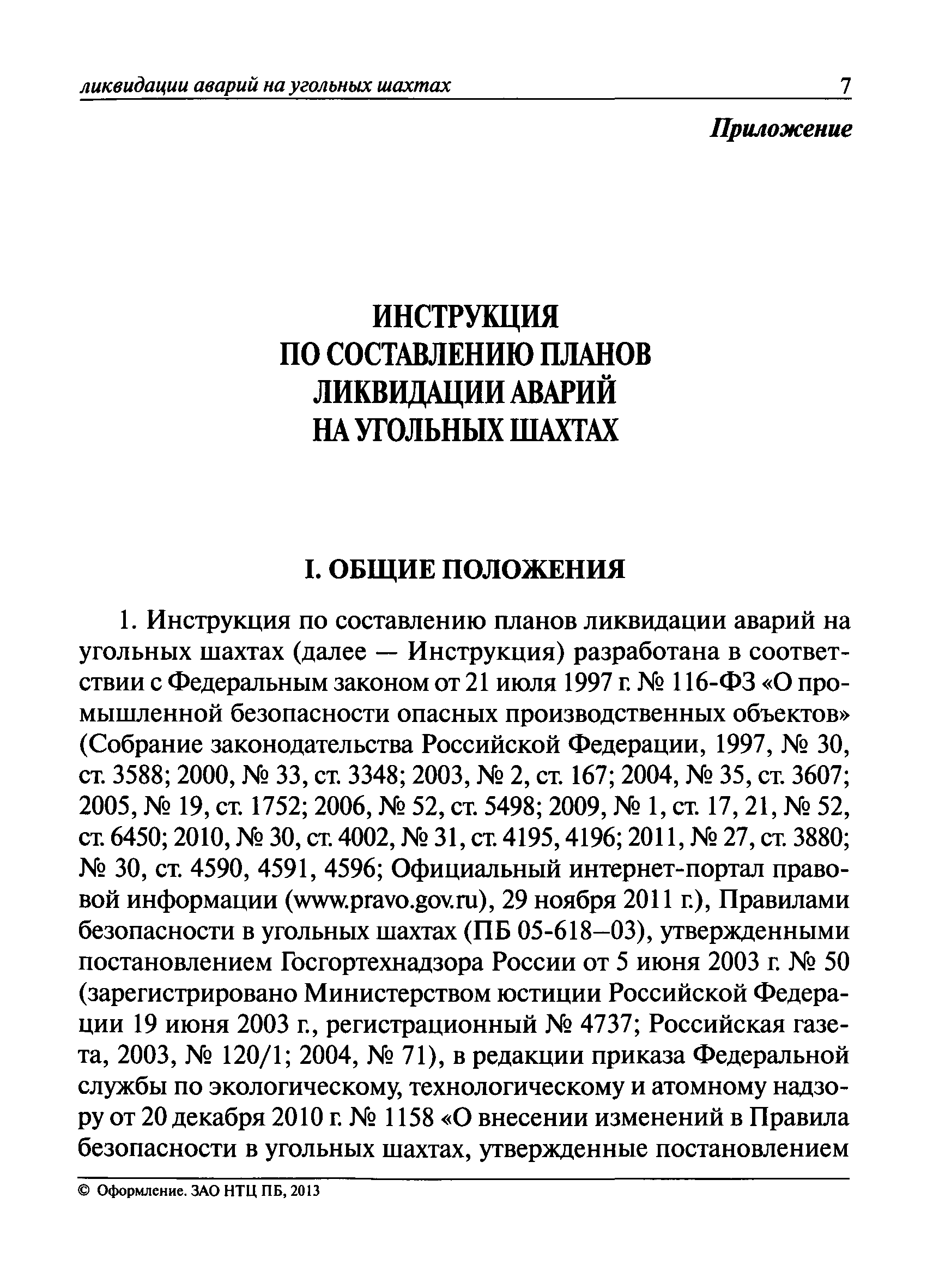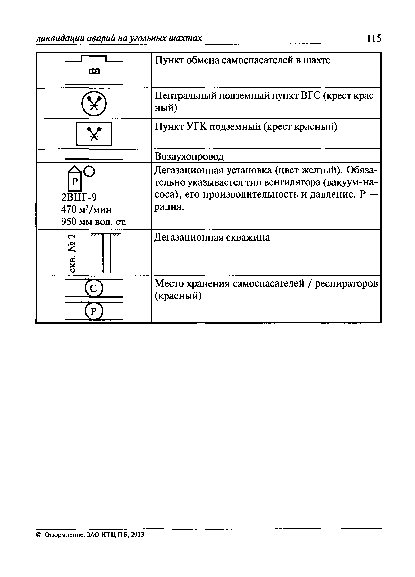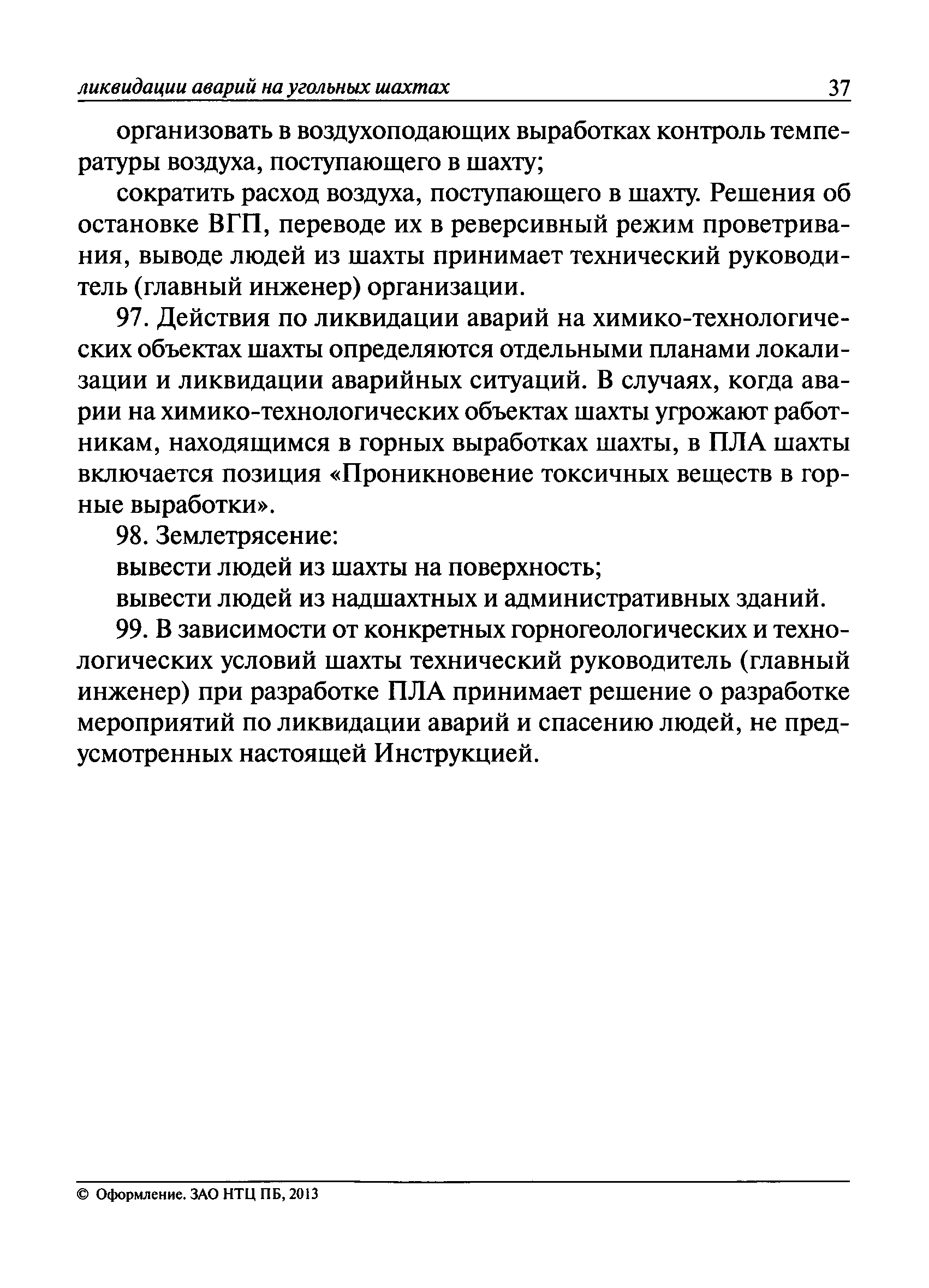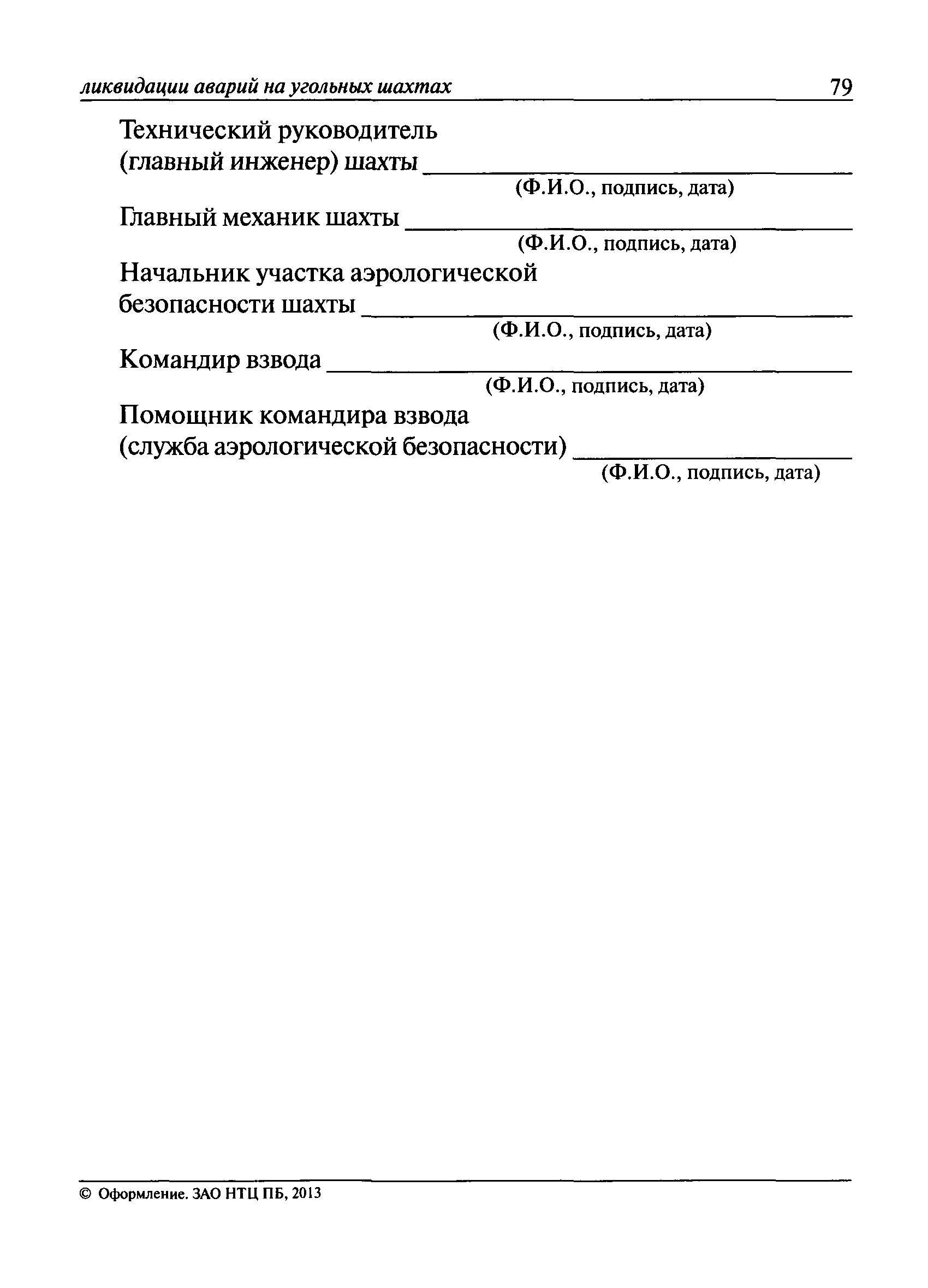 | Оглавление: | I. Общие положения II. Оперативная часть плана ликвидации аварий III. Графическая часть IV. Порядок внесения изменений и дополнений в план ликвидации аварий V. Мероприятия по спасению людей и ликвидации аварий, включаемые в общие для шахты позиции плана ликвидации аварий Приложение № 1. Заключение профилактической службы ВГСО о противоаварийной готовности шахты Приложение № 2. План ликвидации аварии на шахте Приложение № 3. Лист регистрации изменений Приложение № 4. Состав ПЛА Приложение № 5. Приказ о создании комиссий по организации проверок готовности шахты к согласованию ПЛА Приложение № 6. Протокол совещания по результатам проверок состояния противоаварийной защиты шахты Приложение № 7. Акт проверки обеспеченности шахты, ее горизонтов, панелей, очистных и подготовительных выработок запасными выходами, пригодности выработок шахты для передвижения и прохода горноспасателей в респираторах Приложение № 8. Акт проверки соответствия времени выхода людей на свежую струю воздуха сроку защитного действия самоспасателей, подготовленности работников к их использованию, возможности выполнения задач ПЛА отделениями ВГСЧ за время защитного действия штатных респираторов Приложение № 9. Акт определения времени загазирования тупиковых забоев в случае остановки вентиляторов местного проветривания Приложение № 10. Акт оценки газовой обстановки на выемочных участках с комбинированной схемой проветривания при возможных аварийных остановках ГОУ и их совместной работе с ВГП, работающими в аварийных режимах Приложение № 11. Акт проверки устойчивости вентиляционных режимов в горных выработках шахты и эффективности принятых мер по предотвращению самопроизвольного опрокидывания вентиляционной струи при пожаре Приложение № 12. Акт проверки состояния вентиляционных устройств и вентиляторных установок, а также возможности выполнения намечаемых вентиляционных режимов Приложение № 13. Акт проверки состояния средств связи, систем оповещения об аварии и средств поиска людей, застигнутых аварией Приложение № 14. Акт проверки ВГС Приложение № 15. Акт проверки обеспеченности шахты средствами пожаротушения и их состояния, оценки технической возможности реализации режимов водоснабжения шахты, предусматриваемых в позициях ПЛА, для организации подачи воды на цели пожаротушения Приложение № 16. Акт проверки аварийных вентиляционных режимов, предусмотренных ПЛА Приложение № 17. Протокол рассмотрения плана ликвидации аварии шахты Приложение № 18. Оперативный журнал Приложение № 19. Список членов ВГС шахты Приложение № 20. Положение о командном пункте по ликвидации аварии Приложение № 21. Приказ о размещении в административно-бытовом комбинате специальных служб при авариях Приложение № 22. Действия должностных лиц и специалистов, участвующих в ликвидации аварий Приложение № 23. Действия работников, застигнутых аварией в шахте Приложение № 24. Критерий разработки позиций ПЛА в зависимости от вида аварии Приложение № 25. Список № 1 должностных лиц и учреждений, извещаемых об аварии Приложение № 26. Мероприятия по аварийной подаче воды на тушение пожара Приложение № 27. Очередность направления отделений ВГСЧ и выдаваемые им задания для спасения людей и ликвидации аварии Приложение № 28. План взаимодействия отделений ВГСЧ и пожа
