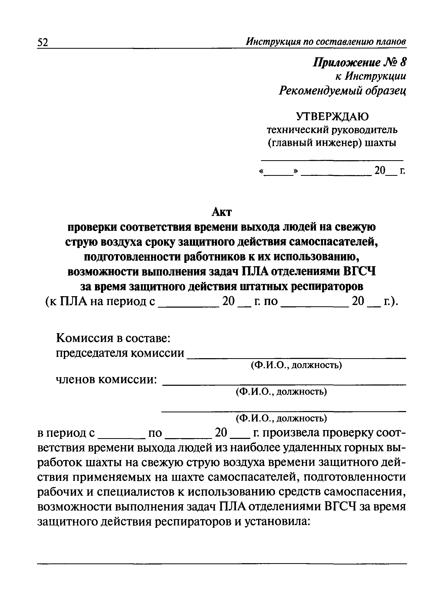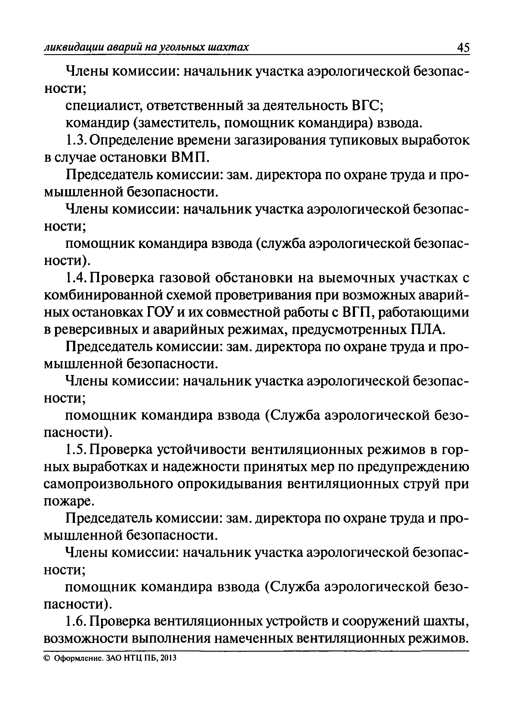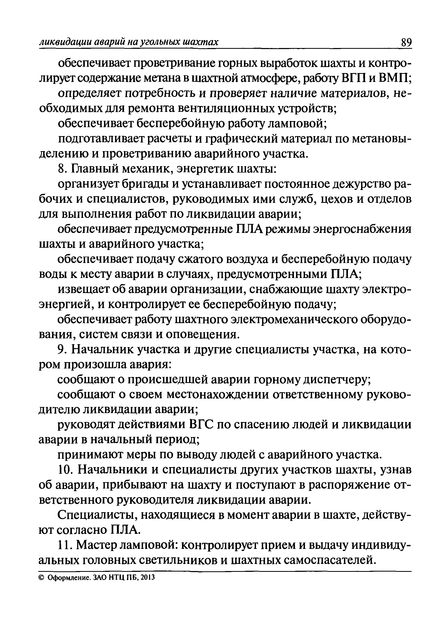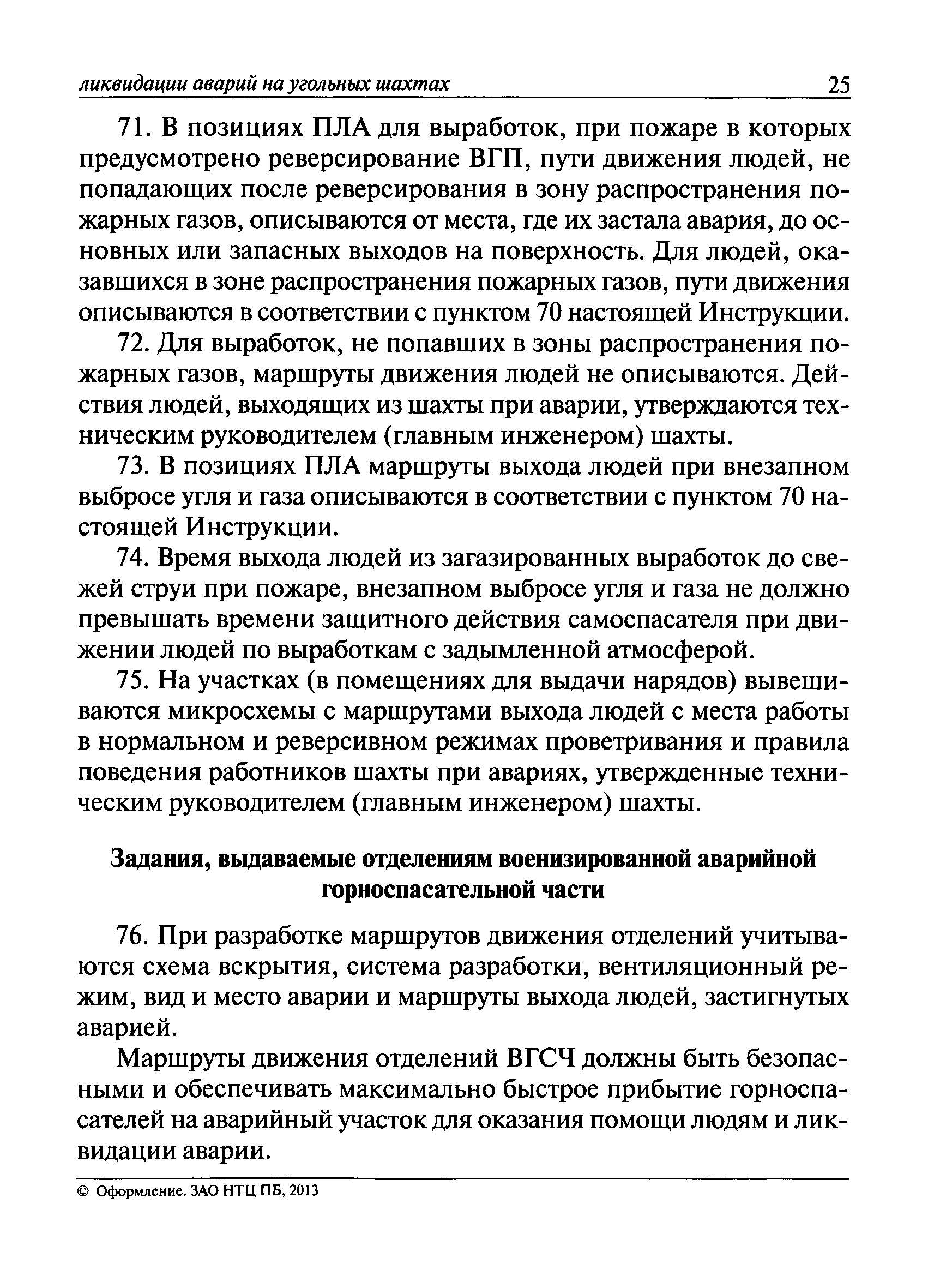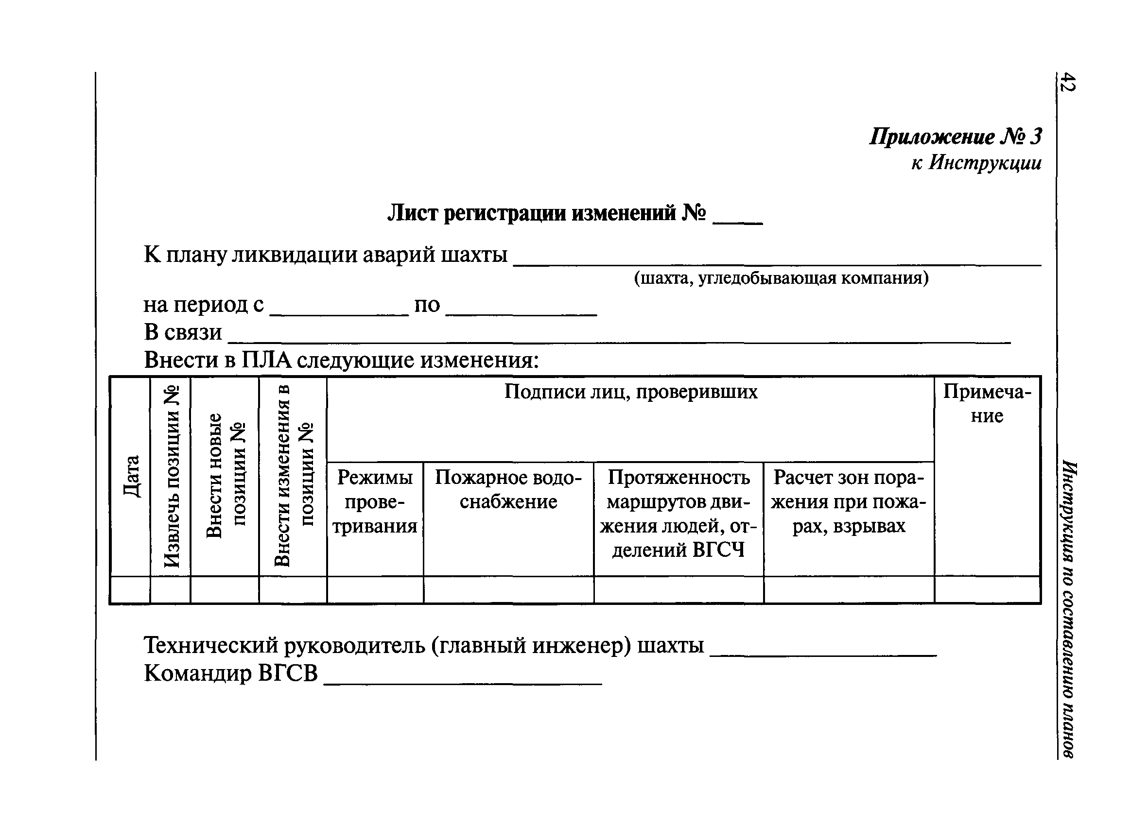 | Оглавление: | I. Общие положения II. Оперативная часть плана ликвидации аварий III. Графическая часть IV. Порядок внесения изменений и дополнений в план ликвидации аварий V. Мероприятия по спасению людей и ликвидации аварий, включаемые в общие для шахты позиции плана ликвидации аварий Приложение № 1. Заключение профилактической службы ВГСО о противоаварийной готовности шахты Приложение № 2. План ликвидации аварии на шахте Приложение № 3. Лист регистрации изменений Приложение № 4. Состав ПЛА Приложение № 5. Приказ о создании комиссий по организации проверок готовности шахты к согласованию ПЛА Приложение № 6. Протокол совещания по результатам проверок состояния противоаварийной защиты шахты Приложение № 7. Акт проверки обеспеченности шахты, ее горизонтов, панелей, очистных и подготовительных выработок запасными выходами, пригодности выработок шахты для передвижения и прохода горноспасателей в респираторах Приложение № 8. Акт проверки соответствия времени выхода людей на свежую струю воздуха сроку защитного действия самоспасателей, подготовленности работников к их использованию, возможности выполнения задач ПЛА отделениями ВГСЧ за время защитного действия штатных респираторов Приложение № 9. Акт определения времени загазирования тупиковых забоев в случае остановки вентиляторов местного проветривания Приложение № 10. Акт оценки газовой обстановки на выемочных участках с комбинированной схемой проветривания при возможных аварийных остановках ГОУ и их совместной работе с ВГП, работающими в аварийных режимах Приложение № 11. Акт проверки устойчивости вентиляционных режимов в горных выработках шахты и эффективности принятых мер по предотвращению самопроизвольного опрокидывания вентиляционной струи при пожаре Приложение № 12. Акт проверки состояния вентиляционных устройств и вентиляторных установок, а также возможности выполнения намечаемых вентиляционных режимов Приложение № 13. Акт проверки состояния средств связи, систем оповещения об аварии и средств поиска людей, застигнутых аварией Приложение № 14. Акт проверки ВГС Приложение № 15. Акт проверки обеспеченности шахты средствами пожаротушения и их состояния, оценки технической возможности реализации режимов водоснабжения шахты, предусматриваемых в позициях ПЛА, для организации подачи воды на цели пожаротушения Приложение № 16. Акт проверки аварийных вентиляционных режимов, предусмотренных ПЛА Приложение № 17. Протокол рассмотрения плана ликвидации аварии шахты Приложение № 18. Оперативный журнал Приложение № 19. Список членов ВГС шахты Приложение № 20. Положение о командном пункте по ликвидации аварии Приложение № 21. Приказ о размещении в административно-бытовом комбинате специальных служб при авариях Приложение № 22. Действия должностных лиц и специалистов, участвующих в ликвидации аварий Приложение № 23. Действия работников, застигнутых аварией в шахте Приложение № 24. Критерий разработки позиций ПЛА в зависимости от вида аварии Приложение № 25. Список № 1 должностных лиц и учреждений, извещаемых об аварии Приложение № 26. Мероприятия по аварийной подаче воды на тушение пожара Приложение № 27. Очередность направления отделений ВГСЧ и выдаваемые им задания для спасения людей и ликвидации аварии Приложение № 28. План взаимодействия отделений ВГСЧ и пожа
