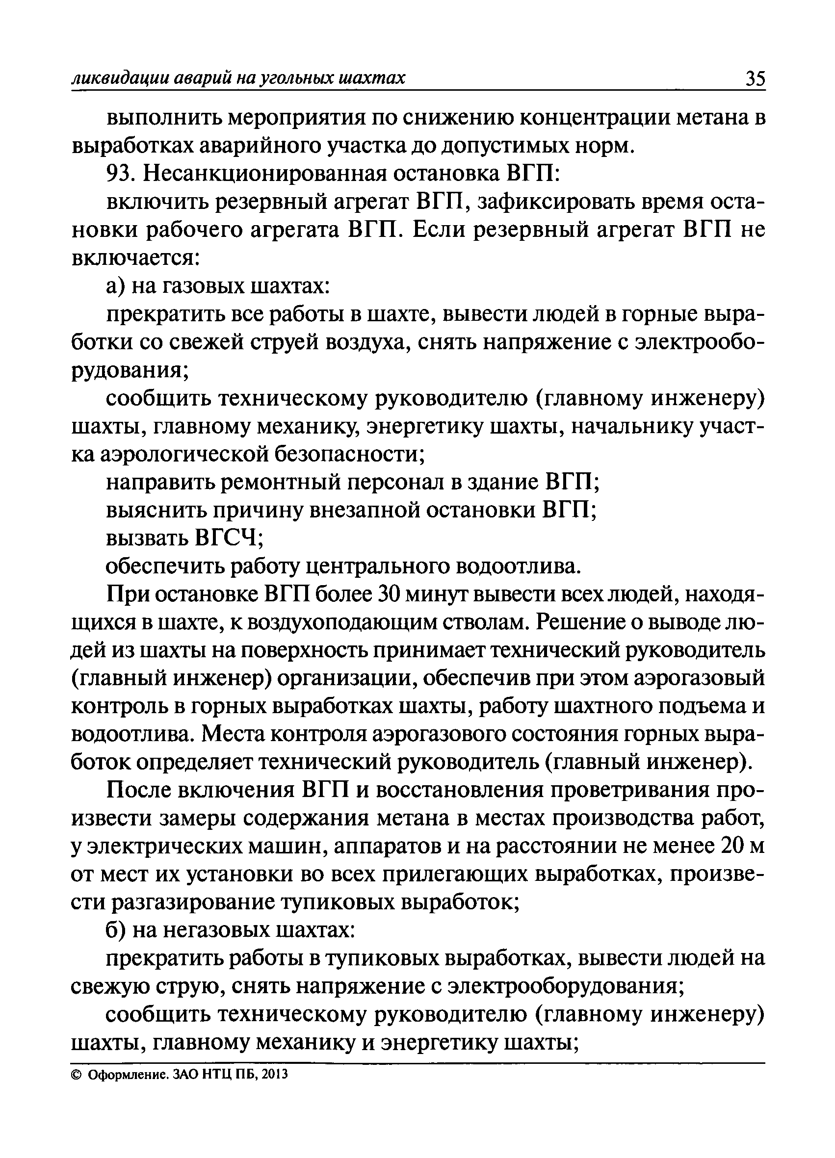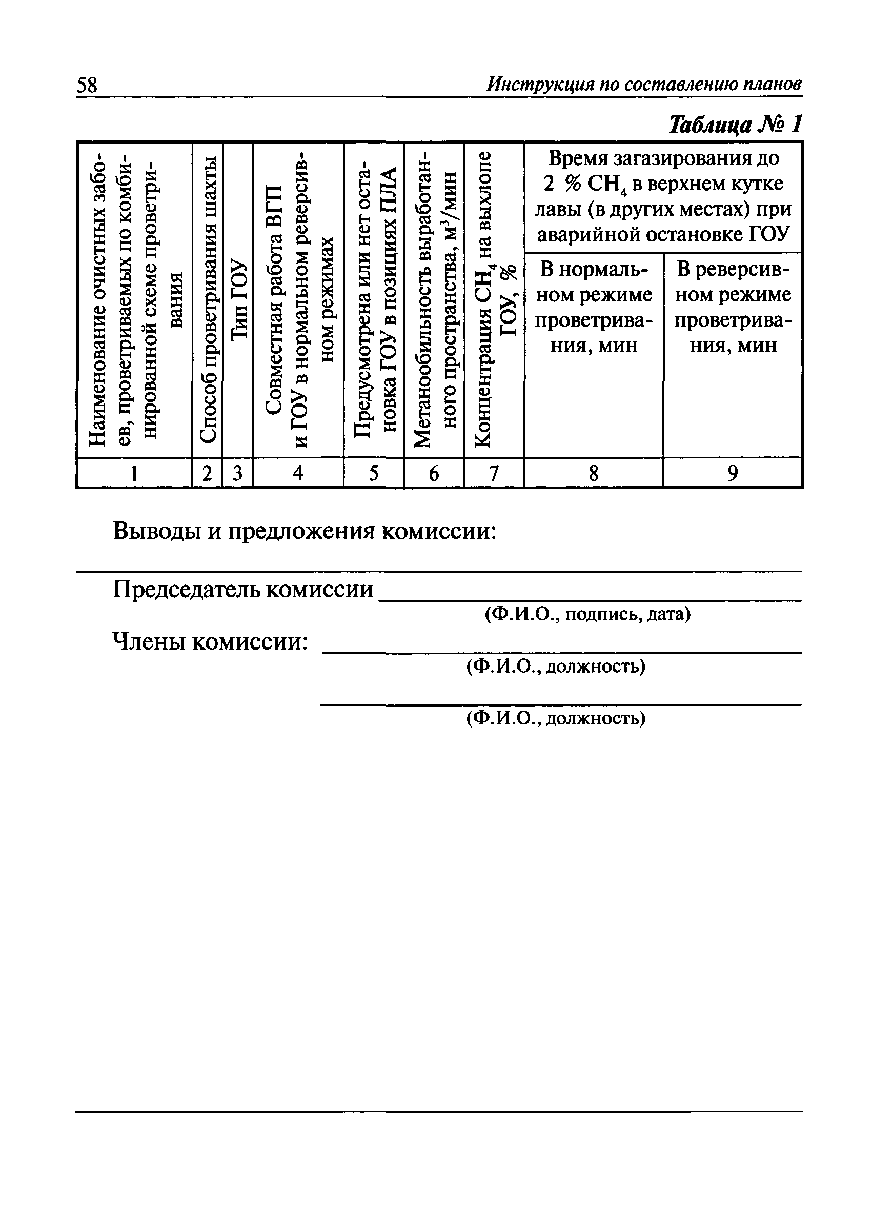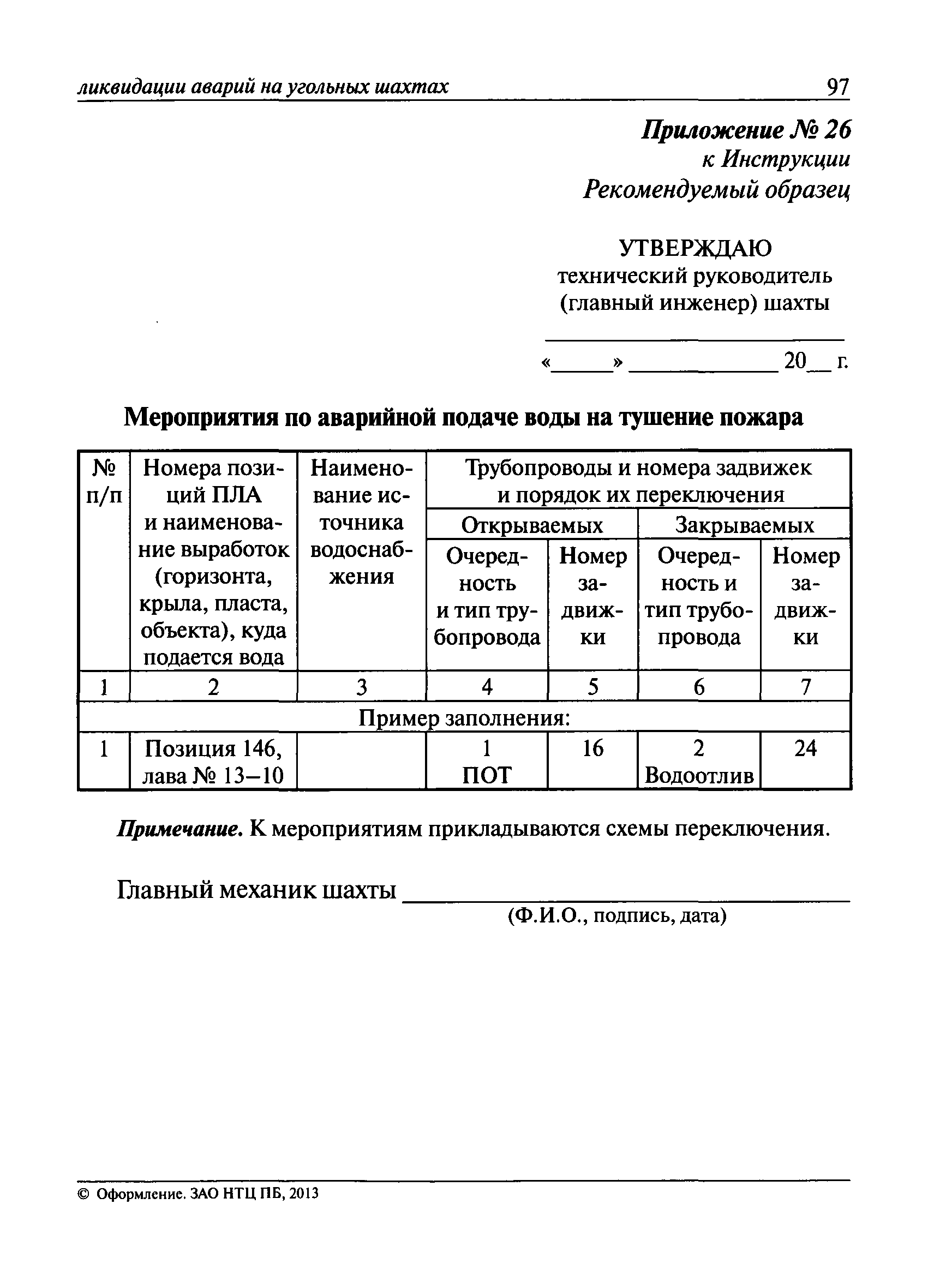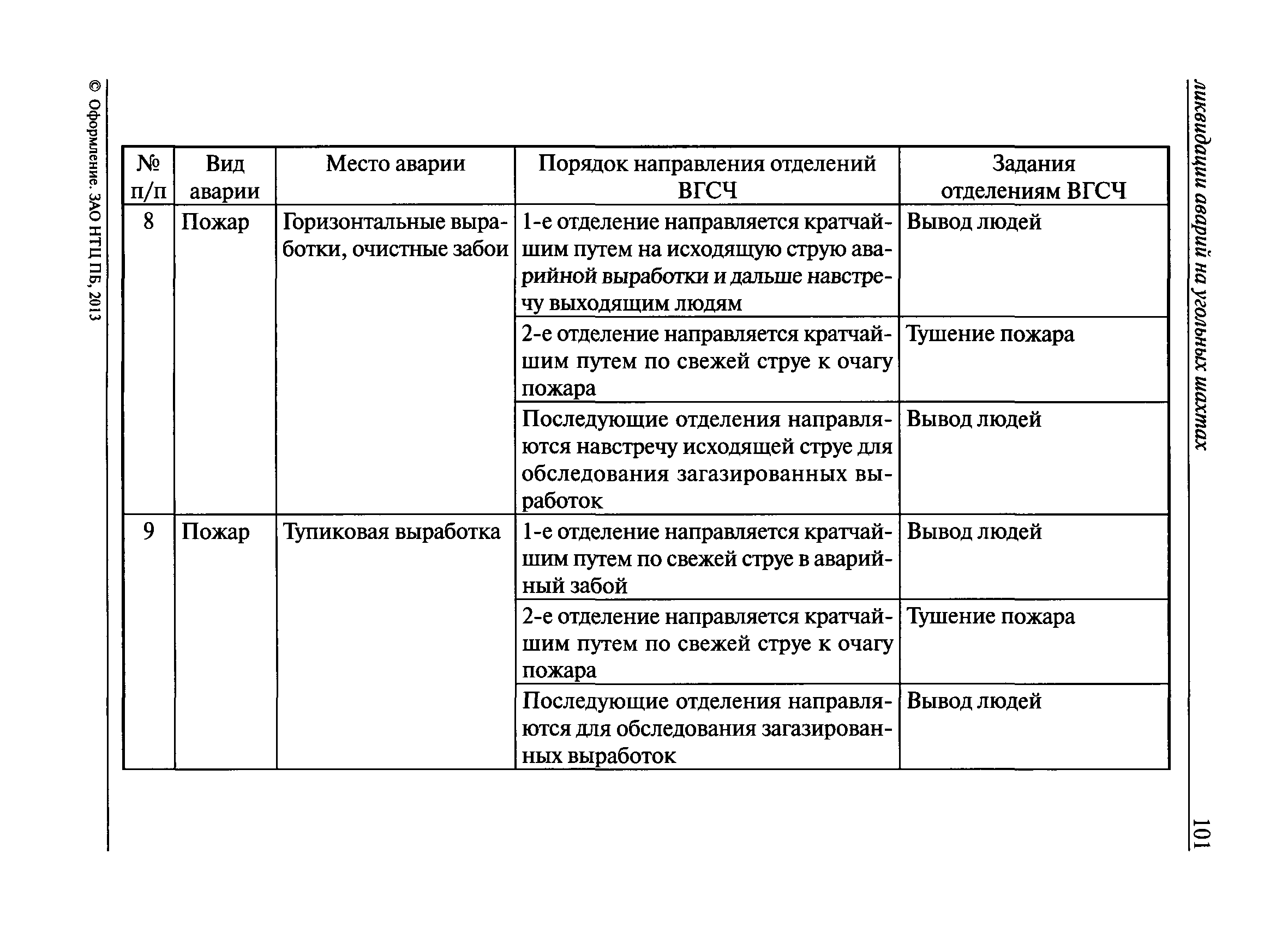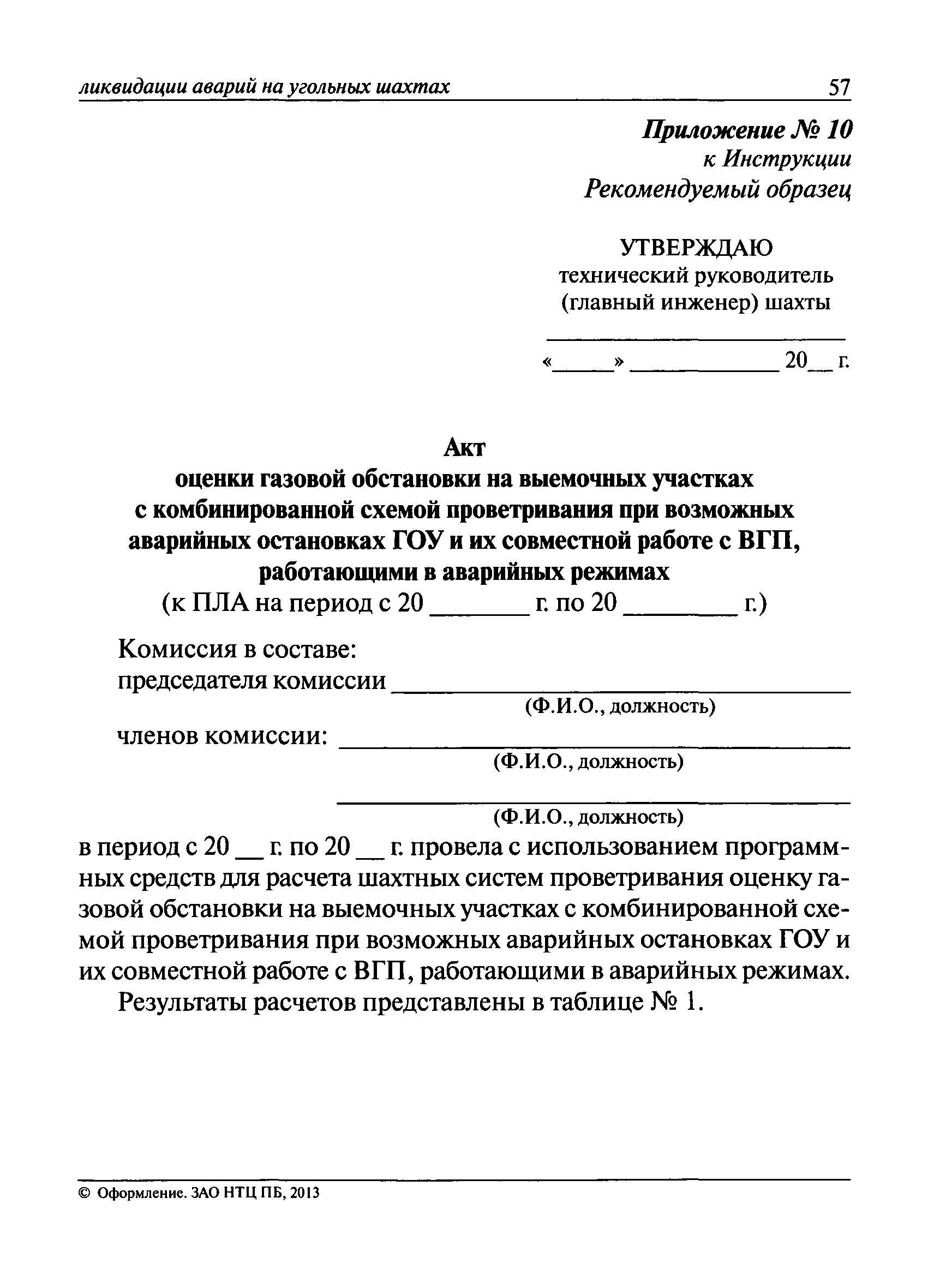 | Оглавление: | I. Общие положения II. Оперативная часть плана ликвидации аварий III. Графическая часть IV. Порядок внесения изменений и дополнений в план ликвидации аварий V. Мероприятия по спасению людей и ликвидации аварий, включаемые в общие для шахты позиции плана ликвидации аварий Приложение № 1. Заключение профилактической службы ВГСО о противоаварийной готовности шахты Приложение № 2. План ликвидации аварии на шахте Приложение № 3. Лист регистрации изменений Приложение № 4. Состав ПЛА Приложение № 5. Приказ о создании комиссий по организации проверок готовности шахты к согласованию ПЛА Приложение № 6. Протокол совещания по результатам проверок состояния противоаварийной защиты шахты Приложение № 7. Акт проверки обеспеченности шахты, ее горизонтов, панелей, очистных и подготовительных выработок запасными выходами, пригодности выработок шахты для передвижения и прохода горноспасателей в респираторах Приложение № 8. Акт проверки соответствия времени выхода людей на свежую струю воздуха сроку защитного действия самоспасателей, подготовленности работников к их использованию, возможности выполнения задач ПЛА отделениями ВГСЧ за время защитного действия штатных респираторов Приложение № 9. Акт определения времени загазирования тупиковых забоев в случае остановки вентиляторов местного проветривания Приложение № 10. Акт оценки газовой обстановки на выемочных участках с комбинированной схемой проветривания при возможных аварийных остановках ГОУ и их совместной работе с ВГП, работающими в аварийных режимах Приложение № 11. Акт проверки устойчивости вентиляционных режимов в горных выработках шахты и эффективности принятых мер по предотвращению самопроизвольного опрокидывания вентиляционной струи при пожаре Приложение № 12. Акт проверки состояния вентиляционных устройств и вентиляторных установок, а также возможности выполнения намечаемых вентиляционных режимов Приложение № 13. Акт проверки состояния средств связи, систем оповещения об аварии и средств поиска людей, застигнутых аварией Приложение № 14. Акт проверки ВГС Приложение № 15. Акт проверки обеспеченности шахты средствами пожаротушения и их состояния, оценки технической возможности реализации режимов водоснабжения шахты, предусматриваемых в позициях ПЛА, для организации подачи воды на цели пожаротушения Приложение № 16. Акт проверки аварийных вентиляционных режимов, предусмотренных ПЛА Приложение № 17. Протокол рассмотрения плана ликвидации аварии шахты Приложение № 18. Оперативный журнал Приложение № 19. Список членов ВГС шахты Приложение № 20. Положение о командном пункте по ликвидации аварии Приложение № 21. Приказ о размещении в административно-бытовом комбинате специальных служб при авариях Приложение № 22. Действия должностных лиц и специалистов, участвующих в ликвидации аварий Приложение № 23. Действия работников, застигнутых аварией в шахте Приложение № 24. Критерий разработки позиций ПЛА в зависимости от вида аварии Приложение № 25. Список № 1 должностных лиц и учреждений, извещаемых об аварии Приложение № 26. Мероприятия по аварийной подаче воды на тушение пожара Приложение № 27. Очередность направления отделений ВГСЧ и выдаваемые им задания для спасения людей и ликвидации аварии Приложение № 28. План взаимодействия отделений ВГСЧ и пожа