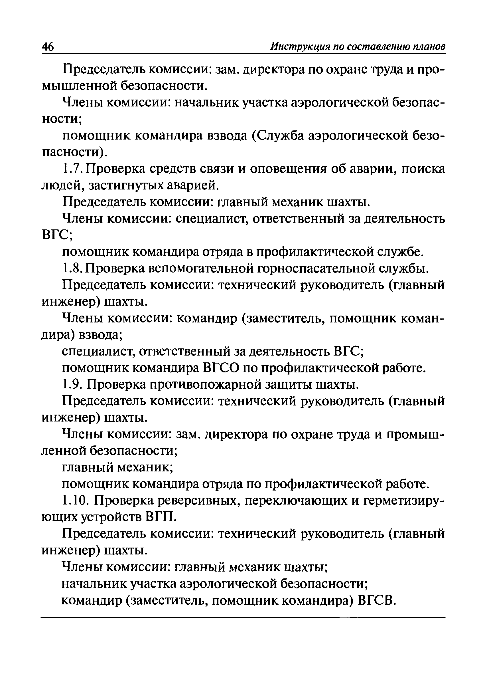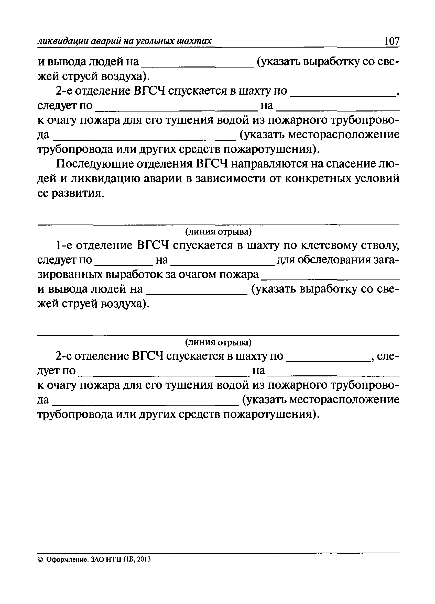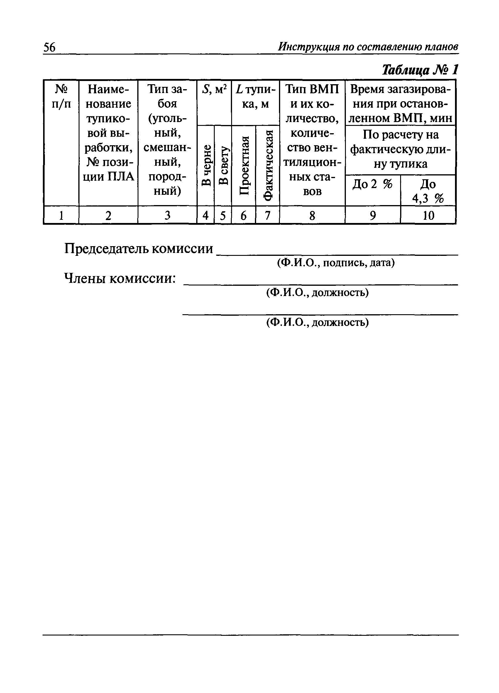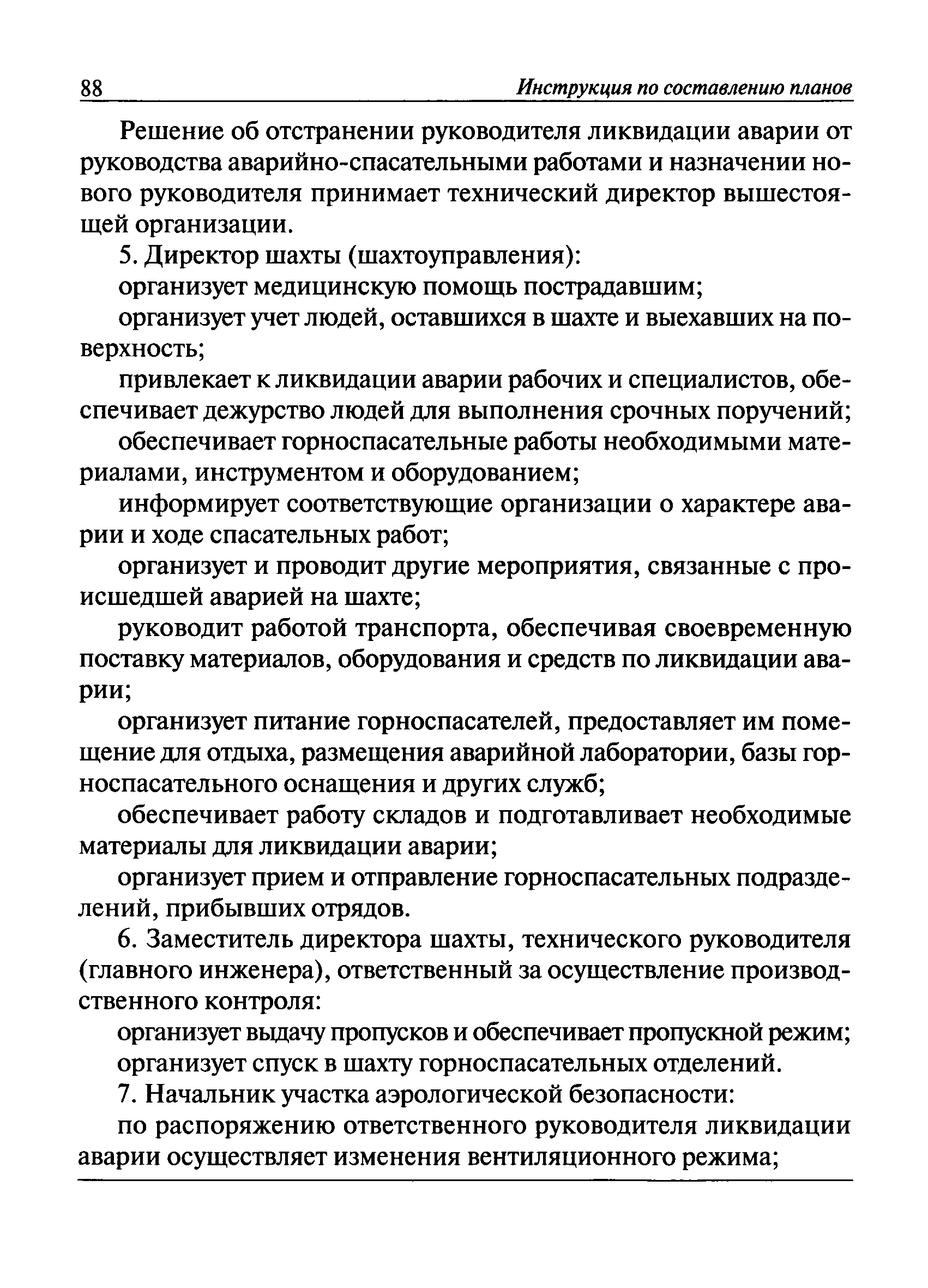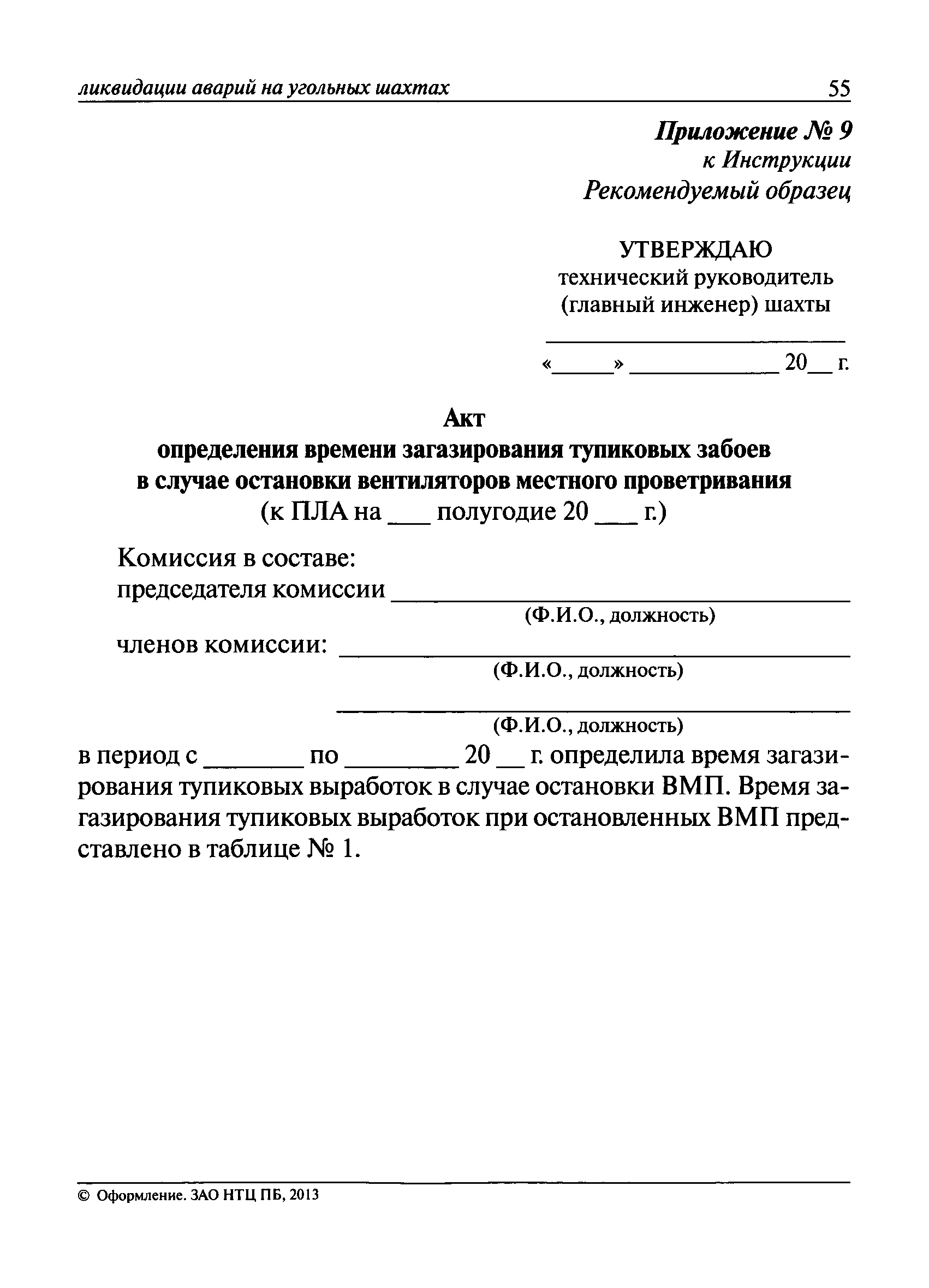 | Оглавление: | I. Общие положения II. Оперативная часть плана ликвидации аварий III. Графическая часть IV. Порядок внесения изменений и дополнений в план ликвидации аварий V. Мероприятия по спасению людей и ликвидации аварий, включаемые в общие для шахты позиции плана ликвидации аварий Приложение № 1. Заключение профилактической службы ВГСО о противоаварийной готовности шахты Приложение № 2. План ликвидации аварии на шахте Приложение № 3. Лист регистрации изменений Приложение № 4. Состав ПЛА Приложение № 5. Приказ о создании комиссий по организации проверок готовности шахты к согласованию ПЛА Приложение № 6. Протокол совещания по результатам проверок состояния противоаварийной защиты шахты Приложение № 7. Акт проверки обеспеченности шахты, ее горизонтов, панелей, очистных и подготовительных выработок запасными выходами, пригодности выработок шахты для передвижения и прохода горноспасателей в респираторах Приложение № 8. Акт проверки соответствия времени выхода людей на свежую струю воздуха сроку защитного действия самоспасателей, подготовленности работников к их использованию, возможности выполнения задач ПЛА отделениями ВГСЧ за время защитного действия штатных респираторов Приложение № 9. Акт определения времени загазирования тупиковых забоев в случае остановки вентиляторов местного проветривания Приложение № 10. Акт оценки газовой обстановки на выемочных участках с комбинированной схемой проветривания при возможных аварийных остановках ГОУ и их совместной работе с ВГП, работающими в аварийных режимах Приложение № 11. Акт проверки устойчивости вентиляционных режимов в горных выработках шахты и эффективности принятых мер по предотвращению самопроизвольного опрокидывания вентиляционной струи при пожаре Приложение № 12. Акт проверки состояния вентиляционных устройств и вентиляторных установок, а также возможности выполнения намечаемых вентиляционных режимов Приложение № 13. Акт проверки состояния средств связи, систем оповещения об аварии и средств поиска людей, застигнутых аварией Приложение № 14. Акт проверки ВГС Приложение № 15. Акт проверки обеспеченности шахты средствами пожаротушения и их состояния, оценки технической возможности реализации режимов водоснабжения шахты, предусматриваемых в позициях ПЛА, для организации подачи воды на цели пожаротушения Приложение № 16. Акт проверки аварийных вентиляционных режимов, предусмотренных ПЛА Приложение № 17. Протокол рассмотрения плана ликвидации аварии шахты Приложение № 18. Оперативный журнал Приложение № 19. Список членов ВГС шахты Приложение № 20. Положение о командном пункте по ликвидации аварии Приложение № 21. Приказ о размещении в административно-бытовом комбинате специальных служб при авариях Приложение № 22. Действия должностных лиц и специалистов, участвующих в ликвидации аварий Приложение № 23. Действия работников, застигнутых аварией в шахте Приложение № 24. Критерий разработки позиций ПЛА в зависимости от вида аварии Приложение № 25. Список № 1 должностных лиц и учреждений, извещаемых об аварии Приложение № 26. Мероприятия по аварийной подаче воды на тушение пожара Приложение № 27. Очередность направления отделений ВГСЧ и выдаваемые им задания для спасения людей и ликвидации аварии Приложение № 28. План взаимодействия отделений ВГСЧ и пожа