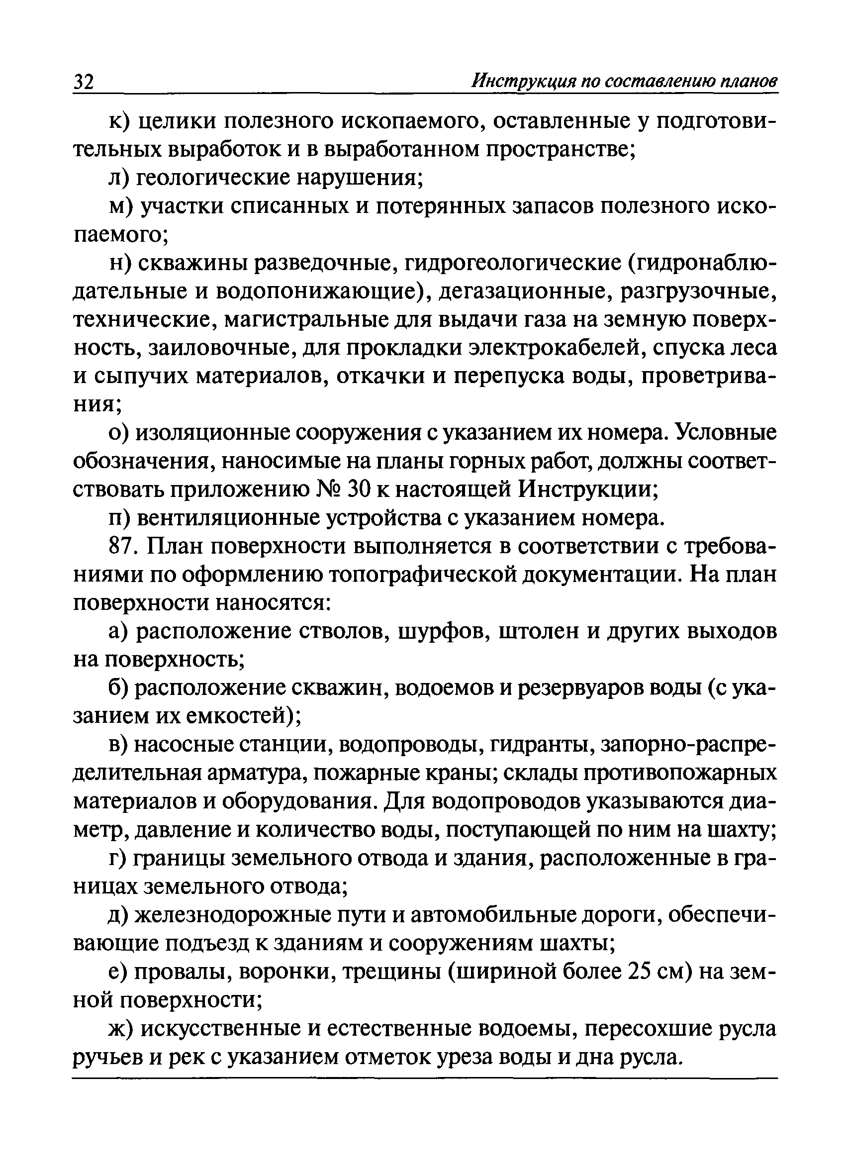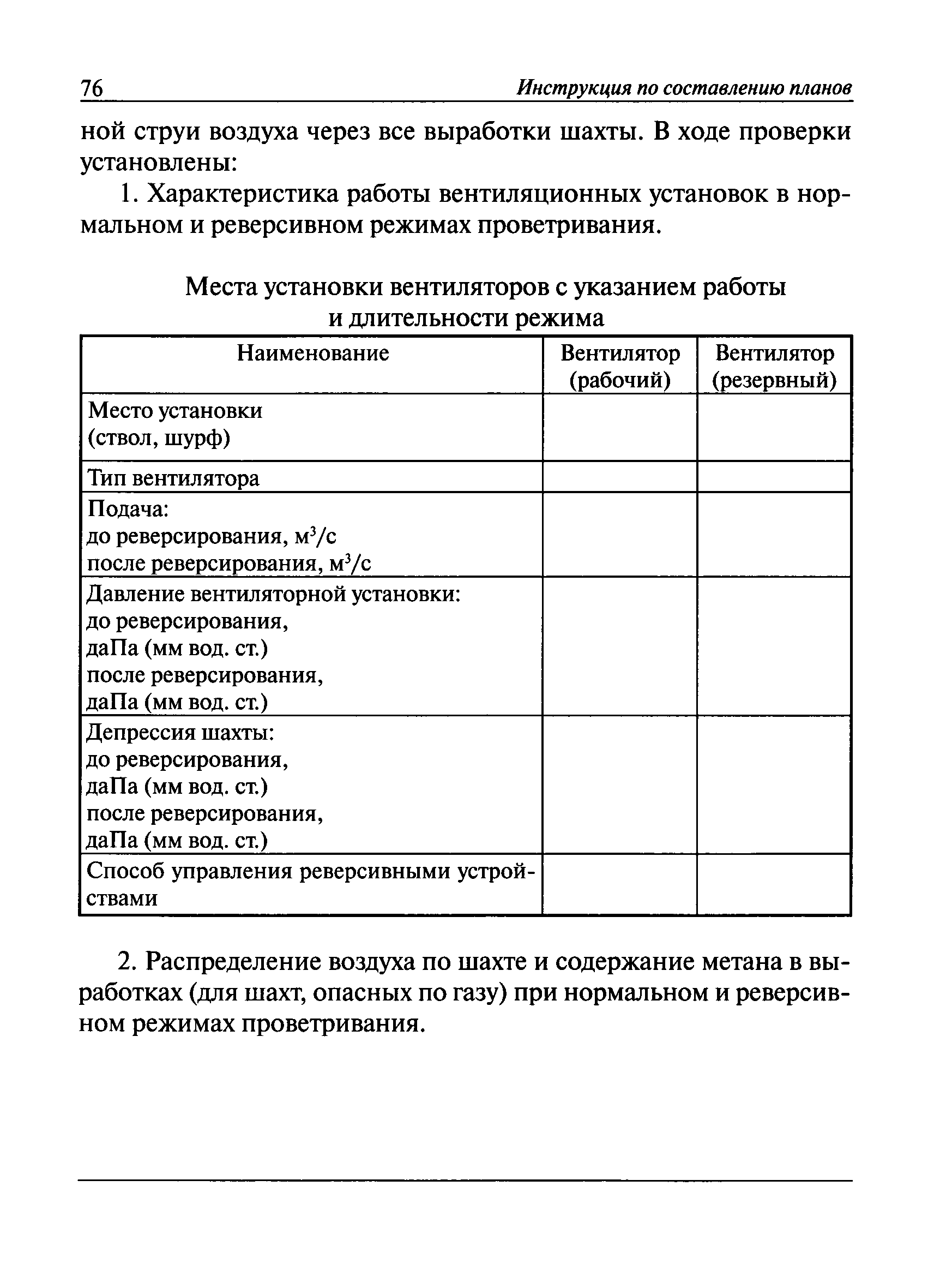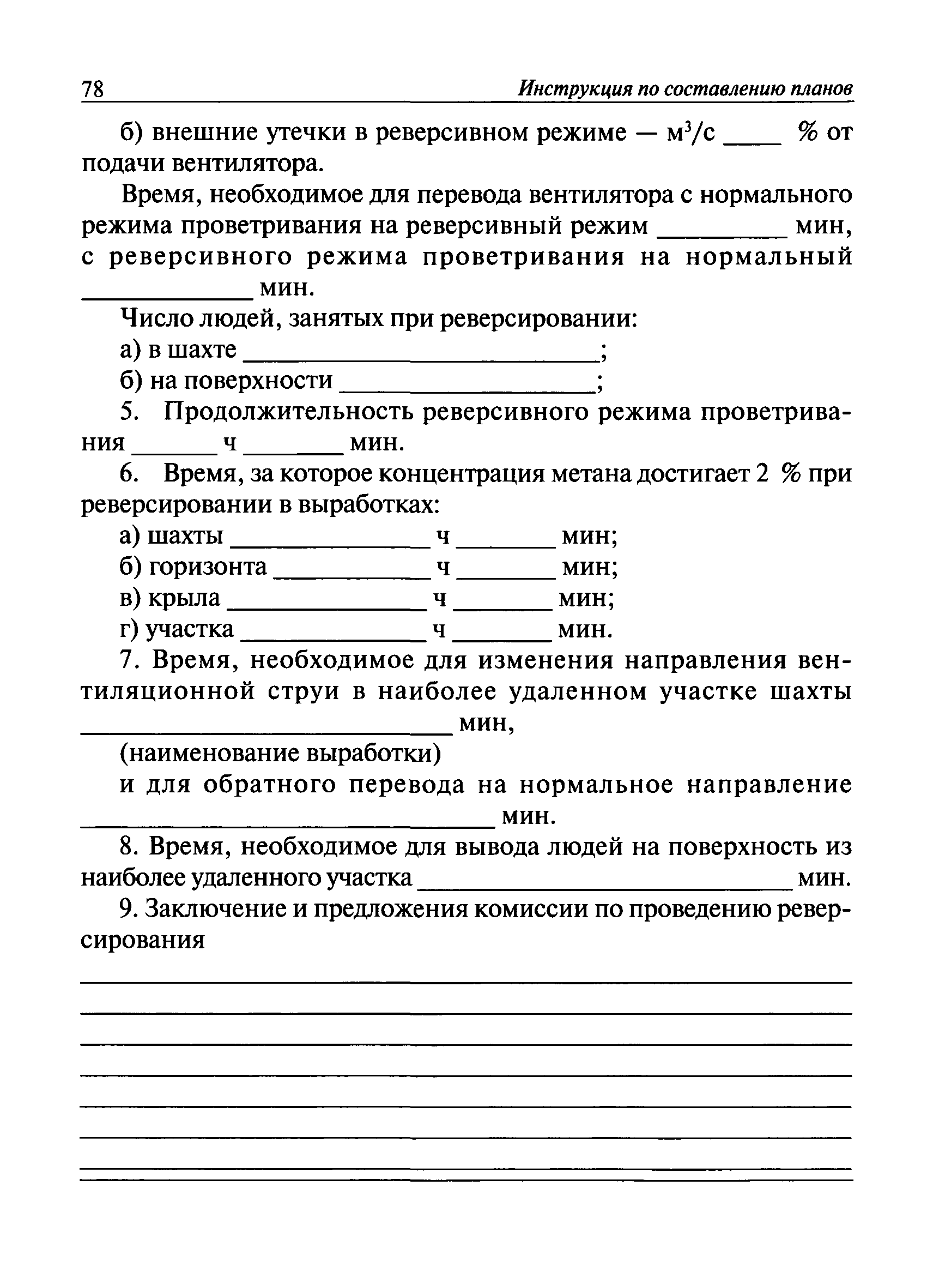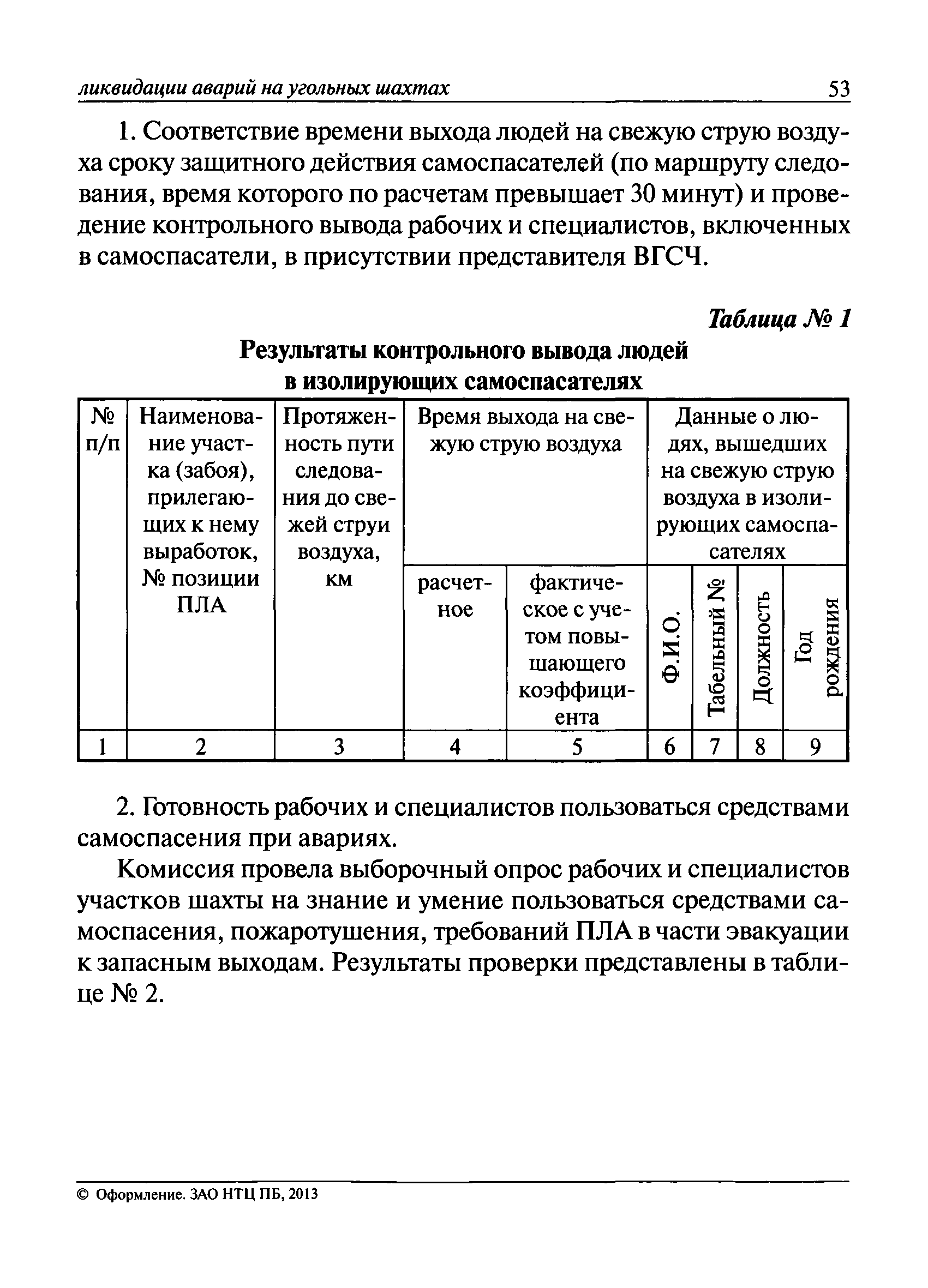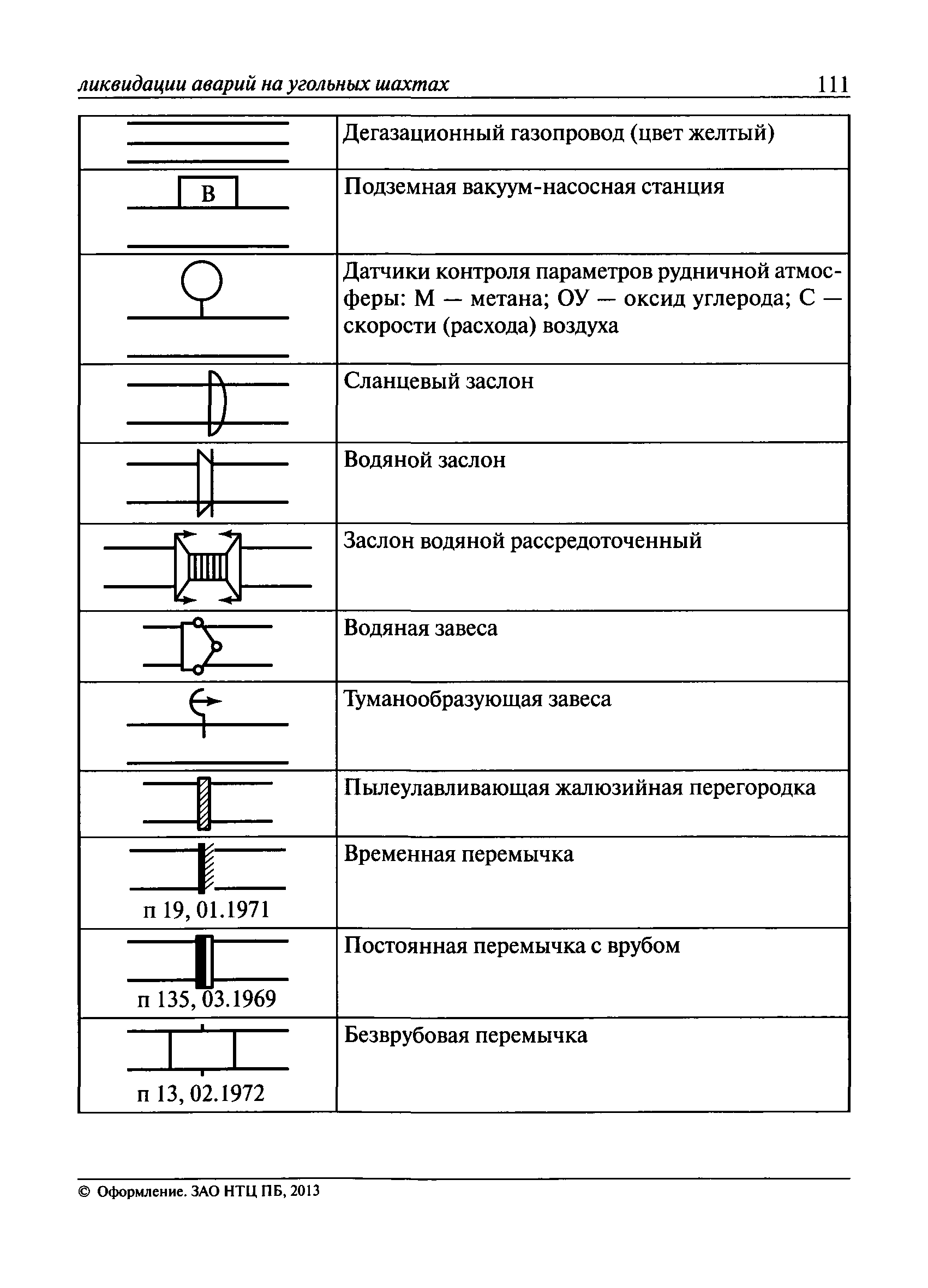 | Оглавление: | I. Общие положения II. Оперативная часть плана ликвидации аварий III. Графическая часть IV. Порядок внесения изменений и дополнений в план ликвидации аварий V. Мероприятия по спасению людей и ликвидации аварий, включаемые в общие для шахты позиции плана ликвидации аварий Приложение № 1. Заключение профилактической службы ВГСО о противоаварийной готовности шахты Приложение № 2. План ликвидации аварии на шахте Приложение № 3. Лист регистрации изменений Приложение № 4. Состав ПЛА Приложение № 5. Приказ о создании комиссий по организации проверок готовности шахты к согласованию ПЛА Приложение № 6. Протокол совещания по результатам проверок состояния противоаварийной защиты шахты Приложение № 7. Акт проверки обеспеченности шахты, ее горизонтов, панелей, очистных и подготовительных выработок запасными выходами, пригодности выработок шахты для передвижения и прохода горноспасателей в респираторах Приложение № 8. Акт проверки соответствия времени выхода людей на свежую струю воздуха сроку защитного действия самоспасателей, подготовленности работников к их использованию, возможности выполнения задач ПЛА отделениями ВГСЧ за время защитного действия штатных респираторов Приложение № 9. Акт определения времени загазирования тупиковых забоев в случае остановки вентиляторов местного проветривания Приложение № 10. Акт оценки газовой обстановки на выемочных участках с комбинированной схемой проветривания при возможных аварийных остановках ГОУ и их совместной работе с ВГП, работающими в аварийных режимах Приложение № 11. Акт проверки устойчивости вентиляционных режимов в горных выработках шахты и эффективности принятых мер по предотвращению самопроизвольного опрокидывания вентиляционной струи при пожаре Приложение № 12. Акт проверки состояния вентиляционных устройств и вентиляторных установок, а также возможности выполнения намечаемых вентиляционных режимов Приложение № 13. Акт проверки состояния средств связи, систем оповещения об аварии и средств поиска людей, застигнутых аварией Приложение № 14. Акт проверки ВГС Приложение № 15. Акт проверки обеспеченности шахты средствами пожаротушения и их состояния, оценки технической возможности реализации режимов водоснабжения шахты, предусматриваемых в позициях ПЛА, для организации подачи воды на цели пожаротушения Приложение № 16. Акт проверки аварийных вентиляционных режимов, предусмотренных ПЛА Приложение № 17. Протокол рассмотрения плана ликвидации аварии шахты Приложение № 18. Оперативный журнал Приложение № 19. Список членов ВГС шахты Приложение № 20. Положение о командном пункте по ликвидации аварии Приложение № 21. Приказ о размещении в административно-бытовом комбинате специальных служб при авариях Приложение № 22. Действия должностных лиц и специалистов, участвующих в ликвидации аварий Приложение № 23. Действия работников, застигнутых аварией в шахте Приложение № 24. Критерий разработки позиций ПЛА в зависимости от вида аварии Приложение № 25. Список № 1 должностных лиц и учреждений, извещаемых об аварии Приложение № 26. Мероприятия по аварийной подаче воды на тушение пожара Приложение № 27. Очередность направления отделений ВГСЧ и выдаваемые им задания для спасения людей и ликвидации аварии Приложение № 28. План взаимодействия отделений ВГСЧ и пожа