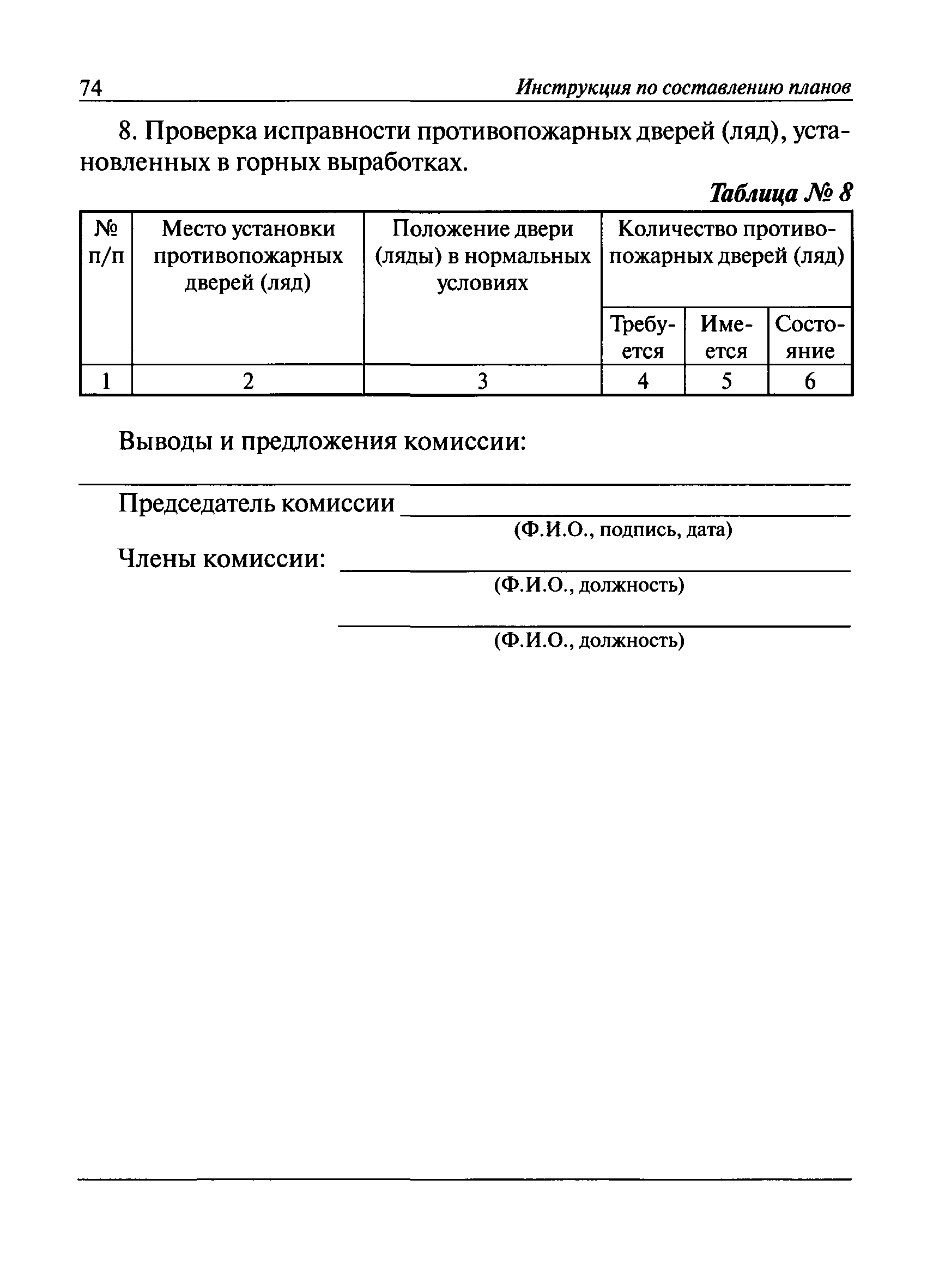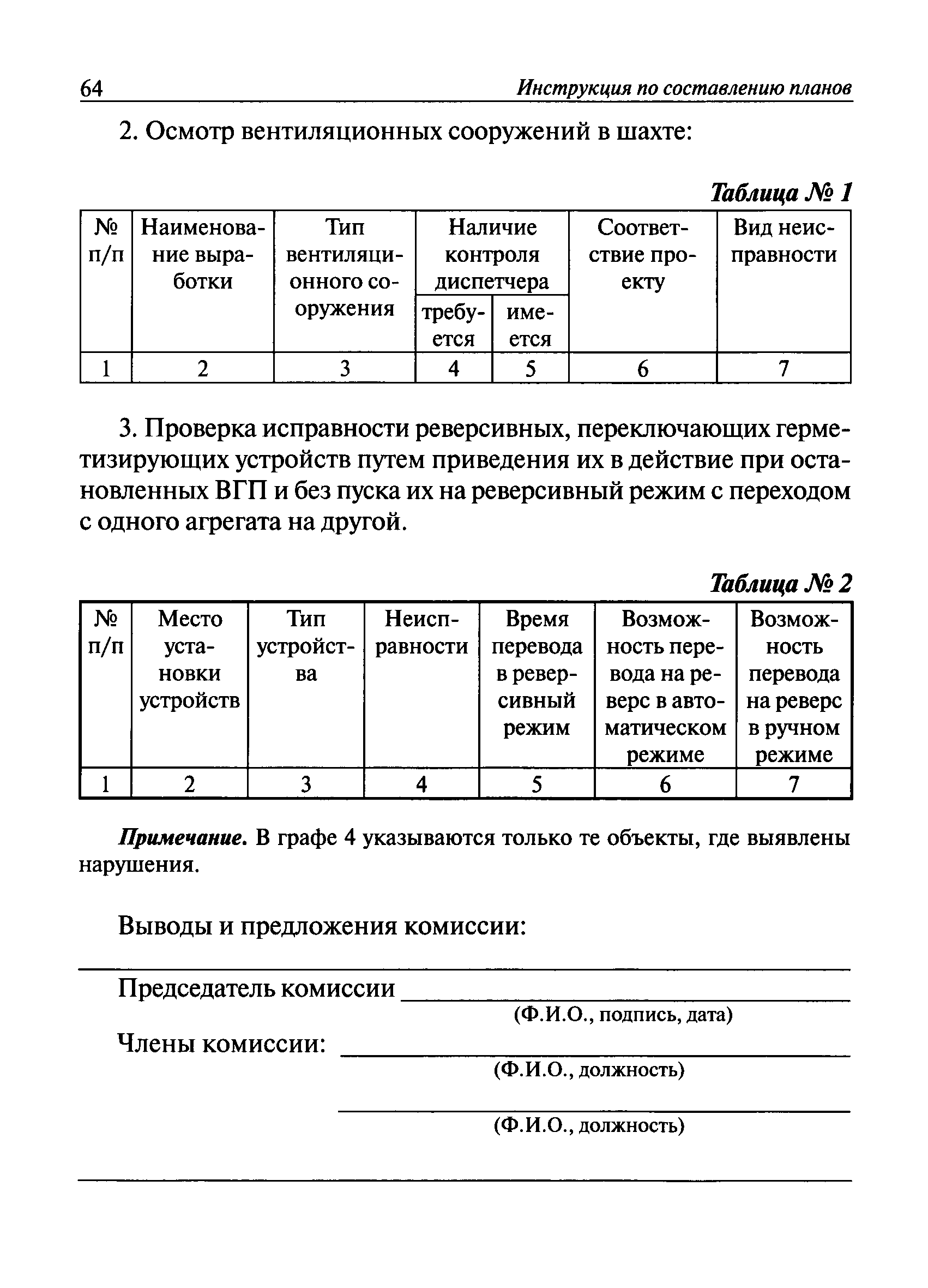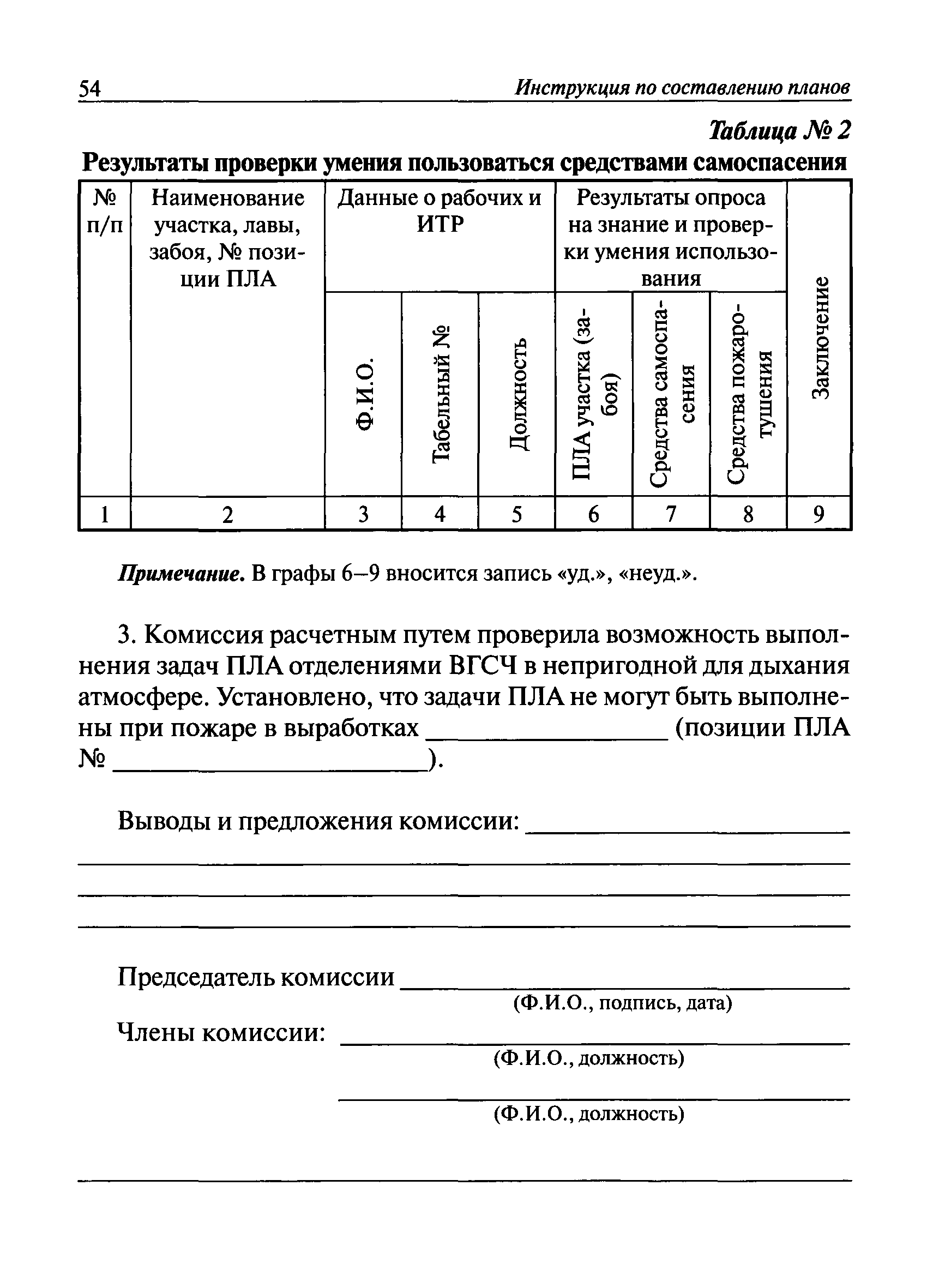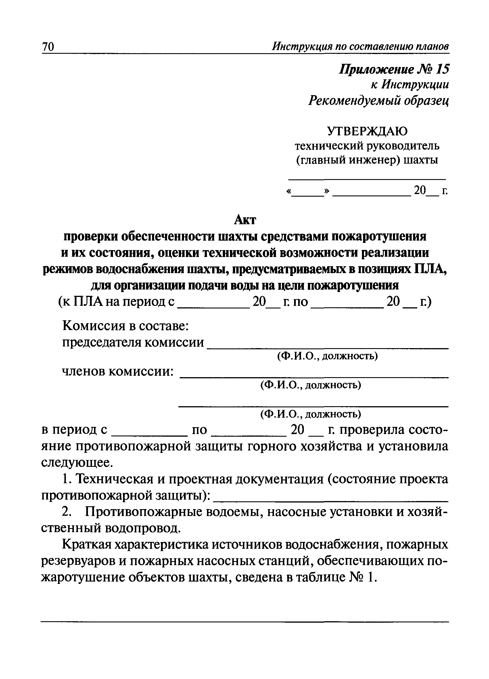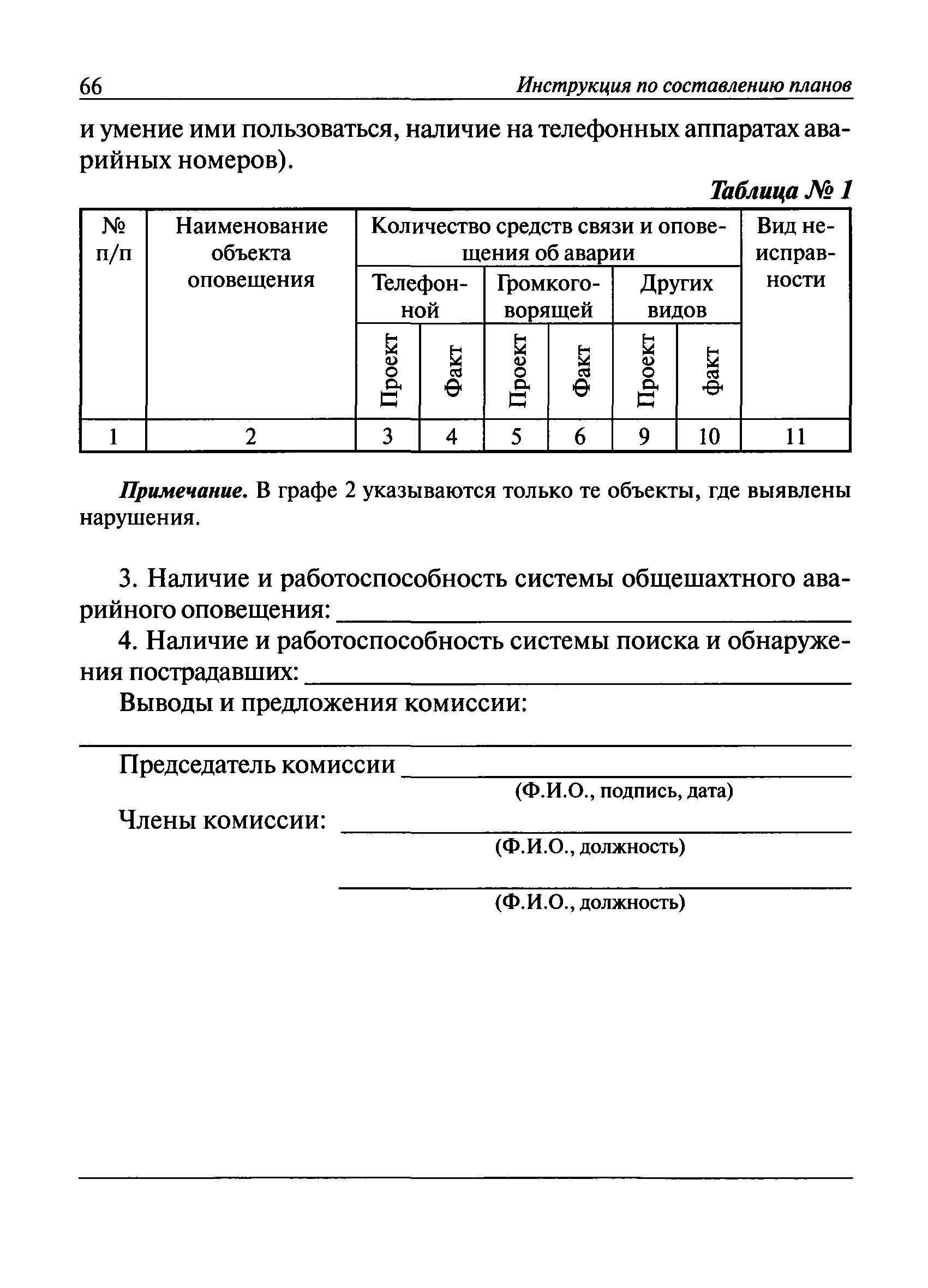 | Оглавление: | I. Общие положения II. Оперативная часть плана ликвидации аварий III. Графическая часть IV. Порядок внесения изменений и дополнений в план ликвидации аварий V. Мероприятия по спасению людей и ликвидации аварий, включаемые в общие для шахты позиции плана ликвидации аварий Приложение № 1. Заключение профилактической службы ВГСО о противоаварийной готовности шахты Приложение № 2. План ликвидации аварии на шахте Приложение № 3. Лист регистрации изменений Приложение № 4. Состав ПЛА Приложение № 5. Приказ о создании комиссий по организации проверок готовности шахты к согласованию ПЛА Приложение № 6. Протокол совещания по результатам проверок состояния противоаварийной защиты шахты Приложение № 7. Акт проверки обеспеченности шахты, ее горизонтов, панелей, очистных и подготовительных выработок запасными выходами, пригодности выработок шахты для передвижения и прохода горноспасателей в респираторах Приложение № 8. Акт проверки соответствия времени выхода людей на свежую струю воздуха сроку защитного действия самоспасателей, подготовленности работников к их использованию, возможности выполнения задач ПЛА отделениями ВГСЧ за время защитного действия штатных респираторов Приложение № 9. Акт определения времени загазирования тупиковых забоев в случае остановки вентиляторов местного проветривания Приложение № 10. Акт оценки газовой обстановки на выемочных участках с комбинированной схемой проветривания при возможных аварийных остановках ГОУ и их совместной работе с ВГП, работающими в аварийных режимах Приложение № 11. Акт проверки устойчивости вентиляционных режимов в горных выработках шахты и эффективности принятых мер по предотвращению самопроизвольного опрокидывания вентиляционной струи при пожаре Приложение № 12. Акт проверки состояния вентиляционных устройств и вентиляторных установок, а также возможности выполнения намечаемых вентиляционных режимов Приложение № 13. Акт проверки состояния средств связи, систем оповещения об аварии и средств поиска людей, застигнутых аварией Приложение № 14. Акт проверки ВГС Приложение № 15. Акт проверки обеспеченности шахты средствами пожаротушения и их состояния, оценки технической возможности реализации режимов водоснабжения шахты, предусматриваемых в позициях ПЛА, для организации подачи воды на цели пожаротушения Приложение № 16. Акт проверки аварийных вентиляционных режимов, предусмотренных ПЛА Приложение № 17. Протокол рассмотрения плана ликвидации аварии шахты Приложение № 18. Оперативный журнал Приложение № 19. Список членов ВГС шахты Приложение № 20. Положение о командном пункте по ликвидации аварии Приложение № 21. Приказ о размещении в административно-бытовом комбинате специальных служб при авариях Приложение № 22. Действия должностных лиц и специалистов, участвующих в ликвидации аварий Приложение № 23. Действия работников, застигнутых аварией в шахте Приложение № 24. Критерий разработки позиций ПЛА в зависимости от вида аварии Приложение № 25. Список № 1 должностных лиц и учреждений, извещаемых об аварии Приложение № 26. Мероприятия по аварийной подаче воды на тушение пожара Приложение № 27. Очередность направления отделений ВГСЧ и выдаваемые им задания для спасения людей и ликвидации аварии Приложение № 28. План взаимодействия отделений ВГСЧ и пожа