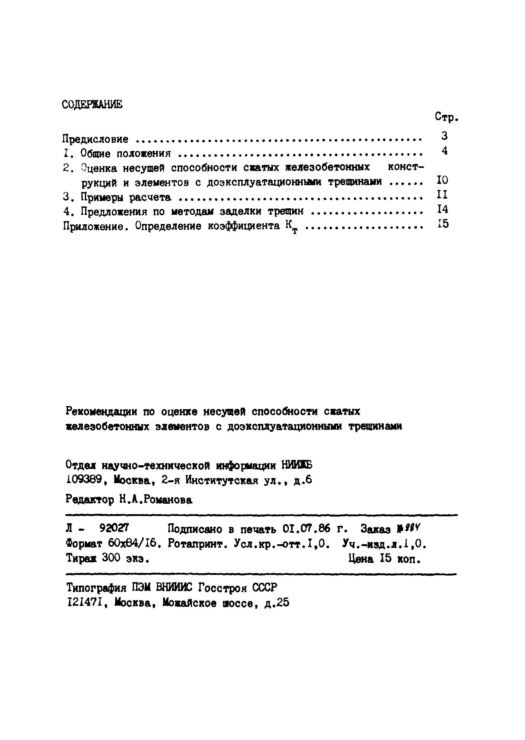 | Оглавление: | Предисловие 1. Общие положения 2. Оценка несущей способности сжатых железобетонных конструкций и элементов с доэксплуатационными трещинами 3. Примеры расчета 4. Предложения по методам заделки трещин Приложение. Определение коэффициента Кт |