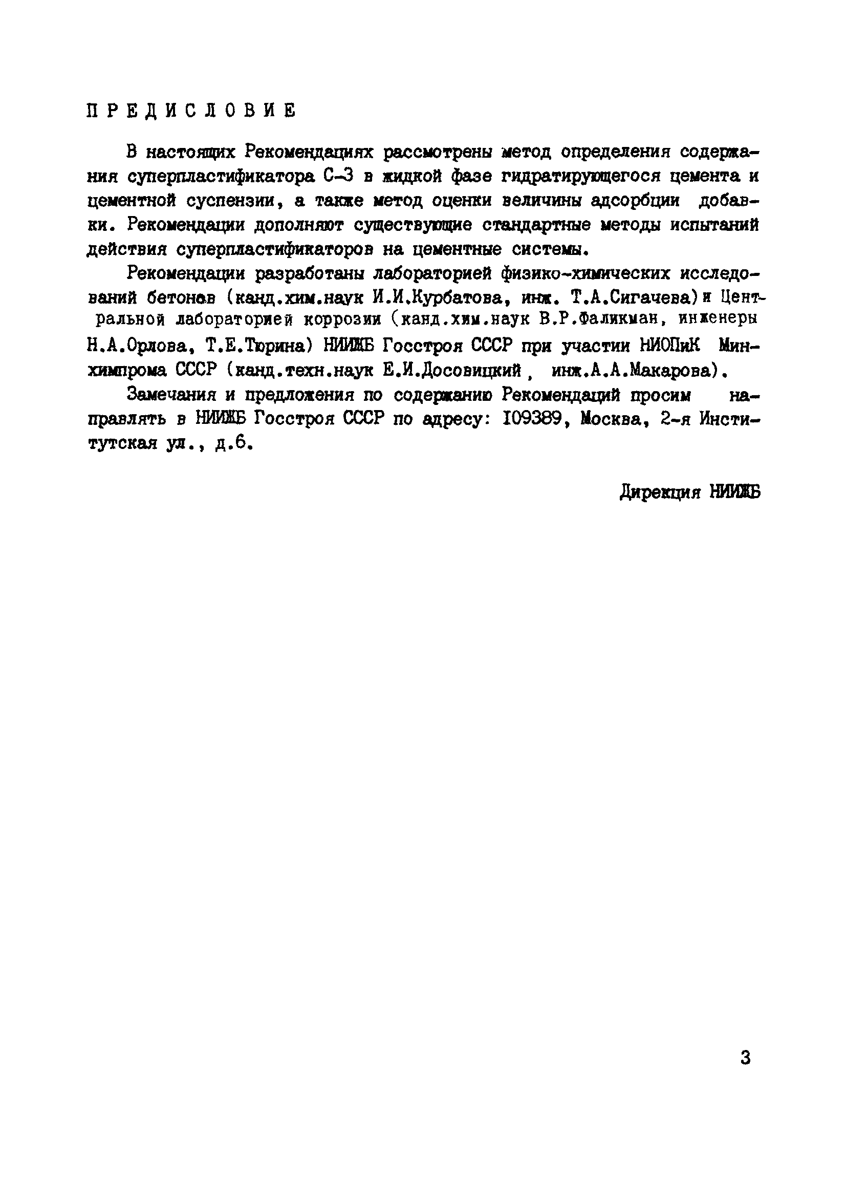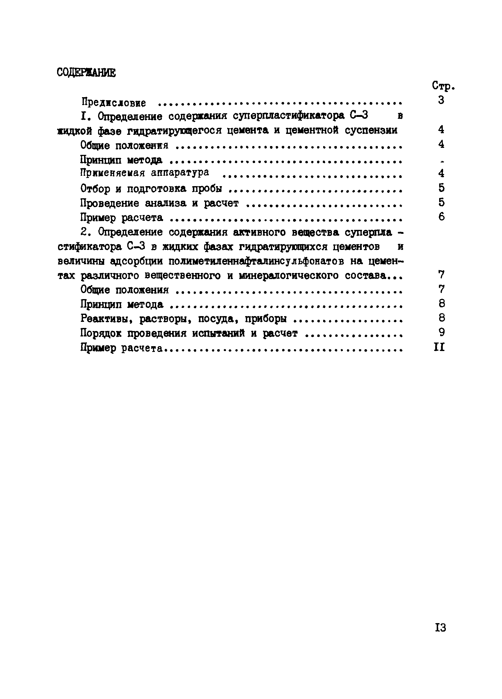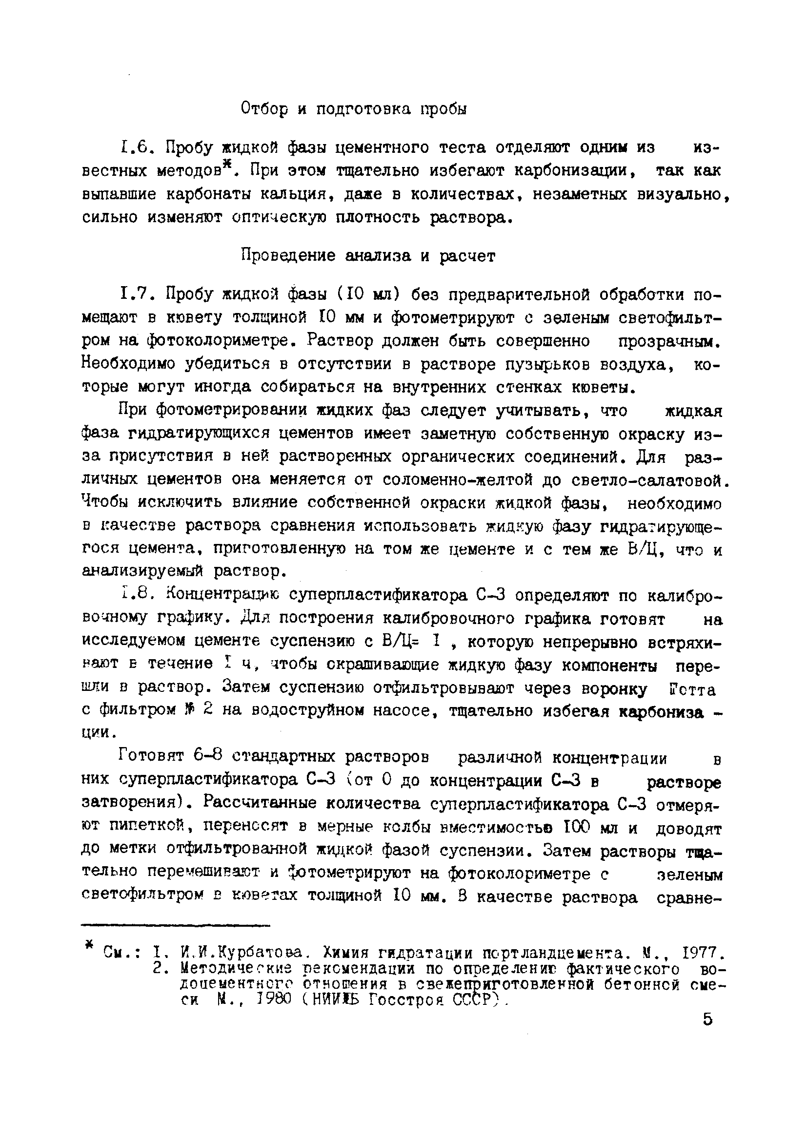 | Оглавление: | Предисловие 1. Определение содержания суперпластификатора С-З в жидкой фазе гидратирующегося цемента и цементной суспензии Общие положения Принцип метода Применяемая аппаратура Отбор и подготовка пробы Проведение анализа и расчет Пример расчета 2. Определение содержания активного вещества суперпластификатора С-З в жидких фазах гидратирующихся цементов и величины адсорбции полиметиленнафталинсульфонатов на цементах различного вещественного и минералогического состава Общие положения Принцип метода Реактивы, растворы, посуда, приборы Порядок проведения испытаний и расчет Пример расчета |