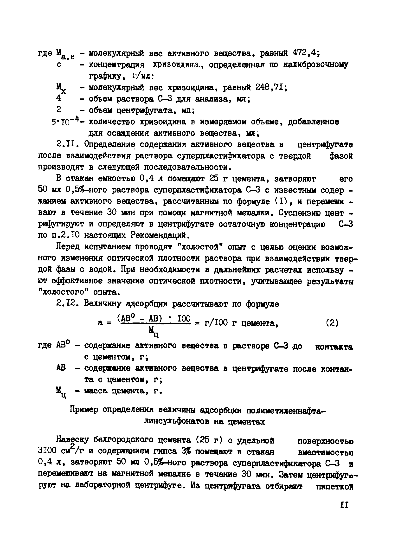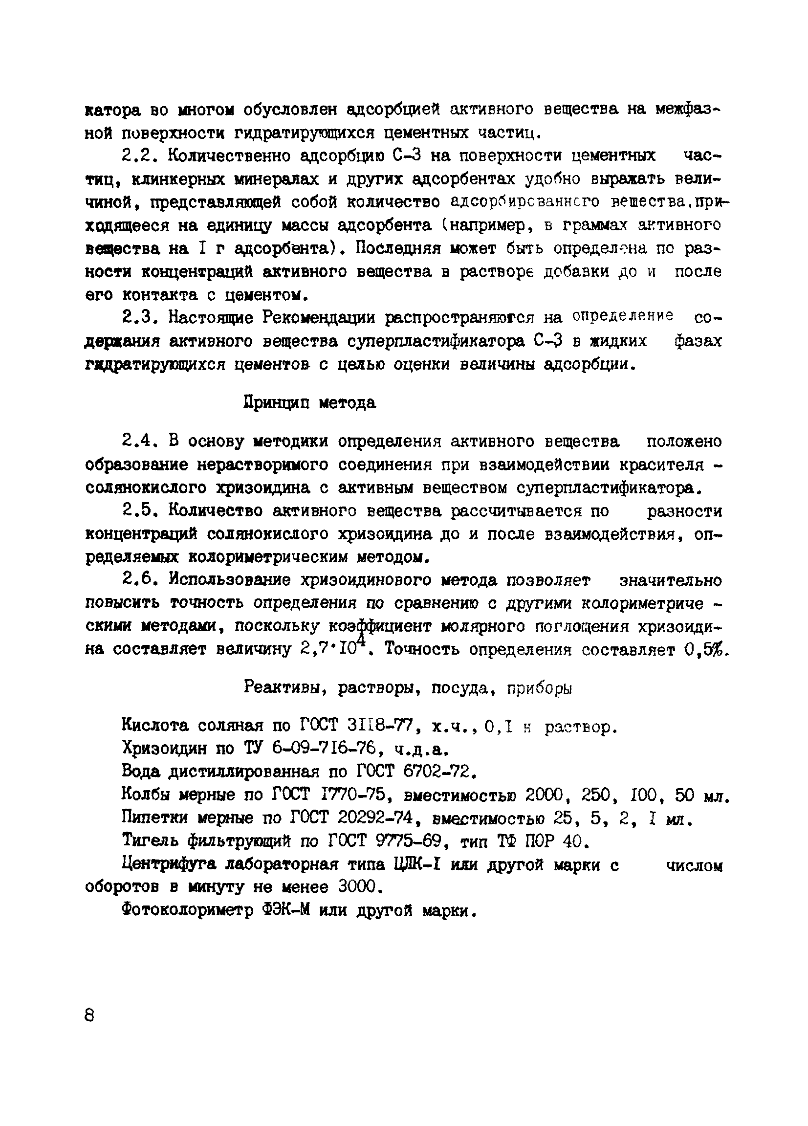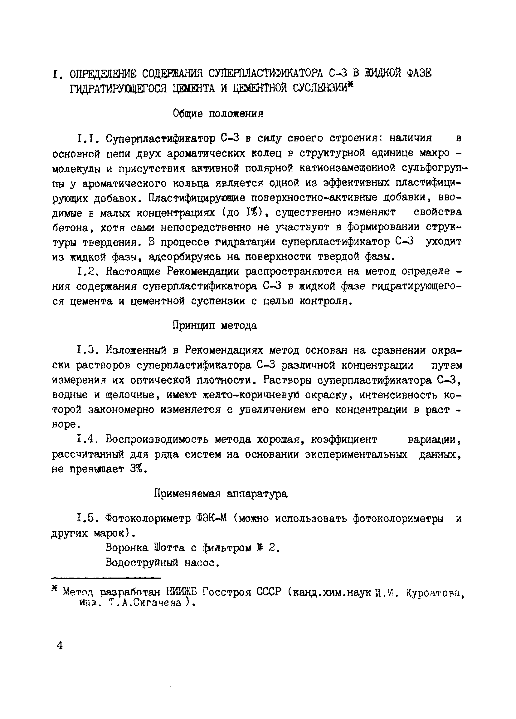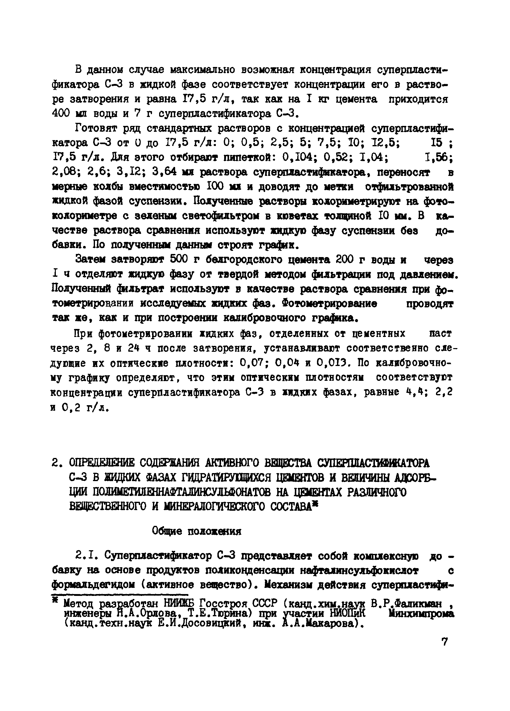 | Оглавление: | Предисловие 1. Определение содержания суперпластификатора С-З в жидкой фазе гидратирующегося цемента и цементной суспензии Общие положения Принцип метода Применяемая аппаратура Отбор и подготовка пробы Проведение анализа и расчет Пример расчета 2. Определение содержания активного вещества суперпластификатора С-З в жидких фазах гидратирующихся цементов и величины адсорбции полиметиленнафталинсульфонатов на цементах различного вещественного и минералогического состава Общие положения Принцип метода Реактивы, растворы, посуда, приборы Порядок проведения испытаний и расчет Пример расчета |