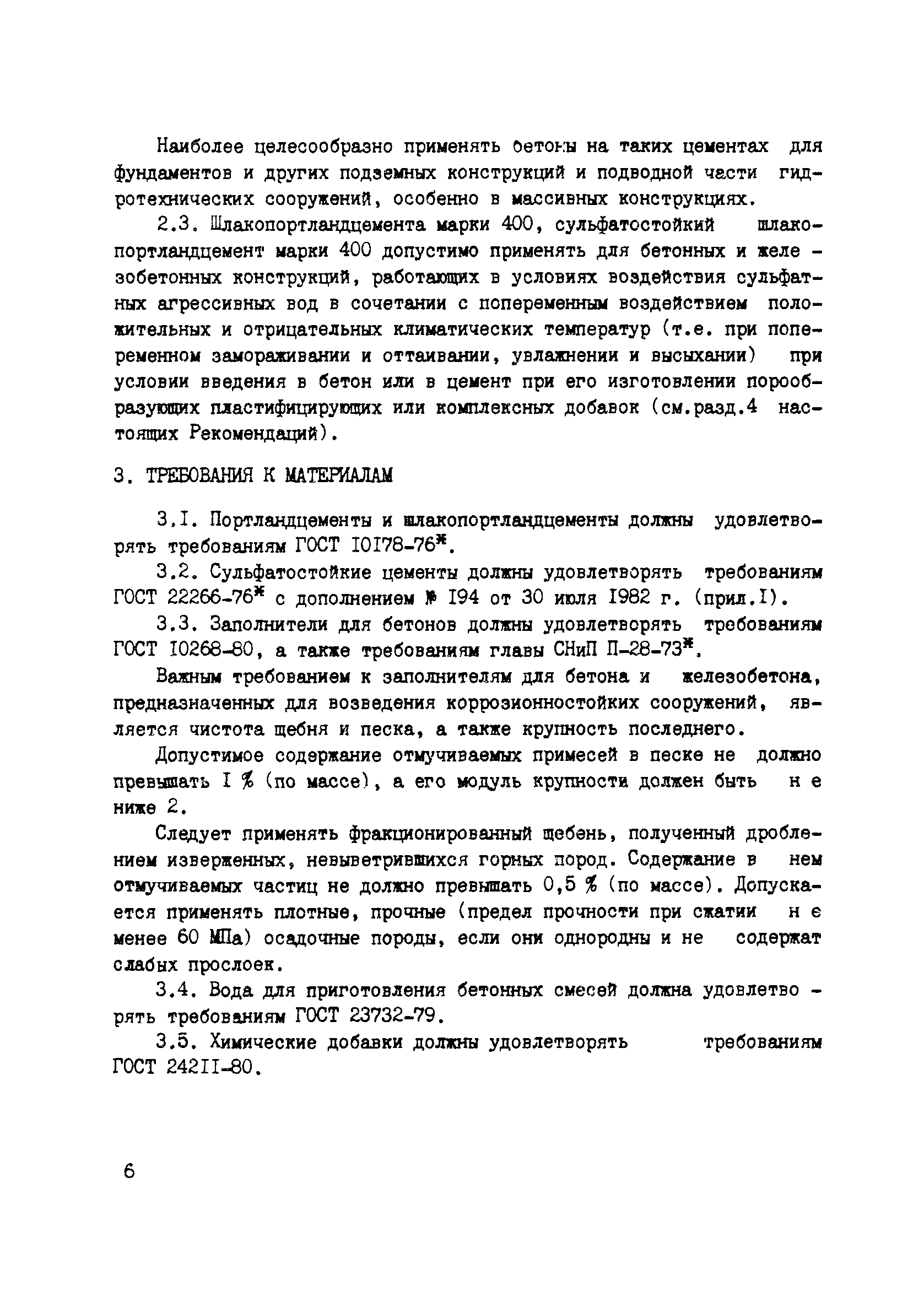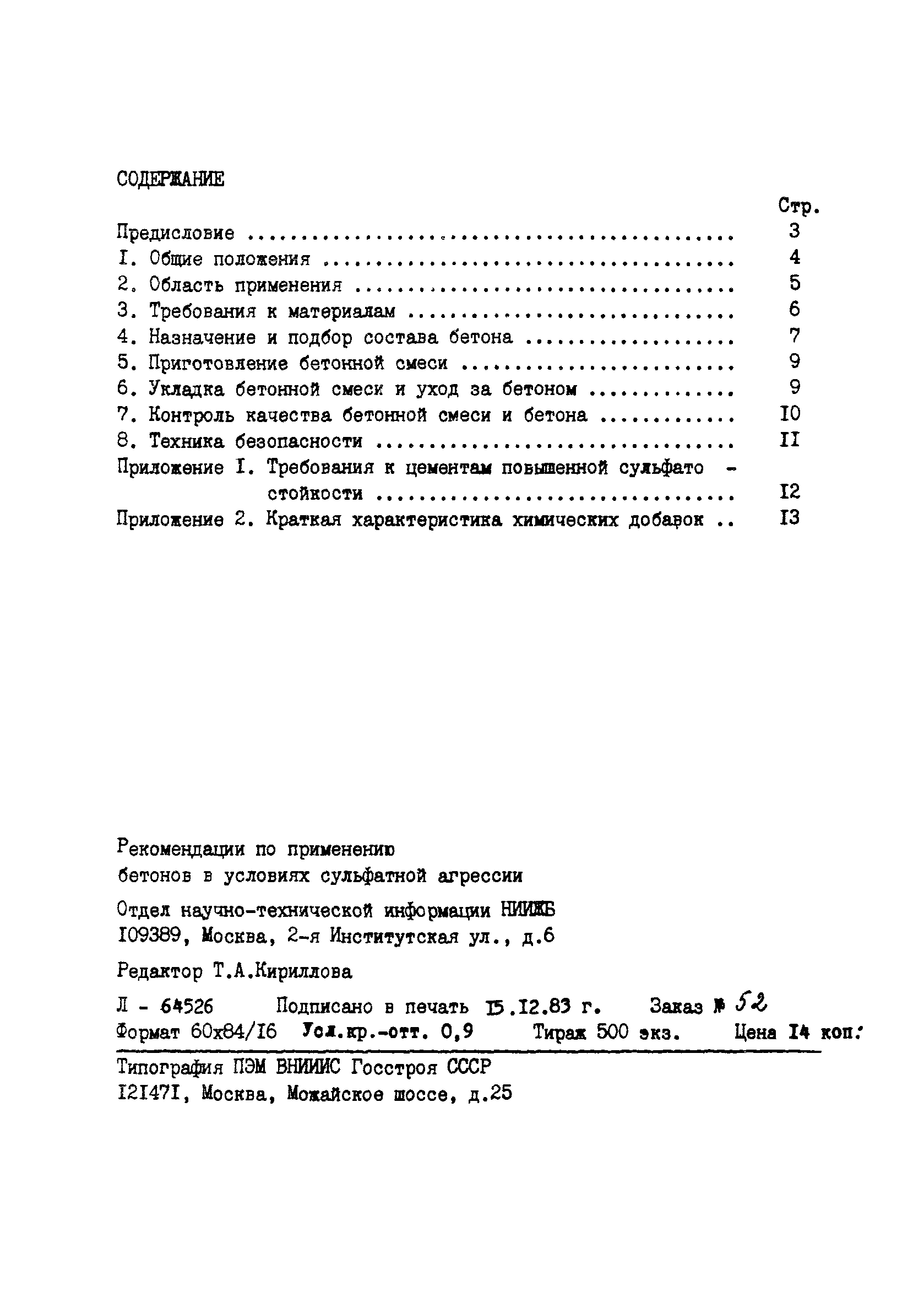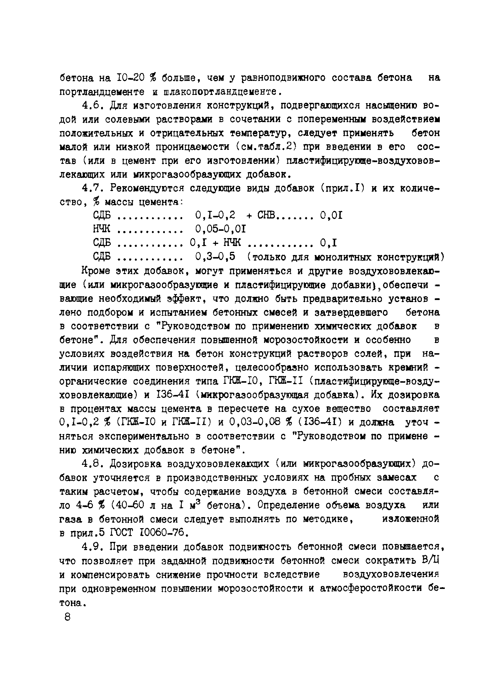 | Оглавление: | Предисловие 1. Общие положения 2, Область применения 3. Требования к материалам 4. Назначение и подбор состава бетона 5. Приготовление бетонной смеси 6. Укладка бетонной смеси и уход за бетоном 7. Контроль качества бетонной смеси и бетона 8. Техника безопасности Приложение 1. Требования к цементам повышенной сульфато-стойкости Приложение 2. Краткая характеристика химических добавок |