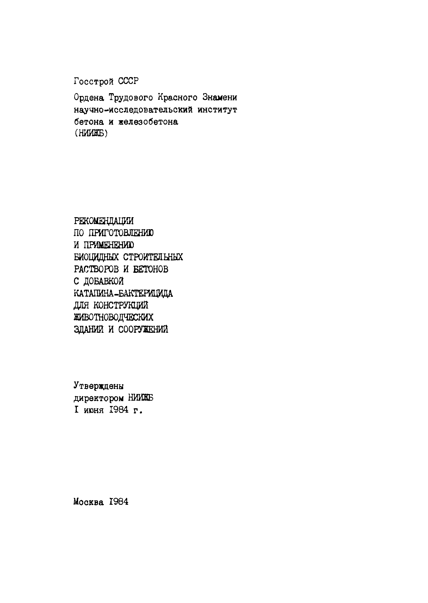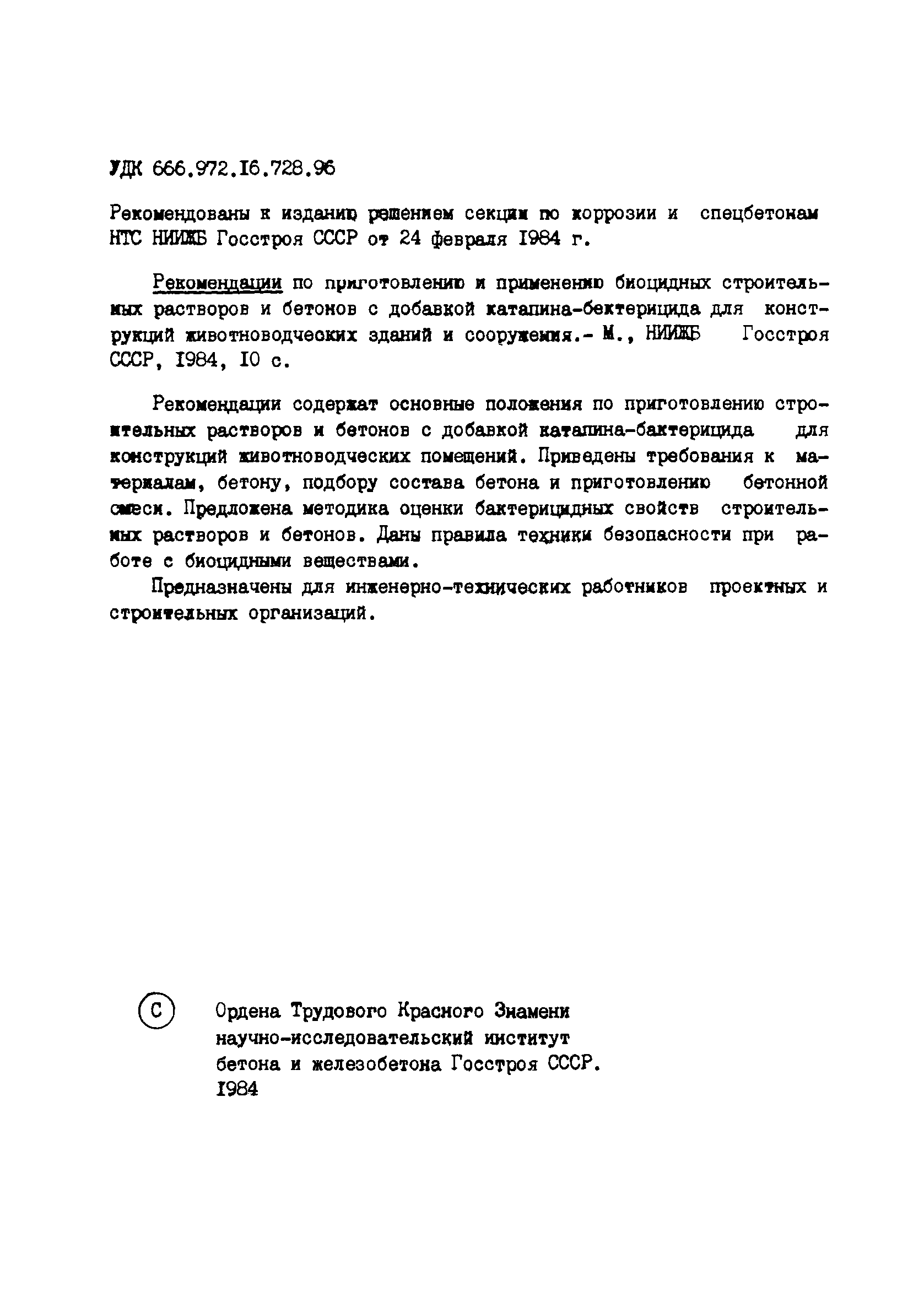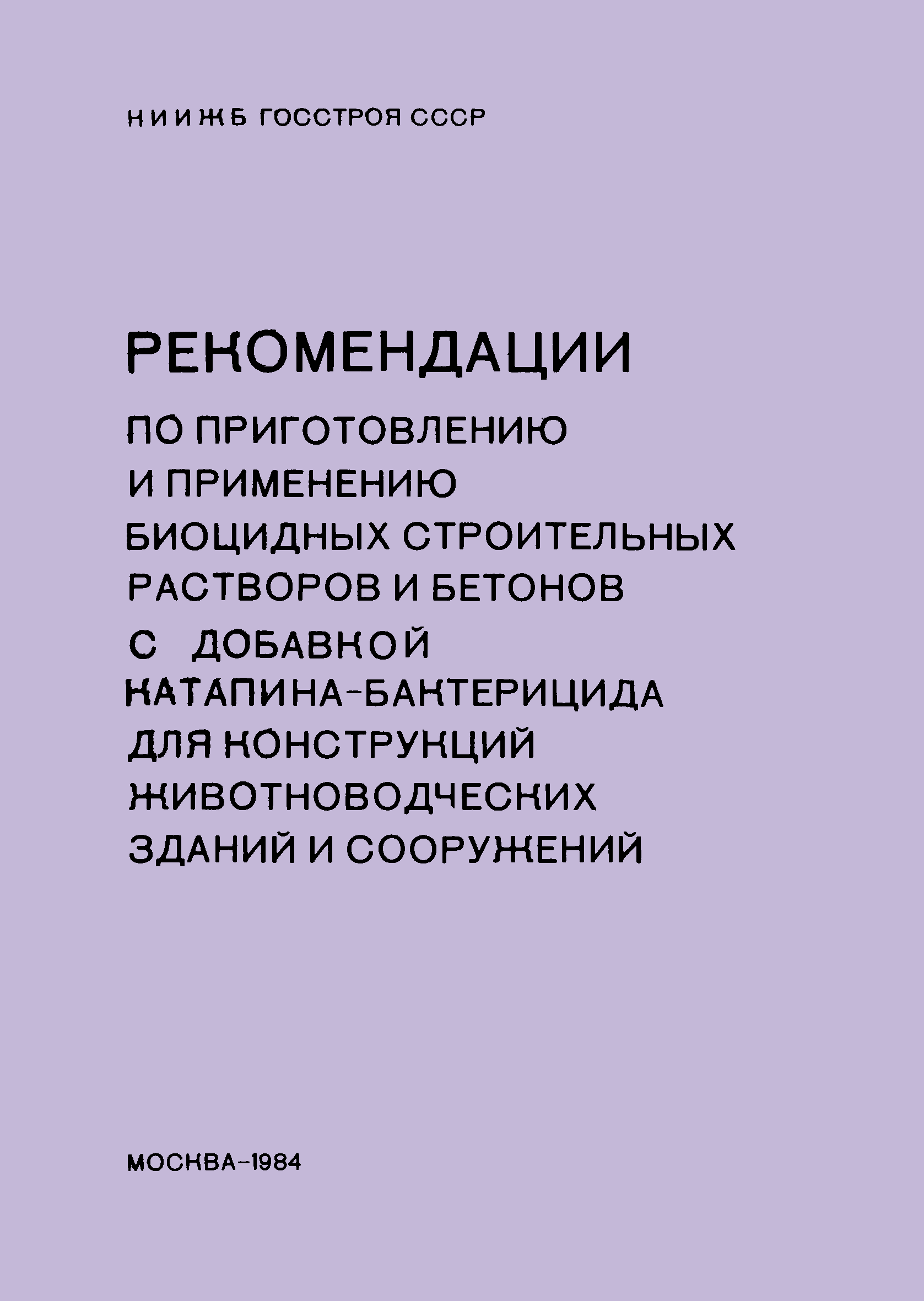 | Название рус.: | Рекомендации по приготовлению и применению биоцидных строительных растворов и бетонов с добавкой катапина-бактерицида для конструкций животноводческих зданий и сооружений |