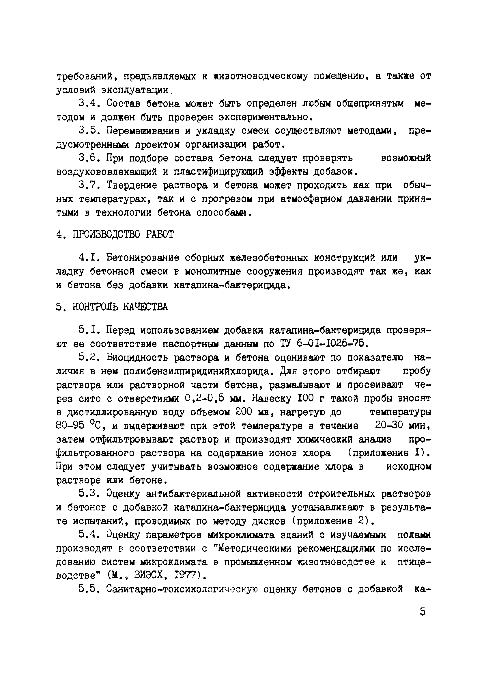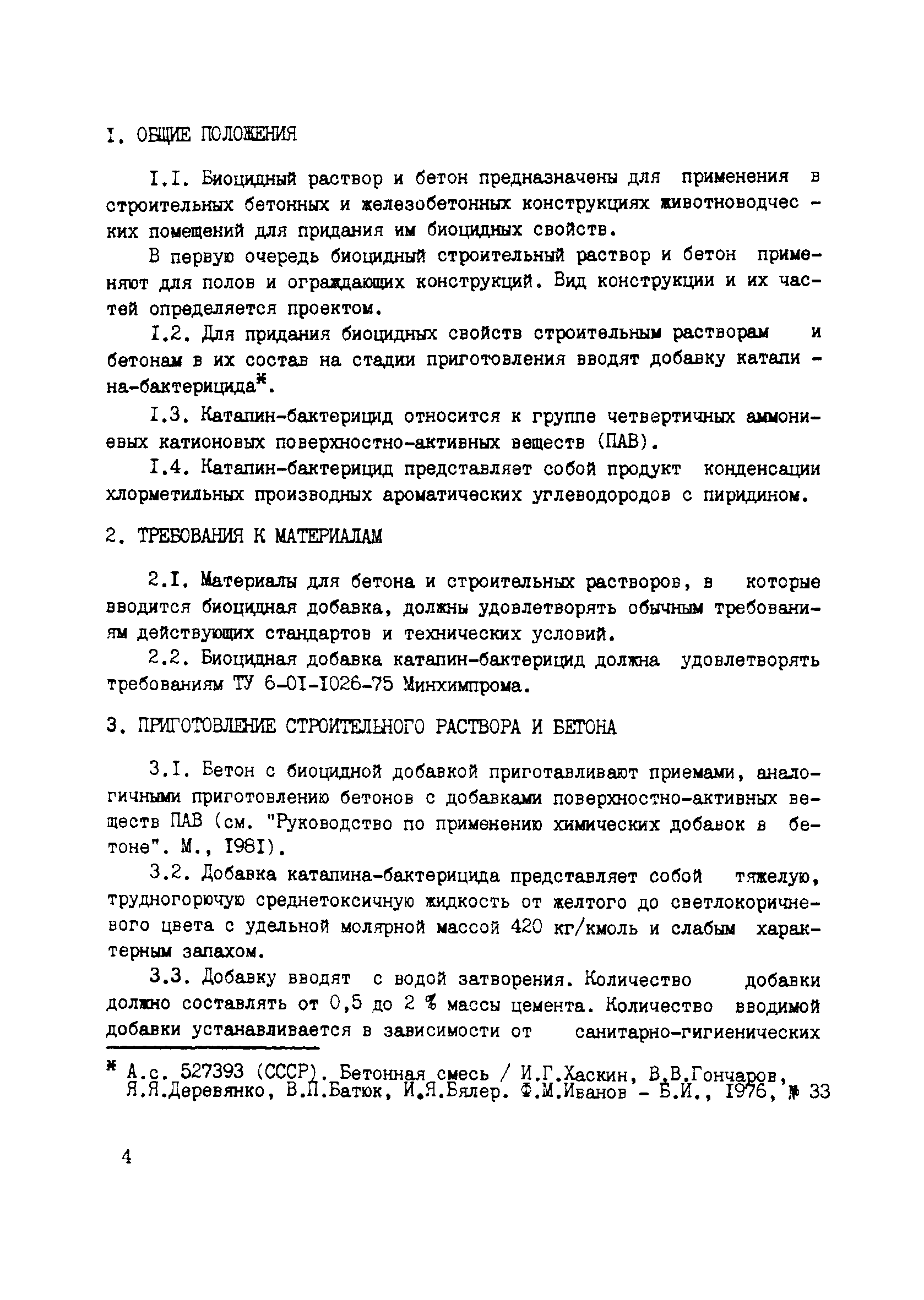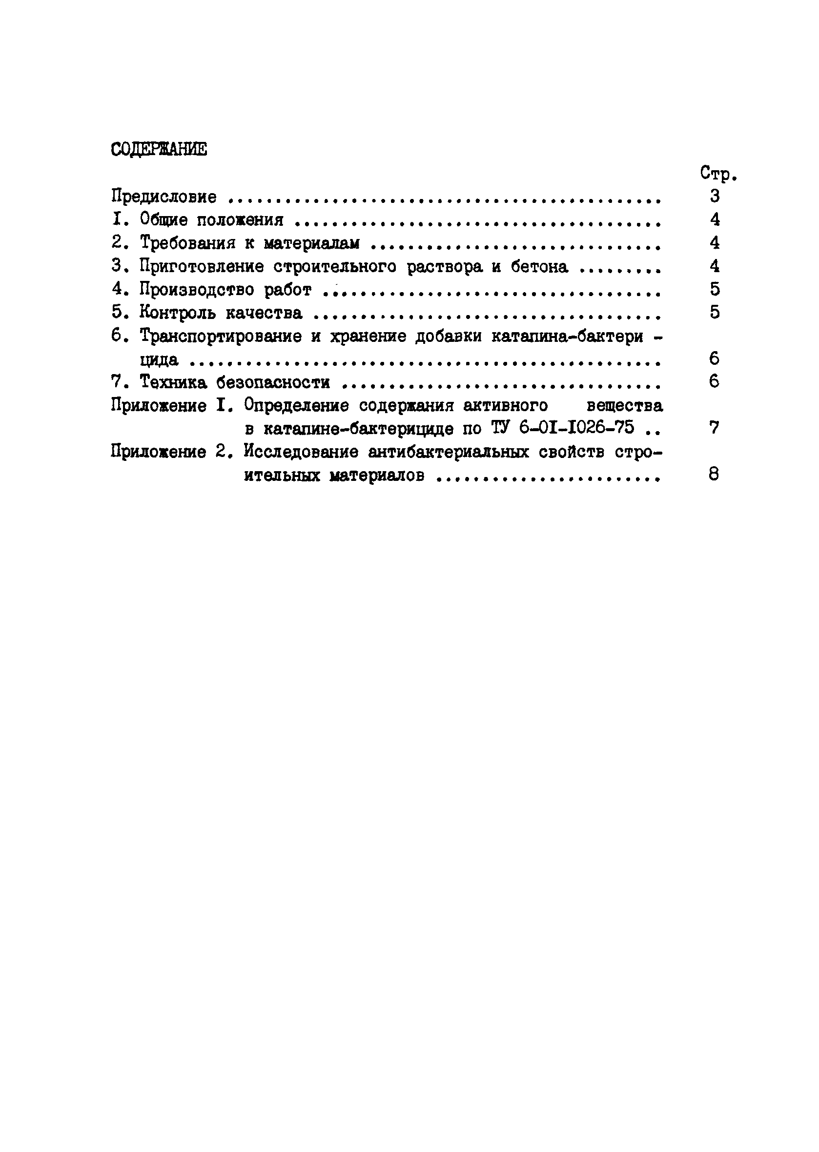 | Оглавление: | Предисловие 1. Общие положения 2. Требования к материалам 3. Приготовление строительного раствора и бетона 4. Производство работ 5. Контроль качества 6. Транспортирование и хранение добавки катапина-бактерицида 7. Техника безопасности Приложение 1. Определение содержания активного вещества в катапине-бактерициде по ТУ 6-01-1026-75 Приложение 2. Исследование антибактериальных свойств строительных материалов |