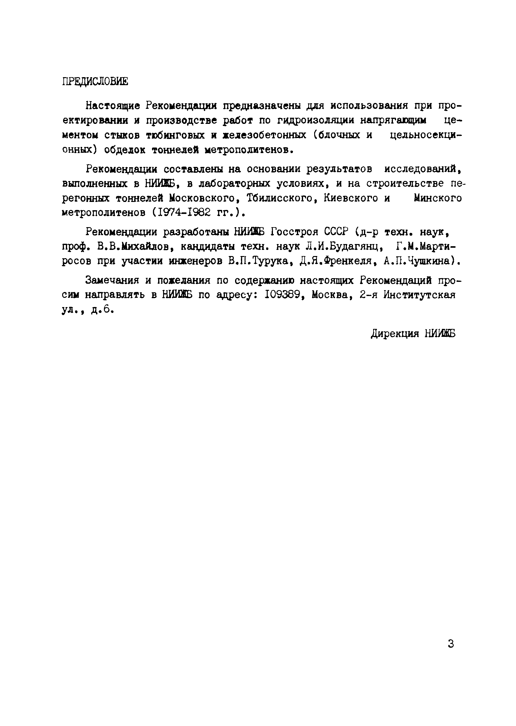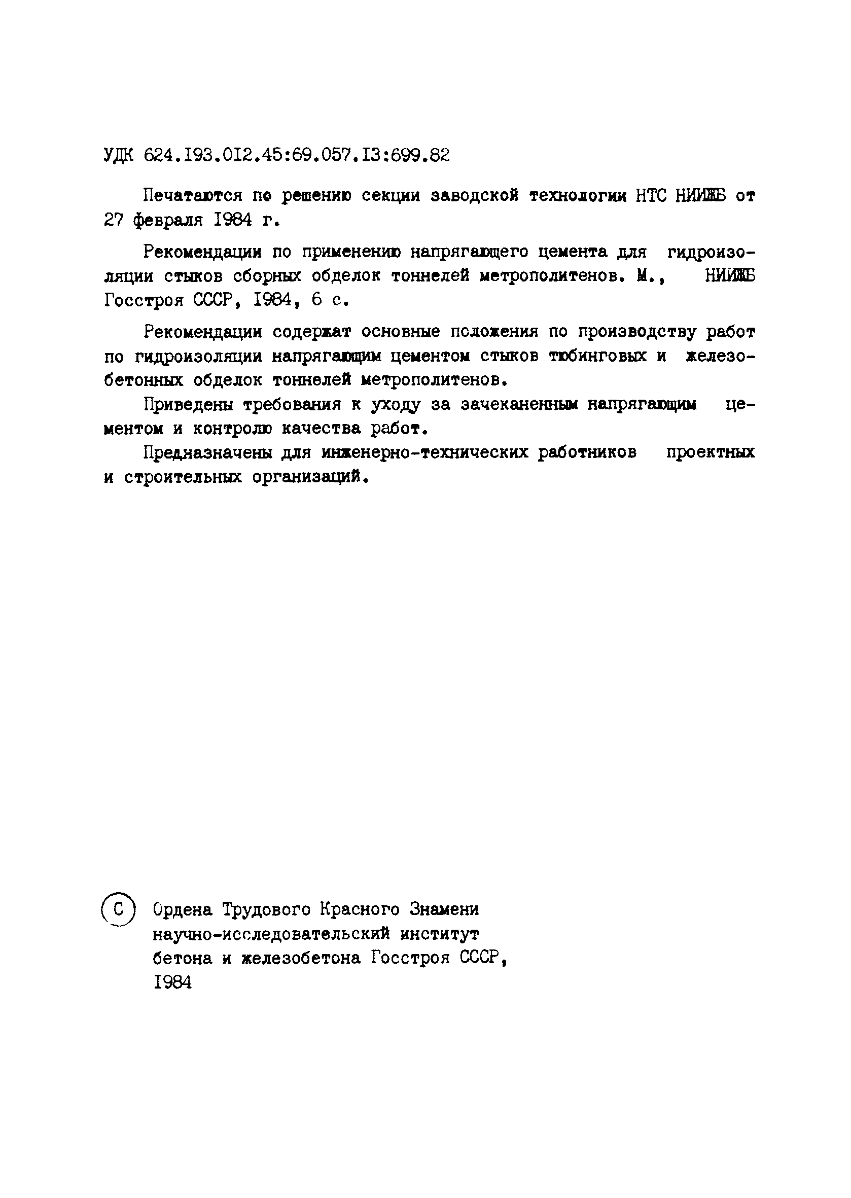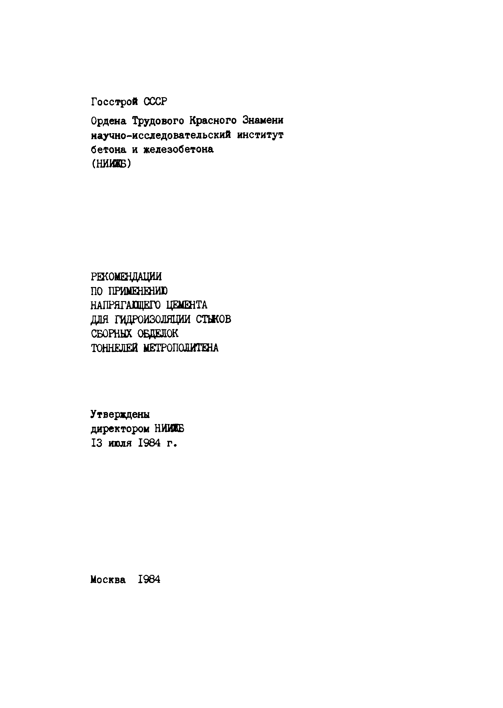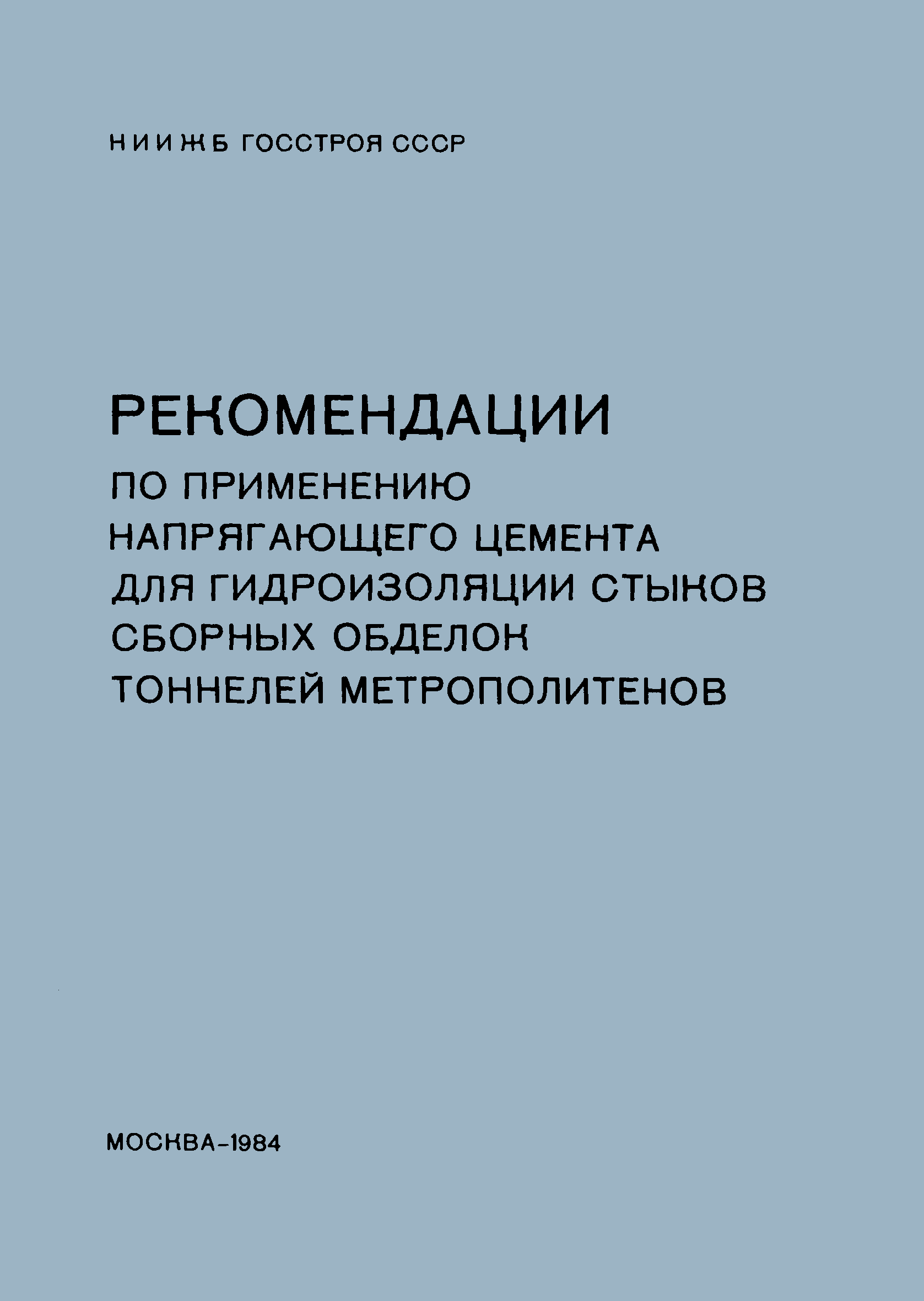 | Название рус.: | Рекомендации по применению напрягающего цемента для гидроизоляции стыков сборных обделок тоннелей метрополитенов |
