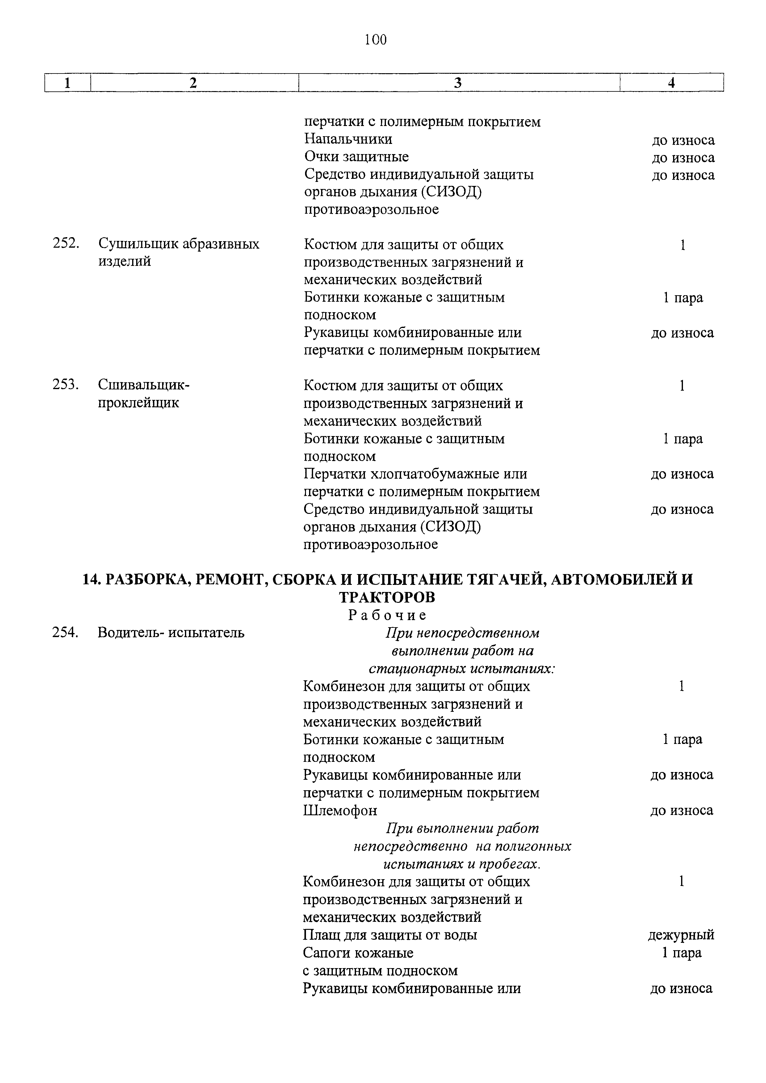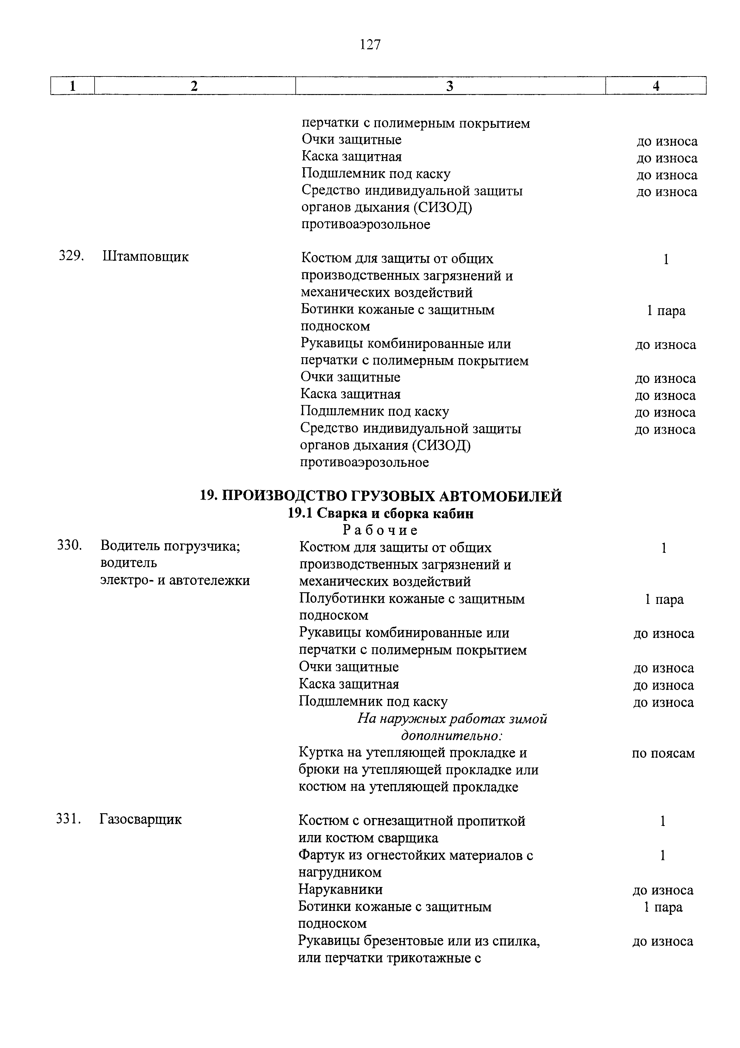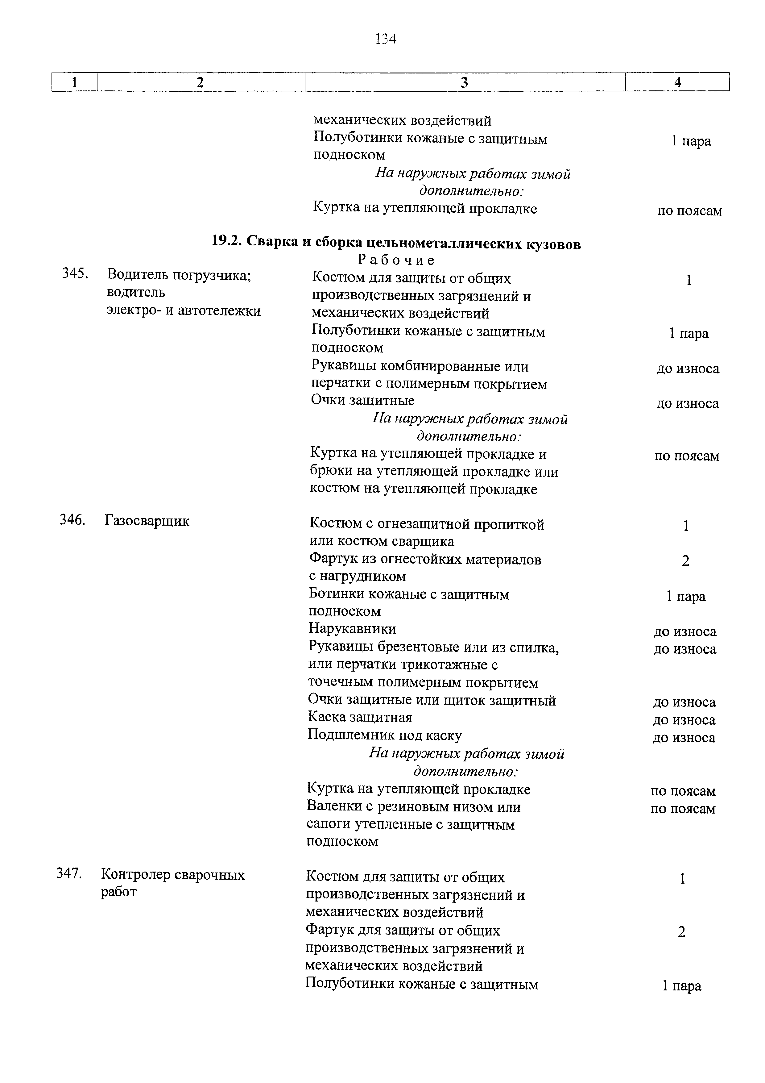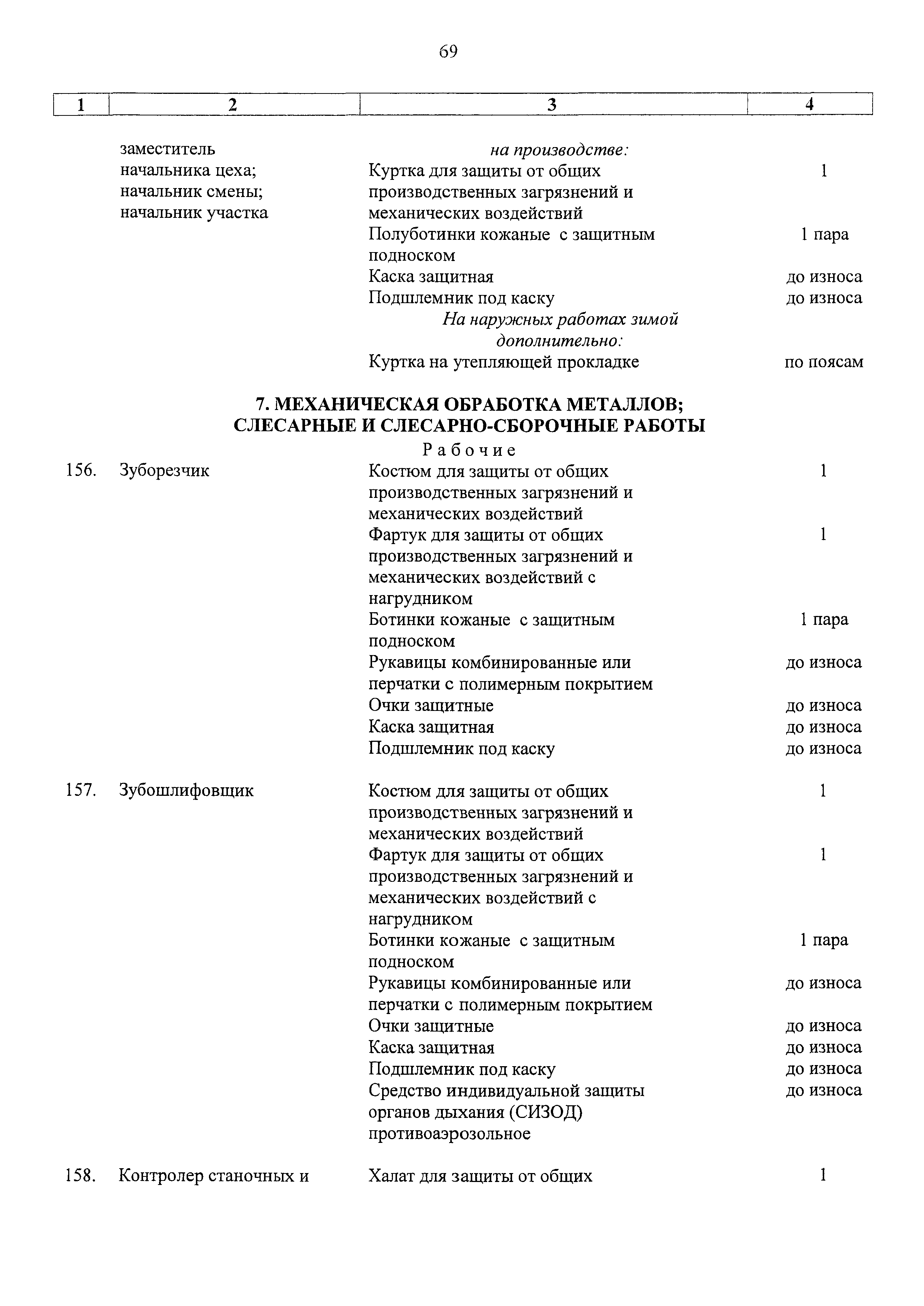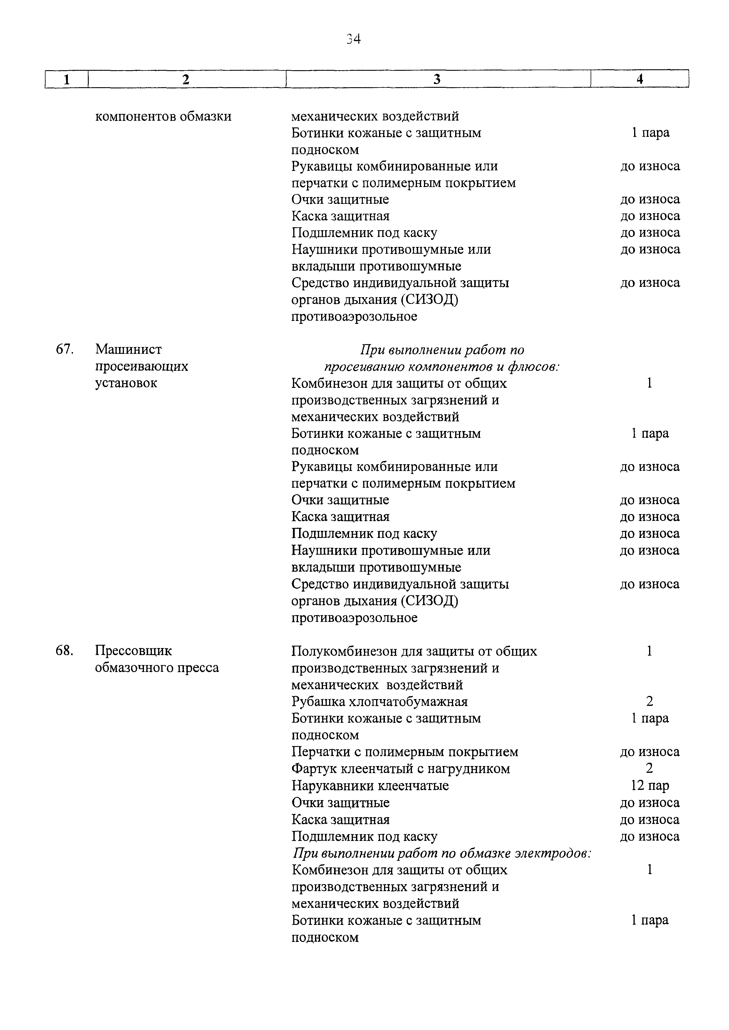 Типовые нормы бесплатной выдачи специальной одежды, специальной обуви и других средств индивидуальной защиты работникам машиностроительных и металлообрабатывающих производств, занятым на работах с вредными и (или) опасными условиями труда, а также на работах, выполняемых в особых температурных условиях или связанных с загрязнением| Статус: | действует | | Название рус.: | Типовые нормы бесплатной выдачи специальной одежды, специальной обуви и других средств индивидуальной защиты работникам машиностроительных и металлообрабатывающих производств, занятым на работах с вредными и (или) опасными условиями труда, а также на работах, выполняемых в особых температурных условиях или связанных с загрязнением | | Дата добавления в базу: | 01.09.2013 | | Дата актуализации: | 01.01.2021 | | Оглавление: | 1. Чугунолитейное производство и литье цветных металлов 2. Производства порошковой металлургии 3. Производство электродов и флюсов 4. Кузнечно-прессовые и термические работы 5. Сварочные работы 6. Работы по металлопокрытиям и окраске 7. Механическая обработка металлов; слесарные и слесарно-сборочные работы 8. Производство подшипников 9. Кузовное производство 10. Работы по производству и восстановлению напильников 11. Абразивное производство 12. Производство сверхтвердых материалов и инструмента из них 13. Производство шлифовальной шкурки 14. Разборка, ремонт, сборка и испытание тягачей, автомобилей и тракторов 15. Испытание двигателей и силовых установок 16. Производство мягких баков 17. Производство мипоры 18. Котельные работы и работы по металлическим конструкциям 19. Производство грузовых автомобилей 19.1 Сварка и сборка кабин 19.2. Сварка и сборка цельнометаллических кузовов 19.3. Сборка узлов 19.4. Сборка грузовых автомобилей 19.5. Подсборка узлов и агрегатов 20. Производство легковых автомобилей 20.1. Сборка-сварка кузовов 20.2. Сборка легковых автомобилей 21. Производство автокомпонентов 22. Агрегатное производство 23. Производство спецтехники 23.1. Сборочные, сварочные, окрасочные работы 23.2. Сборка автомобилей и узлов 23.3. Тюнинг автомобилей 24. Инструментальное производство 25. Общие профессии машиностроительных и металлообрабатывающих производств Примечания к типовым нормам | | Утверждён: | 14.12.2010 Минздравсоцразвития России (1104н)