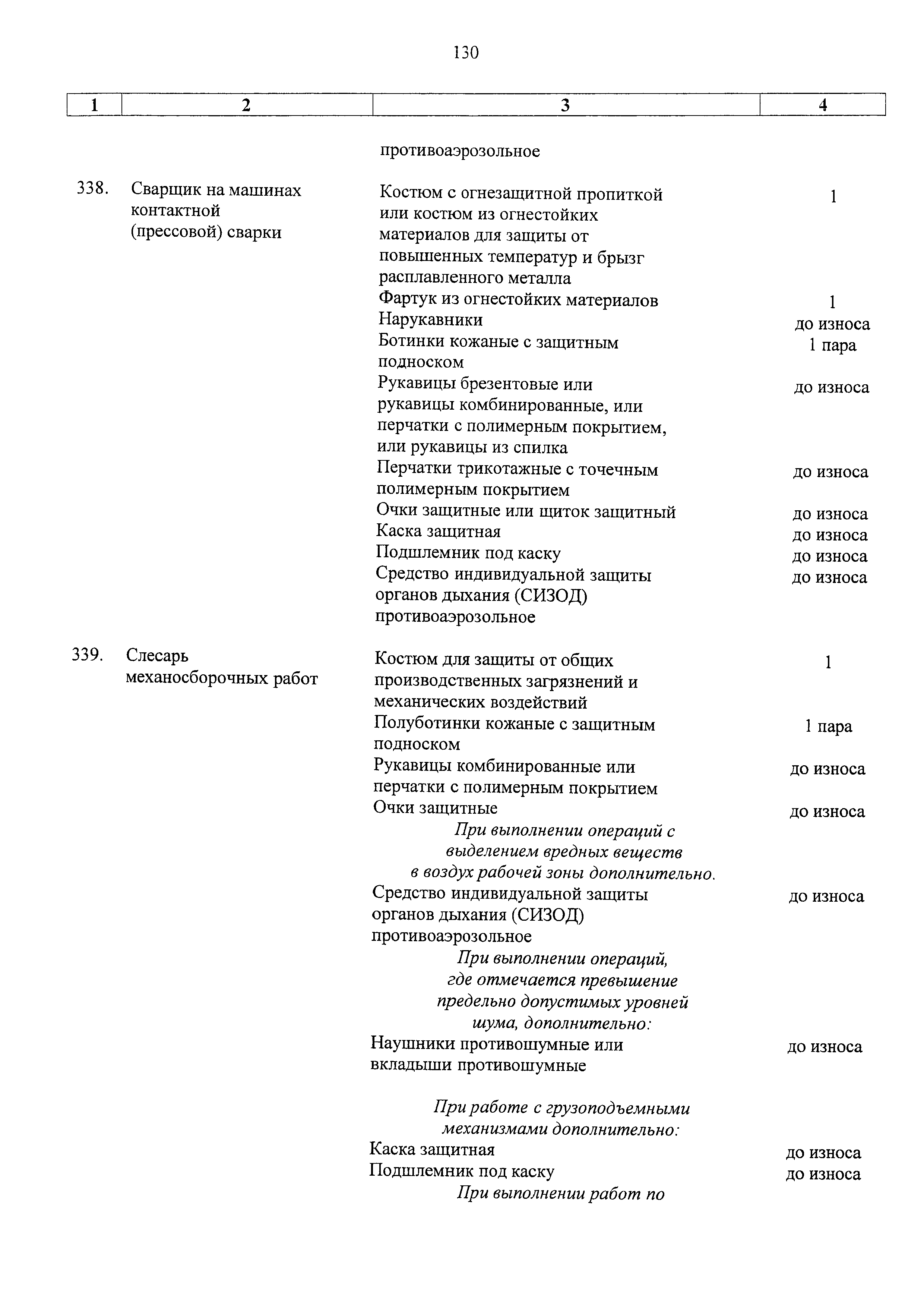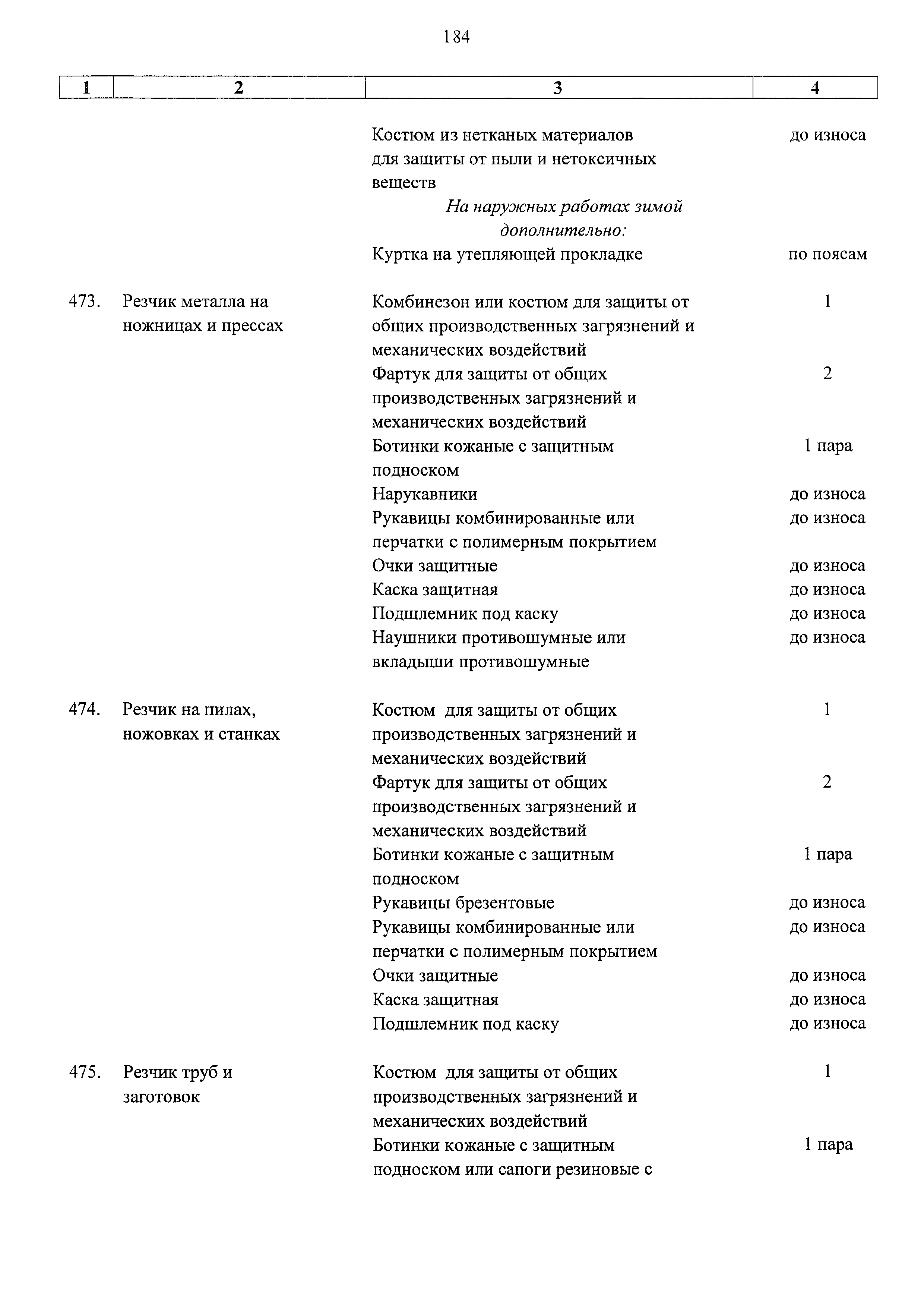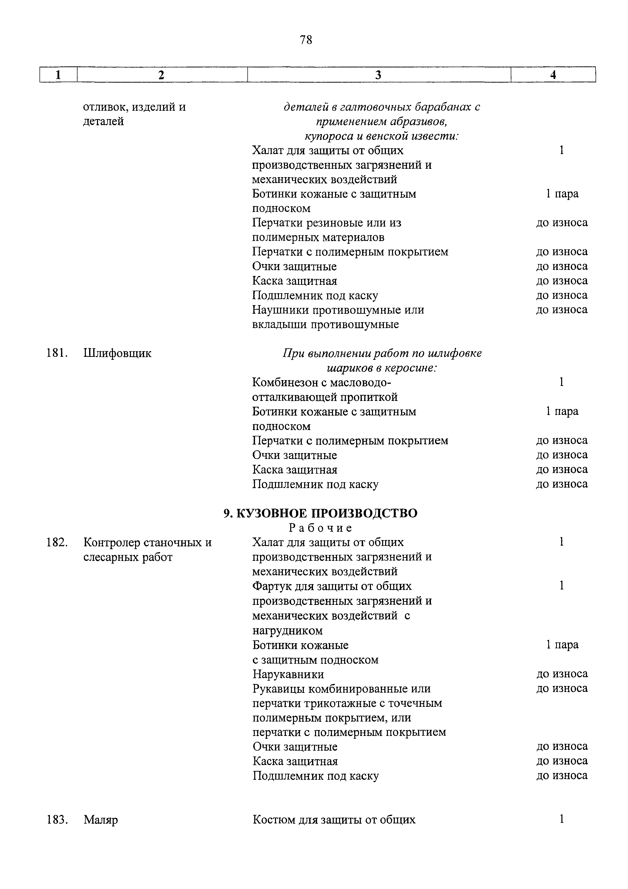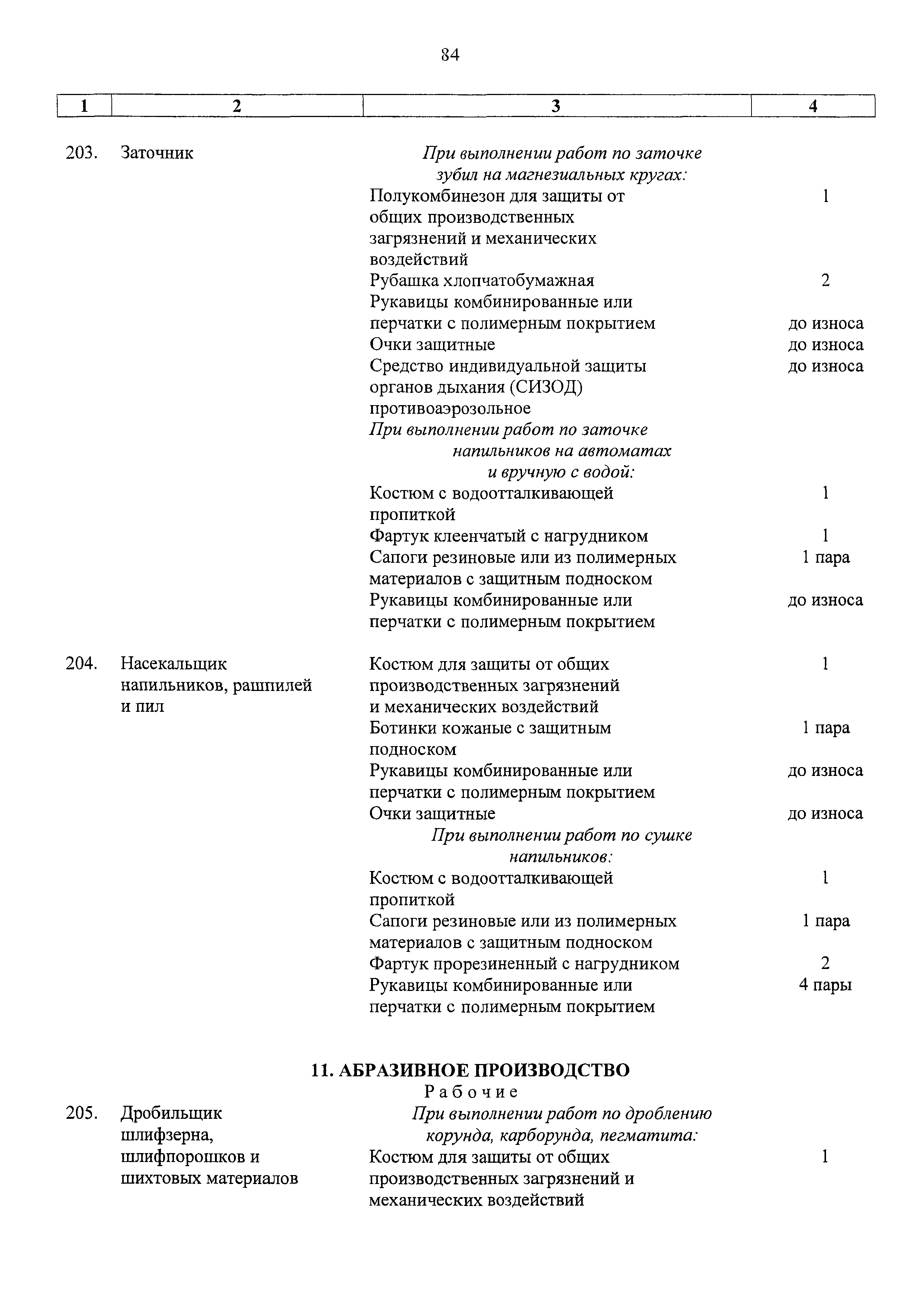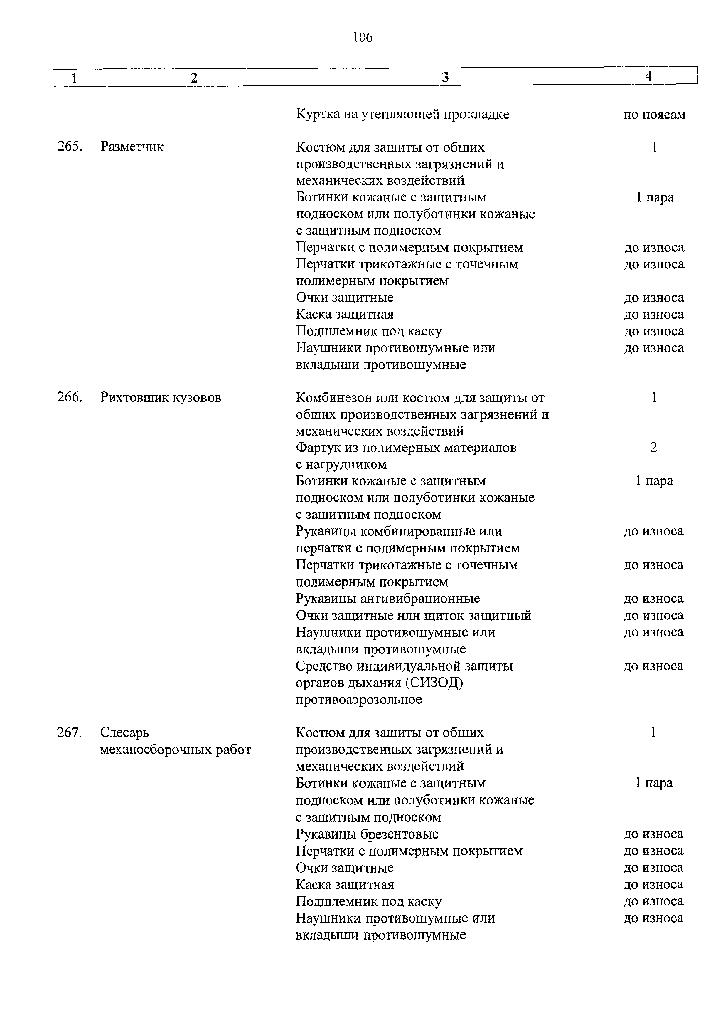 Типовые нормы бесплатной выдачи специальной одежды, специальной обуви и других средств индивидуальной защиты работникам машиностроительных и металлообрабатывающих производств, занятым на работах с вредными и (или) опасными условиями труда, а также на работах, выполняемых в особых температурных условиях или связанных с загрязнением| Статус: | действует | | Название рус.: | Типовые нормы бесплатной выдачи специальной одежды, специальной обуви и других средств индивидуальной защиты работникам машиностроительных и металлообрабатывающих производств, занятым на работах с вредными и (или) опасными условиями труда, а также на работах, выполняемых в особых температурных условиях или связанных с загрязнением | | Дата добавления в базу: | 01.09.2013 | | Дата актуализации: | 01.01.2021 | | Оглавление: | 1. Чугунолитейное производство и литье цветных металлов 2. Производства порошковой металлургии 3. Производство электродов и флюсов 4. Кузнечно-прессовые и термические работы 5. Сварочные работы 6. Работы по металлопокрытиям и окраске 7. Механическая обработка металлов; слесарные и слесарно-сборочные работы 8. Производство подшипников 9. Кузовное производство 10. Работы по производству и восстановлению напильников 11. Абразивное производство 12. Производство сверхтвердых материалов и инструмента из них 13. Производство шлифовальной шкурки 14. Разборка, ремонт, сборка и испытание тягачей, автомобилей и тракторов 15. Испытание двигателей и силовых установок 16. Производство мягких баков 17. Производство мипоры 18. Котельные работы и работы по металлическим конструкциям 19. Производство грузовых автомобилей 19.1 Сварка и сборка кабин 19.2. Сварка и сборка цельнометаллических кузовов 19.3. Сборка узлов 19.4. Сборка грузовых автомобилей 19.5. Подсборка узлов и агрегатов 20. Производство легковых автомобилей 20.1. Сборка-сварка кузовов 20.2. Сборка легковых автомобилей 21. Производство автокомпонентов 22. Агрегатное производство 23. Производство спецтехники 23.1. Сборочные, сварочные, окрасочные работы 23.2. Сборка автомобилей и узлов 23.3. Тюнинг автомобилей 24. Инструментальное производство 25. Общие профессии машиностроительных и металлообрабатывающих производств Примечания к типовым нормам | | Утверждён: | 14.12.2010 Минздравсоцразвития России (1104н)