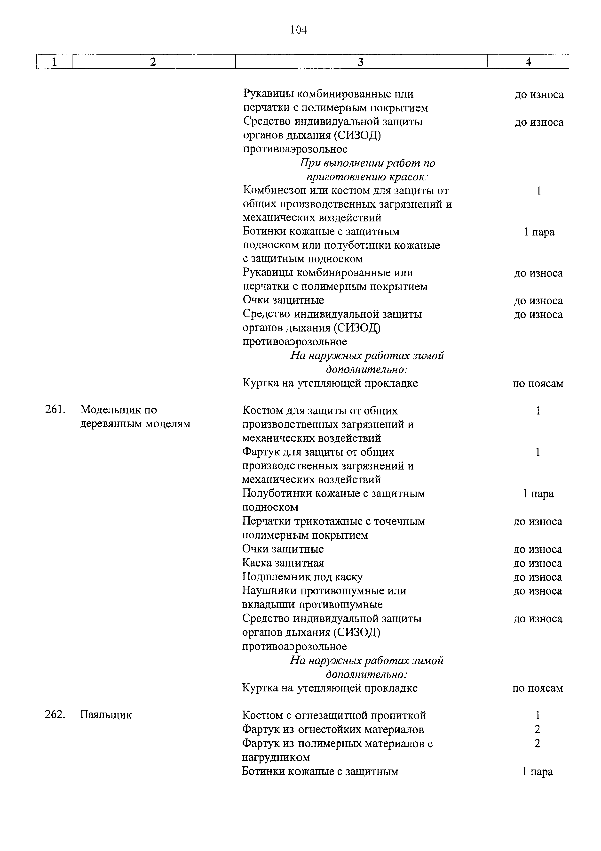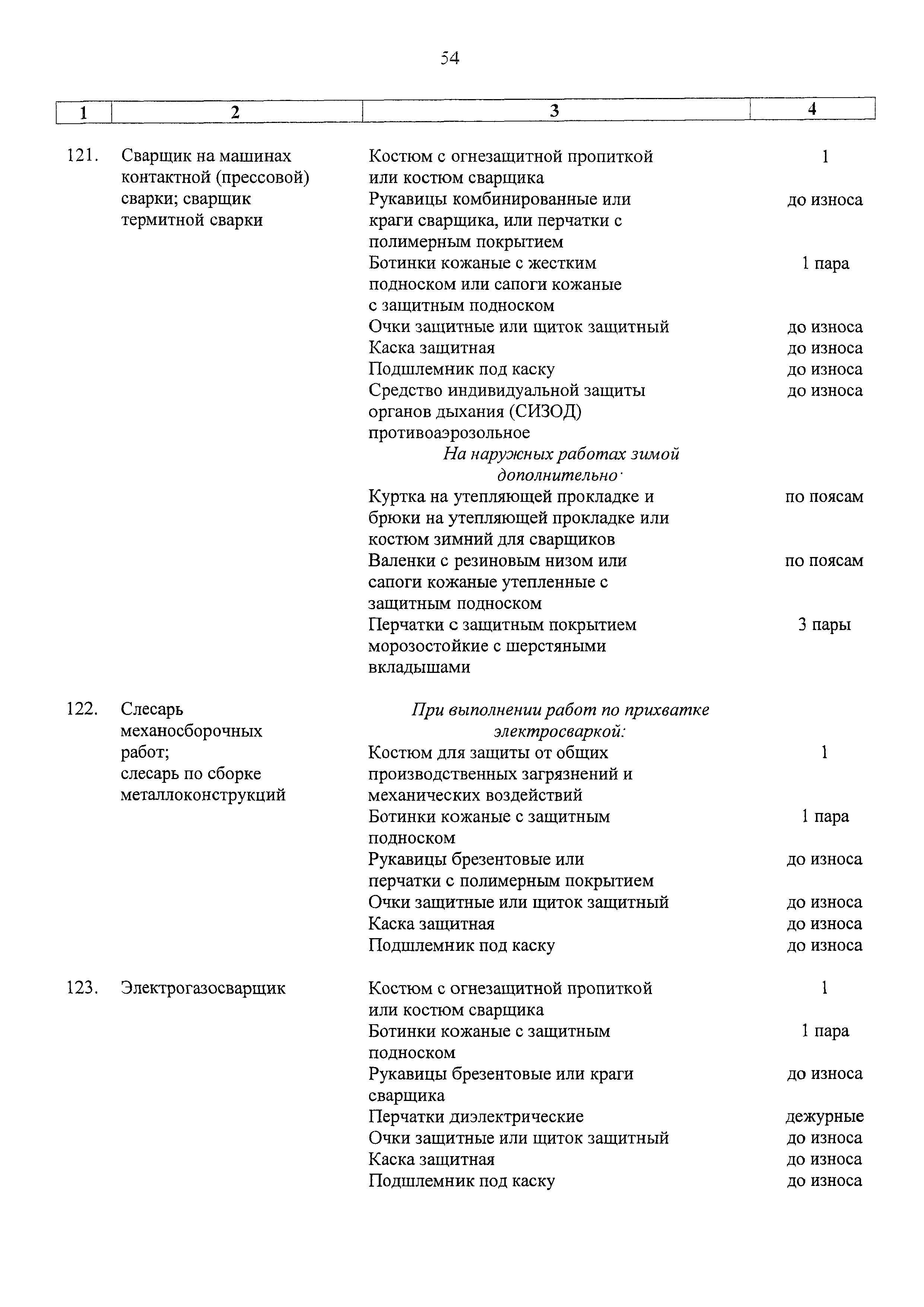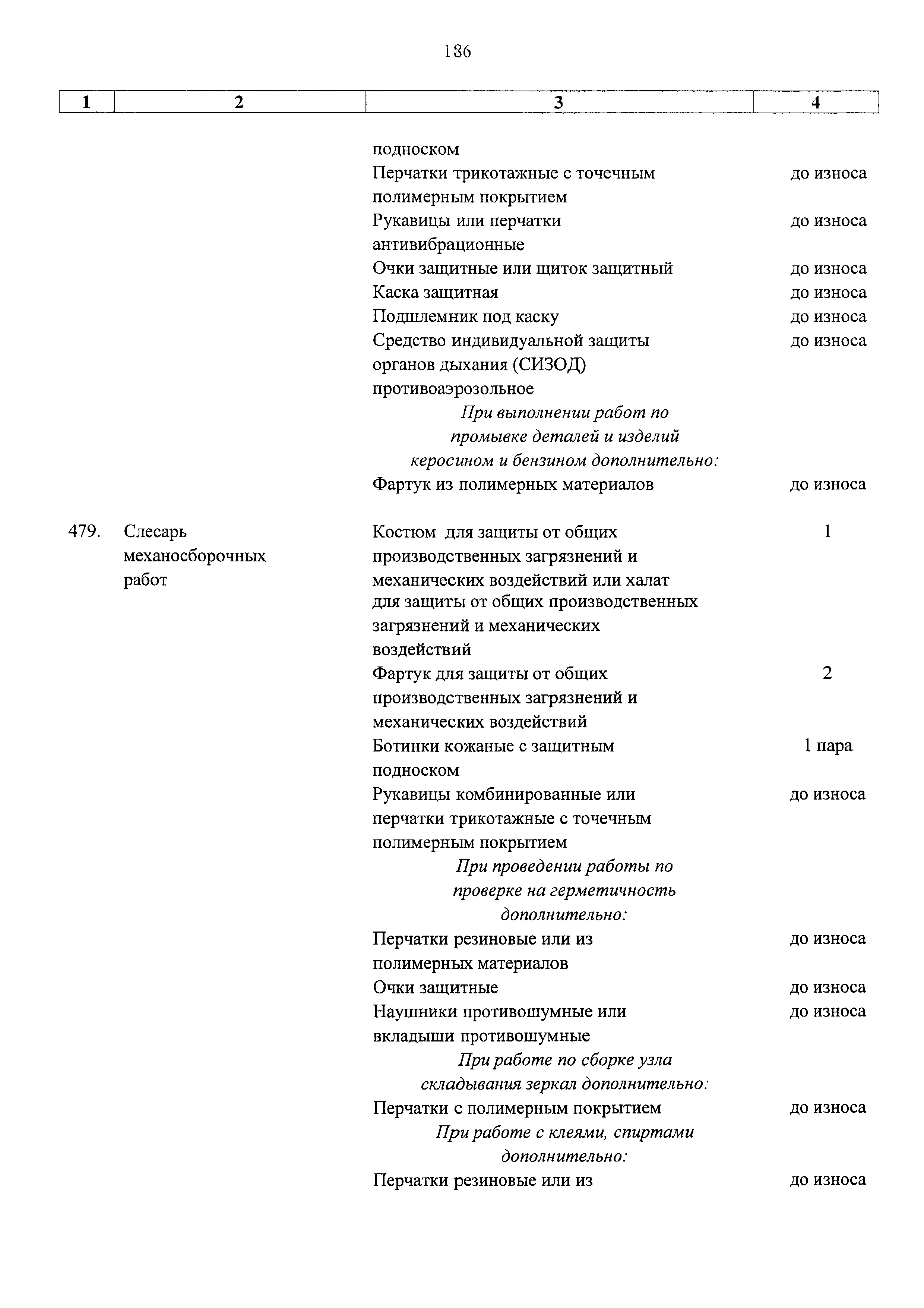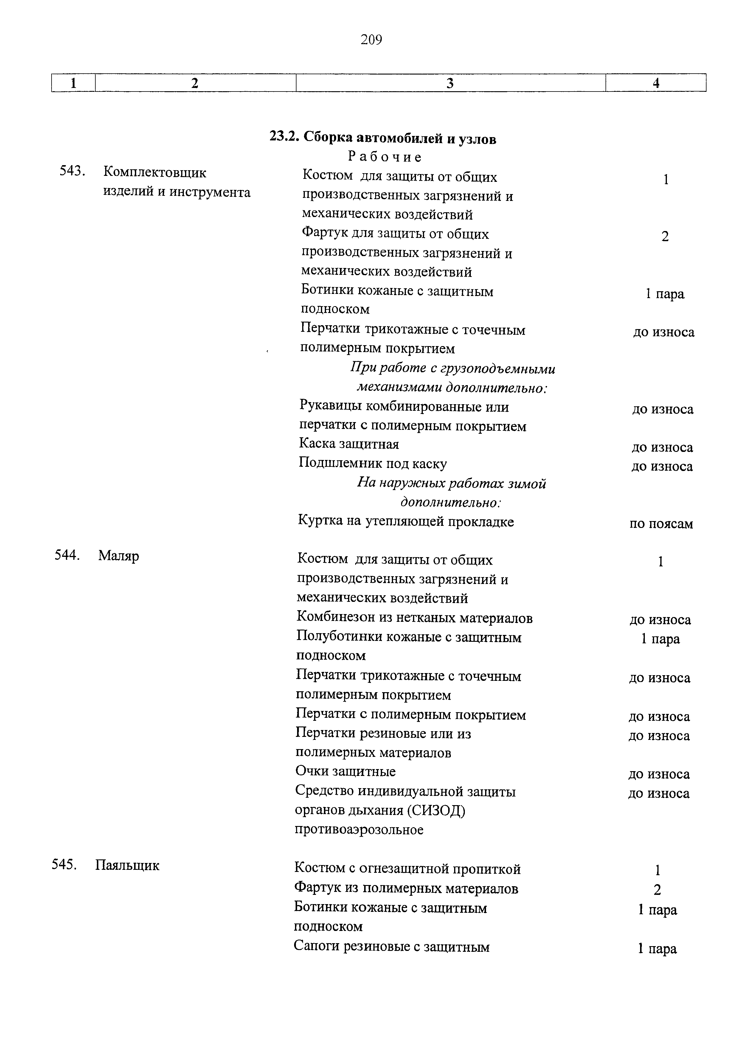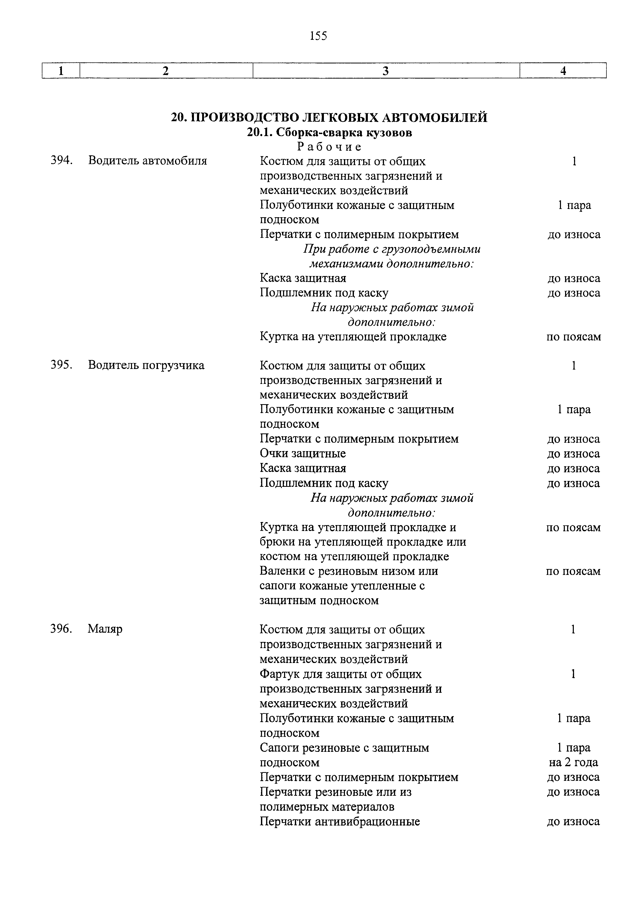 Типовые нормы бесплатной выдачи специальной одежды, специальной обуви и других средств индивидуальной защиты работникам машиностроительных и металлообрабатывающих производств, занятым на работах с вредными и (или) опасными условиями труда, а также на работах, выполняемых в особых температурных условиях или связанных с загрязнением| Статус: | действует | | Название рус.: | Типовые нормы бесплатной выдачи специальной одежды, специальной обуви и других средств индивидуальной защиты работникам машиностроительных и металлообрабатывающих производств, занятым на работах с вредными и (или) опасными условиями труда, а также на работах, выполняемых в особых температурных условиях или связанных с загрязнением | | Дата добавления в базу: | 01.09.2013 | | Дата актуализации: | 01.01.2021 | | Оглавление: | 1. Чугунолитейное производство и литье цветных металлов 2. Производства порошковой металлургии 3. Производство электродов и флюсов 4. Кузнечно-прессовые и термические работы 5. Сварочные работы 6. Работы по металлопокрытиям и окраске 7. Механическая обработка металлов; слесарные и слесарно-сборочные работы 8. Производство подшипников 9. Кузовное производство 10. Работы по производству и восстановлению напильников 11. Абразивное производство 12. Производство сверхтвердых материалов и инструмента из них 13. Производство шлифовальной шкурки 14. Разборка, ремонт, сборка и испытание тягачей, автомобилей и тракторов 15. Испытание двигателей и силовых установок 16. Производство мягких баков 17. Производство мипоры 18. Котельные работы и работы по металлическим конструкциям 19. Производство грузовых автомобилей 19.1 Сварка и сборка кабин 19.2. Сварка и сборка цельнометаллических кузовов 19.3. Сборка узлов 19.4. Сборка грузовых автомобилей 19.5. Подсборка узлов и агрегатов 20. Производство легковых автомобилей 20.1. Сборка-сварка кузовов 20.2. Сборка легковых автомобилей 21. Производство автокомпонентов 22. Агрегатное производство 23. Производство спецтехники 23.1. Сборочные, сварочные, окрасочные работы 23.2. Сборка автомобилей и узлов 23.3. Тюнинг автомобилей 24. Инструментальное производство 25. Общие профессии машиностроительных и металлообрабатывающих производств Примечания к типовым нормам | | Утверждён: | 14.12.2010 Минздравсоцразвития России (1104н)