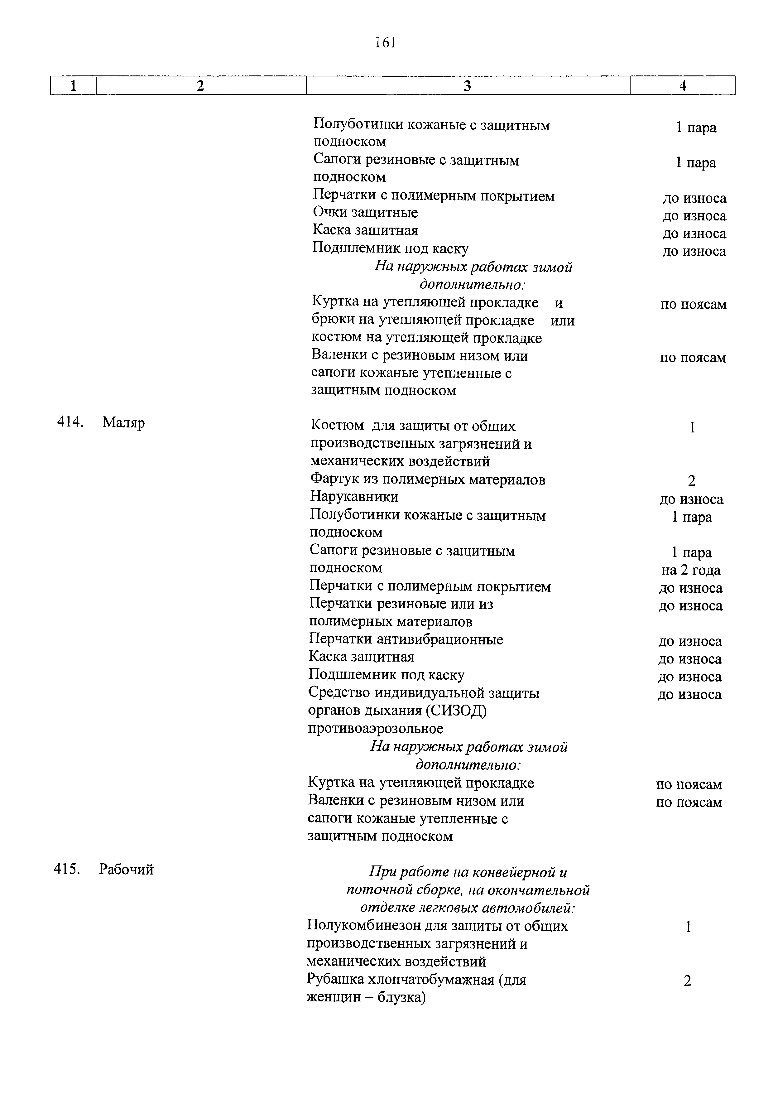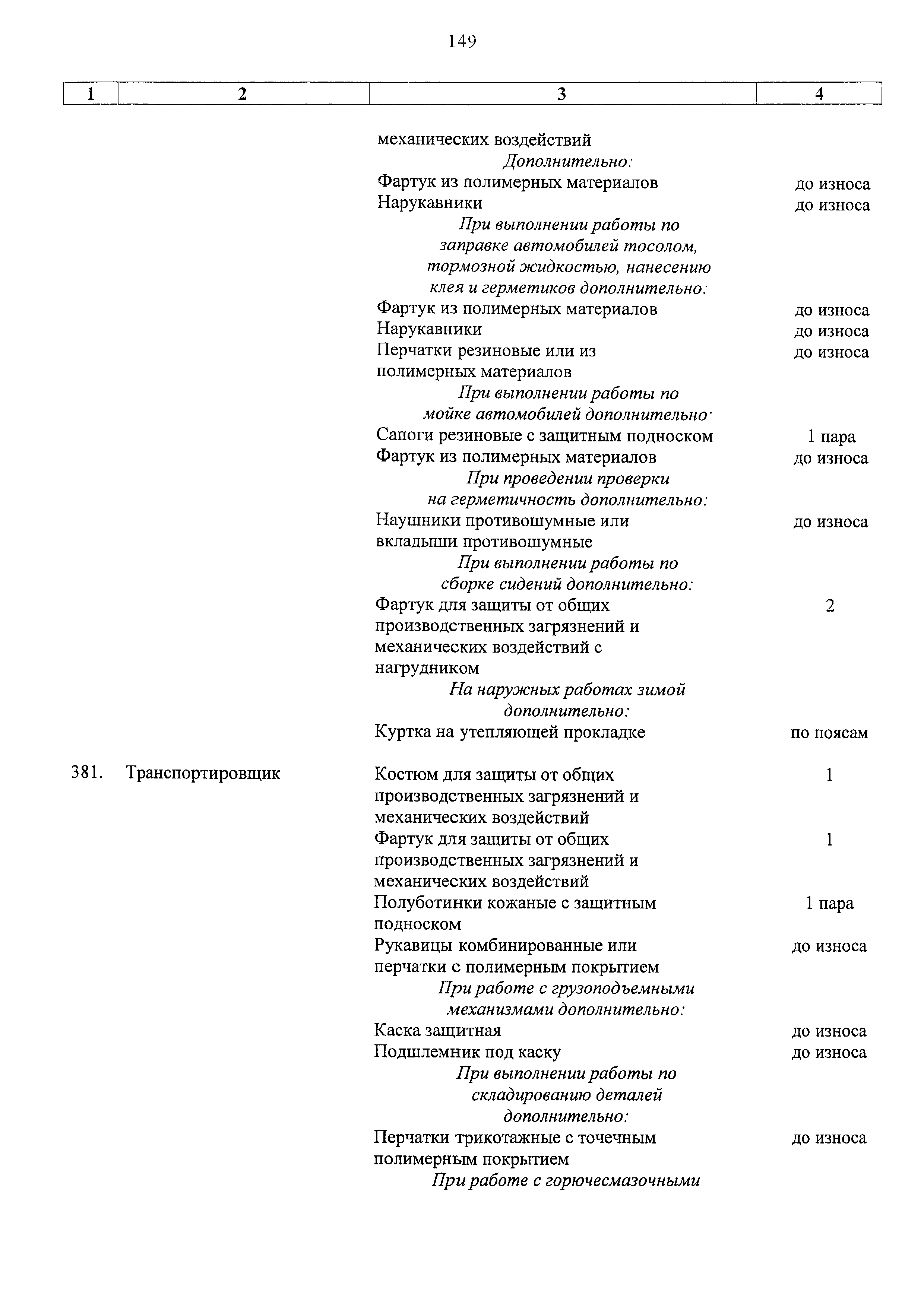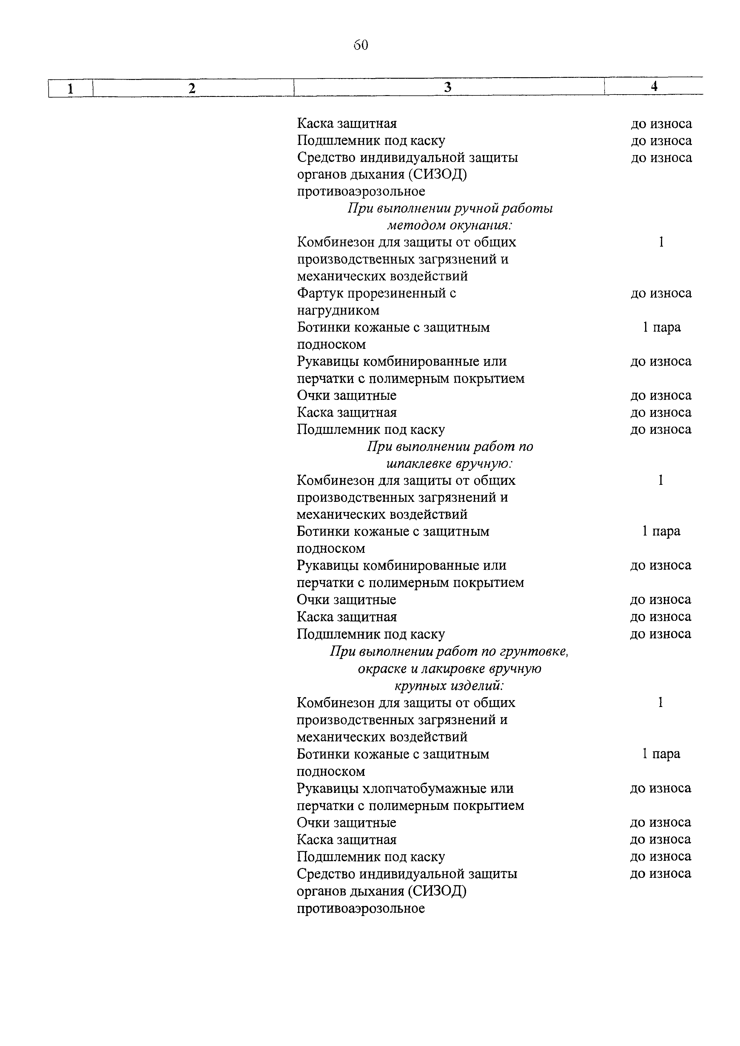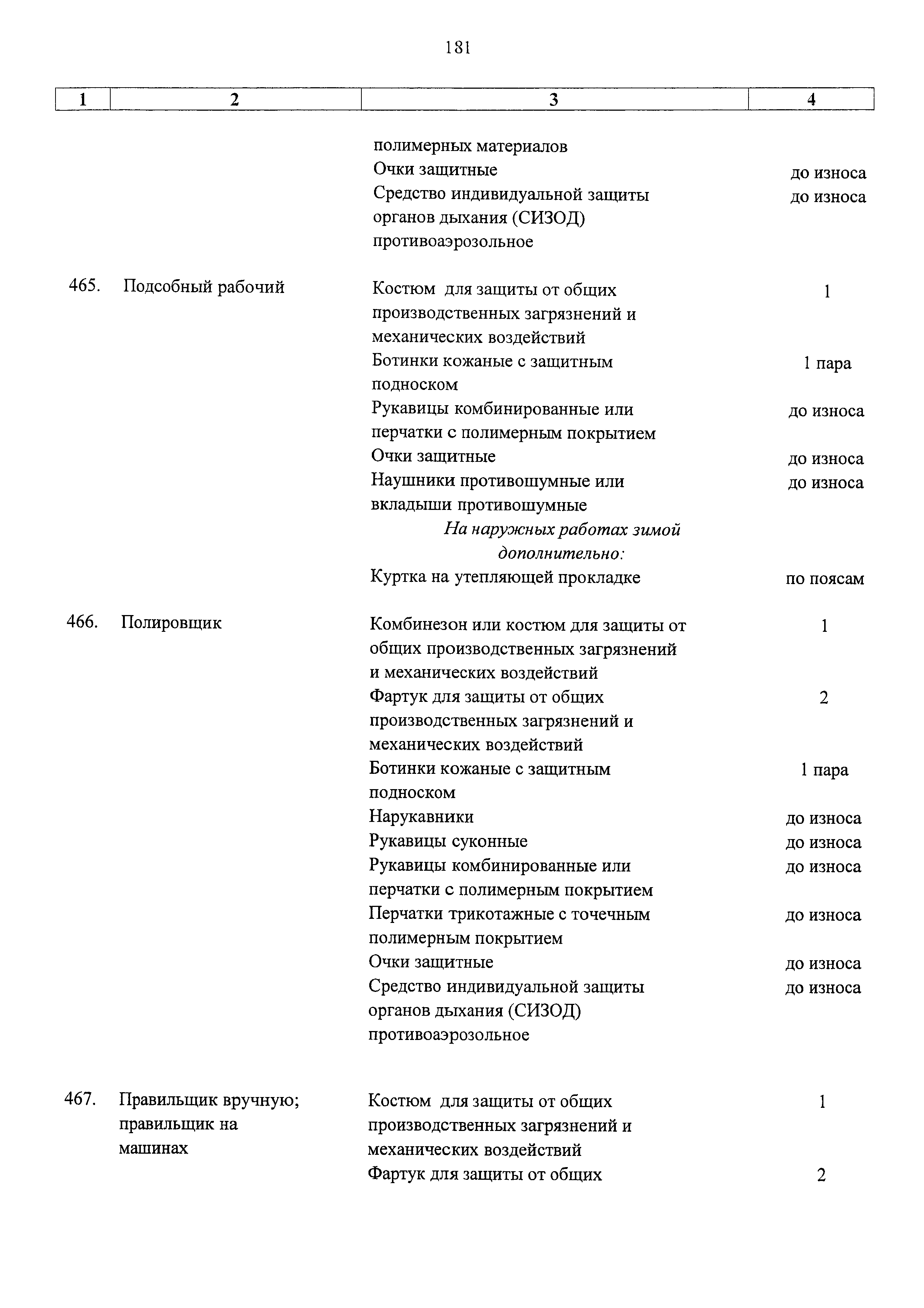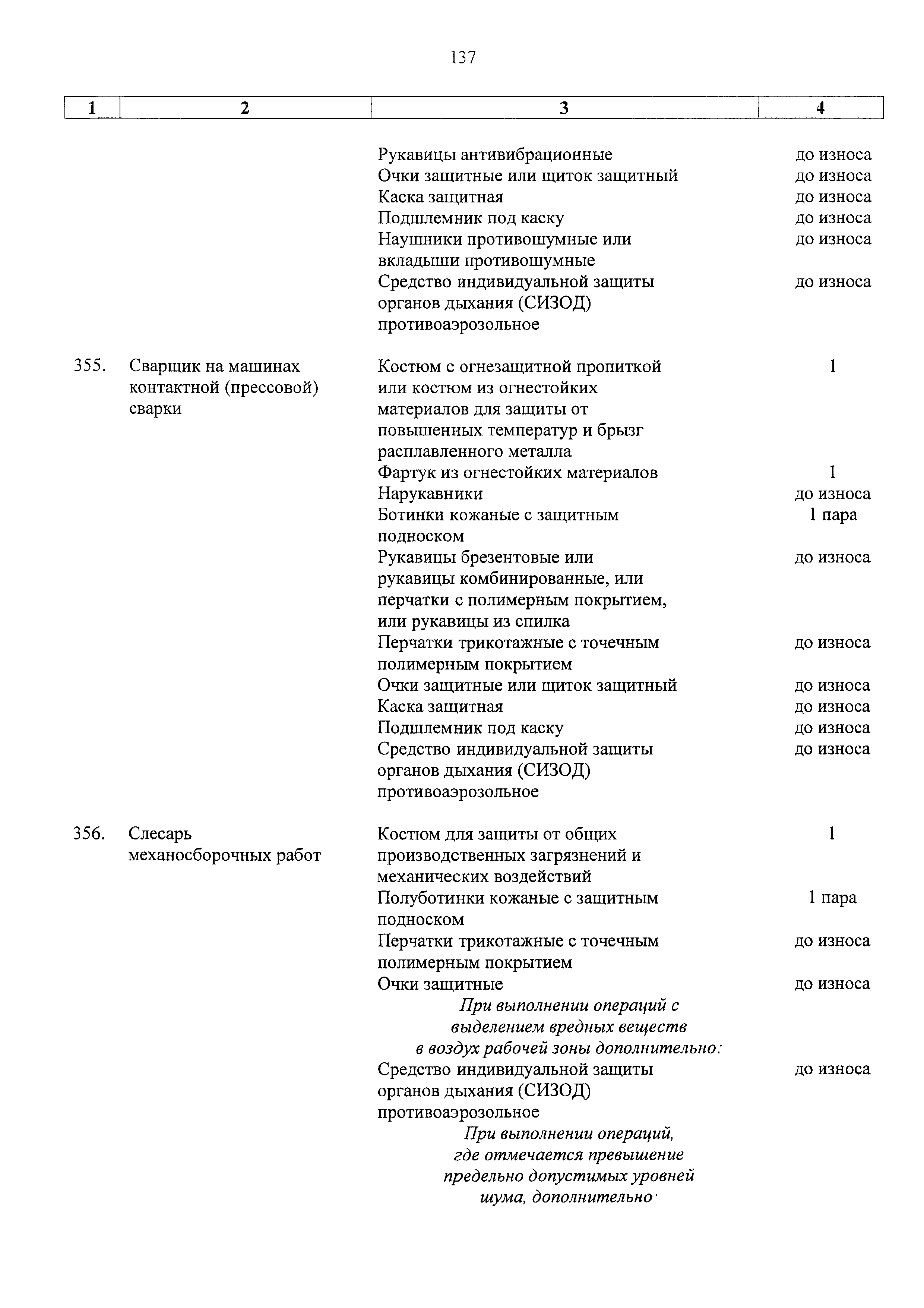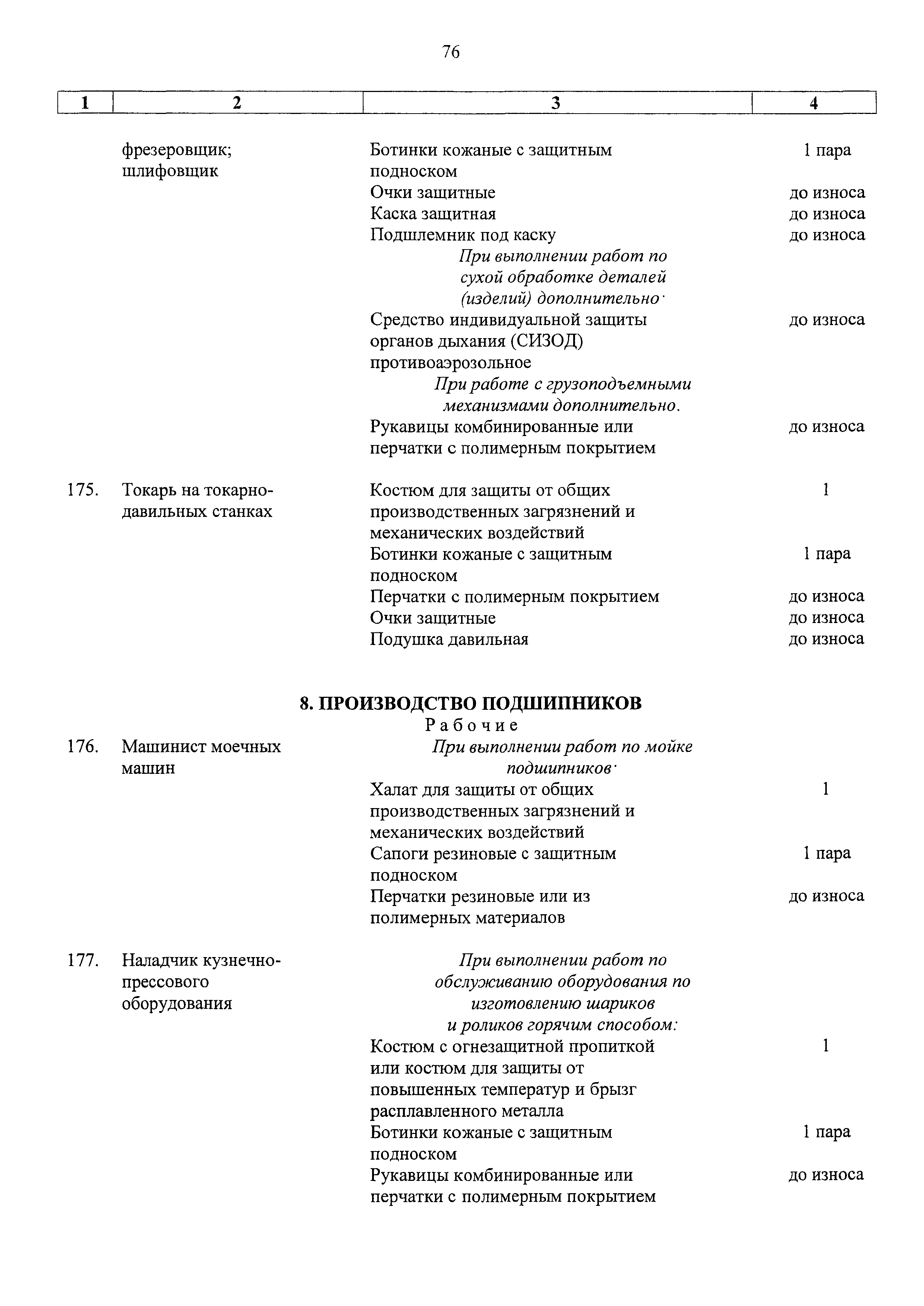 Типовые нормы бесплатной выдачи специальной одежды, специальной обуви и других средств индивидуальной защиты работникам машиностроительных и металлообрабатывающих производств, занятым на работах с вредными и (или) опасными условиями труда, а также на работах, выполняемых в особых температурных условиях или связанных с загрязнением| Статус: | действует | | Название рус.: | Типовые нормы бесплатной выдачи специальной одежды, специальной обуви и других средств индивидуальной защиты работникам машиностроительных и металлообрабатывающих производств, занятым на работах с вредными и (или) опасными условиями труда, а также на работах, выполняемых в особых температурных условиях или связанных с загрязнением | | Дата добавления в базу: | 01.09.2013 | | Дата актуализации: | 01.01.2021 | | Оглавление: | 1. Чугунолитейное производство и литье цветных металлов 2. Производства порошковой металлургии 3. Производство электродов и флюсов 4. Кузнечно-прессовые и термические работы 5. Сварочные работы 6. Работы по металлопокрытиям и окраске 7. Механическая обработка металлов; слесарные и слесарно-сборочные работы 8. Производство подшипников 9. Кузовное производство 10. Работы по производству и восстановлению напильников 11. Абразивное производство 12. Производство сверхтвердых материалов и инструмента из них 13. Производство шлифовальной шкурки 14. Разборка, ремонт, сборка и испытание тягачей, автомобилей и тракторов 15. Испытание двигателей и силовых установок 16. Производство мягких баков 17. Производство мипоры 18. Котельные работы и работы по металлическим конструкциям 19. Производство грузовых автомобилей 19.1 Сварка и сборка кабин 19.2. Сварка и сборка цельнометаллических кузовов 19.3. Сборка узлов 19.4. Сборка грузовых автомобилей 19.5. Подсборка узлов и агрегатов 20. Производство легковых автомобилей 20.1. Сборка-сварка кузовов 20.2. Сборка легковых автомобилей 21. Производство автокомпонентов 22. Агрегатное производство 23. Производство спецтехники 23.1. Сборочные, сварочные, окрасочные работы 23.2. Сборка автомобилей и узлов 23.3. Тюнинг автомобилей 24. Инструментальное производство 25. Общие профессии машиностроительных и металлообрабатывающих производств Примечания к типовым нормам | | Утверждён: | 14.12.2010 Минздравсоцразвития России (1104н)
