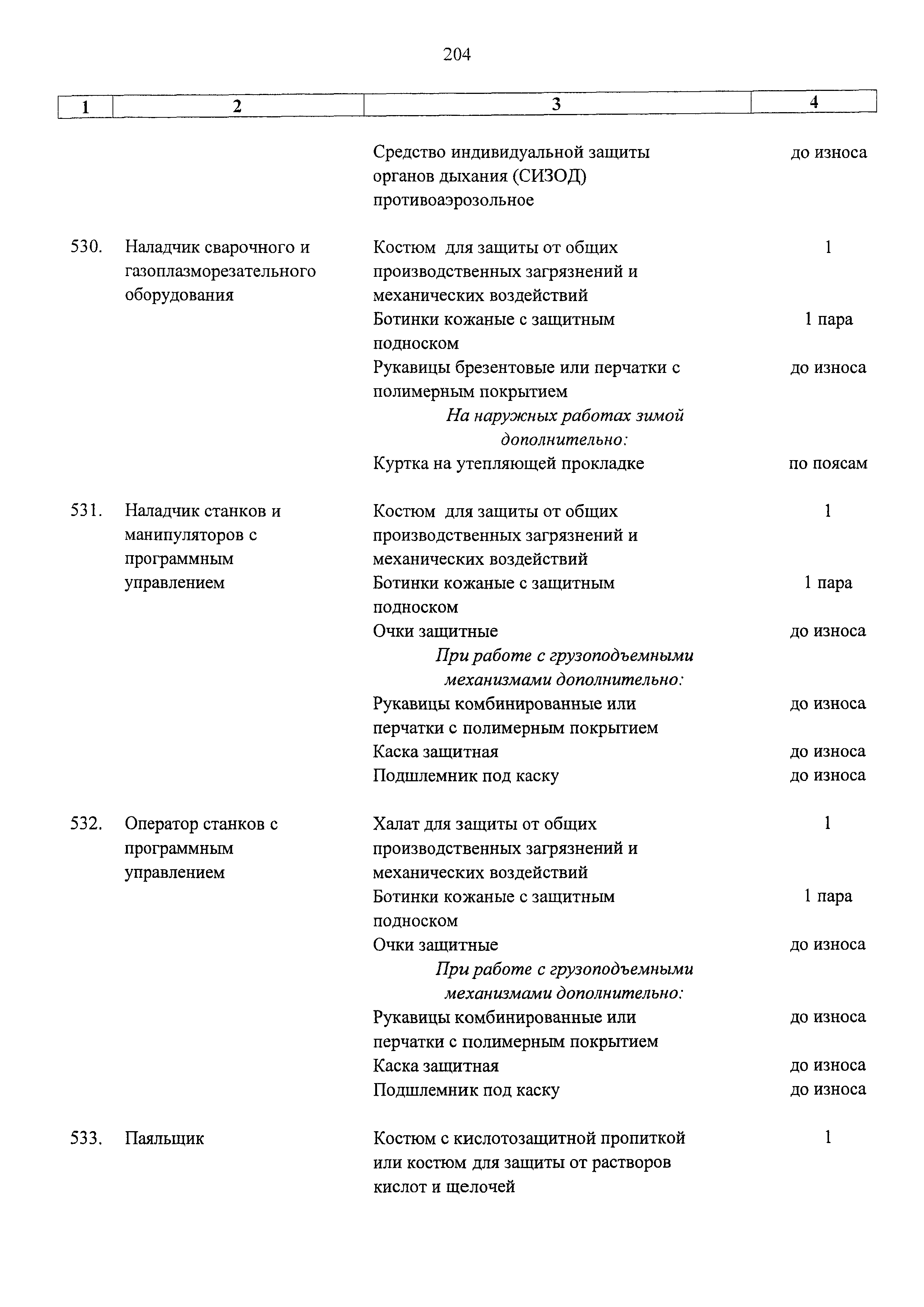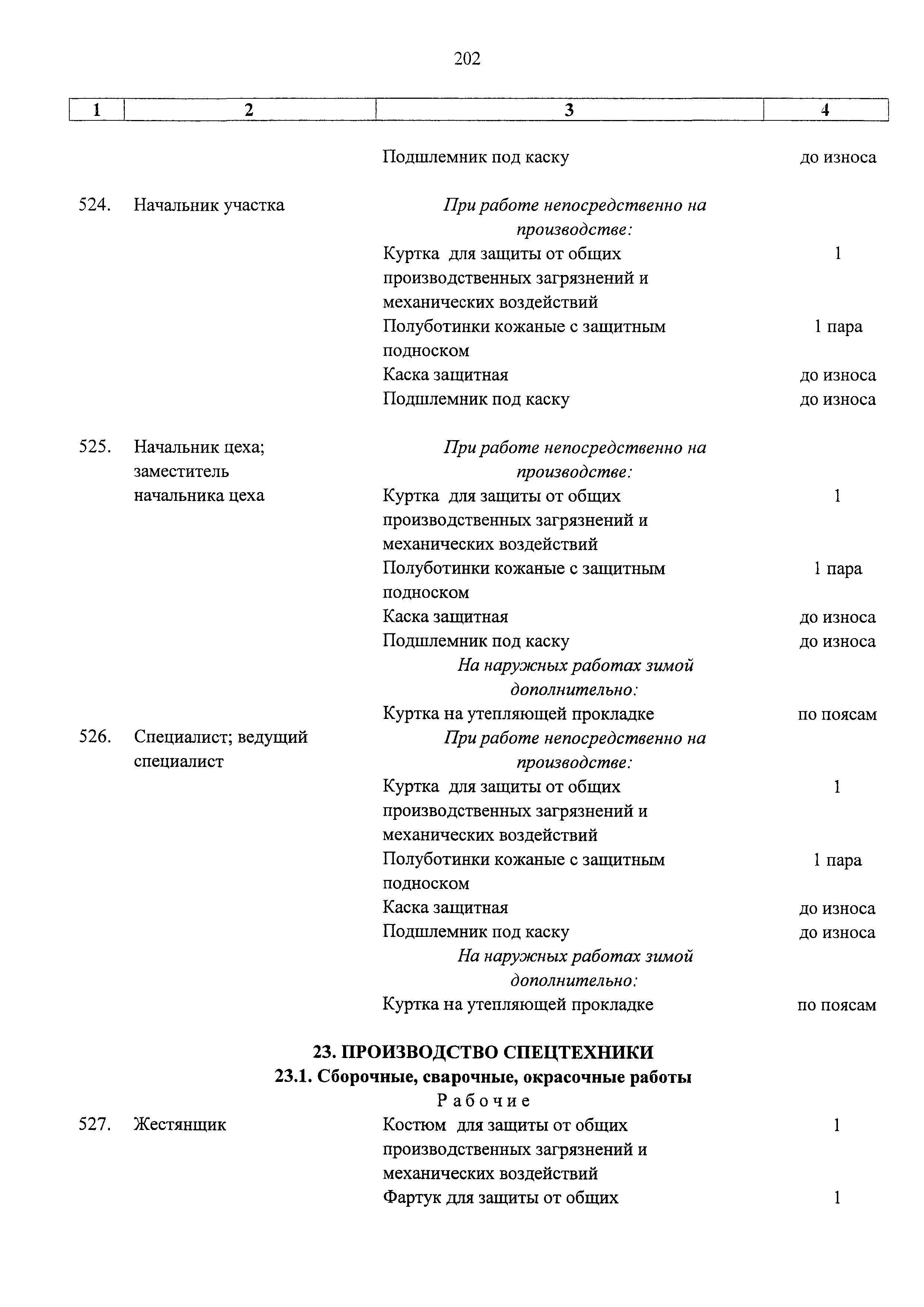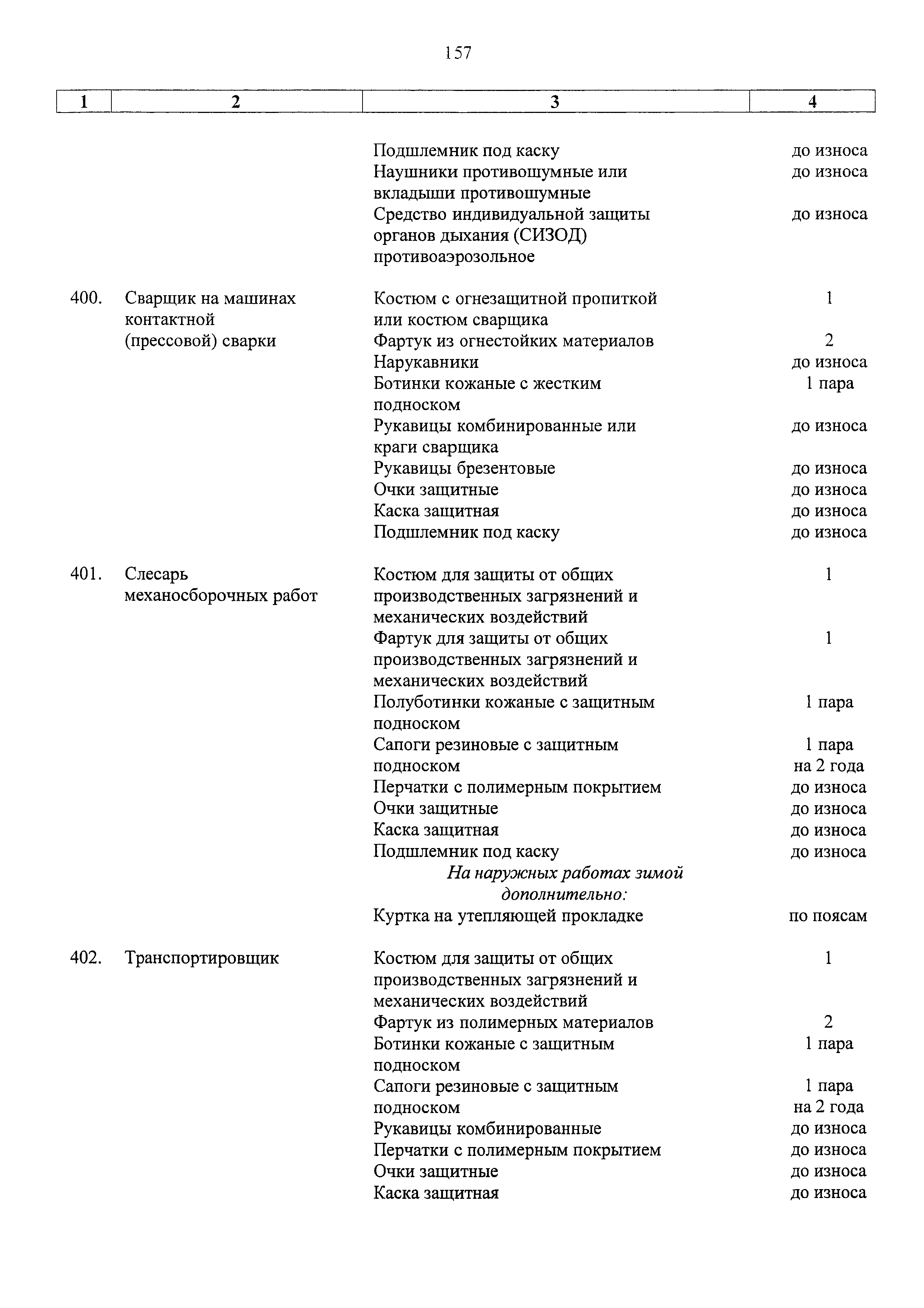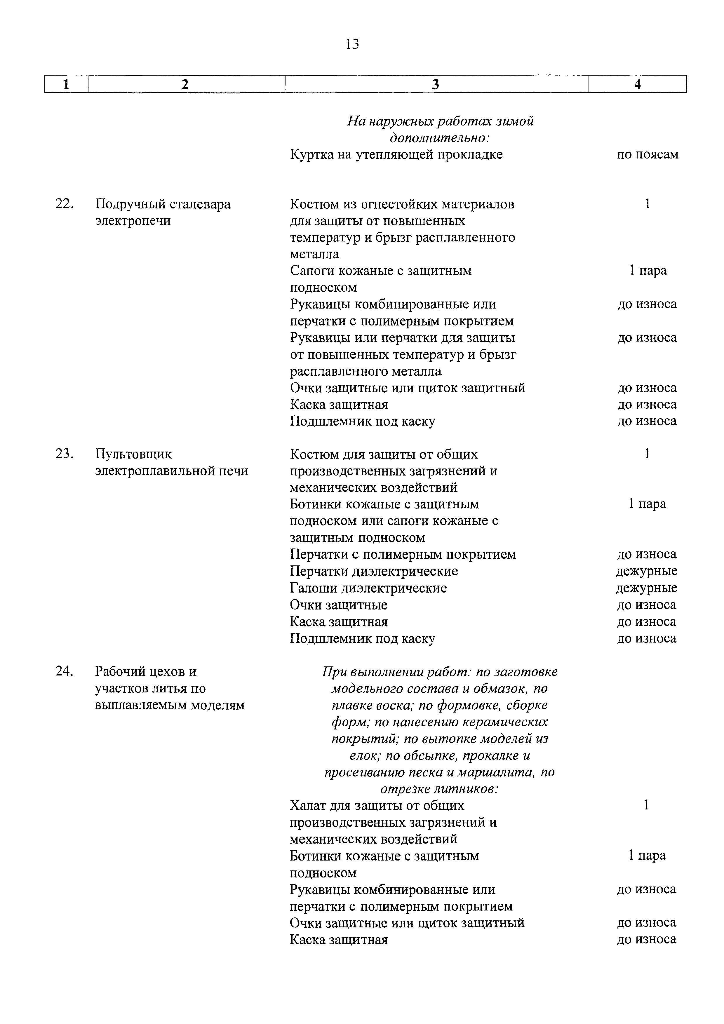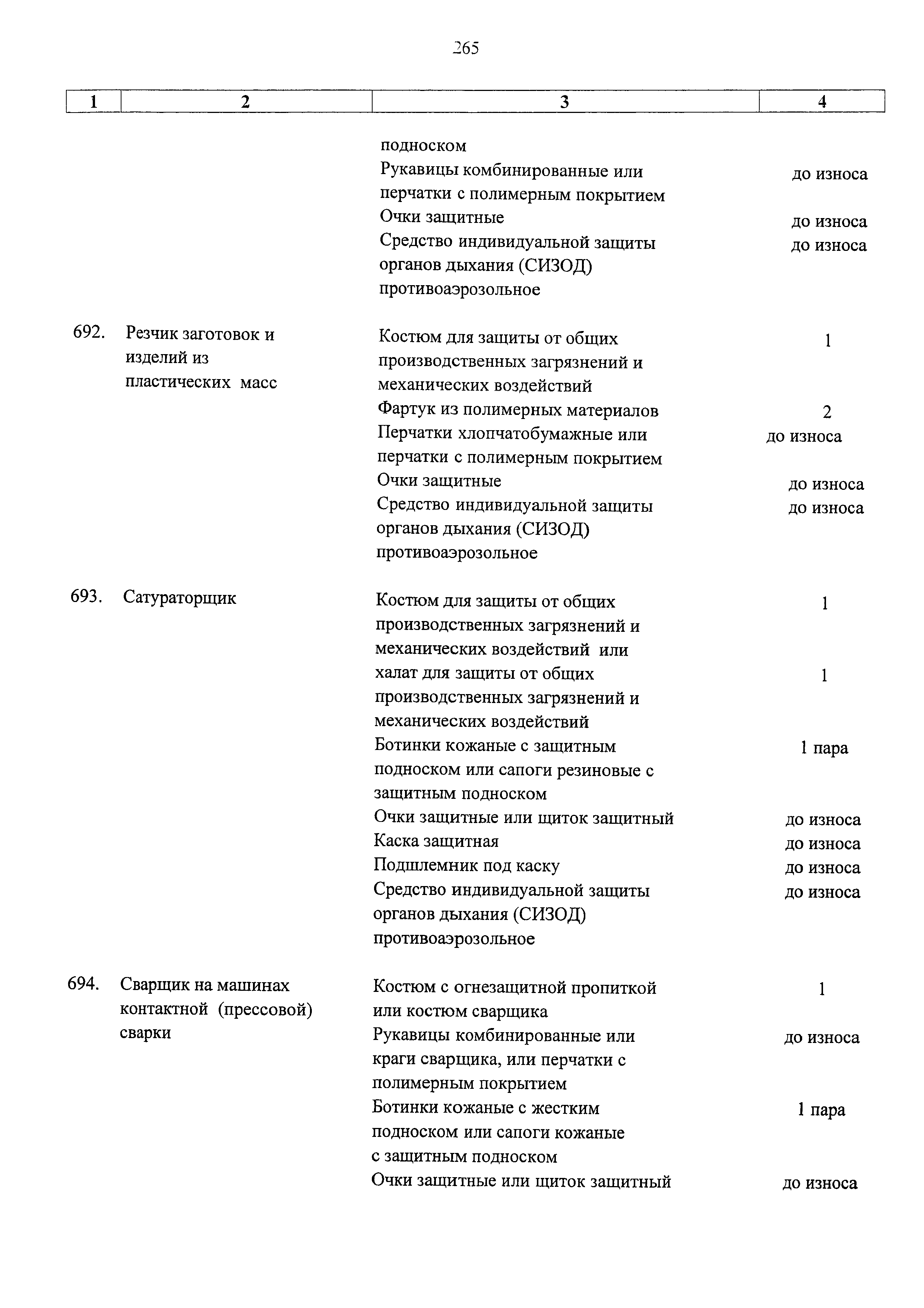 Типовые нормы бесплатной выдачи специальной одежды, специальной обуви и других средств индивидуальной защиты работникам машиностроительных и металлообрабатывающих производств, занятым на работах с вредными и (или) опасными условиями труда, а также на работах, выполняемых в особых температурных условиях или связанных с загрязнением| Статус: | действует | | Название рус.: | Типовые нормы бесплатной выдачи специальной одежды, специальной обуви и других средств индивидуальной защиты работникам машиностроительных и металлообрабатывающих производств, занятым на работах с вредными и (или) опасными условиями труда, а также на работах, выполняемых в особых температурных условиях или связанных с загрязнением | | Дата добавления в базу: | 01.09.2013 | | Дата актуализации: | 01.01.2021 | | Оглавление: | 1. Чугунолитейное производство и литье цветных металлов 2. Производства порошковой металлургии 3. Производство электродов и флюсов 4. Кузнечно-прессовые и термические работы 5. Сварочные работы 6. Работы по металлопокрытиям и окраске 7. Механическая обработка металлов; слесарные и слесарно-сборочные работы 8. Производство подшипников 9. Кузовное производство 10. Работы по производству и восстановлению напильников 11. Абразивное производство 12. Производство сверхтвердых материалов и инструмента из них 13. Производство шлифовальной шкурки 14. Разборка, ремонт, сборка и испытание тягачей, автомобилей и тракторов 15. Испытание двигателей и силовых установок 16. Производство мягких баков 17. Производство мипоры 18. Котельные работы и работы по металлическим конструкциям 19. Производство грузовых автомобилей 19.1 Сварка и сборка кабин 19.2. Сварка и сборка цельнометаллических кузовов 19.3. Сборка узлов 19.4. Сборка грузовых автомобилей 19.5. Подсборка узлов и агрегатов 20. Производство легковых автомобилей 20.1. Сборка-сварка кузовов 20.2. Сборка легковых автомобилей 21. Производство автокомпонентов 22. Агрегатное производство 23. Производство спецтехники 23.1. Сборочные, сварочные, окрасочные работы 23.2. Сборка автомобилей и узлов 23.3. Тюнинг автомобилей 24. Инструментальное производство 25. Общие профессии машиностроительных и металлообрабатывающих производств Примечания к типовым нормам | | Утверждён: | 14.12.2010 Минздравсоцразвития России (1104н)