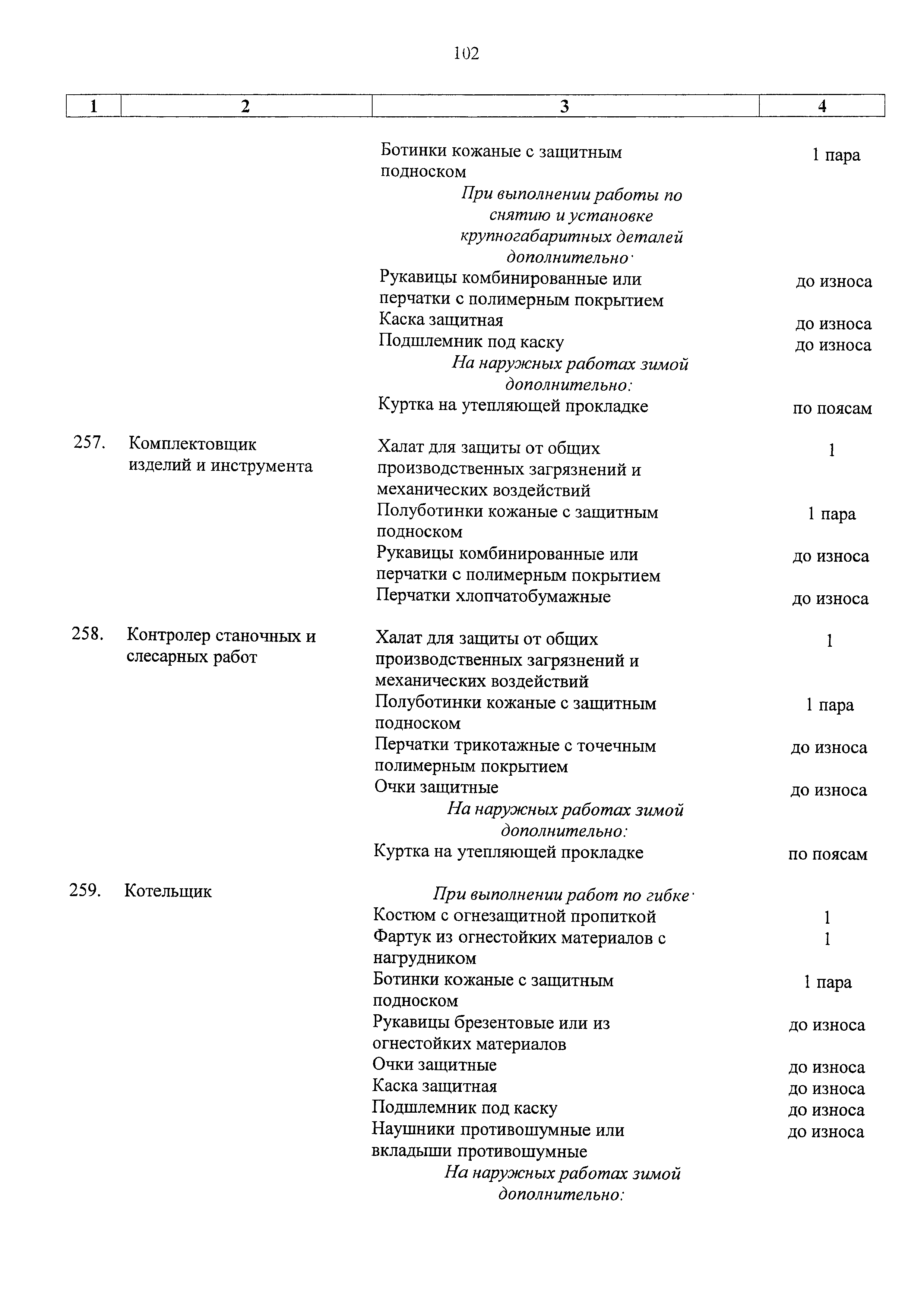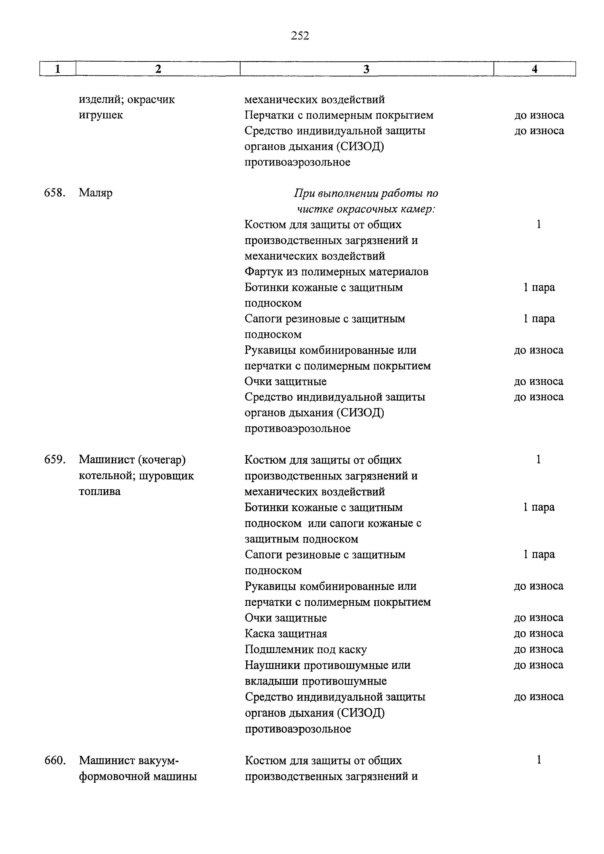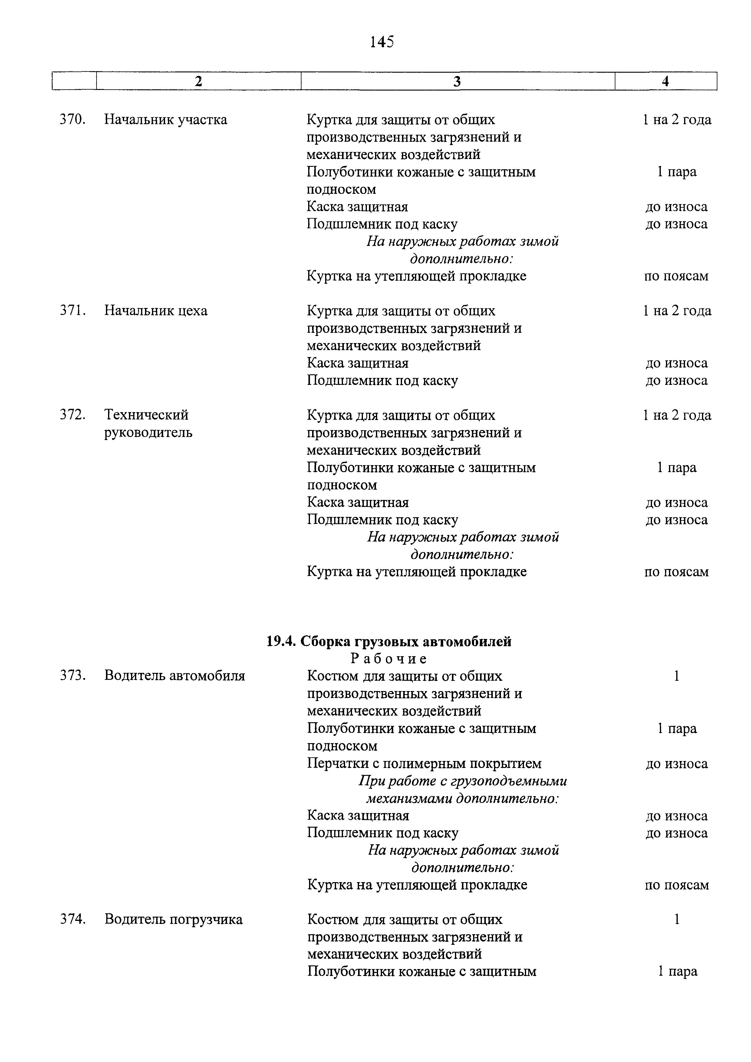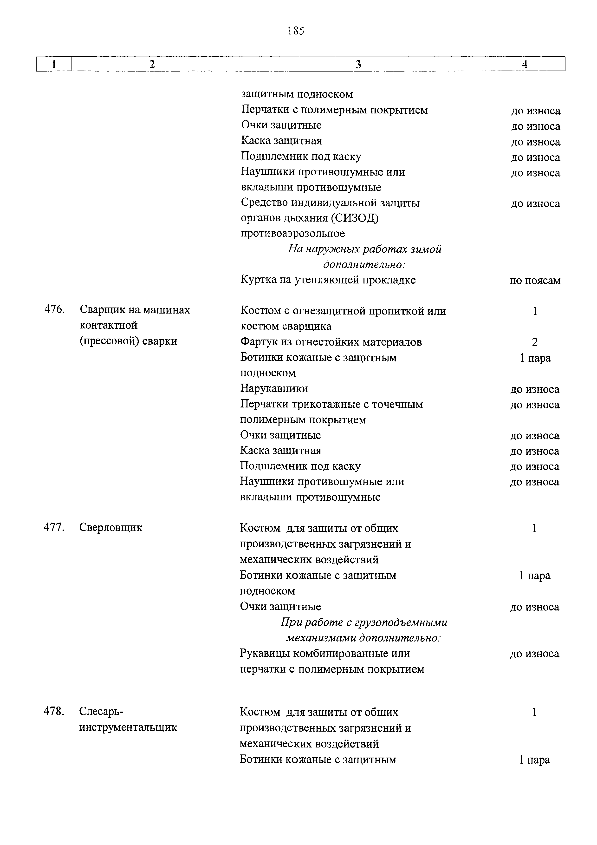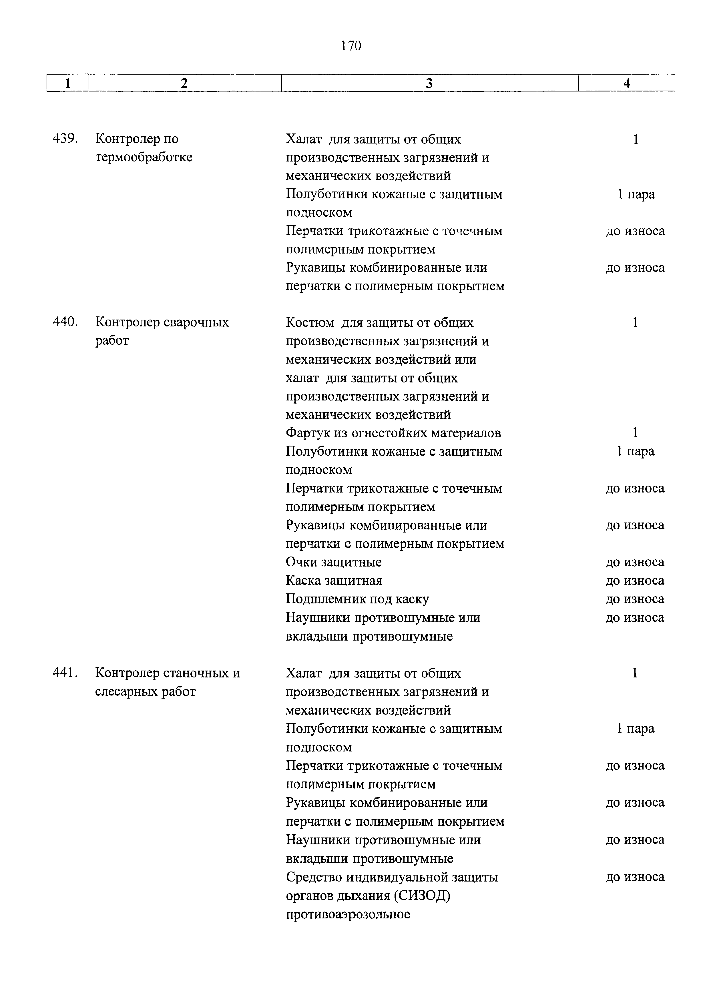 Типовые нормы бесплатной выдачи специальной одежды, специальной обуви и других средств индивидуальной защиты работникам машиностроительных и металлообрабатывающих производств, занятым на работах с вредными и (или) опасными условиями труда, а также на работах, выполняемых в особых температурных условиях или связанных с загрязнением| Статус: | действует | | Название рус.: | Типовые нормы бесплатной выдачи специальной одежды, специальной обуви и других средств индивидуальной защиты работникам машиностроительных и металлообрабатывающих производств, занятым на работах с вредными и (или) опасными условиями труда, а также на работах, выполняемых в особых температурных условиях или связанных с загрязнением | | Дата добавления в базу: | 01.09.2013 | | Дата актуализации: | 01.01.2021 | | Оглавление: | 1. Чугунолитейное производство и литье цветных металлов 2. Производства порошковой металлургии 3. Производство электродов и флюсов 4. Кузнечно-прессовые и термические работы 5. Сварочные работы 6. Работы по металлопокрытиям и окраске 7. Механическая обработка металлов; слесарные и слесарно-сборочные работы 8. Производство подшипников 9. Кузовное производство 10. Работы по производству и восстановлению напильников 11. Абразивное производство 12. Производство сверхтвердых материалов и инструмента из них 13. Производство шлифовальной шкурки 14. Разборка, ремонт, сборка и испытание тягачей, автомобилей и тракторов 15. Испытание двигателей и силовых установок 16. Производство мягких баков 17. Производство мипоры 18. Котельные работы и работы по металлическим конструкциям 19. Производство грузовых автомобилей 19.1 Сварка и сборка кабин 19.2. Сварка и сборка цельнометаллических кузовов 19.3. Сборка узлов 19.4. Сборка грузовых автомобилей 19.5. Подсборка узлов и агрегатов 20. Производство легковых автомобилей 20.1. Сборка-сварка кузовов 20.2. Сборка легковых автомобилей 21. Производство автокомпонентов 22. Агрегатное производство 23. Производство спецтехники 23.1. Сборочные, сварочные, окрасочные работы 23.2. Сборка автомобилей и узлов 23.3. Тюнинг автомобилей 24. Инструментальное производство 25. Общие профессии машиностроительных и металлообрабатывающих производств Примечания к типовым нормам | | Утверждён: | 14.12.2010 Минздравсоцразвития России (1104н)