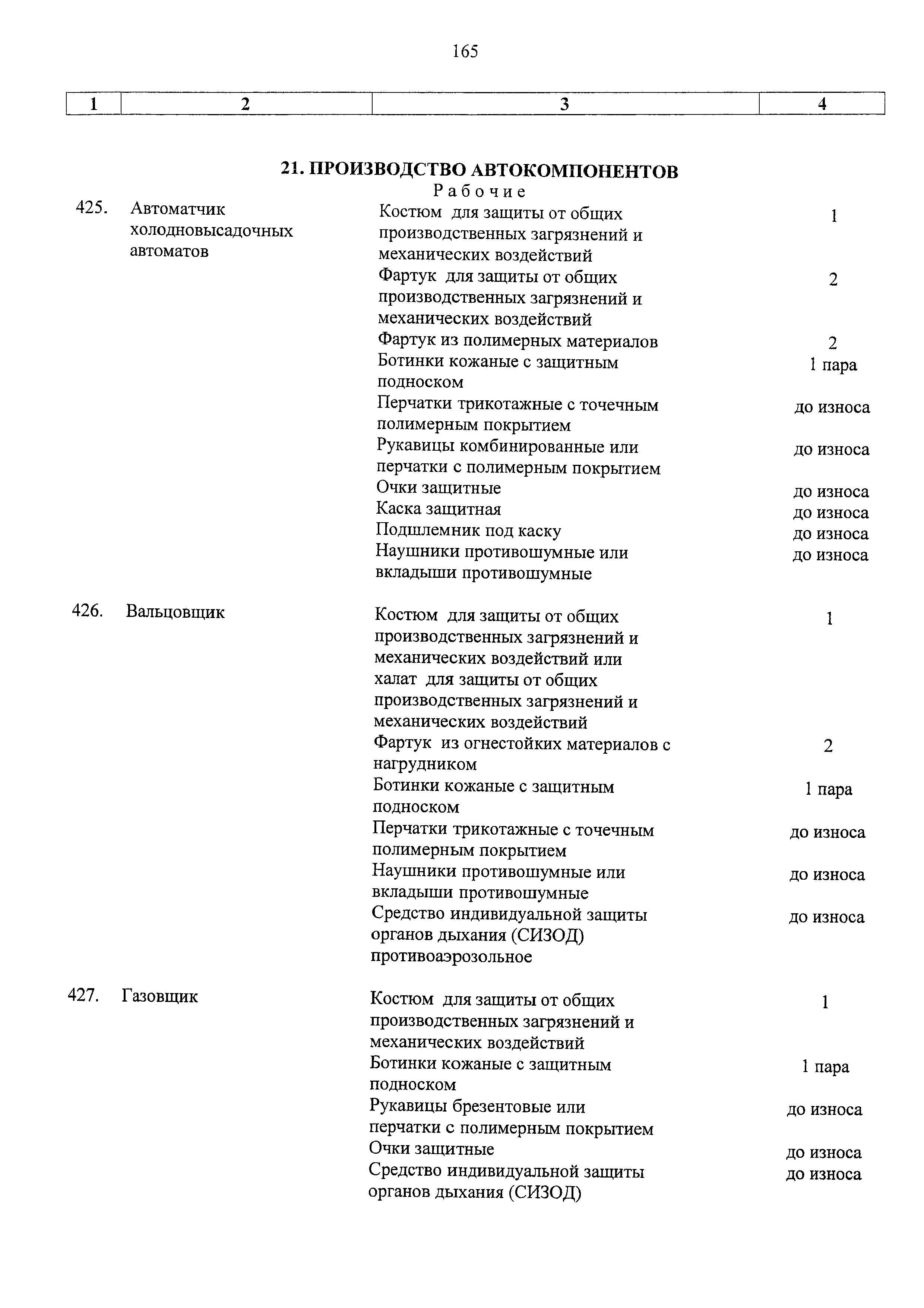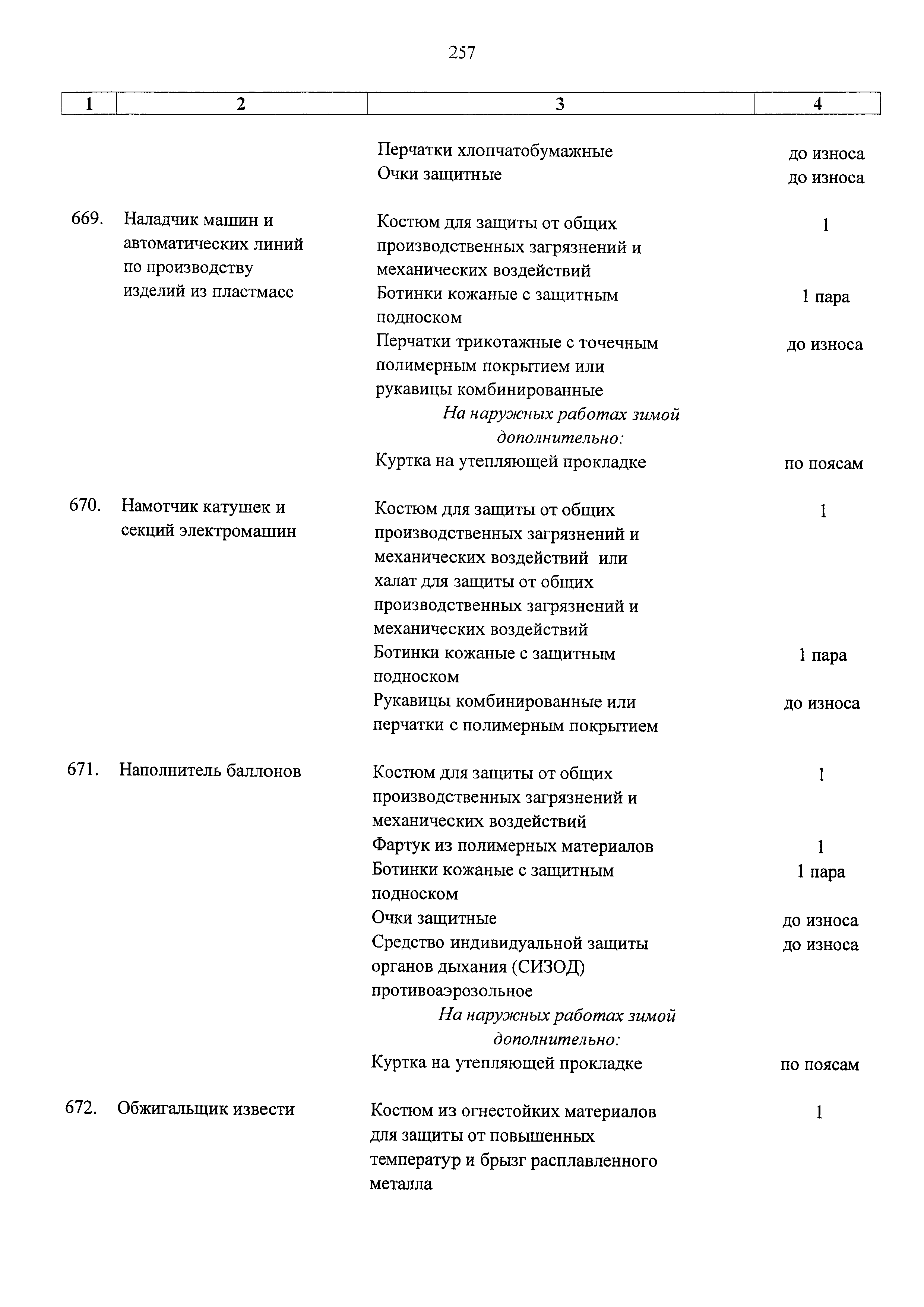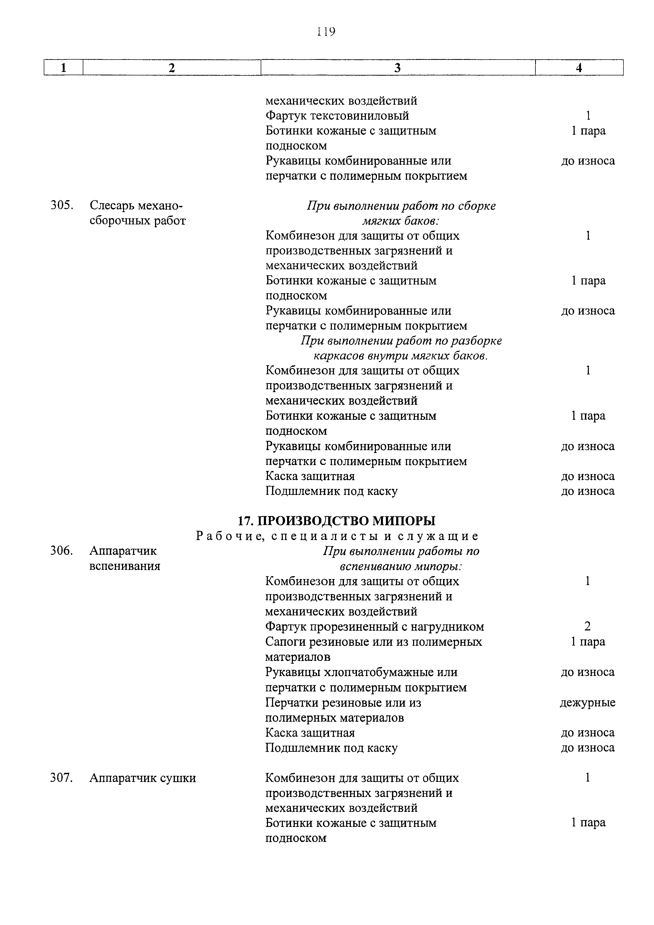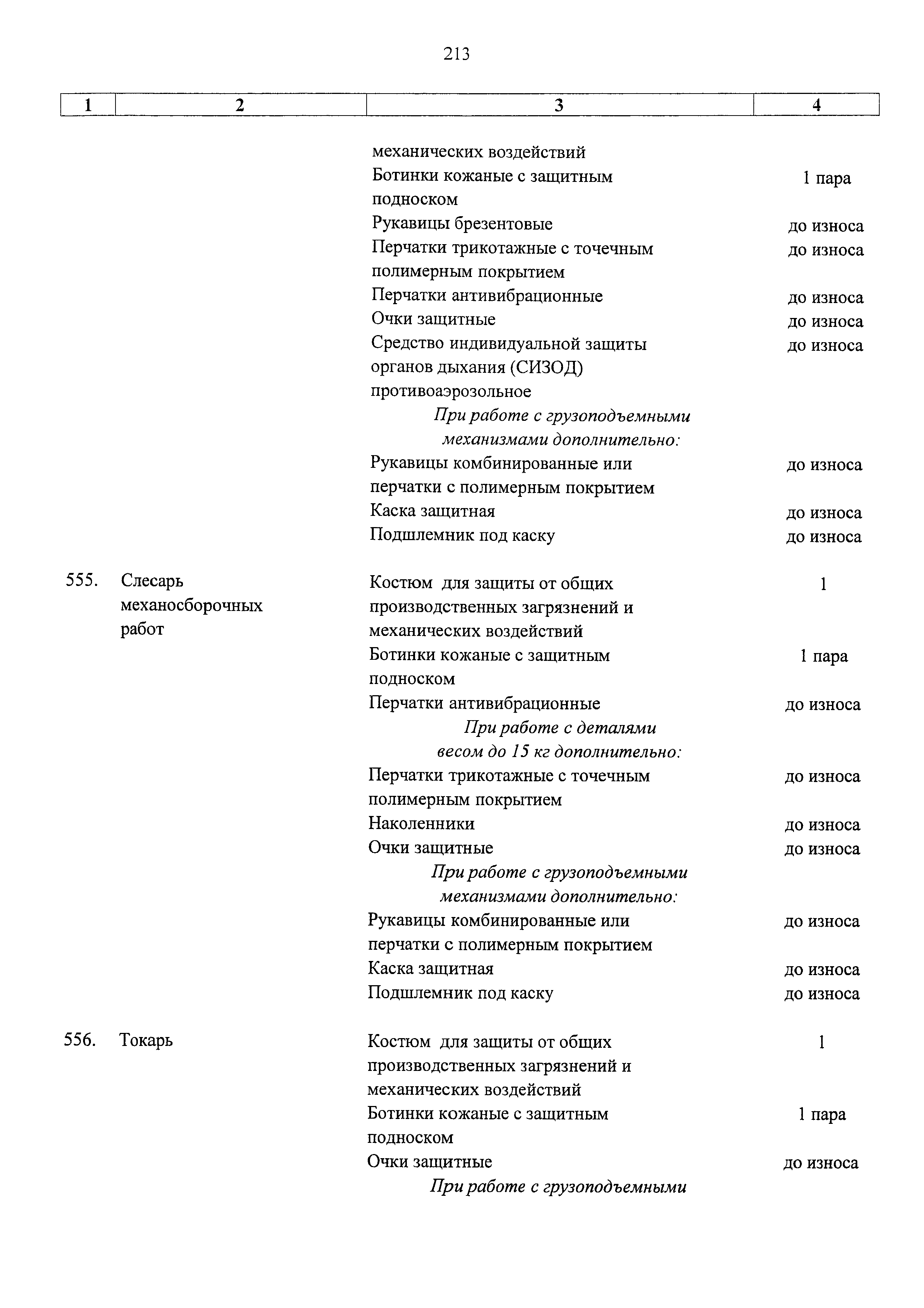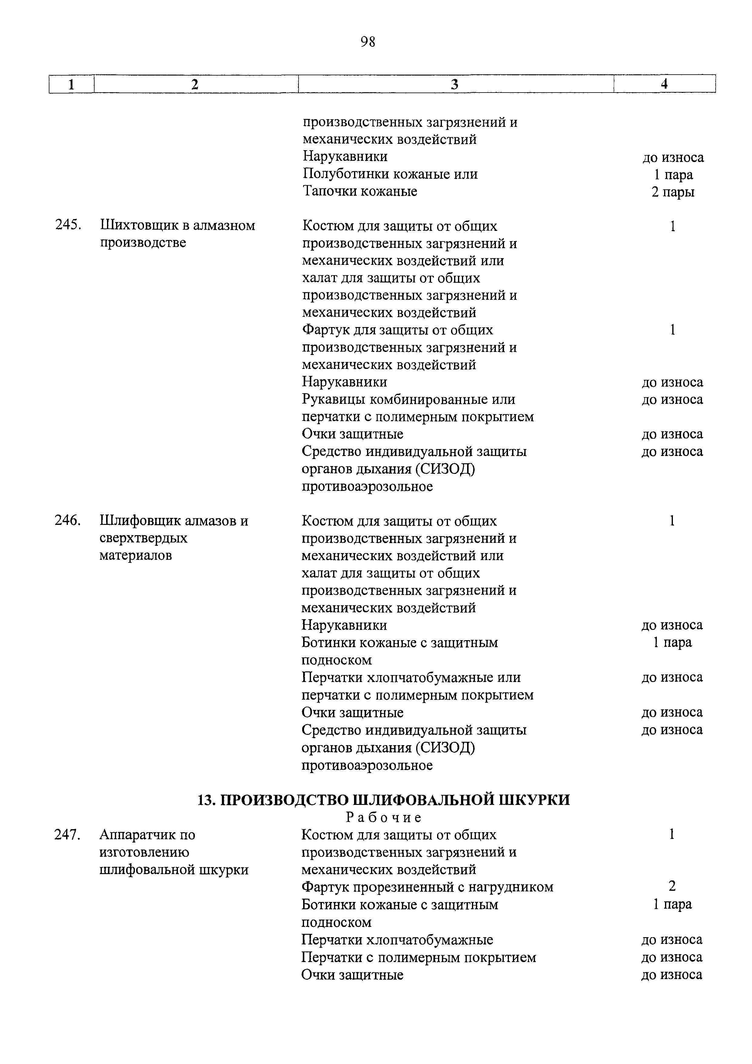 Типовые нормы бесплатной выдачи специальной одежды, специальной обуви и других средств индивидуальной защиты работникам машиностроительных и металлообрабатывающих производств, занятым на работах с вредными и (или) опасными условиями труда, а также на работах, выполняемых в особых температурных условиях или связанных с загрязнением| Статус: | действует | | Название рус.: | Типовые нормы бесплатной выдачи специальной одежды, специальной обуви и других средств индивидуальной защиты работникам машиностроительных и металлообрабатывающих производств, занятым на работах с вредными и (или) опасными условиями труда, а также на работах, выполняемых в особых температурных условиях или связанных с загрязнением | | Дата добавления в базу: | 01.09.2013 | | Дата актуализации: | 01.01.2021 | | Оглавление: | 1. Чугунолитейное производство и литье цветных металлов 2. Производства порошковой металлургии 3. Производство электродов и флюсов 4. Кузнечно-прессовые и термические работы 5. Сварочные работы 6. Работы по металлопокрытиям и окраске 7. Механическая обработка металлов; слесарные и слесарно-сборочные работы 8. Производство подшипников 9. Кузовное производство 10. Работы по производству и восстановлению напильников 11. Абразивное производство 12. Производство сверхтвердых материалов и инструмента из них 13. Производство шлифовальной шкурки 14. Разборка, ремонт, сборка и испытание тягачей, автомобилей и тракторов 15. Испытание двигателей и силовых установок 16. Производство мягких баков 17. Производство мипоры 18. Котельные работы и работы по металлическим конструкциям 19. Производство грузовых автомобилей 19.1 Сварка и сборка кабин 19.2. Сварка и сборка цельнометаллических кузовов 19.3. Сборка узлов 19.4. Сборка грузовых автомобилей 19.5. Подсборка узлов и агрегатов 20. Производство легковых автомобилей 20.1. Сборка-сварка кузовов 20.2. Сборка легковых автомобилей 21. Производство автокомпонентов 22. Агрегатное производство 23. Производство спецтехники 23.1. Сборочные, сварочные, окрасочные работы 23.2. Сборка автомобилей и узлов 23.3. Тюнинг автомобилей 24. Инструментальное производство 25. Общие профессии машиностроительных и металлообрабатывающих производств Примечания к типовым нормам | | Утверждён: | 14.12.2010 Минздравсоцразвития России (1104н)