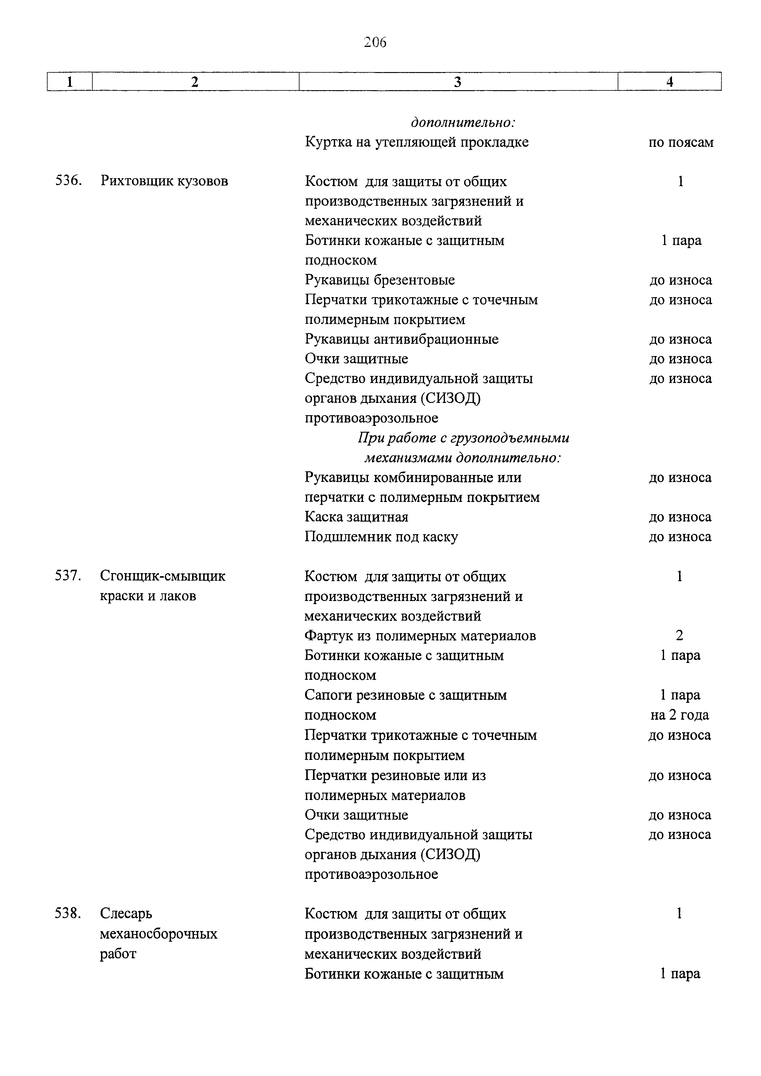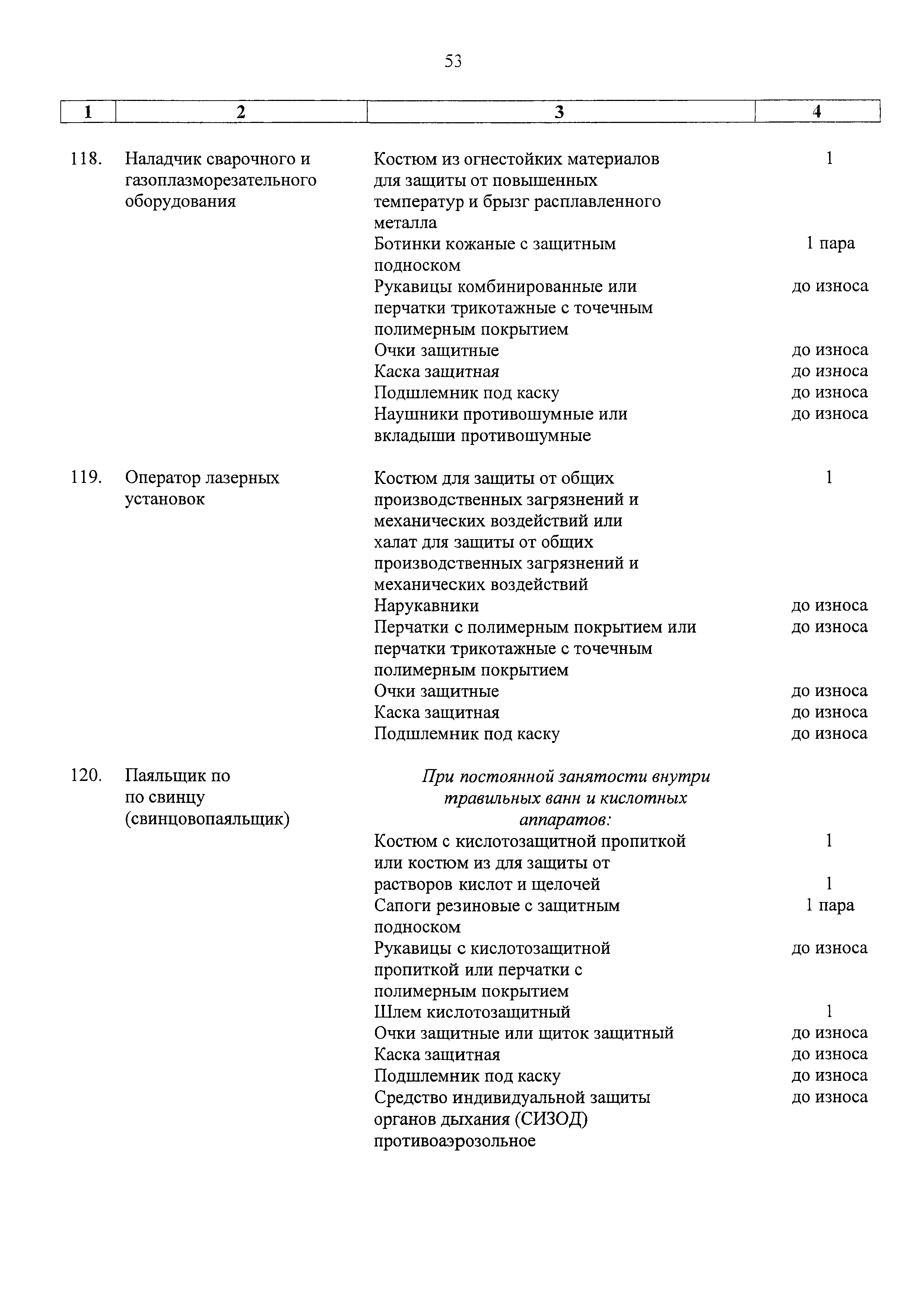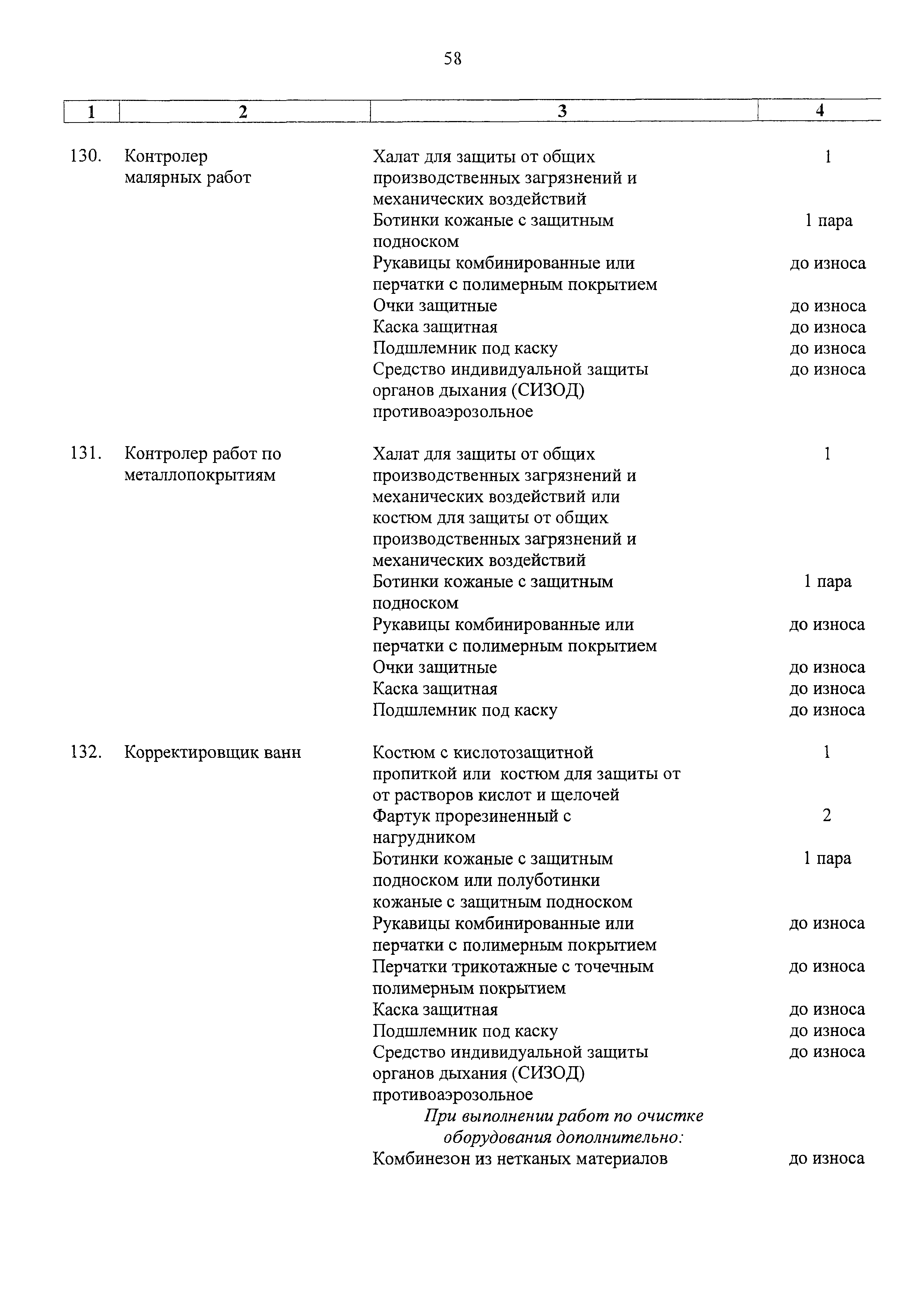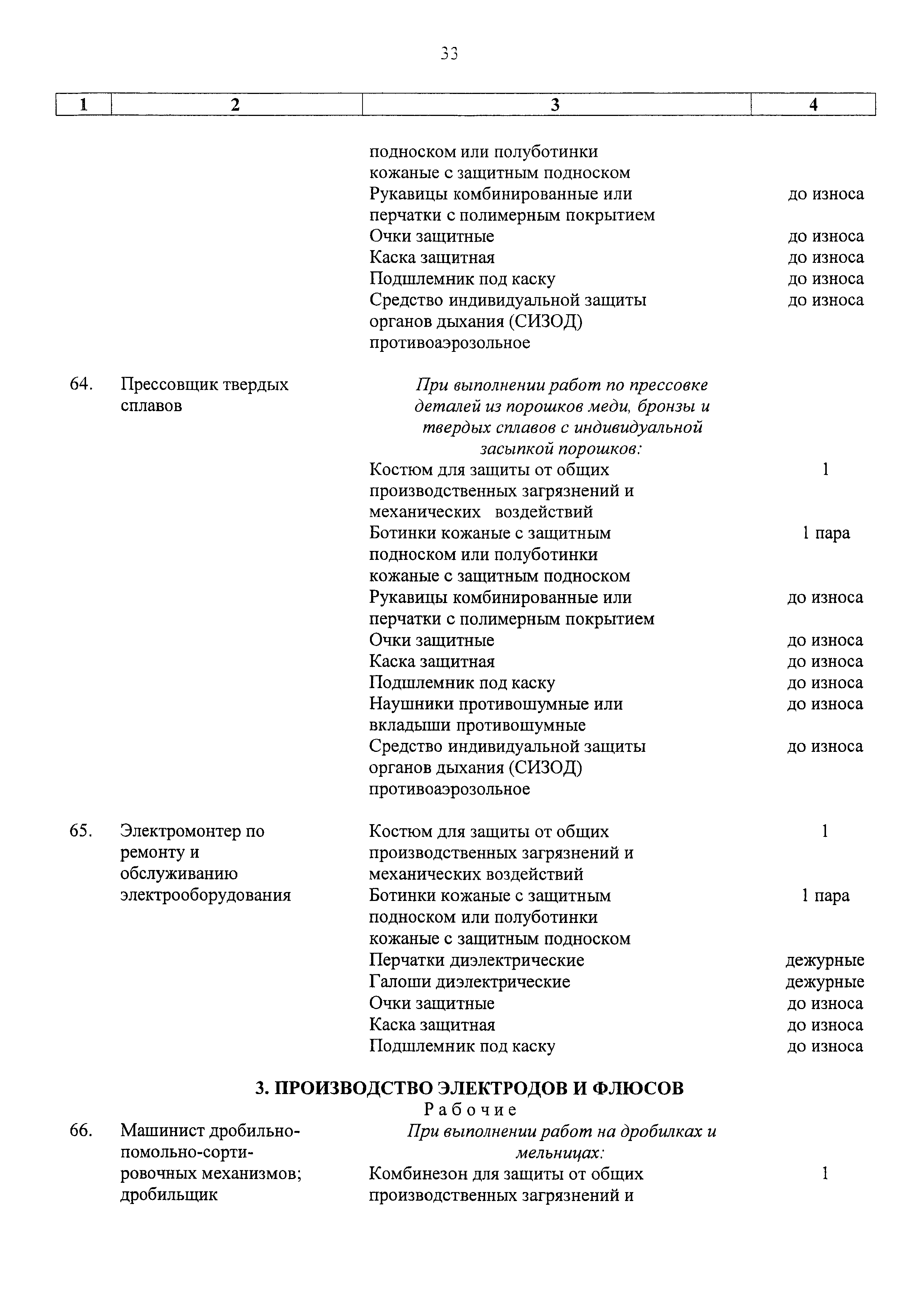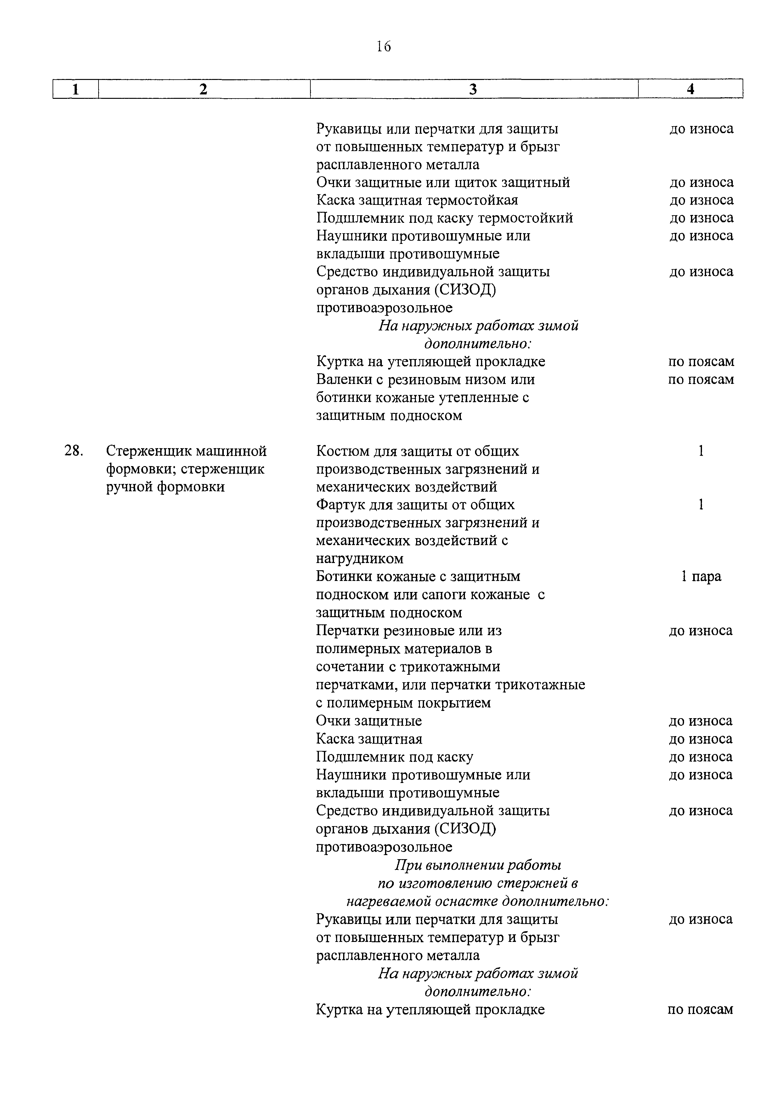 Типовые нормы бесплатной выдачи специальной одежды, специальной обуви и других средств индивидуальной защиты работникам машиностроительных и металлообрабатывающих производств, занятым на работах с вредными и (или) опасными условиями труда, а также на работах, выполняемых в особых температурных условиях или связанных с загрязнением| Статус: | действует | | Название рус.: | Типовые нормы бесплатной выдачи специальной одежды, специальной обуви и других средств индивидуальной защиты работникам машиностроительных и металлообрабатывающих производств, занятым на работах с вредными и (или) опасными условиями труда, а также на работах, выполняемых в особых температурных условиях или связанных с загрязнением | | Дата добавления в базу: | 01.09.2013 | | Дата актуализации: | 01.01.2021 | | Оглавление: | 1. Чугунолитейное производство и литье цветных металлов 2. Производства порошковой металлургии 3. Производство электродов и флюсов 4. Кузнечно-прессовые и термические работы 5. Сварочные работы 6. Работы по металлопокрытиям и окраске 7. Механическая обработка металлов; слесарные и слесарно-сборочные работы 8. Производство подшипников 9. Кузовное производство 10. Работы по производству и восстановлению напильников 11. Абразивное производство 12. Производство сверхтвердых материалов и инструмента из них 13. Производство шлифовальной шкурки 14. Разборка, ремонт, сборка и испытание тягачей, автомобилей и тракторов 15. Испытание двигателей и силовых установок 16. Производство мягких баков 17. Производство мипоры 18. Котельные работы и работы по металлическим конструкциям 19. Производство грузовых автомобилей 19.1 Сварка и сборка кабин 19.2. Сварка и сборка цельнометаллических кузовов 19.3. Сборка узлов 19.4. Сборка грузовых автомобилей 19.5. Подсборка узлов и агрегатов 20. Производство легковых автомобилей 20.1. Сборка-сварка кузовов 20.2. Сборка легковых автомобилей 21. Производство автокомпонентов 22. Агрегатное производство 23. Производство спецтехники 23.1. Сборочные, сварочные, окрасочные работы 23.2. Сборка автомобилей и узлов 23.3. Тюнинг автомобилей 24. Инструментальное производство 25. Общие профессии машиностроительных и металлообрабатывающих производств Примечания к типовым нормам | | Утверждён: | 14.12.2010 Минздравсоцразвития России (1104н)