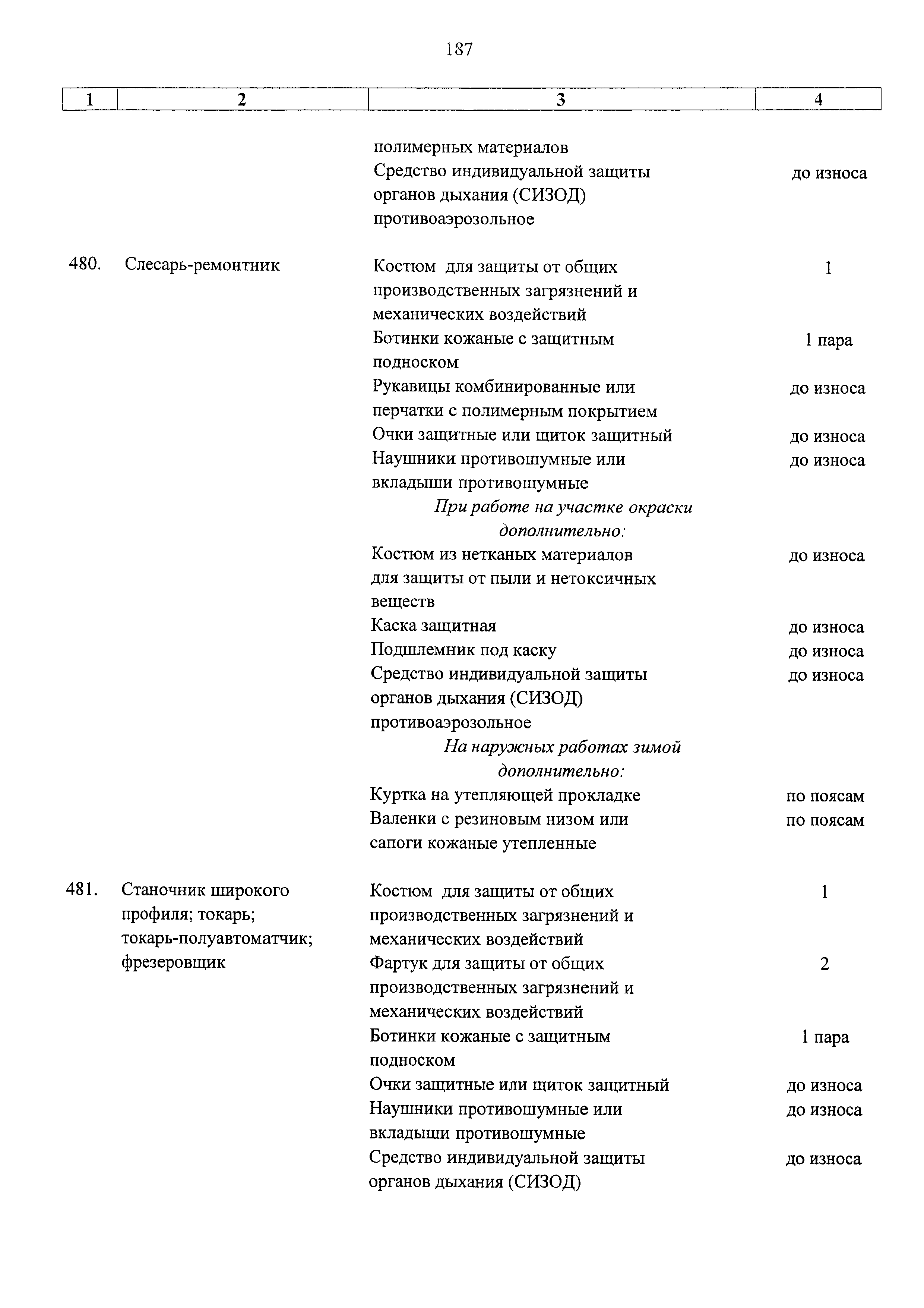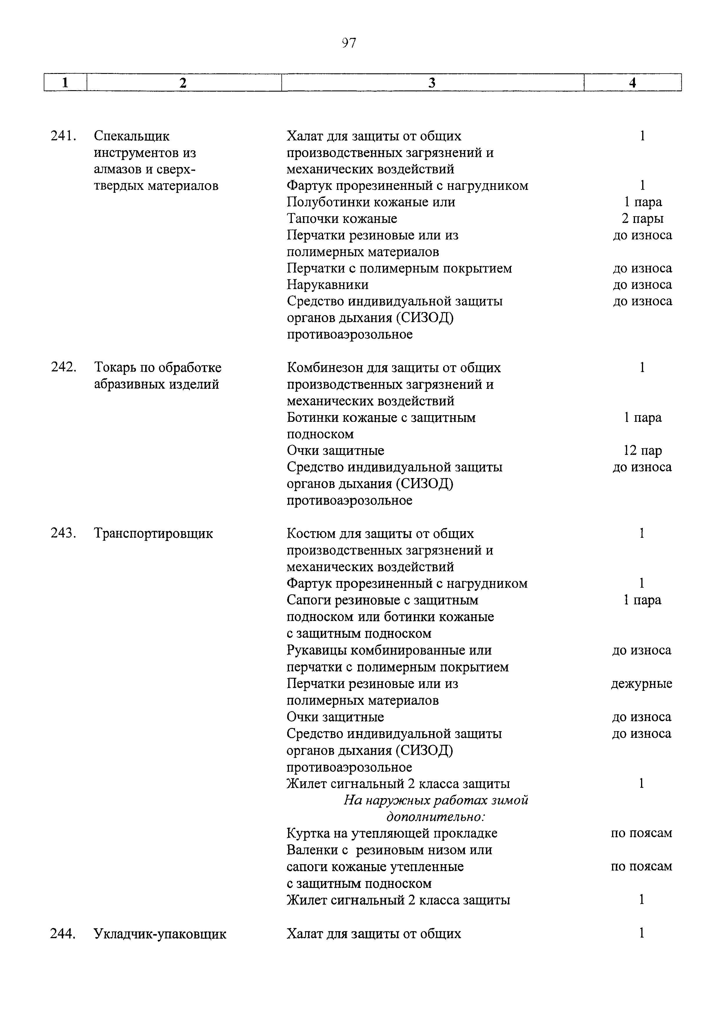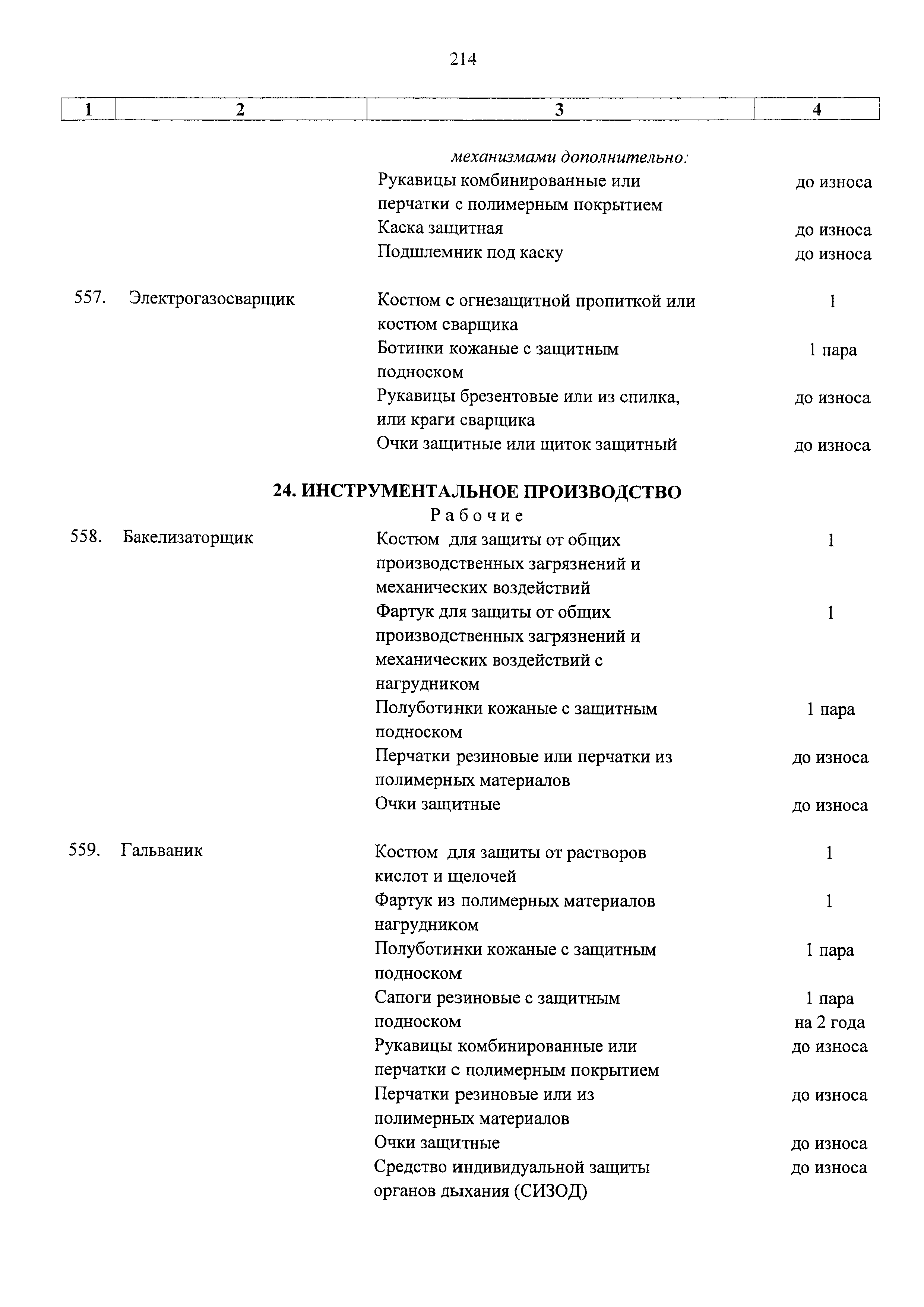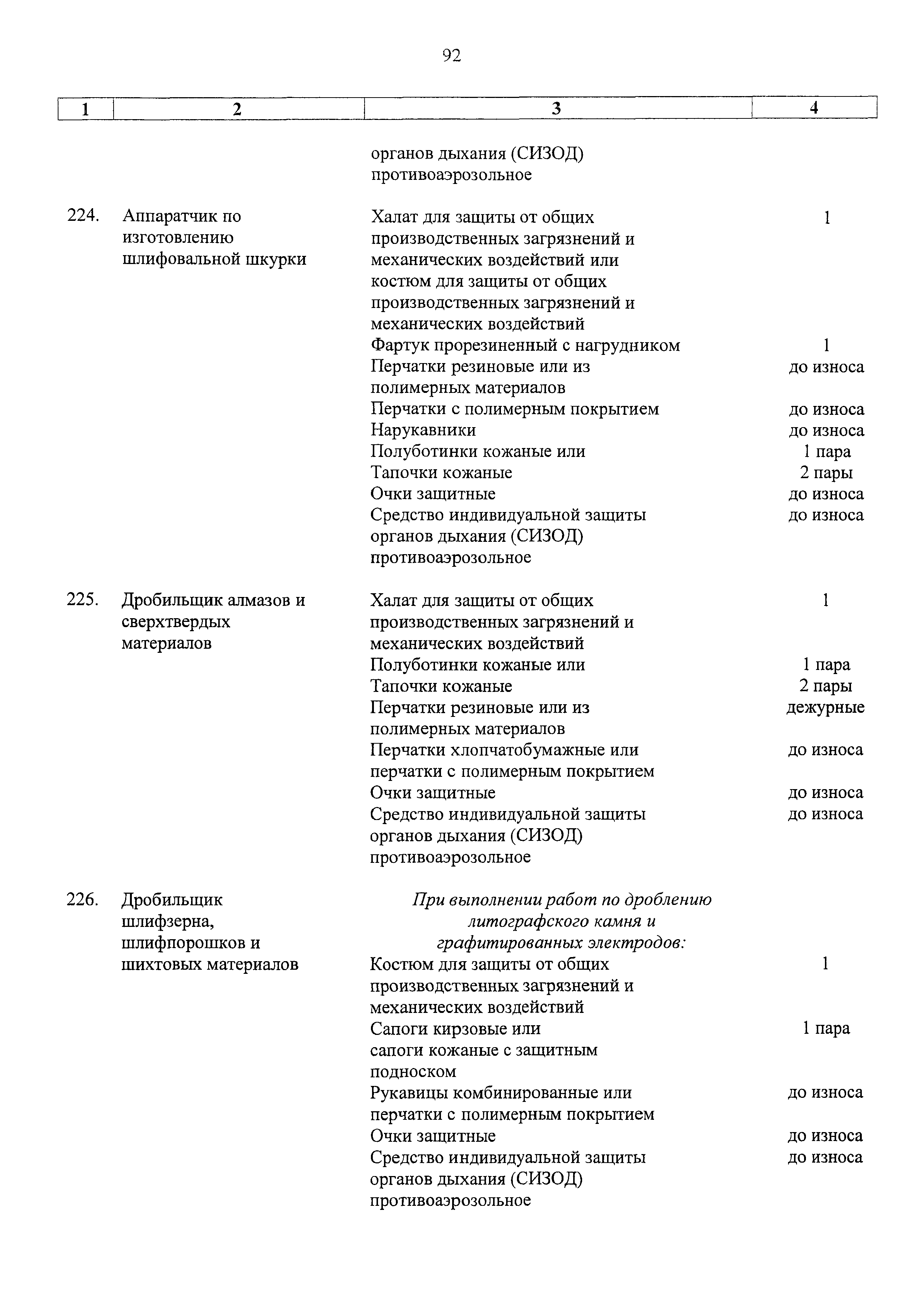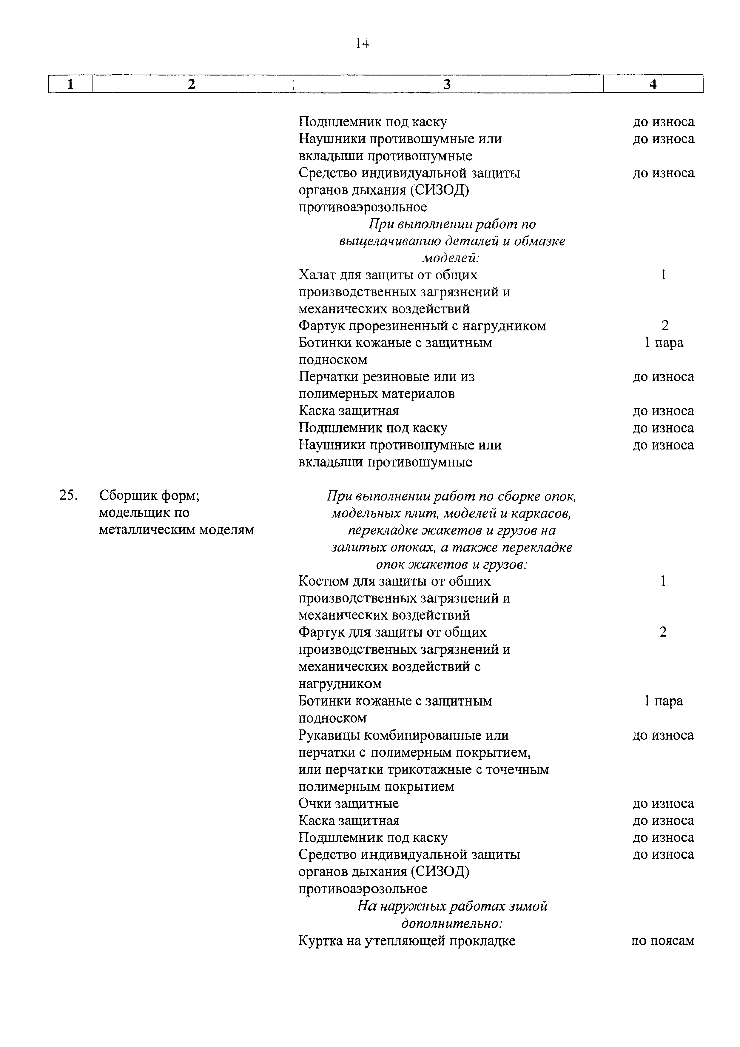 Типовые нормы бесплатной выдачи специальной одежды, специальной обуви и других средств индивидуальной защиты работникам машиностроительных и металлообрабатывающих производств, занятым на работах с вредными и (или) опасными условиями труда, а также на работах, выполняемых в особых температурных условиях или связанных с загрязнением| Статус: | действует | | Название рус.: | Типовые нормы бесплатной выдачи специальной одежды, специальной обуви и других средств индивидуальной защиты работникам машиностроительных и металлообрабатывающих производств, занятым на работах с вредными и (или) опасными условиями труда, а также на работах, выполняемых в особых температурных условиях или связанных с загрязнением | | Дата добавления в базу: | 01.09.2013 | | Дата актуализации: | 01.01.2021 | | Оглавление: | 1. Чугунолитейное производство и литье цветных металлов 2. Производства порошковой металлургии 3. Производство электродов и флюсов 4. Кузнечно-прессовые и термические работы 5. Сварочные работы 6. Работы по металлопокрытиям и окраске 7. Механическая обработка металлов; слесарные и слесарно-сборочные работы 8. Производство подшипников 9. Кузовное производство 10. Работы по производству и восстановлению напильников 11. Абразивное производство 12. Производство сверхтвердых материалов и инструмента из них 13. Производство шлифовальной шкурки 14. Разборка, ремонт, сборка и испытание тягачей, автомобилей и тракторов 15. Испытание двигателей и силовых установок 16. Производство мягких баков 17. Производство мипоры 18. Котельные работы и работы по металлическим конструкциям 19. Производство грузовых автомобилей 19.1 Сварка и сборка кабин 19.2. Сварка и сборка цельнометаллических кузовов 19.3. Сборка узлов 19.4. Сборка грузовых автомобилей 19.5. Подсборка узлов и агрегатов 20. Производство легковых автомобилей 20.1. Сборка-сварка кузовов 20.2. Сборка легковых автомобилей 21. Производство автокомпонентов 22. Агрегатное производство 23. Производство спецтехники 23.1. Сборочные, сварочные, окрасочные работы 23.2. Сборка автомобилей и узлов 23.3. Тюнинг автомобилей 24. Инструментальное производство 25. Общие профессии машиностроительных и металлообрабатывающих производств Примечания к типовым нормам | | Утверждён: | 14.12.2010 Минздравсоцразвития России (1104н)