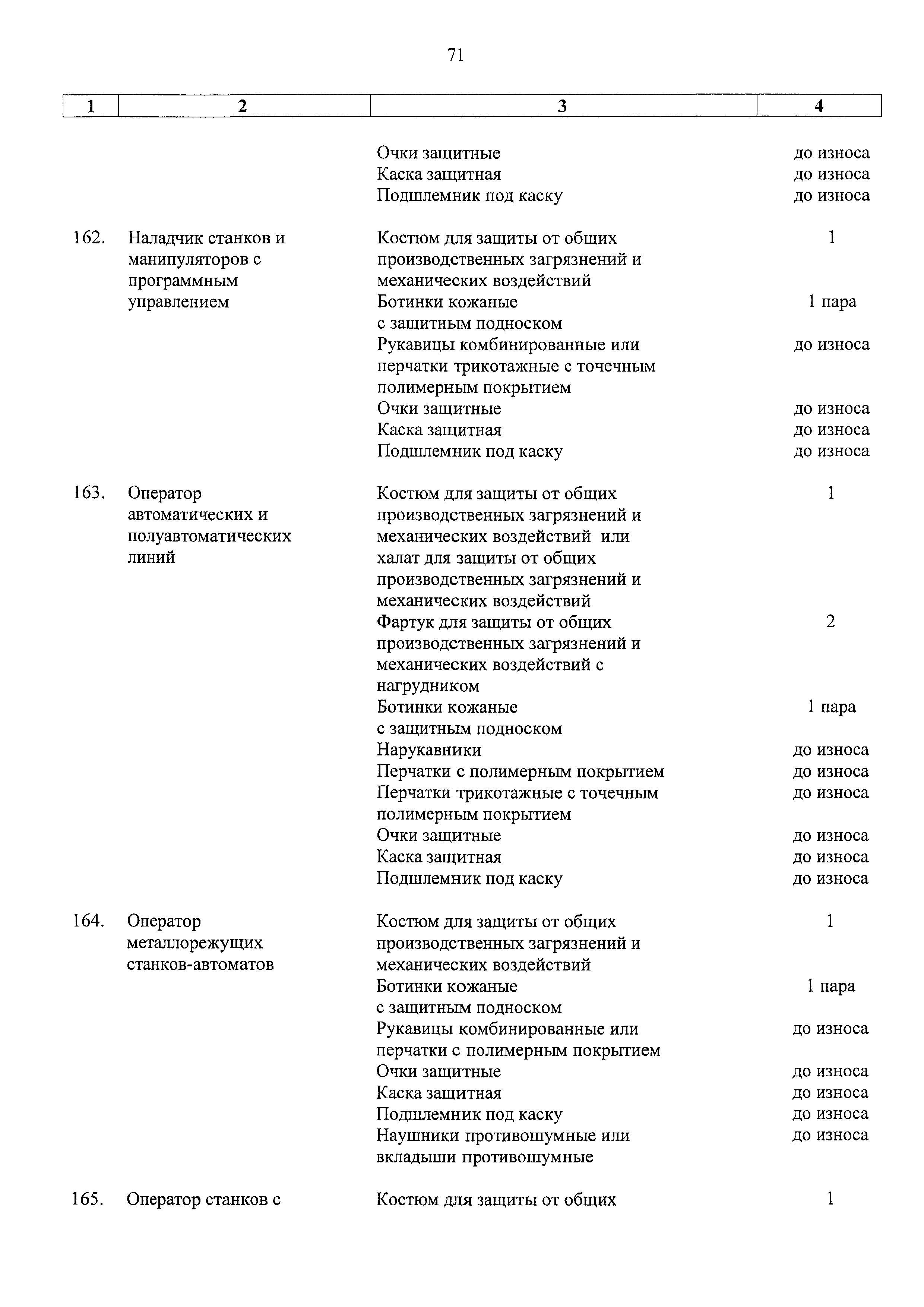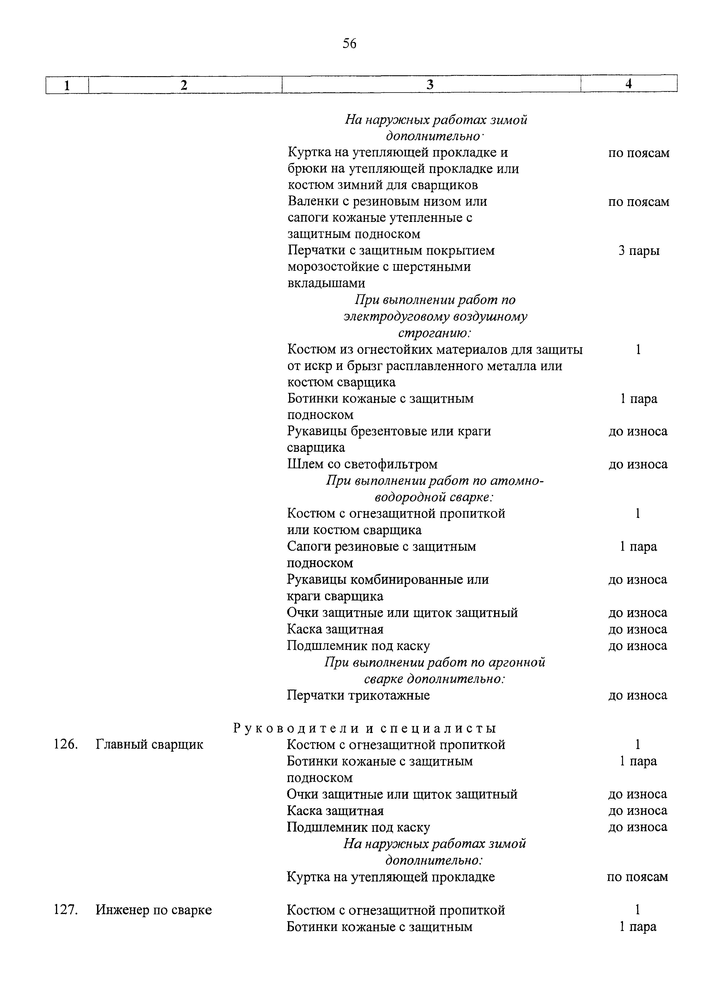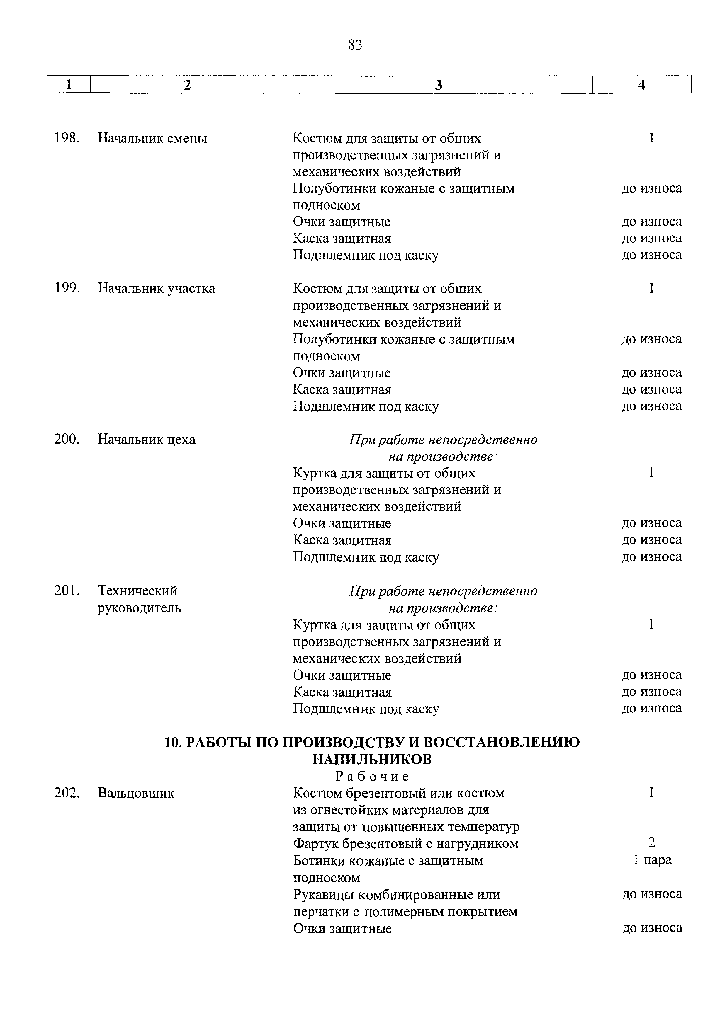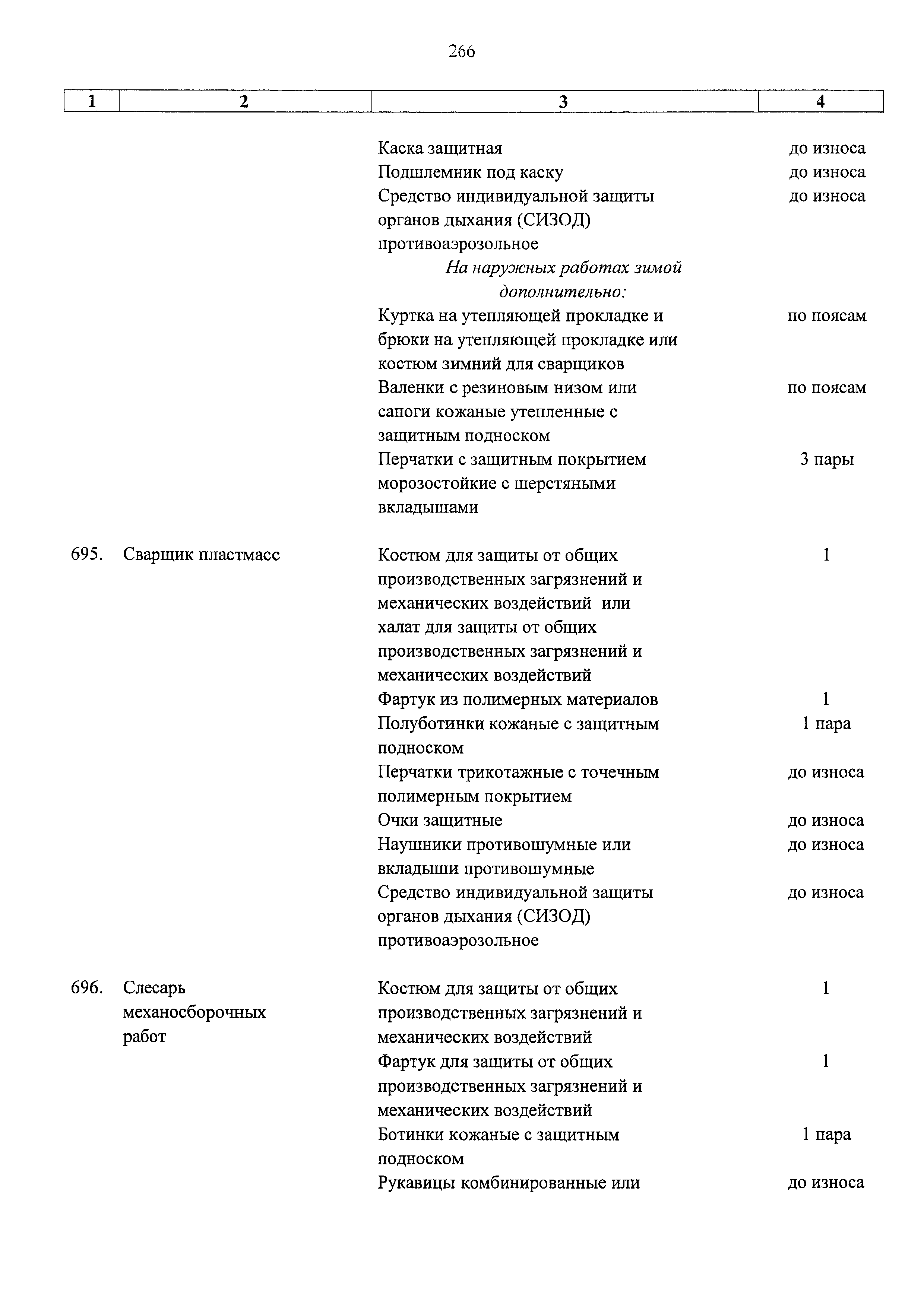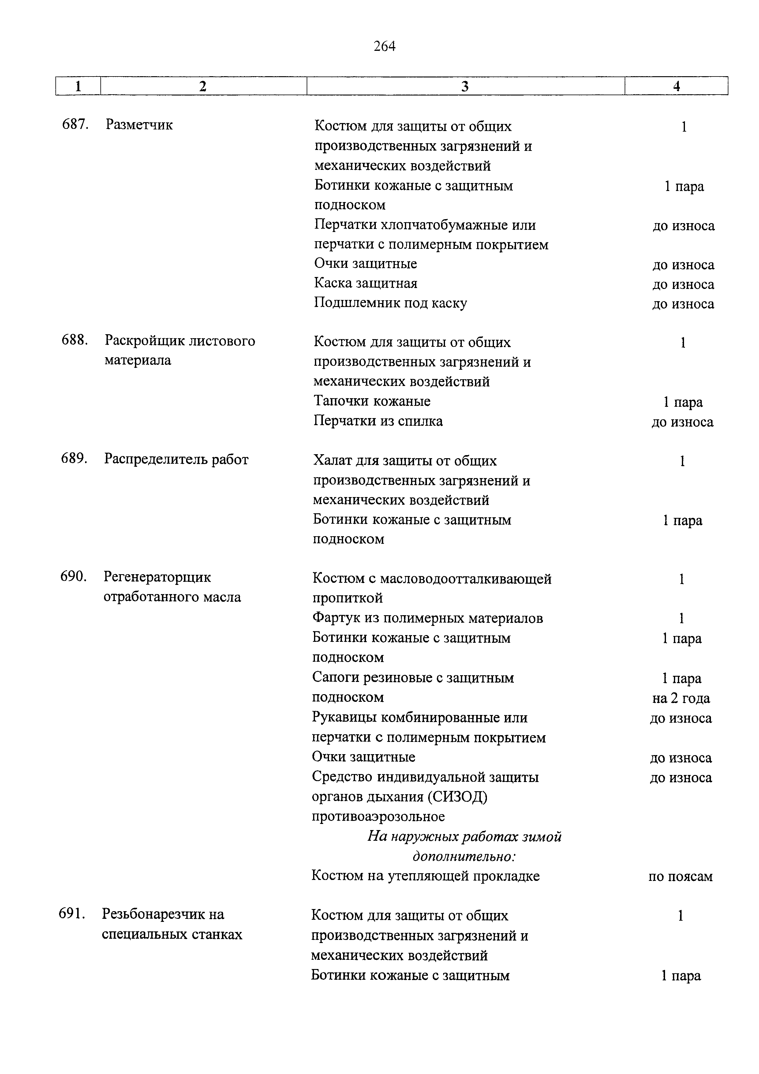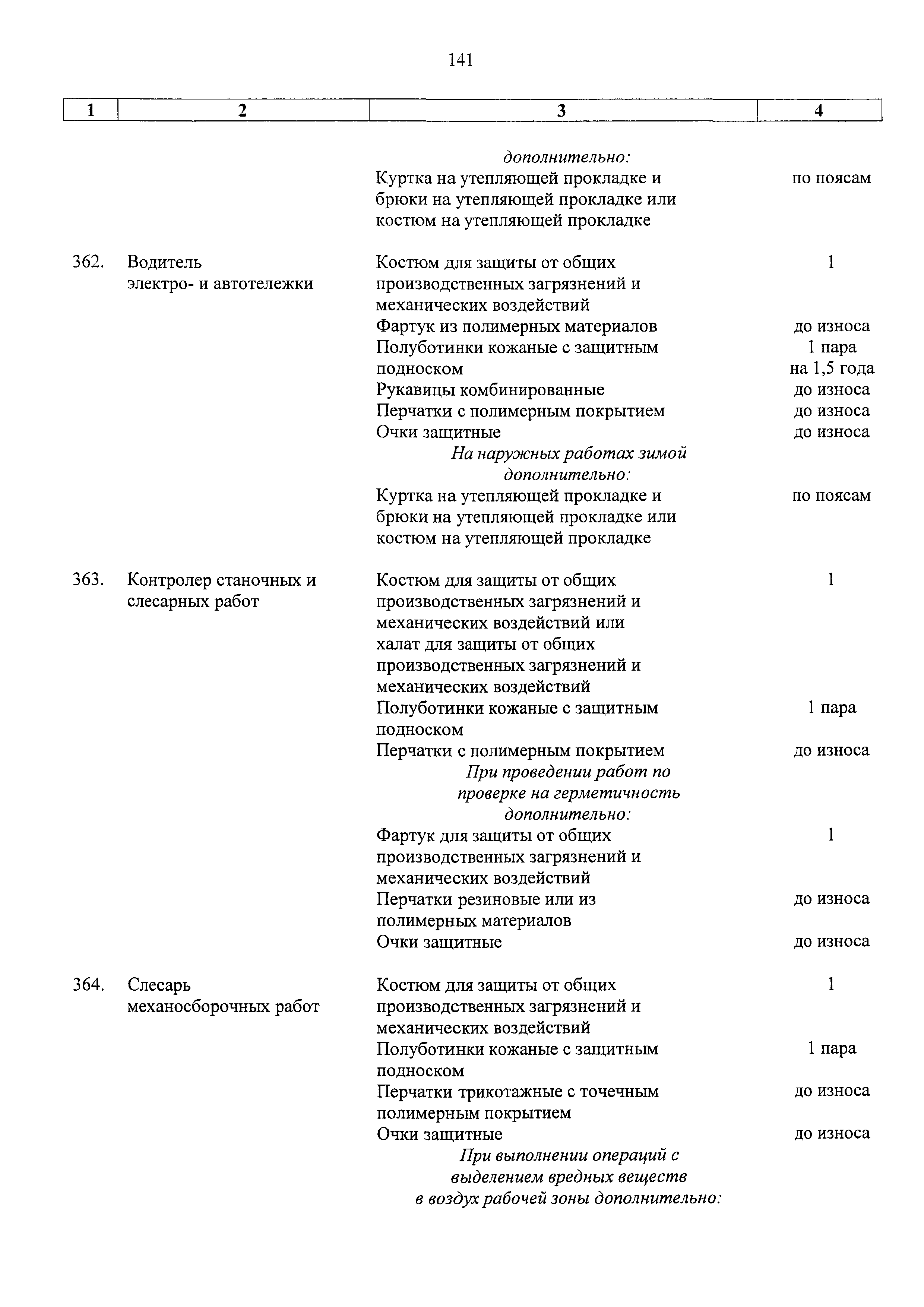 Типовые нормы бесплатной выдачи специальной одежды, специальной обуви и других средств индивидуальной защиты работникам машиностроительных и металлообрабатывающих производств, занятым на работах с вредными и (или) опасными условиями труда, а также на работах, выполняемых в особых температурных условиях или связанных с загрязнением| Статус: | действует | | Название рус.: | Типовые нормы бесплатной выдачи специальной одежды, специальной обуви и других средств индивидуальной защиты работникам машиностроительных и металлообрабатывающих производств, занятым на работах с вредными и (или) опасными условиями труда, а также на работах, выполняемых в особых температурных условиях или связанных с загрязнением | | Дата добавления в базу: | 01.09.2013 | | Дата актуализации: | 01.01.2021 | | Оглавление: | 1. Чугунолитейное производство и литье цветных металлов 2. Производства порошковой металлургии 3. Производство электродов и флюсов 4. Кузнечно-прессовые и термические работы 5. Сварочные работы 6. Работы по металлопокрытиям и окраске 7. Механическая обработка металлов; слесарные и слесарно-сборочные работы 8. Производство подшипников 9. Кузовное производство 10. Работы по производству и восстановлению напильников 11. Абразивное производство 12. Производство сверхтвердых материалов и инструмента из них 13. Производство шлифовальной шкурки 14. Разборка, ремонт, сборка и испытание тягачей, автомобилей и тракторов 15. Испытание двигателей и силовых установок 16. Производство мягких баков 17. Производство мипоры 18. Котельные работы и работы по металлическим конструкциям 19. Производство грузовых автомобилей 19.1 Сварка и сборка кабин 19.2. Сварка и сборка цельнометаллических кузовов 19.3. Сборка узлов 19.4. Сборка грузовых автомобилей 19.5. Подсборка узлов и агрегатов 20. Производство легковых автомобилей 20.1. Сборка-сварка кузовов 20.2. Сборка легковых автомобилей 21. Производство автокомпонентов 22. Агрегатное производство 23. Производство спецтехники 23.1. Сборочные, сварочные, окрасочные работы 23.2. Сборка автомобилей и узлов 23.3. Тюнинг автомобилей 24. Инструментальное производство 25. Общие профессии машиностроительных и металлообрабатывающих производств Примечания к типовым нормам | | Утверждён: | 14.12.2010 Минздравсоцразвития России (1104н)