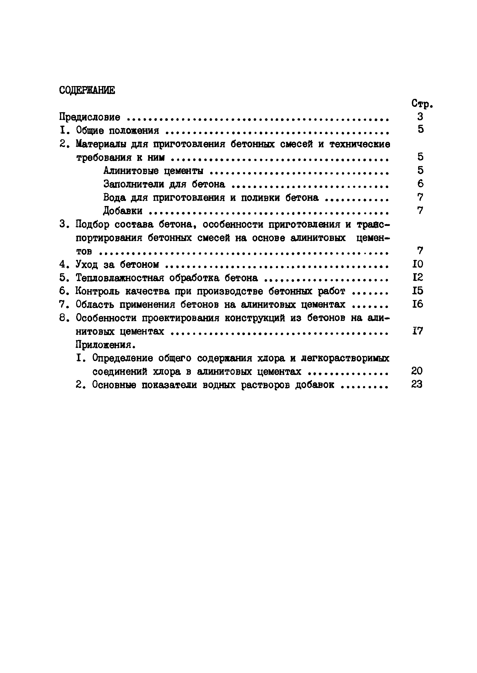 | Оглавление: | Предисловие 1. Общие положения 2. Материалы для приготовления бетонных смесей и технические требования к ними А.линитовые цементы Заполнители для бетона Вода для приготовления и поливки бетона Добавки 3. Подбор состава бетона, особенности приготовления и транспортирования бетонных смесей на основе алинитовых цементов 4. Уход за бетоном 5. Тепловлажностная обработка бетона 6. Контроль качества при производстве бетонных работ 7. Область применения бетонов на алинитовых цементах 8. Особенности проектирования конструкций из бетонов на алинитовых цементах Приложения: 1. Определение общего содержания хлора и легкорастворимых соединений хлора в алинитовых цементах 2. Основные показатели водных растворов добавок |