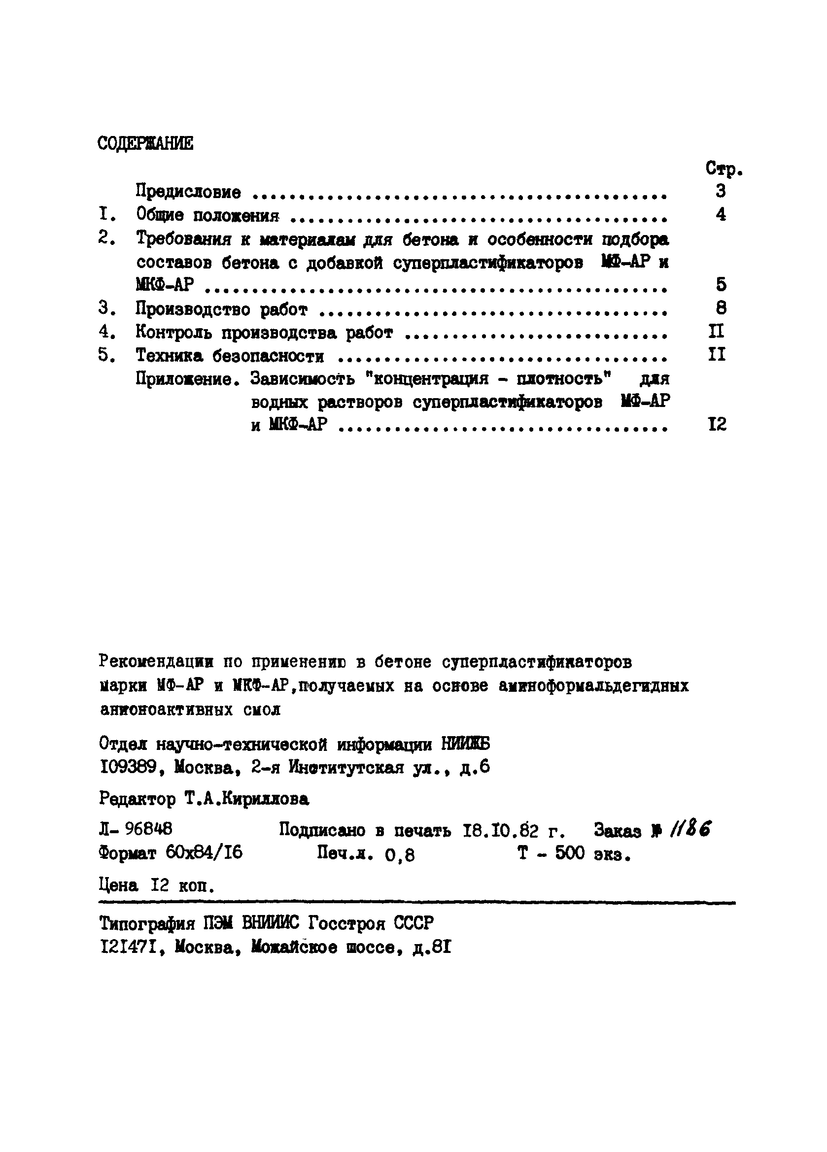 | Оглавление: | Предисловие 1. Общие положения 2. Требования к материалам для бетона и особенности подбора составов бетона с добавкой суперпластификаторов МФ-АР и МКФ-АР 3. Производство работ 4. Контроль производства работ 5. Техника безопасности Приложение. Зависимость "концентрация - плотность" для водных растворов суперпластификаторов МФ-АР и МКФ-АР |