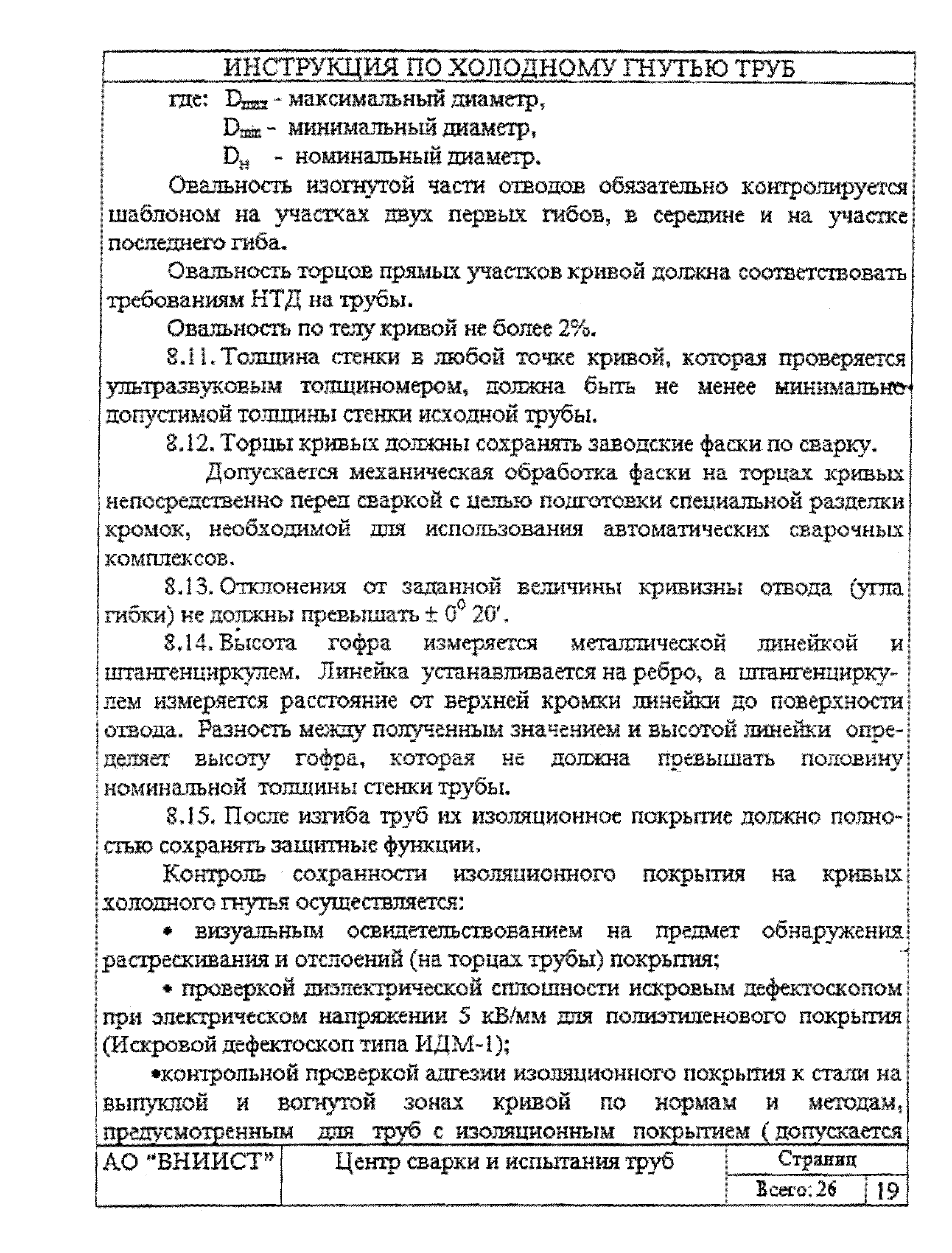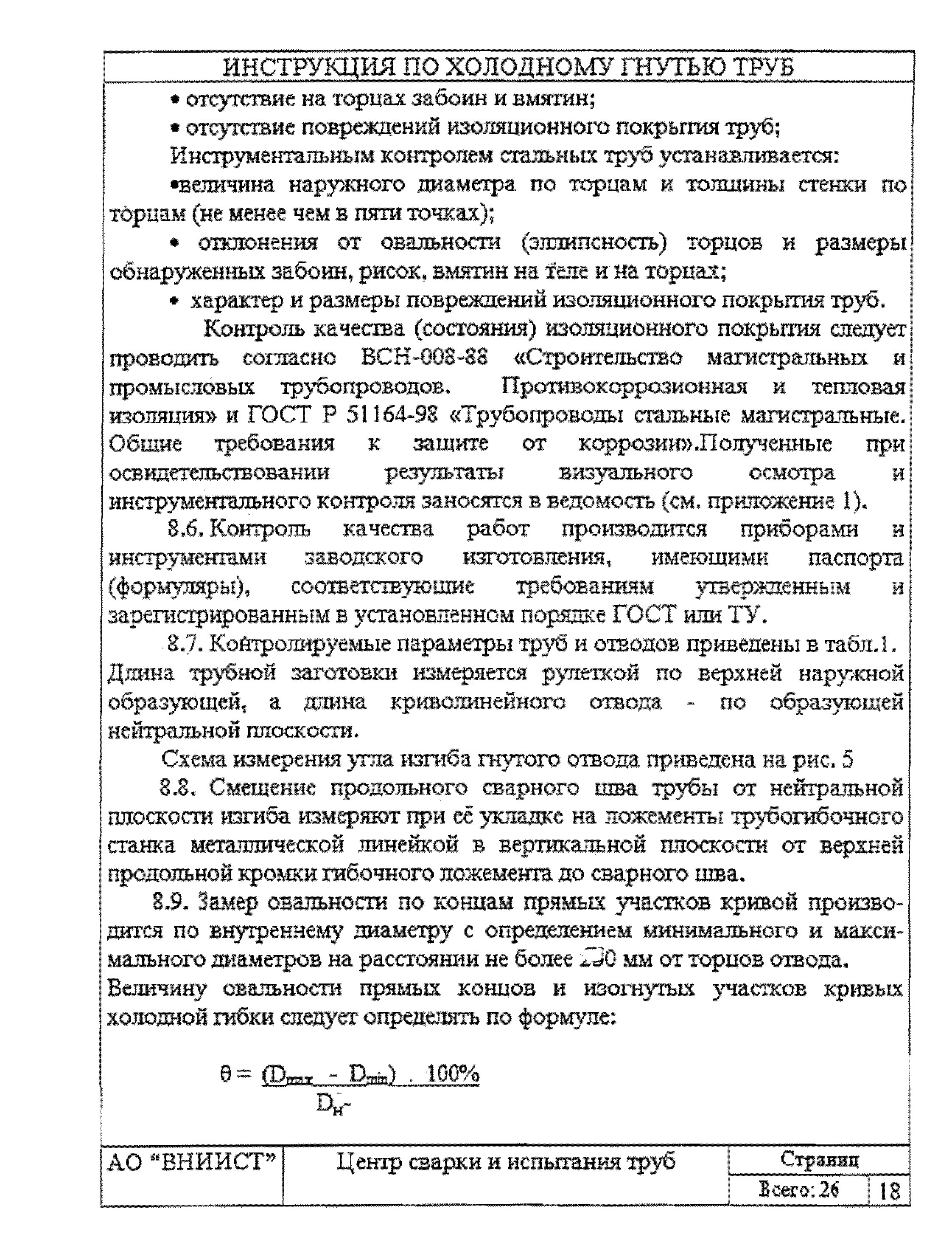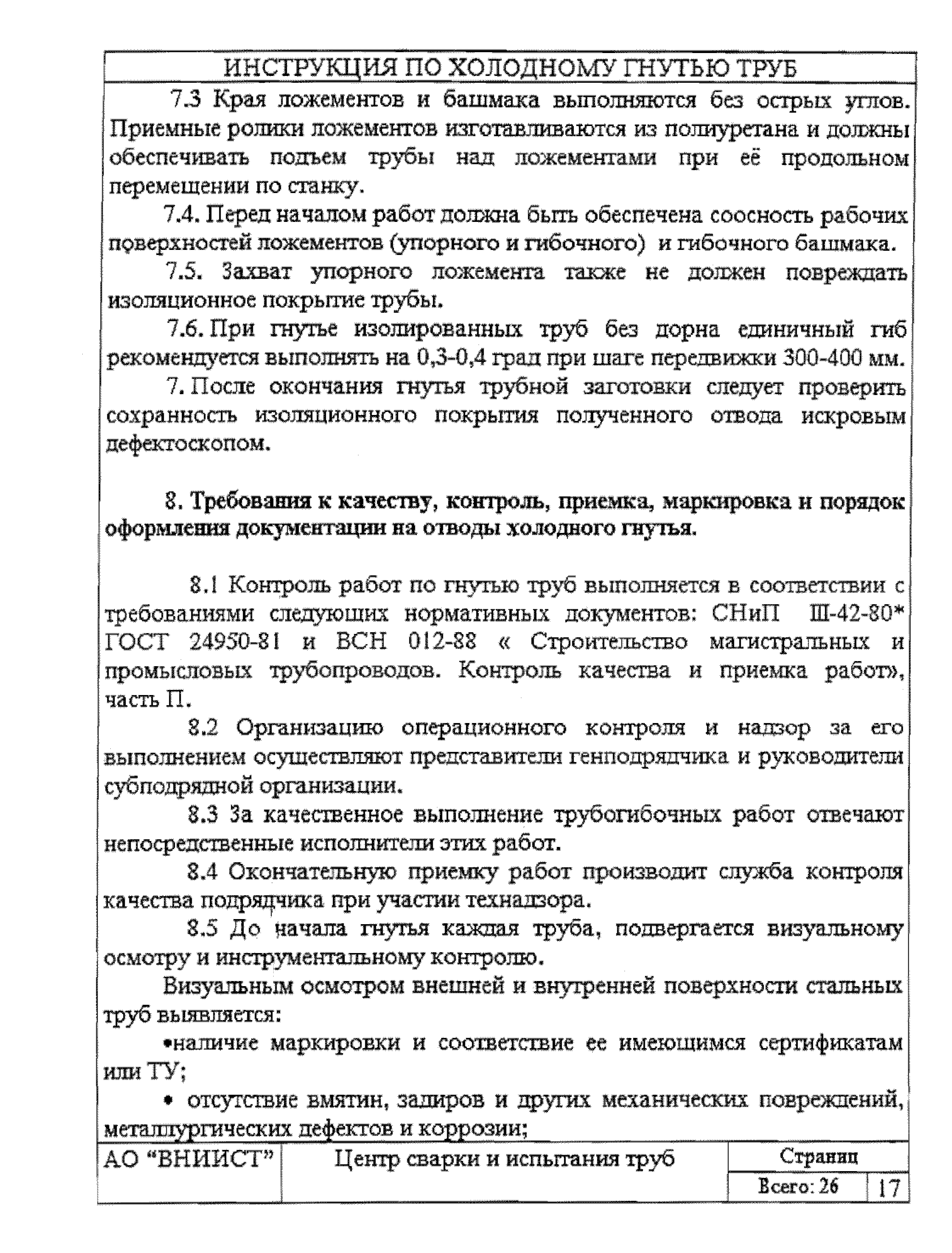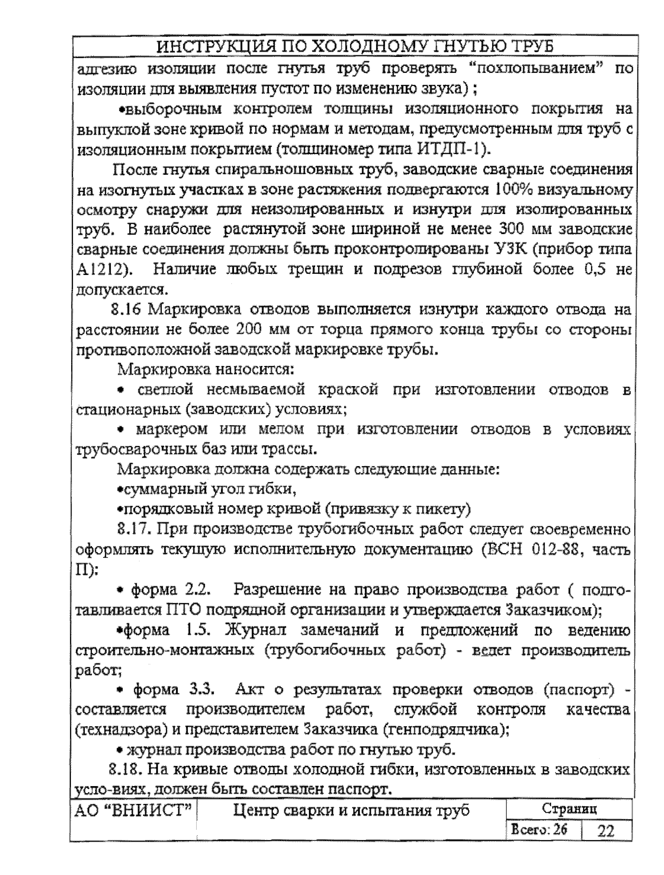 | Оглавление: | 1 Общие положения 2 Требования к трубам я изготовления гнутых отводов 3 Организация трубогибочных работ 4 Состав и устройство трубогибочного станка 5 Подготовка к работе и порядок производства трубогибочных работ 6 Особенности гнутья отводов из спиральношовных труб 7 Гнутье изолированных труб 8 Требования к качеству, контроль, приемка, маркировка и порядок оформления документации на отводы холодного гнутья 9 Машины, механизмы приспособления и инвентарь для производства трубогибочных работ 10 Техника безопасности при производстве трубогибочных работ Список литературы Приложение 1. Образец ведомости результатов освидетельствования труб и отводов Приложение 2. Форма заявки на изготовление отводов магистрального трубопровода Приложение 3. Паспорт на отвод магистрального трубопровода |