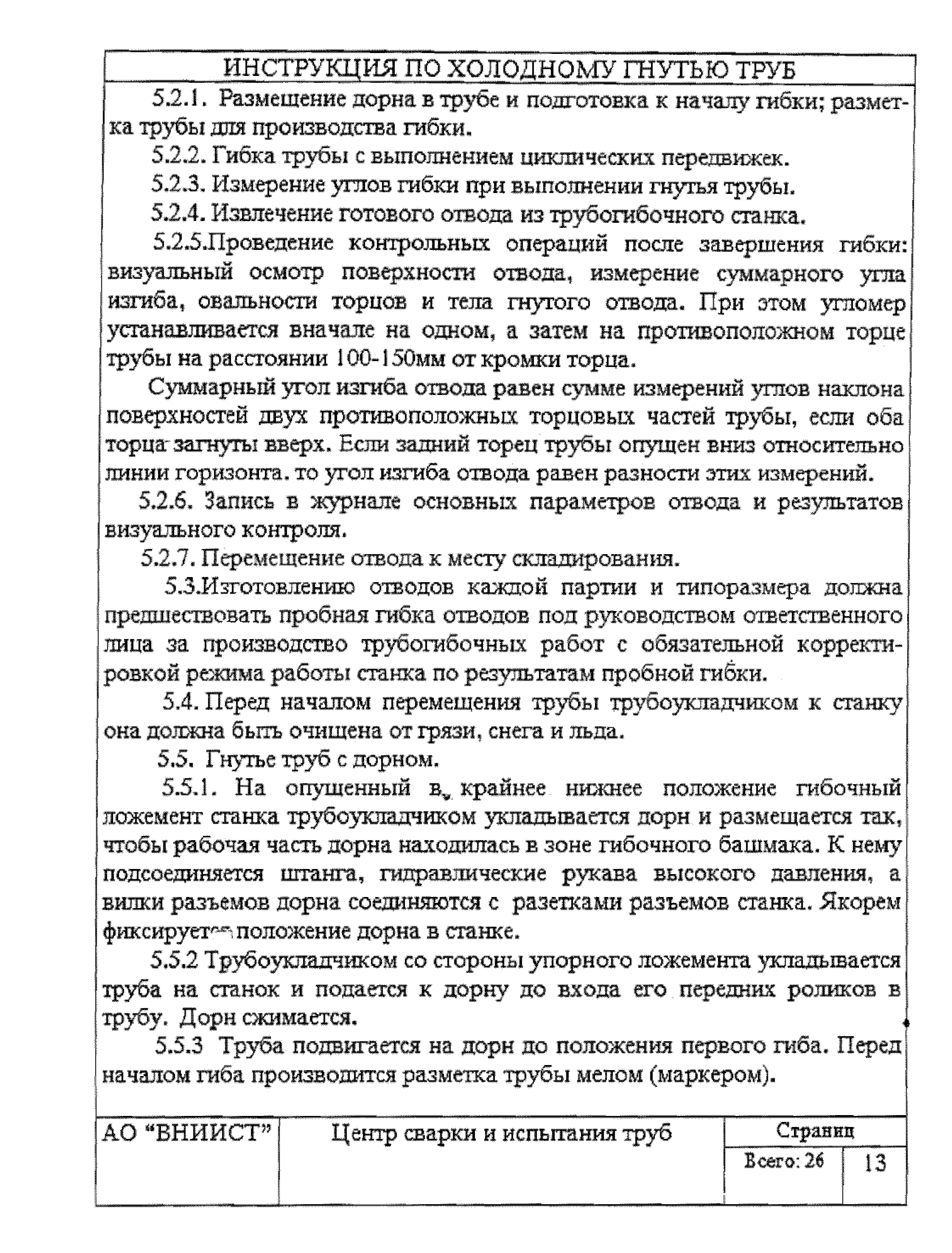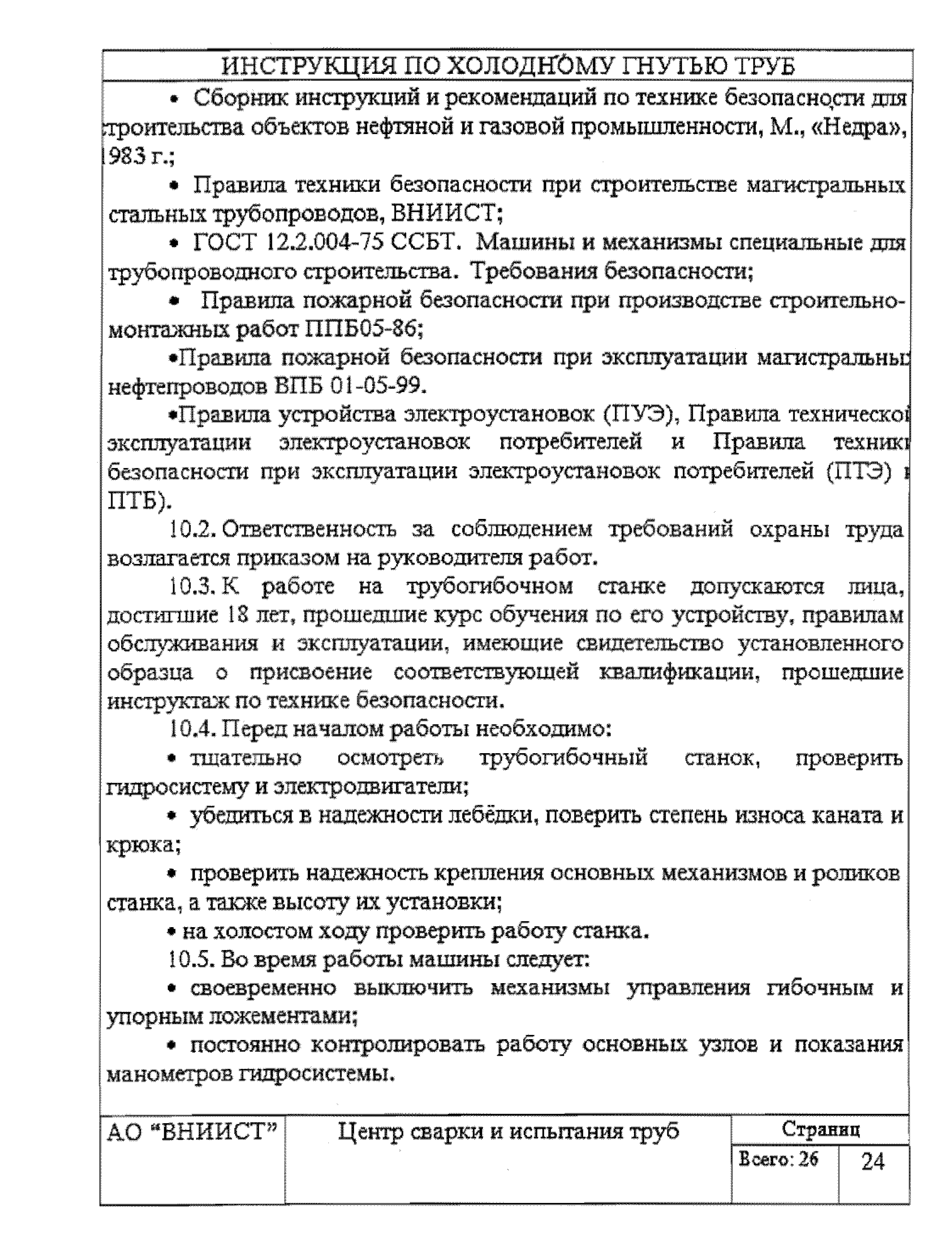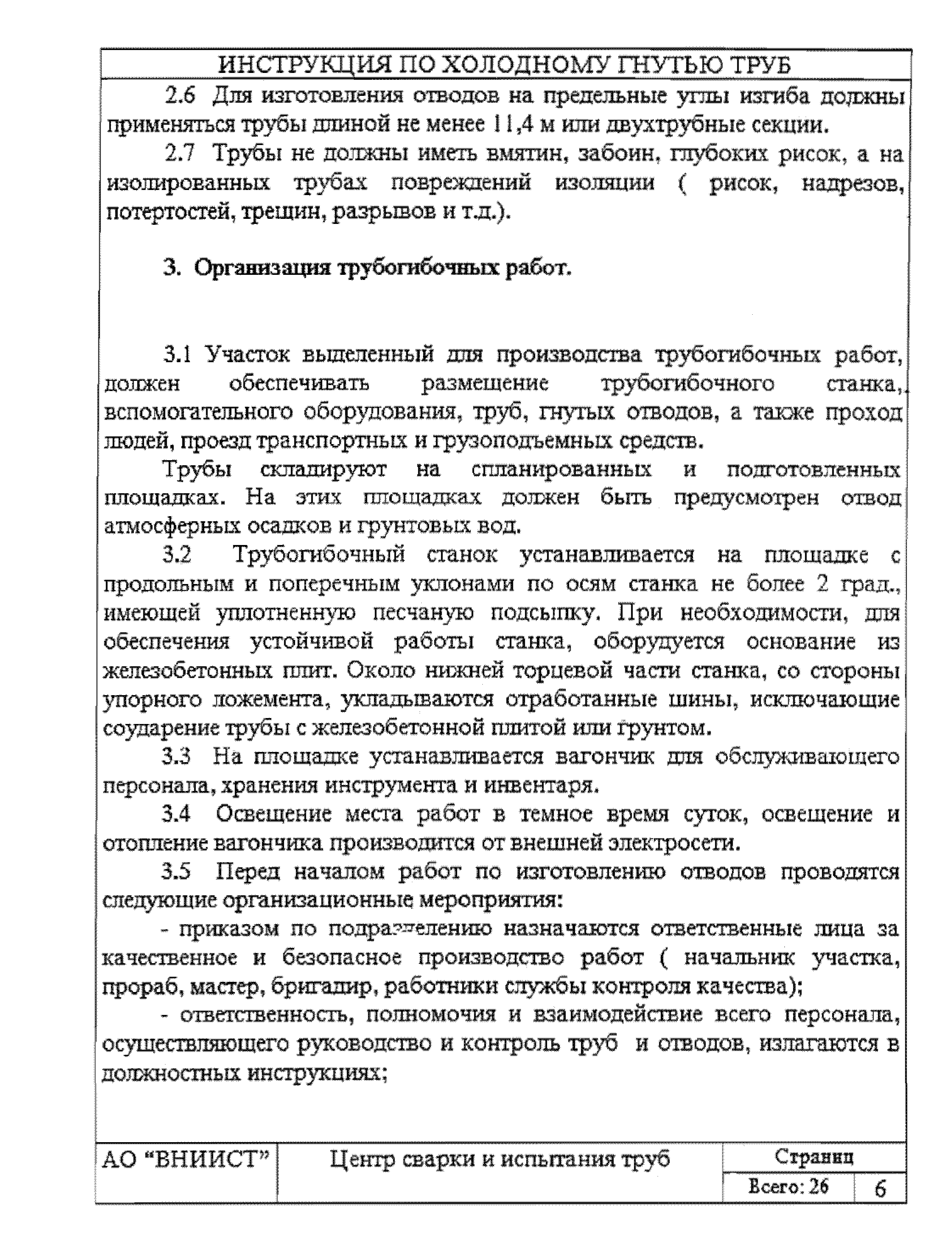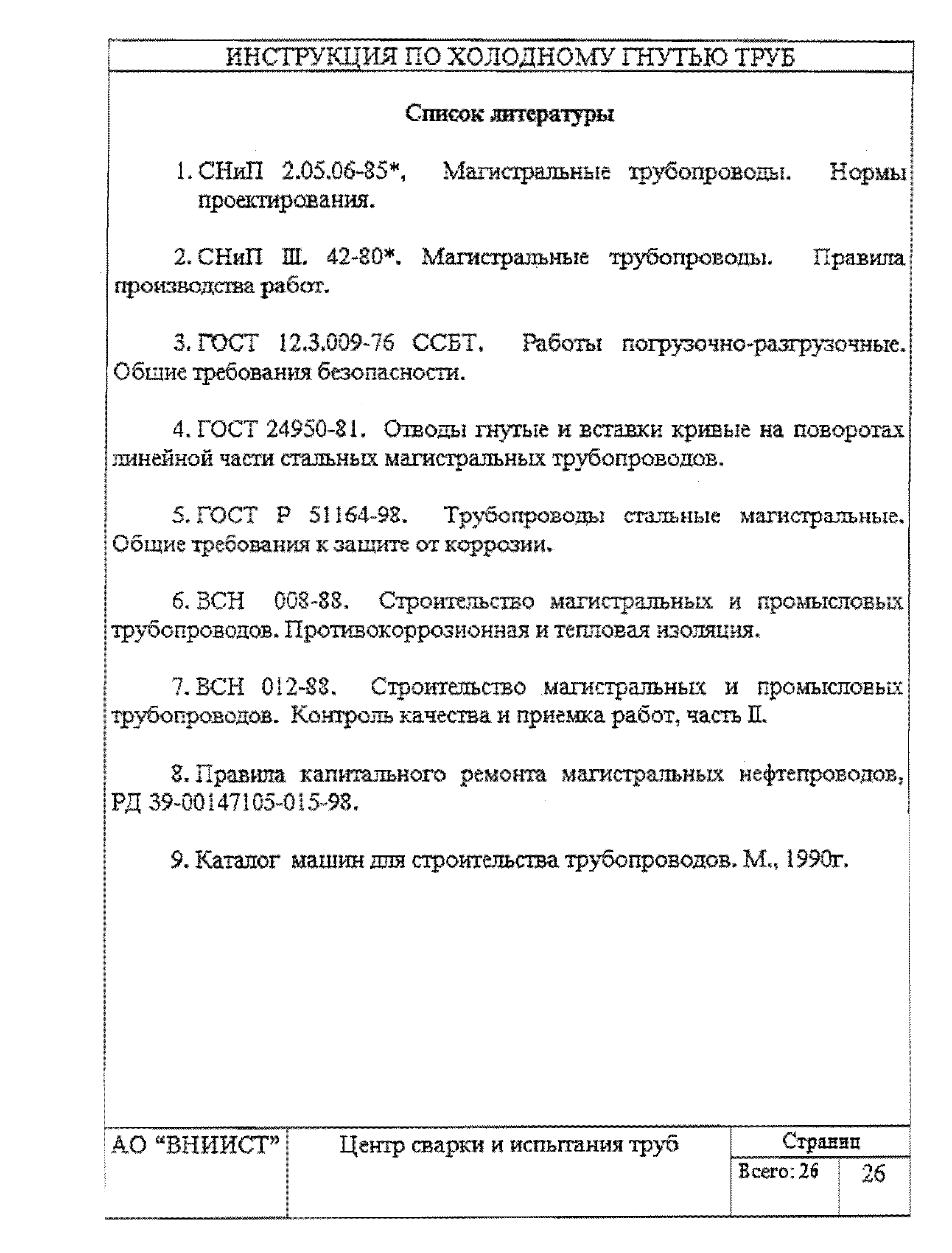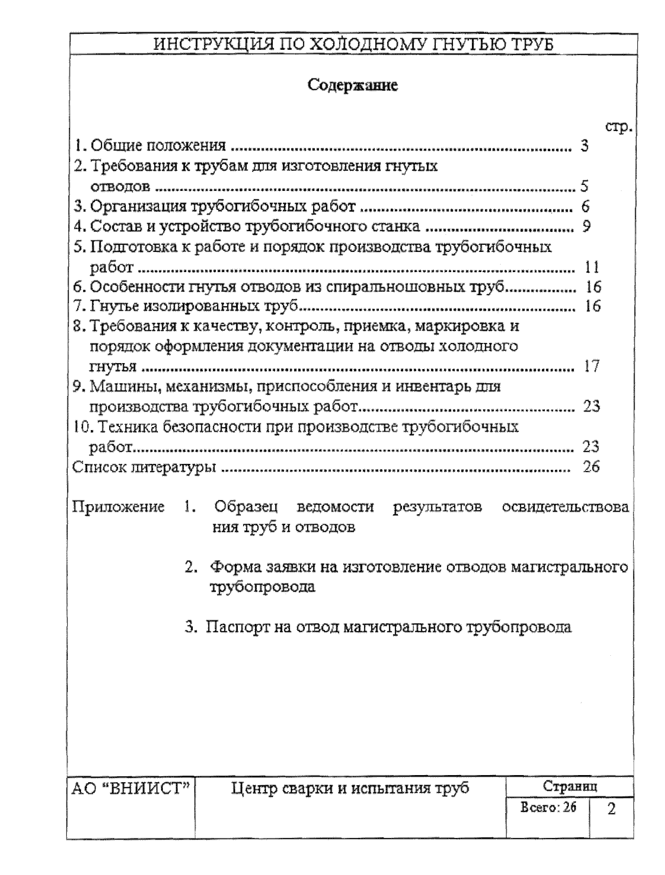 | Оглавление: | 1 Общие положения 2 Требования к трубам я изготовления гнутых отводов 3 Организация трубогибочных работ 4 Состав и устройство трубогибочного станка 5 Подготовка к работе и порядок производства трубогибочных работ 6 Особенности гнутья отводов из спиральношовных труб 7 Гнутье изолированных труб 8 Требования к качеству, контроль, приемка, маркировка и порядок оформления документации на отводы холодного гнутья 9 Машины, механизмы приспособления и инвентарь для производства трубогибочных работ 10 Техника безопасности при производстве трубогибочных работ Список литературы Приложение 1. Образец ведомости результатов освидетельствования труб и отводов Приложение 2. Форма заявки на изготовление отводов магистрального трубопровода Приложение 3. Паспорт на отвод магистрального трубопровода |