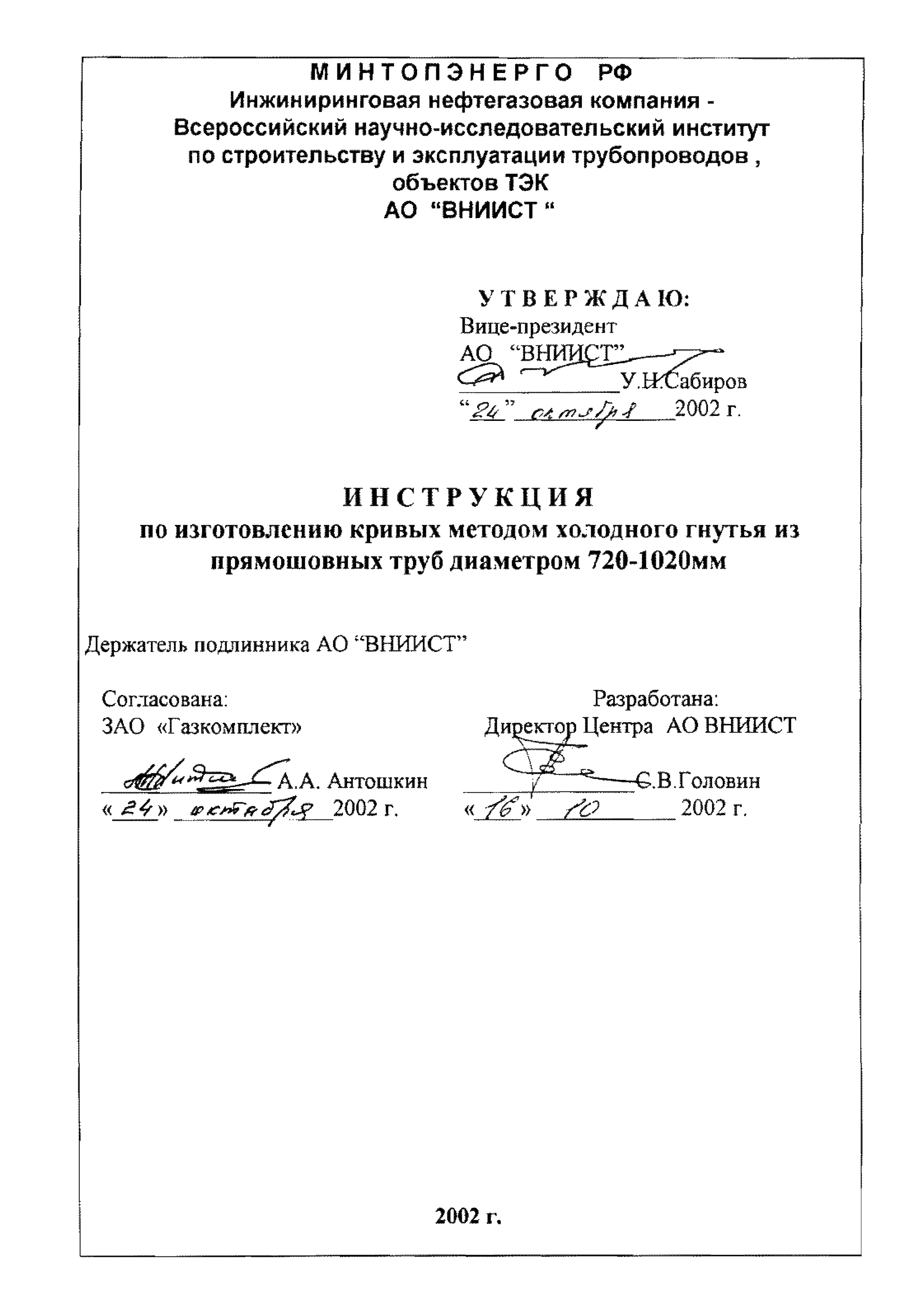 | Утверждён: | 24.10.2002 АО ВНИИСТ (VNIIST AO ) |