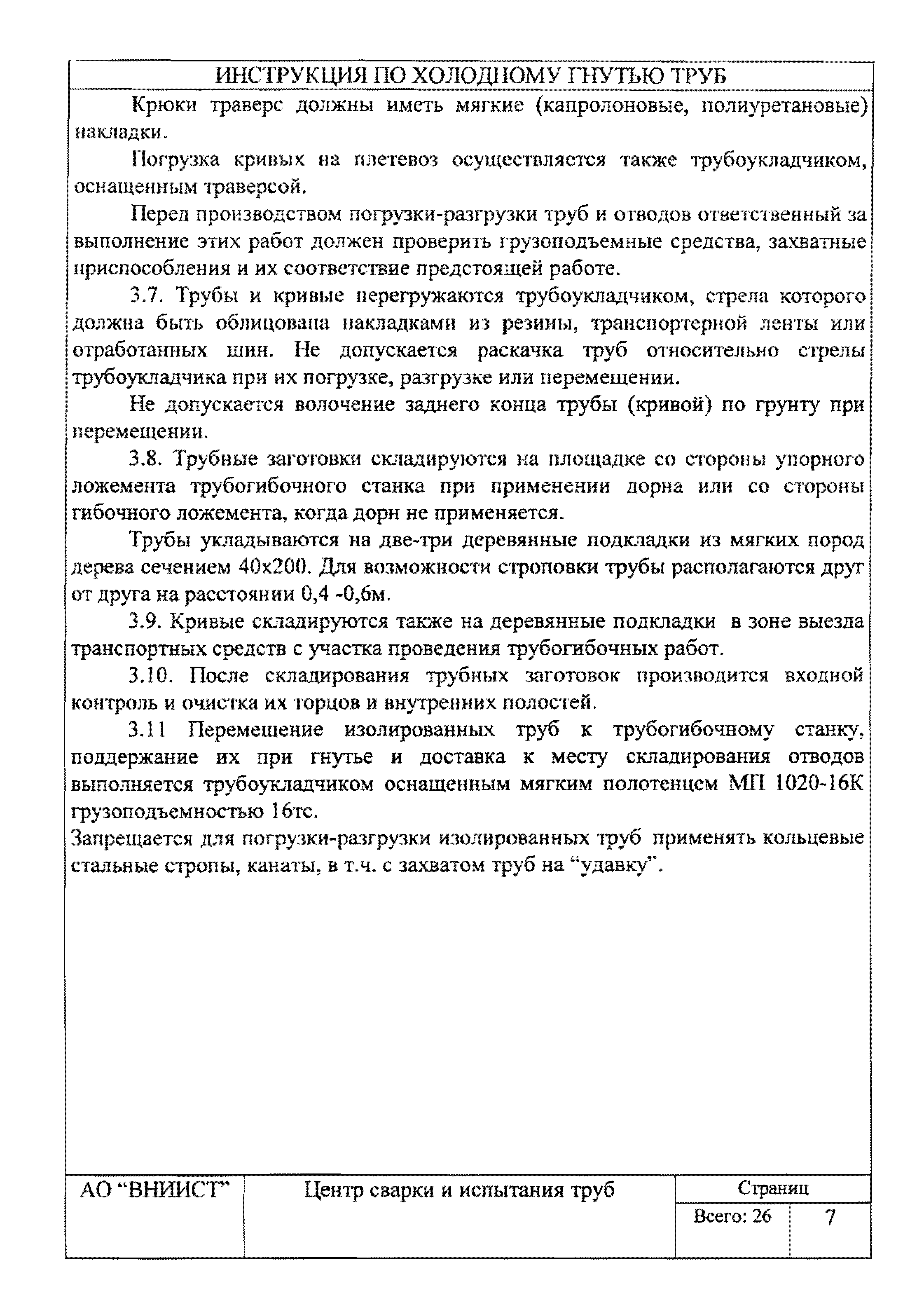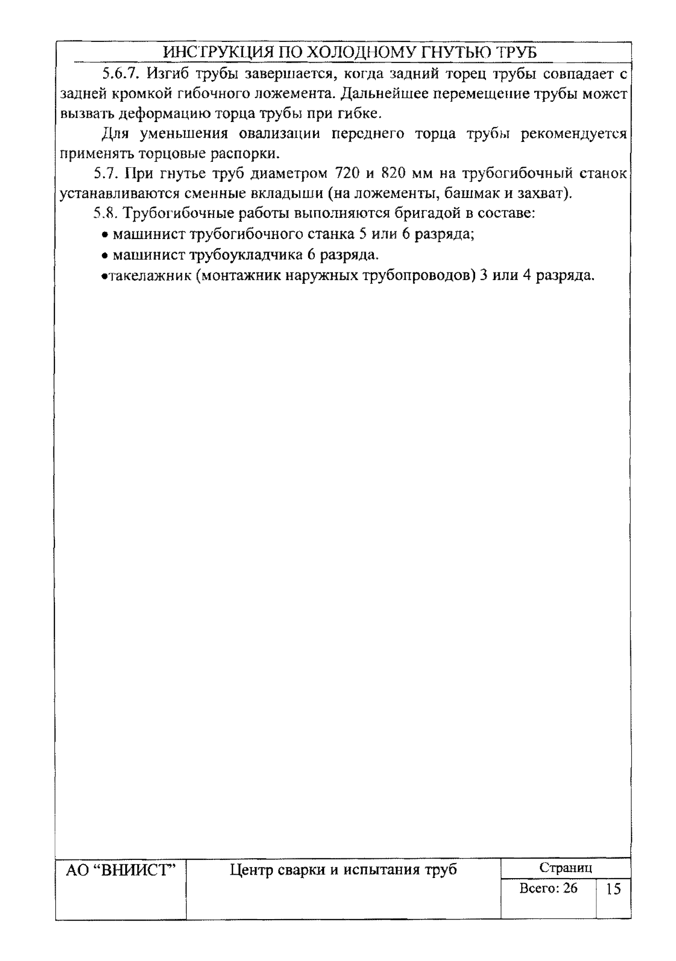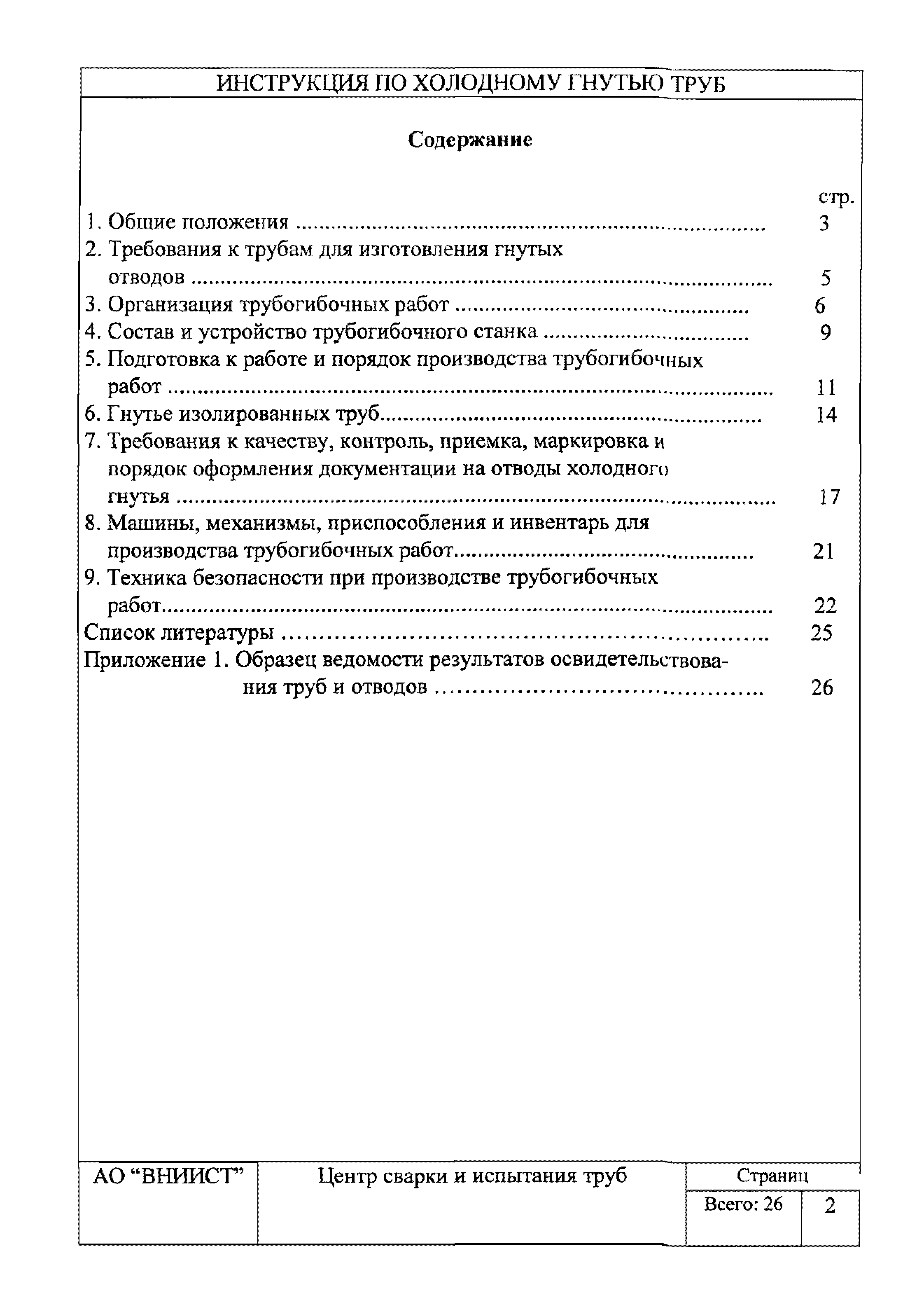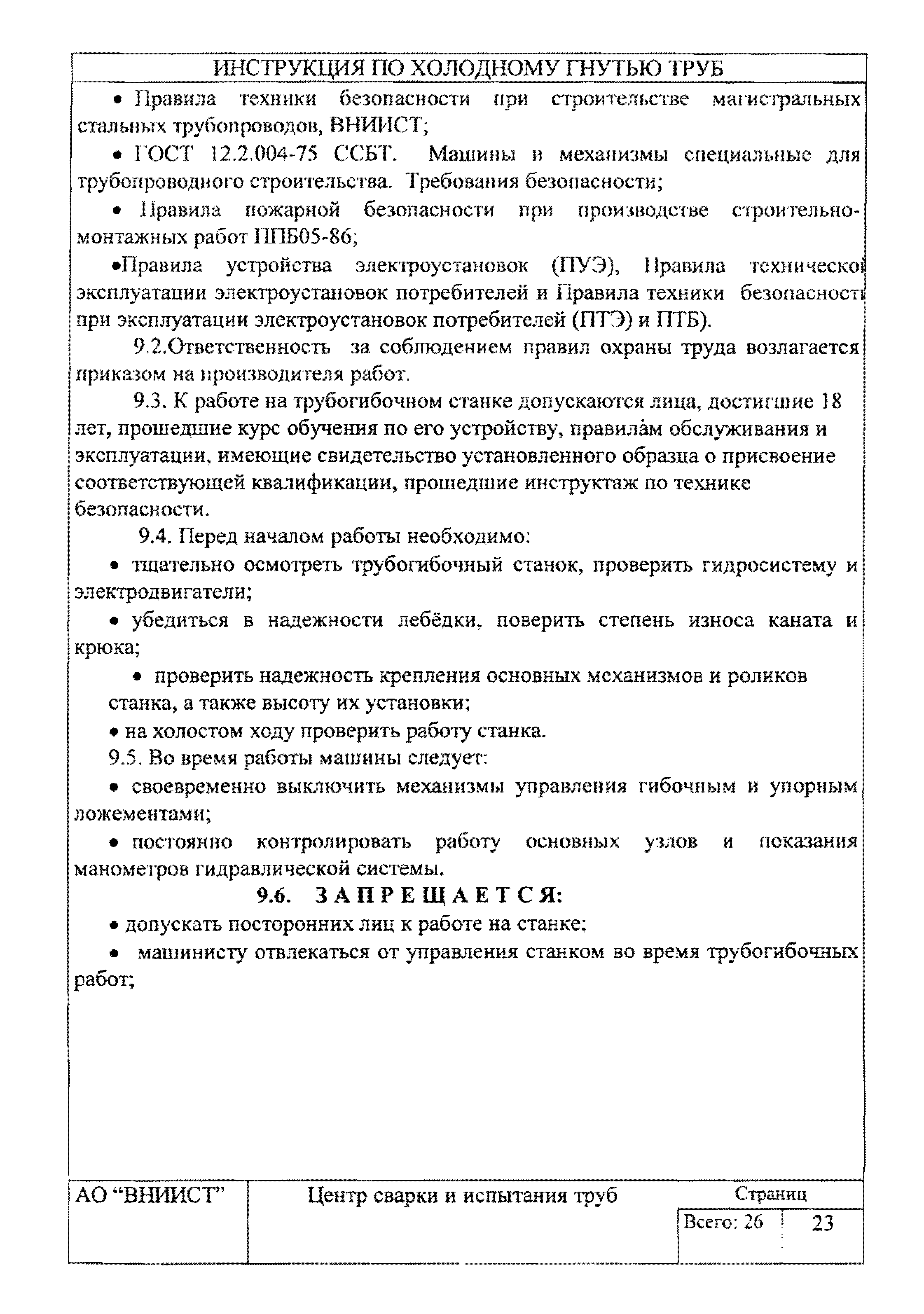 | Оглавление: | 1. Общие положения 2. Требования к трубам для изготовления гнутых отводов 3. Организация трубогибочных работ 4. Состав и устройство трубогибочного станка 5. Подготовка к работе и порядок производства трубогибочных работ 6. Гнутье изолированных труб 7. Требования к качеству, контроль, приемка, маркировка и порядок оформления документации на отводы холодного гнутья 8. Машины, механизмы, приспособления и инвентарь для производства трубогибочных работ 9. Техника безопасности при производстве трубогибочных работ Список литературы Приложение 1. Образец ведомости результатов освидетельствования труб и отводов |
