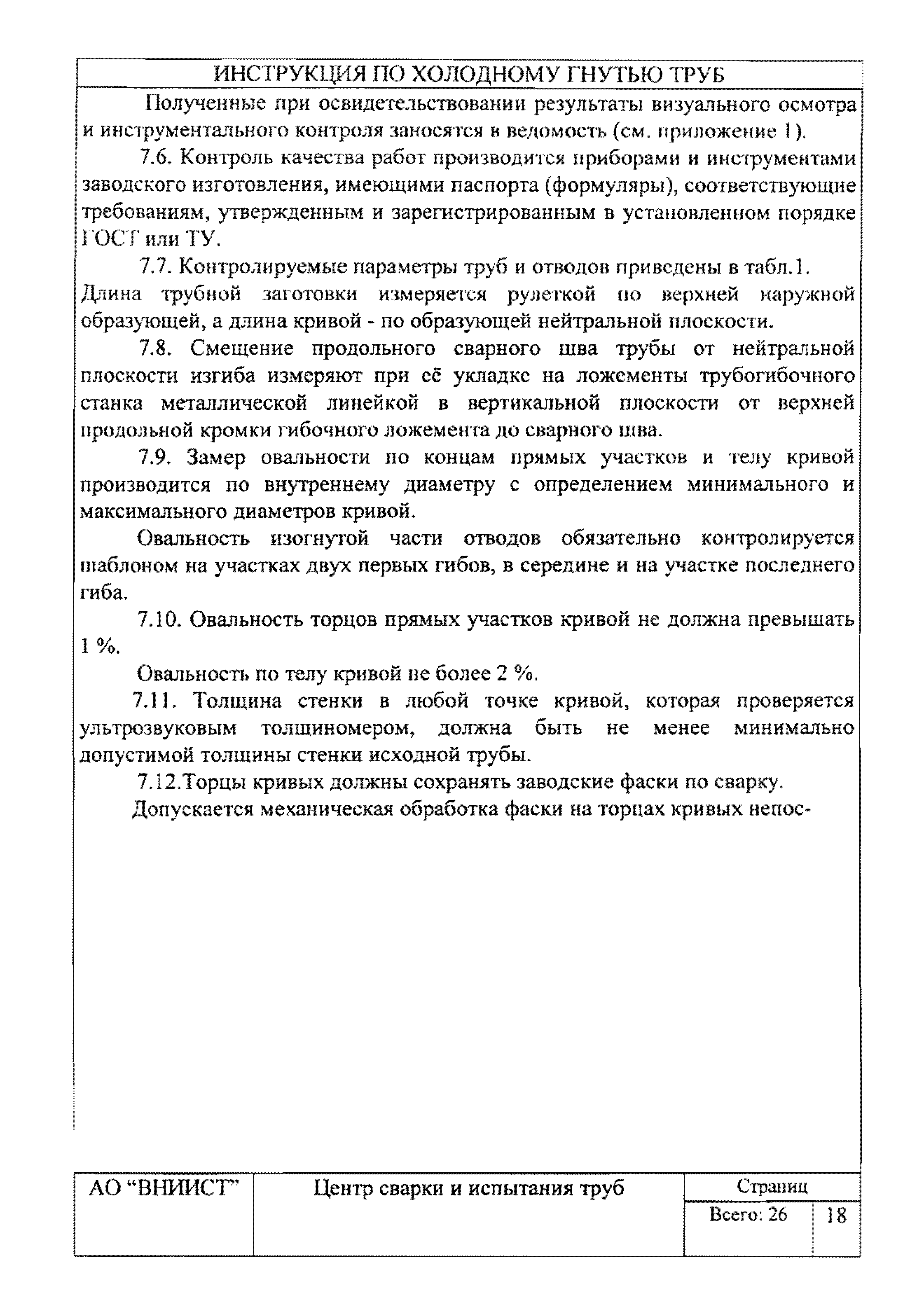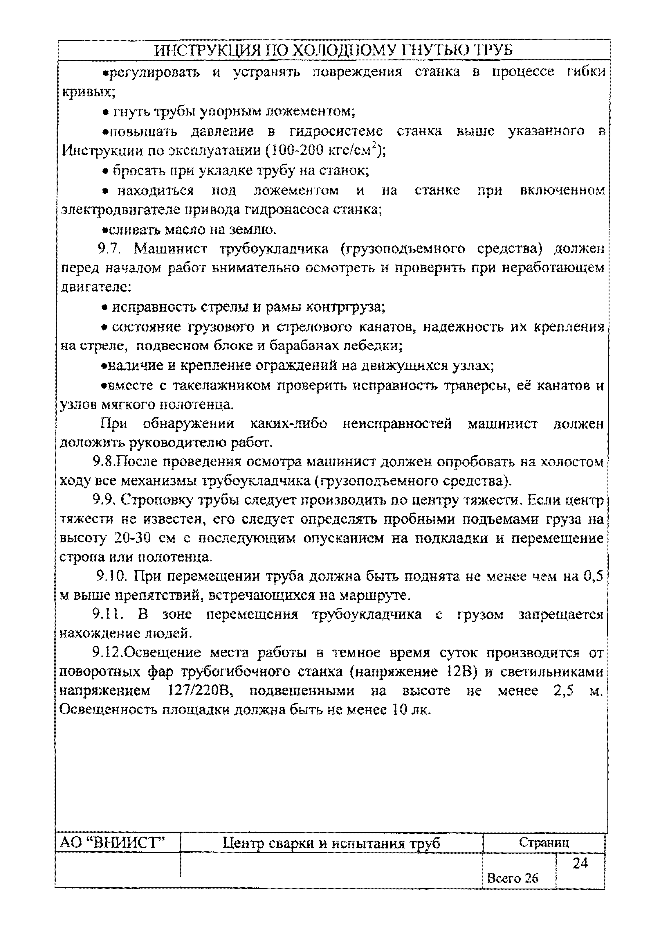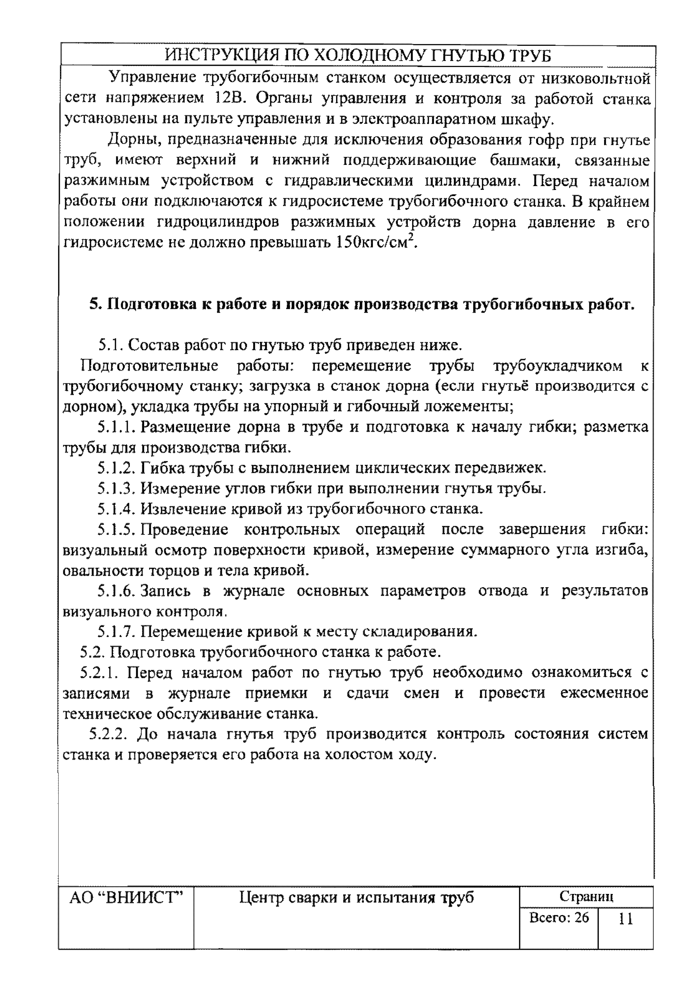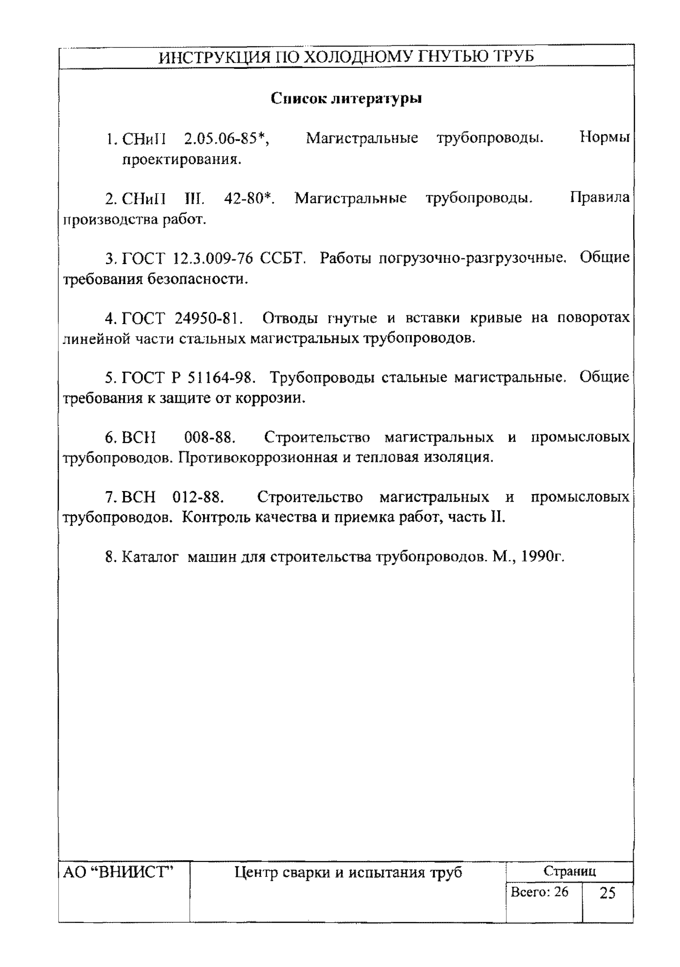 | Оглавление: | 1. Общие положения 2. Требования к трубам для изготовления гнутых отводов 3. Организация трубогибочных работ 4. Состав и устройство трубогибочного станка 5. Подготовка к работе и порядок производства трубогибочных работ 6. Гнутье изолированных труб 7. Требования к качеству, контроль, приемка, маркировка и порядок оформления документации на отводы холодного гнутья 8. Машины, механизмы, приспособления и инвентарь для производства трубогибочных работ 9. Техника безопасности при производстве трубогибочных работ Список литературы Приложение 1. Образец ведомости результатов освидетельствования труб и отводов |