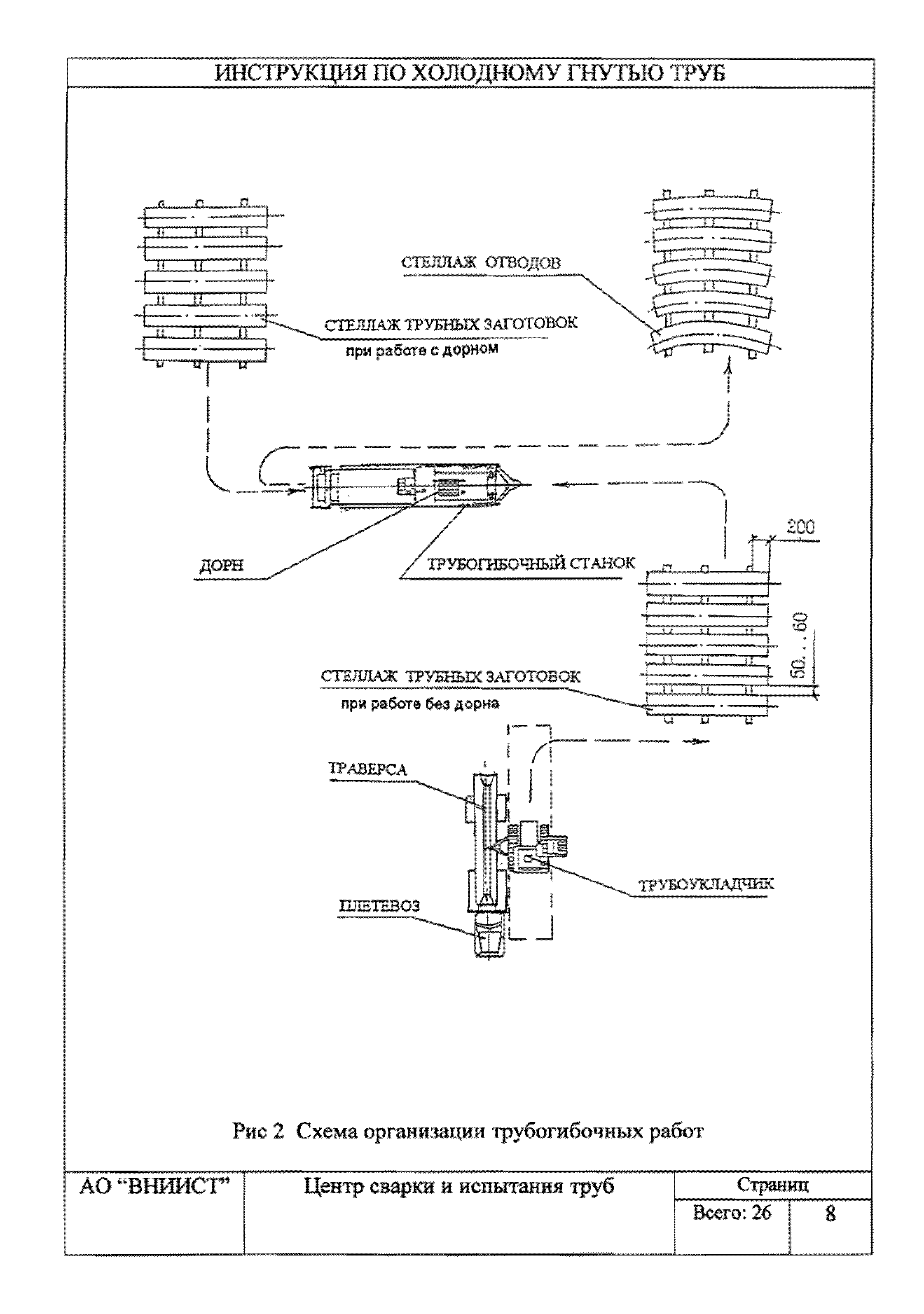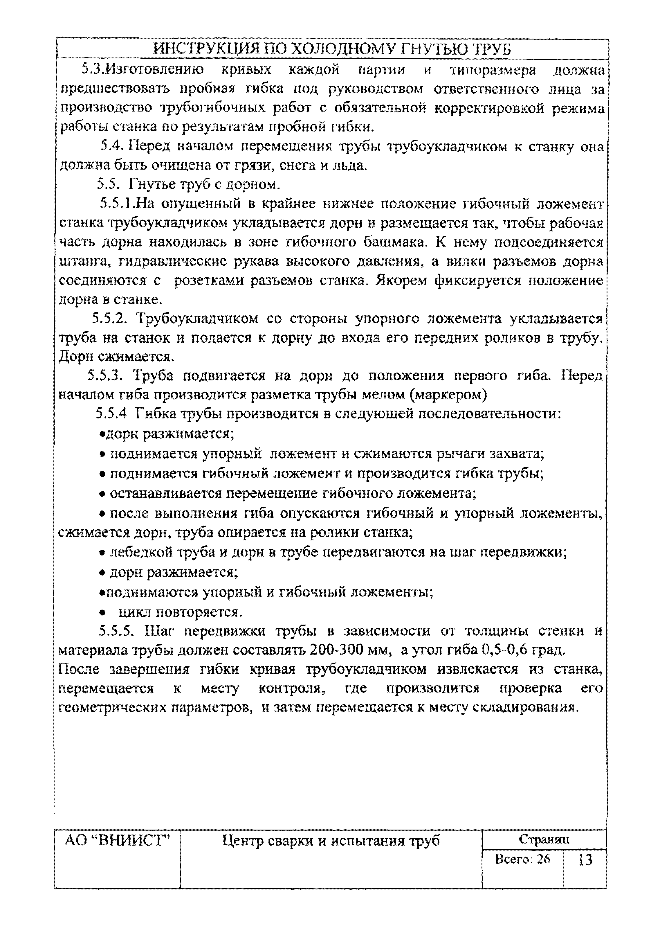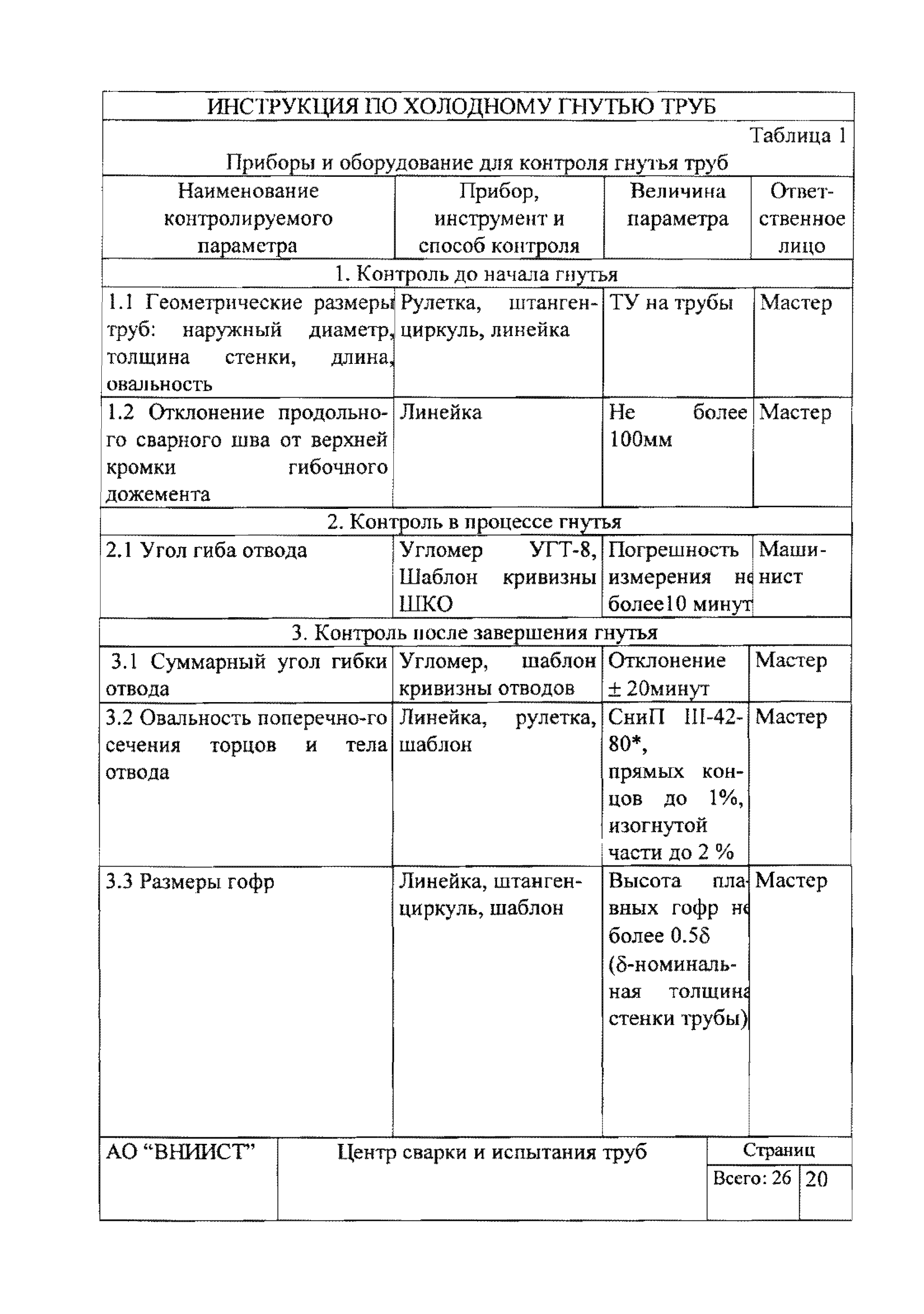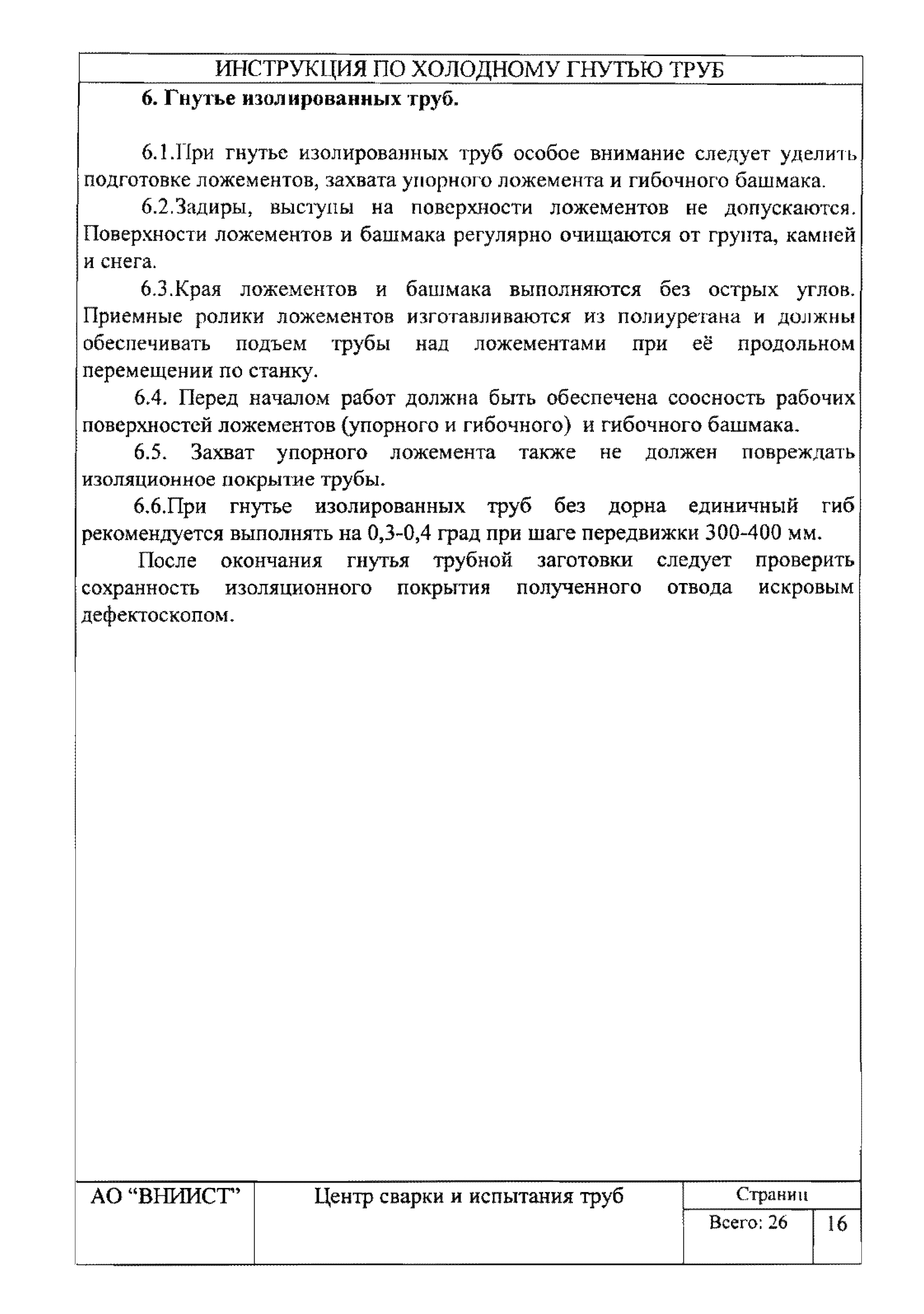 | Оглавление: | 1. Общие положения 2. Требования к трубам для изготовления гнутых отводов 3. Организация трубогибочных работ 4. Состав и устройство трубогибочного станка 5. Подготовка к работе и порядок производства трубогибочных работ 6. Гнутье изолированных труб 7. Требования к качеству, контроль, приемка, маркировка и порядок оформления документации на отводы холодного гнутья 8. Машины, механизмы, приспособления и инвентарь для производства трубогибочных работ 9. Техника безопасности при производстве трубогибочных работ Список литературы Приложение 1. Образец ведомости результатов освидетельствования труб и отводов |