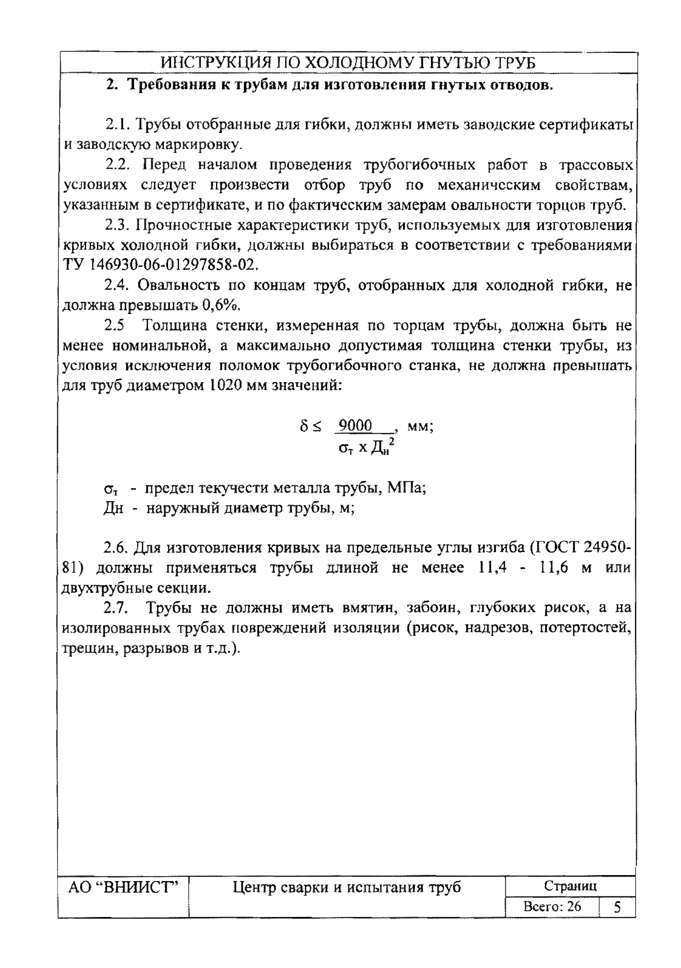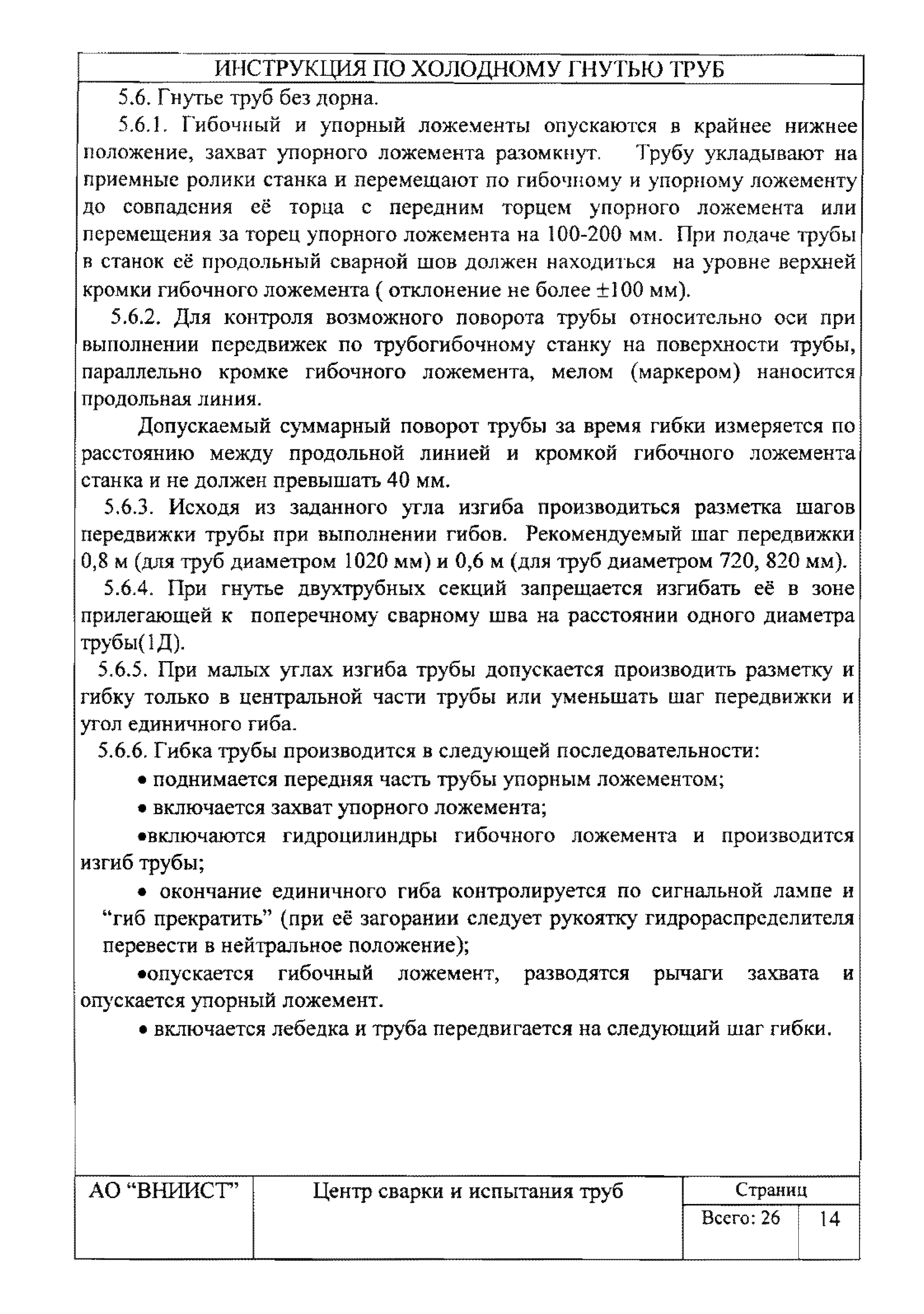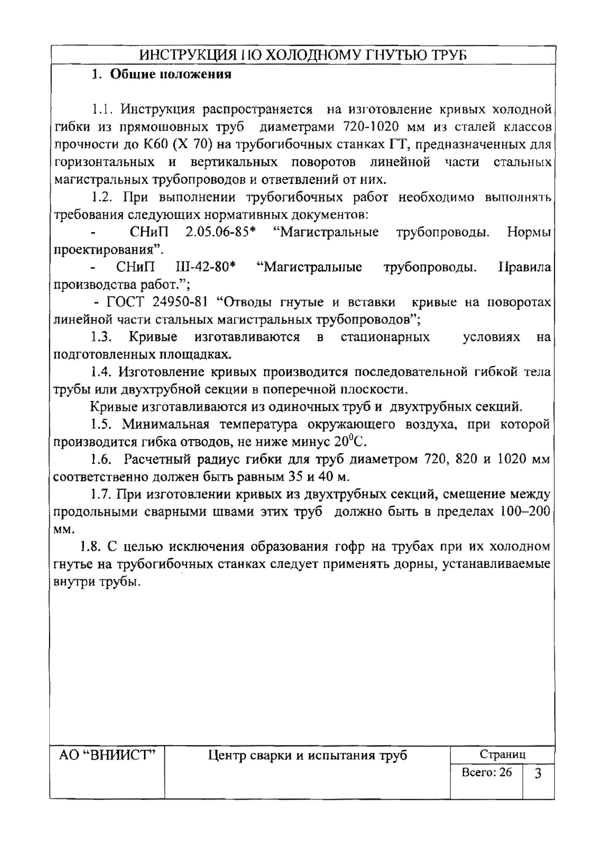 | Название рус.: | Инструкция по изготовлению кривых методом холодного гнутья из прямошовных труб диаметром 720 - 1020 мм |