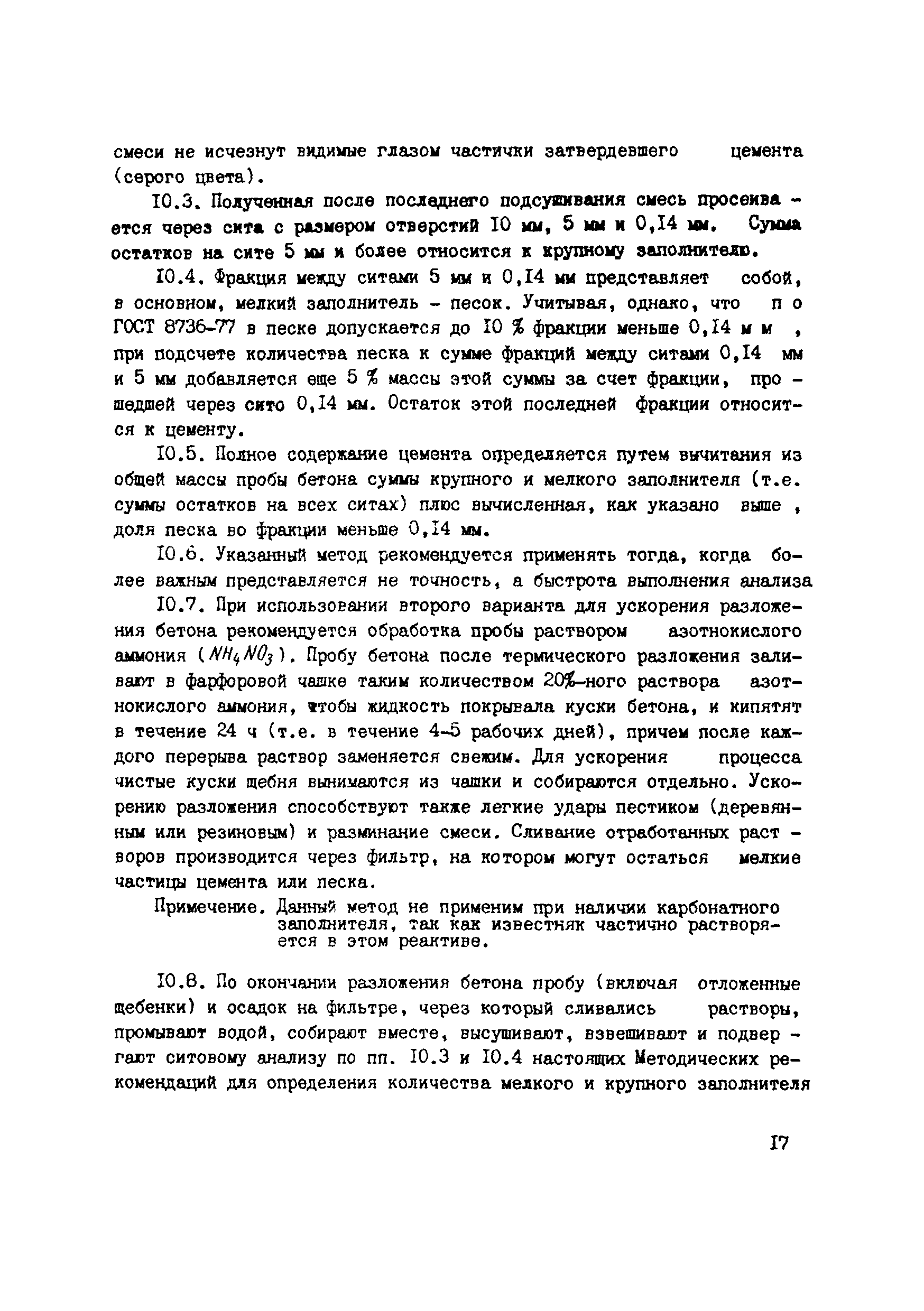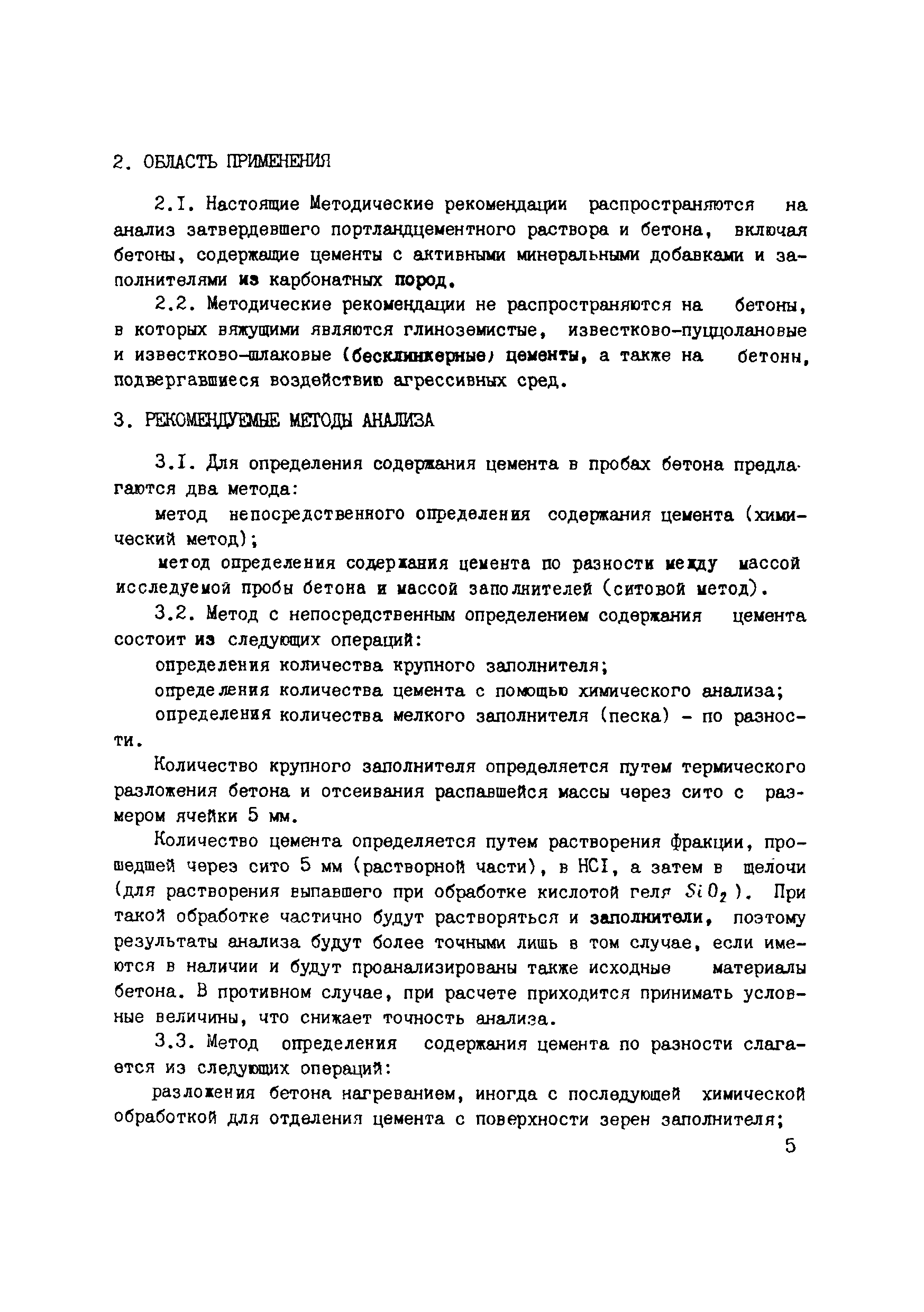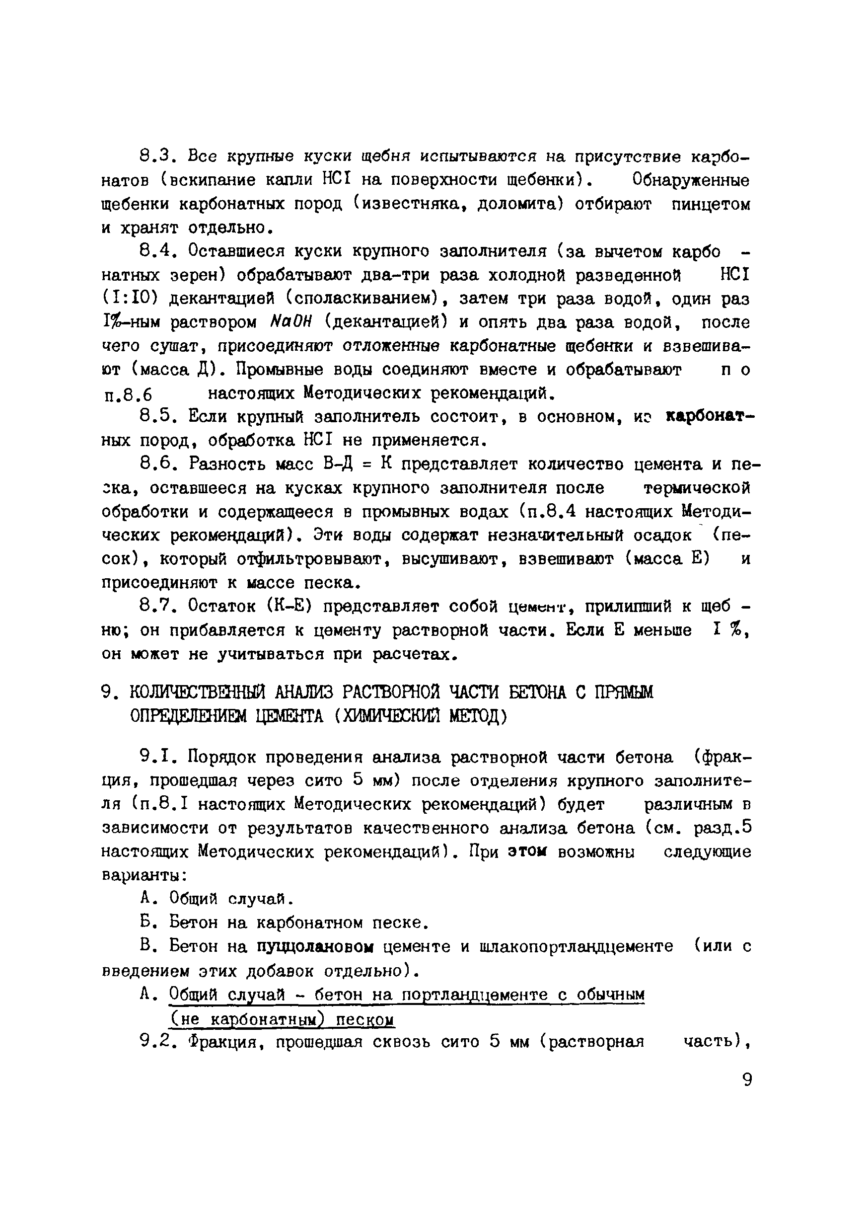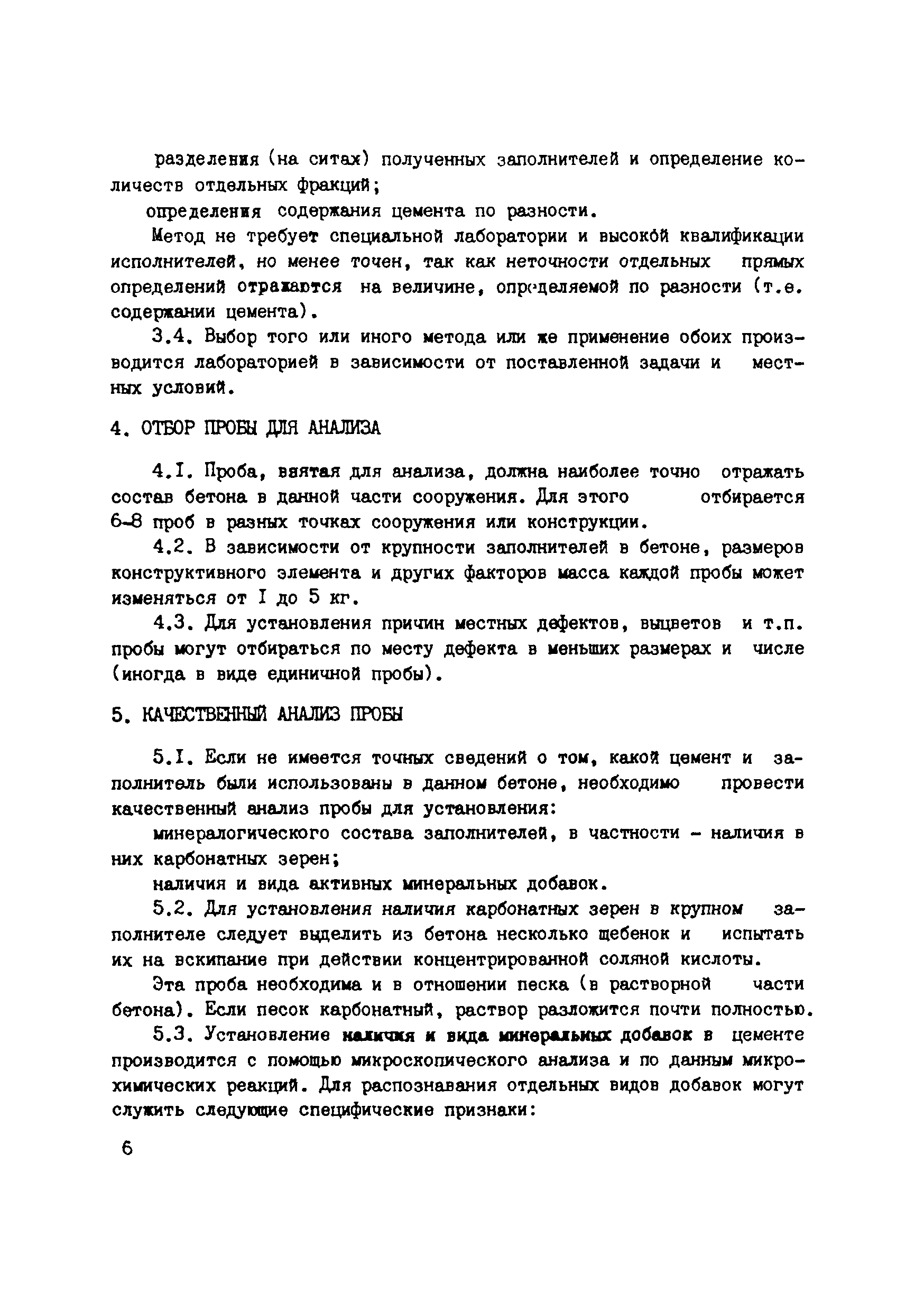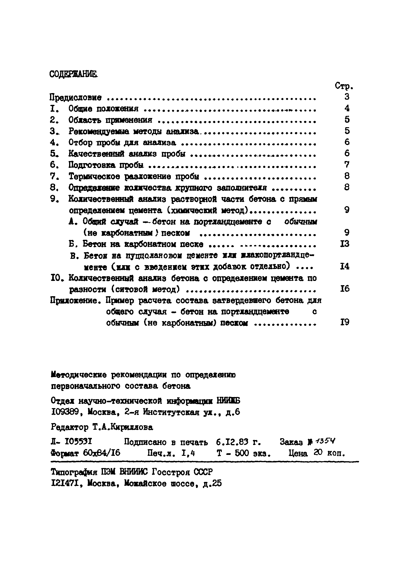 | Оглавление: | Предисловие 1. Общие положения 2. Область применения 3. Рекомендуемые методы анализа 4. Отбор пробы для анализа 5. Качественный анализ пробы 6. Подготовка пробы 7. Термическое разложение пробы 8. Определение количества крупного заполнителя 9. Количественный анализ растворной части бетона с прямым определением цемента (химический метод) А. Общий случай-бетон на портландцементе с обычным (не карбонатным) песком Б. Бетон на карбонатном песке В. Бетон на пуццолановом цементе или шлакопортландцементе (или с введением этих добавок отдельно) 10. Количественный анализ бетона с определением цемента по разности (ситовой метод) Приложение. Пример расчета состава затвердевшего бетона для общего случая - бетон на портландцементе с обычным (не карбонатным) песком |