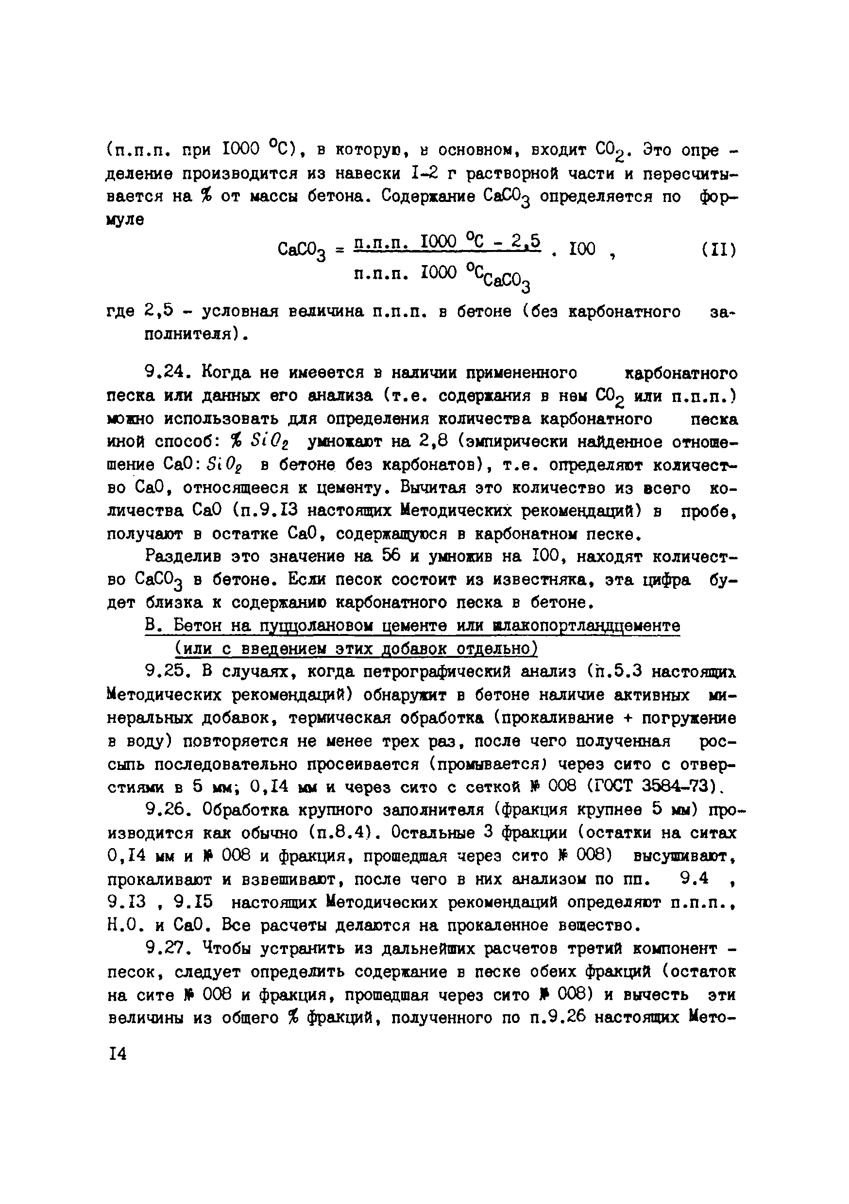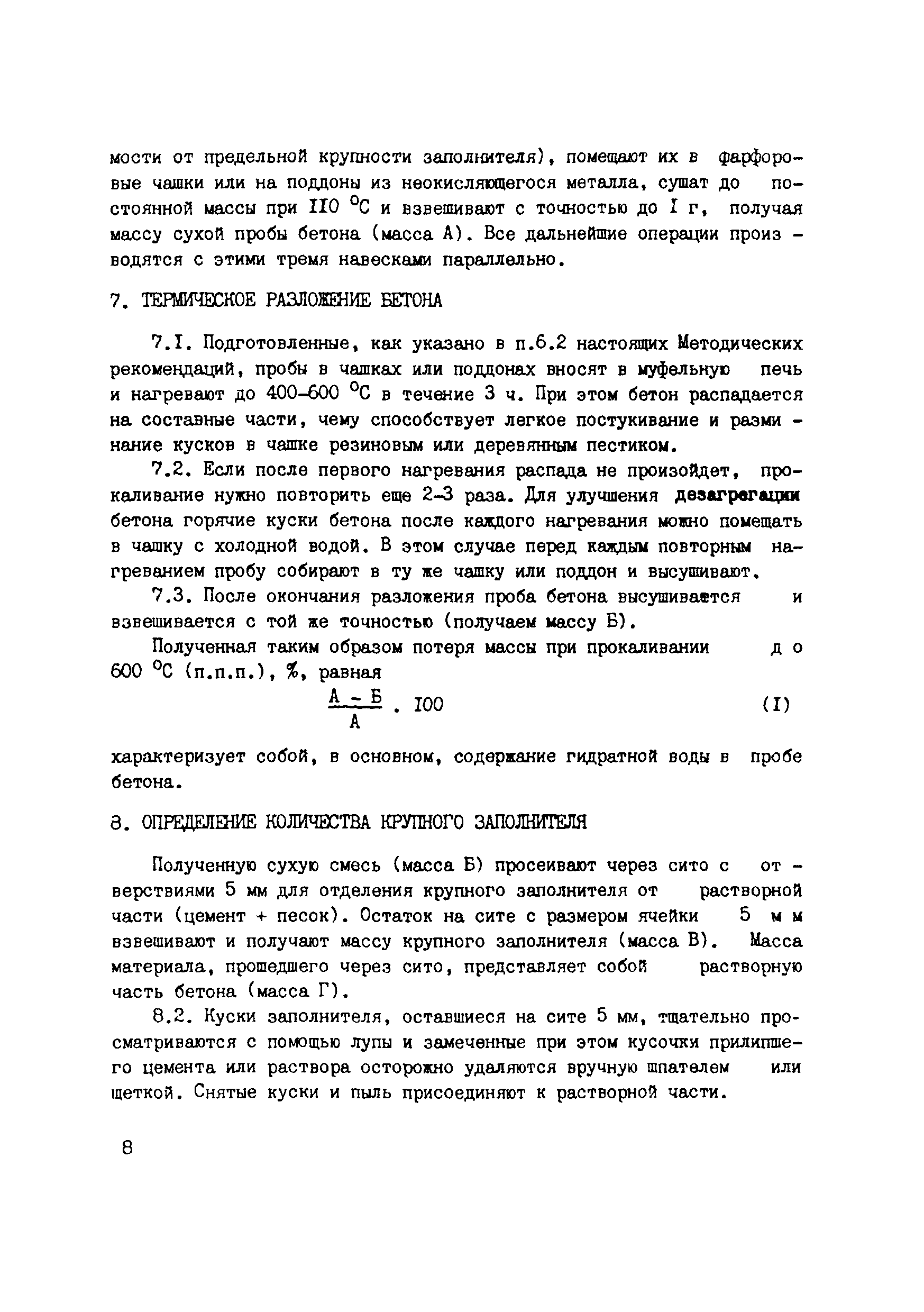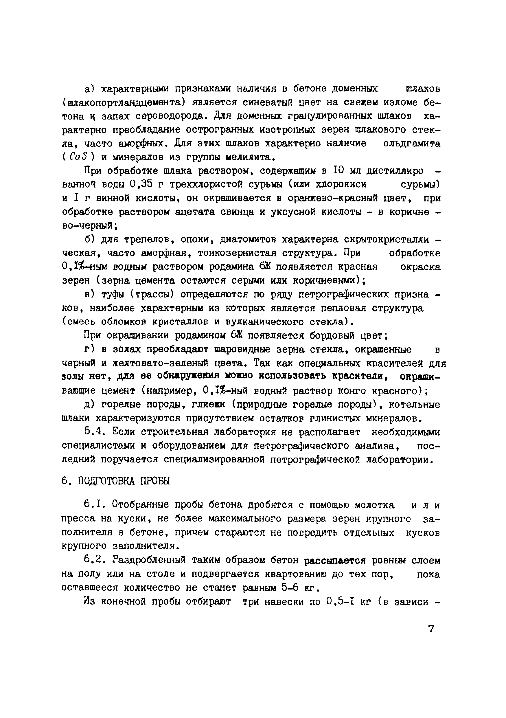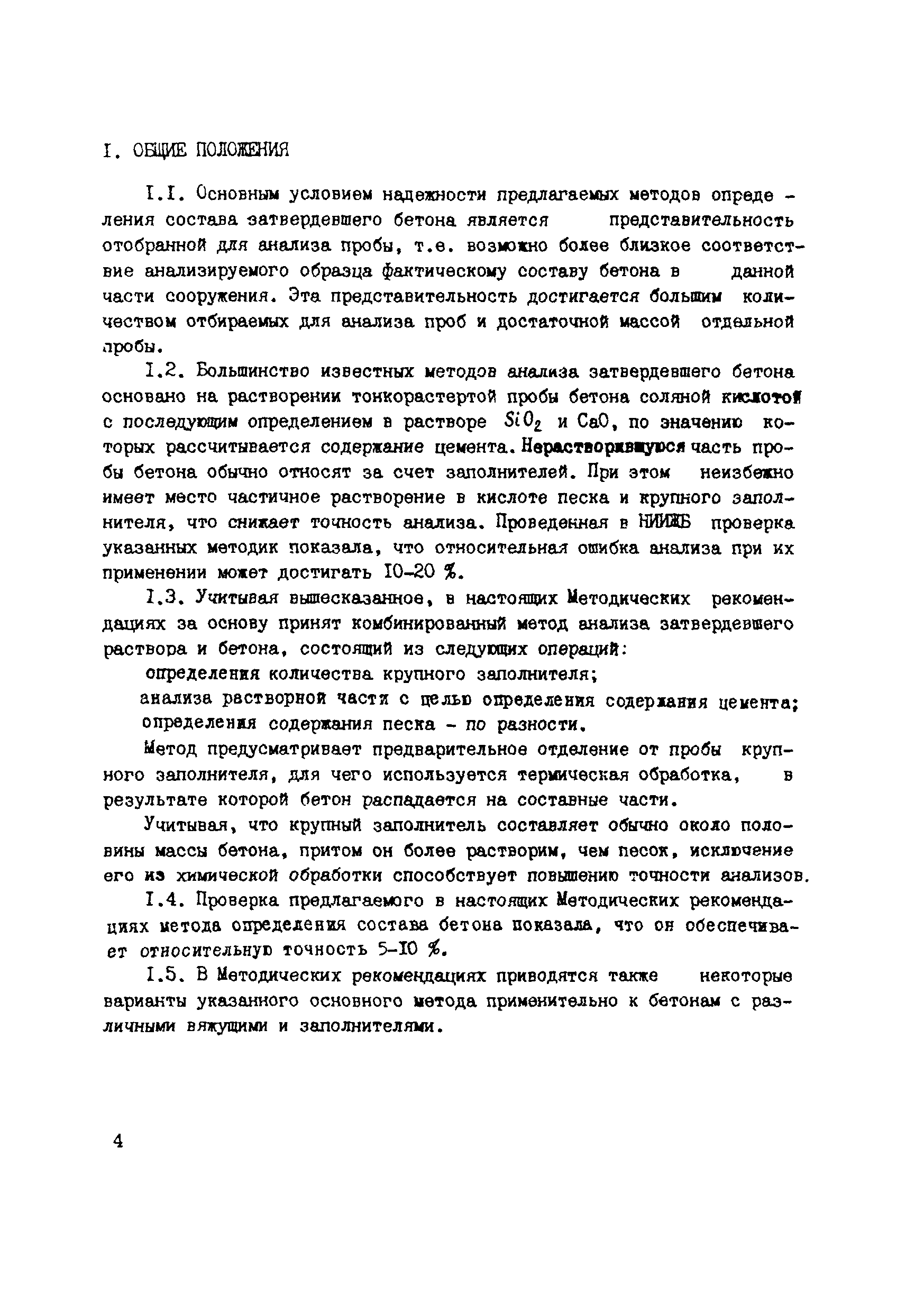| Оглавление: | Предисловие 1. Общие положения 2. Область применения 3. Рекомендуемые методы анализа 4. Отбор пробы для анализа 5. Качественный анализ пробы 6. Подготовка пробы 7. Термическое разложение пробы 8. Определение количества крупного заполнителя 9. Количественный анализ растворной части бетона с прямым определением цемента (химический метод) А. Общий случай-бетон на портландцементе с обычным (не карбонатным) песком Б. Бетон на карбонатном песке В. Бетон на пуццолановом цементе или шлакопортландцементе (или с введением этих добавок отдельно) 10. Количественный анализ бетона с определением цемента по разности (ситовой метод) Приложение. Пример расчета состава затвердевшего бетона для общего случая - бетон на портландцементе с обычным (не карбонатным) песком |