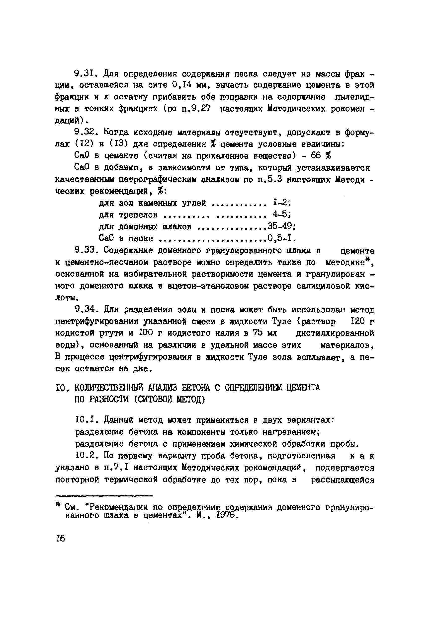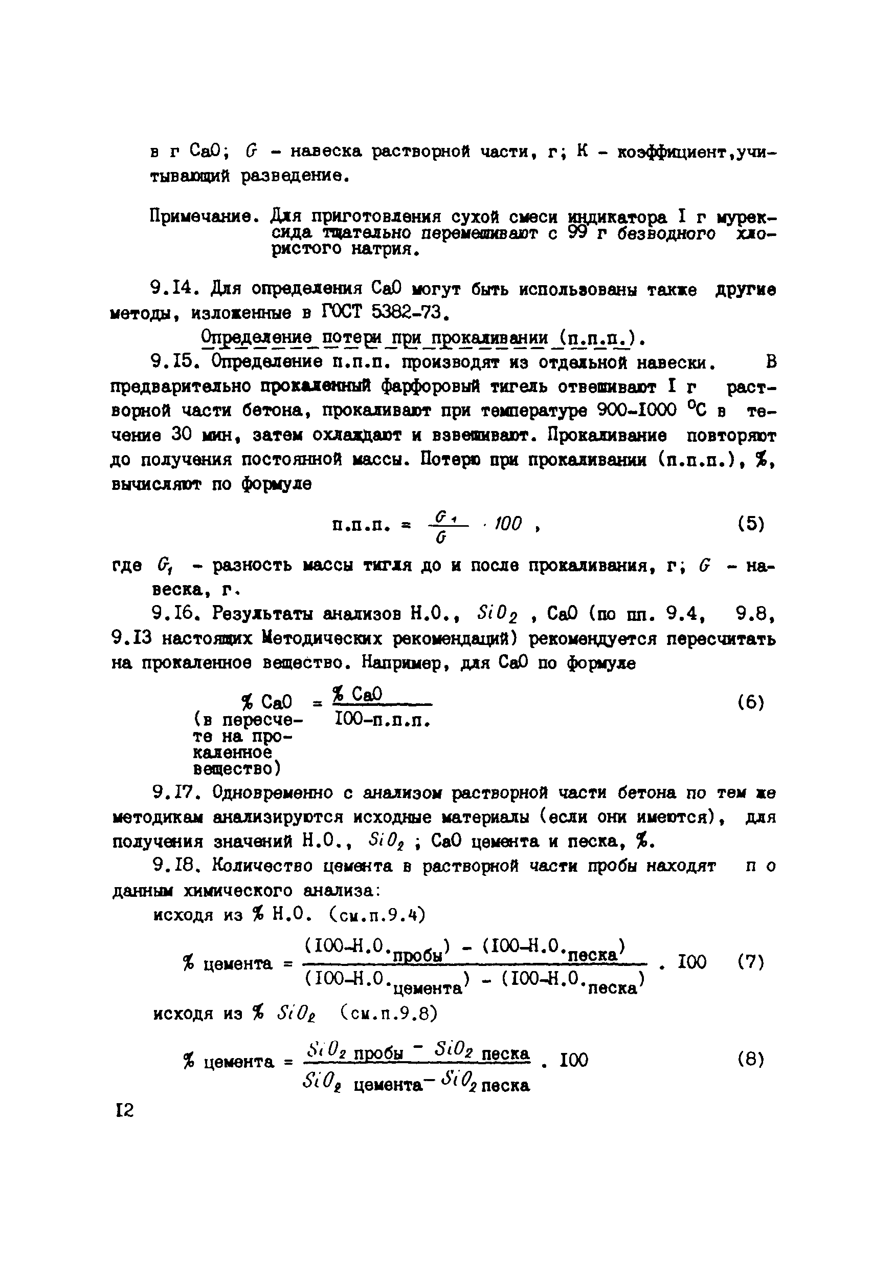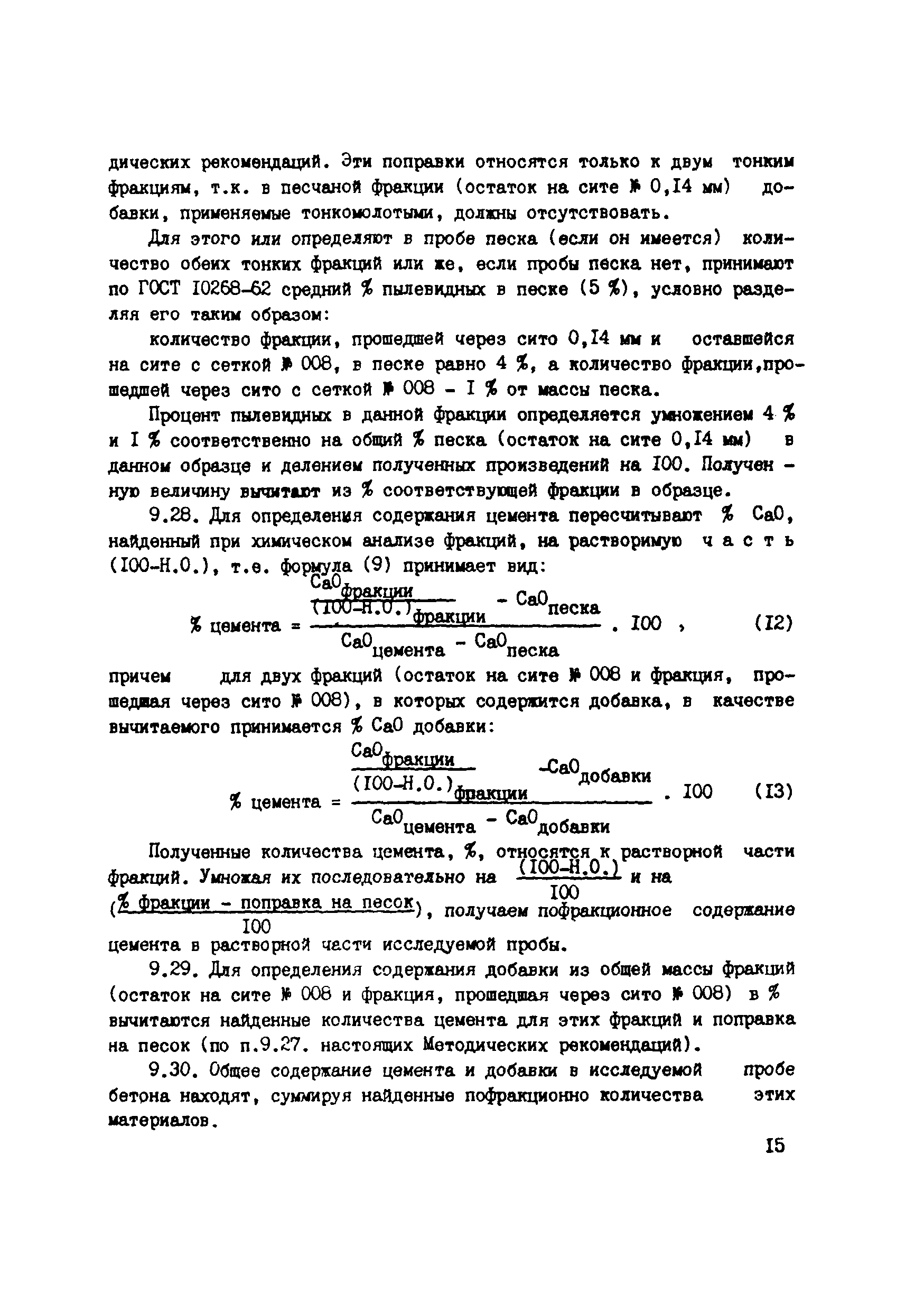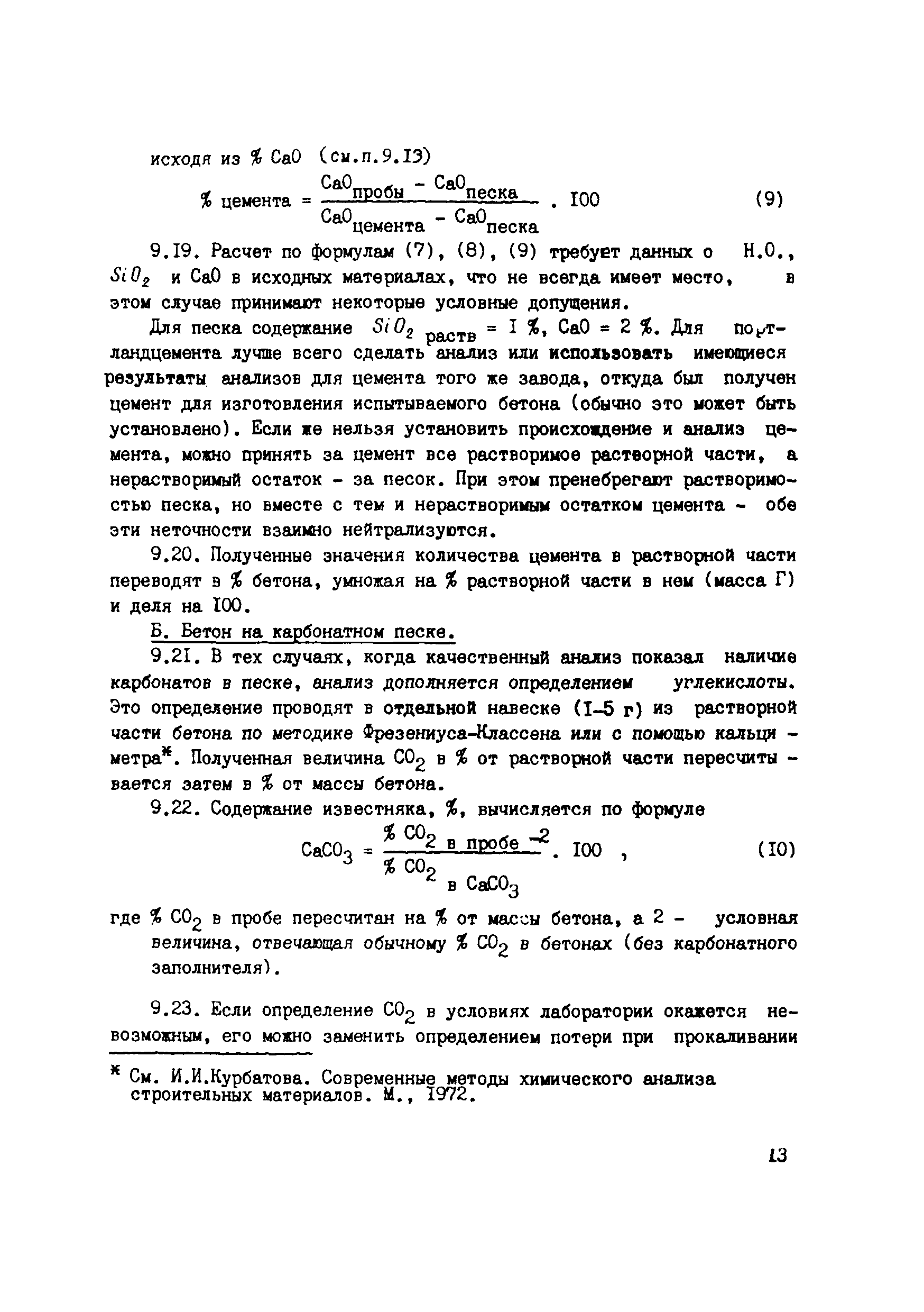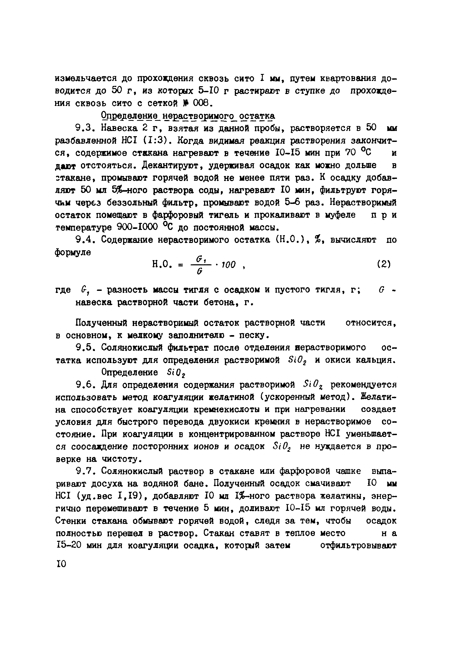| Оглавление: | Предисловие 1. Общие положения 2. Область применения 3. Рекомендуемые методы анализа 4. Отбор пробы для анализа 5. Качественный анализ пробы 6. Подготовка пробы 7. Термическое разложение пробы 8. Определение количества крупного заполнителя 9. Количественный анализ растворной части бетона с прямым определением цемента (химический метод) А. Общий случай-бетон на портландцементе с обычным (не карбонатным) песком Б. Бетон на карбонатном песке В. Бетон на пуццолановом цементе или шлакопортландцементе (или с введением этих добавок отдельно) 10. Количественный анализ бетона с определением цемента по разности (ситовой метод) Приложение. Пример расчета состава затвердевшего бетона для общего случая - бетон на портландцементе с обычным (не карбонатным) песком |