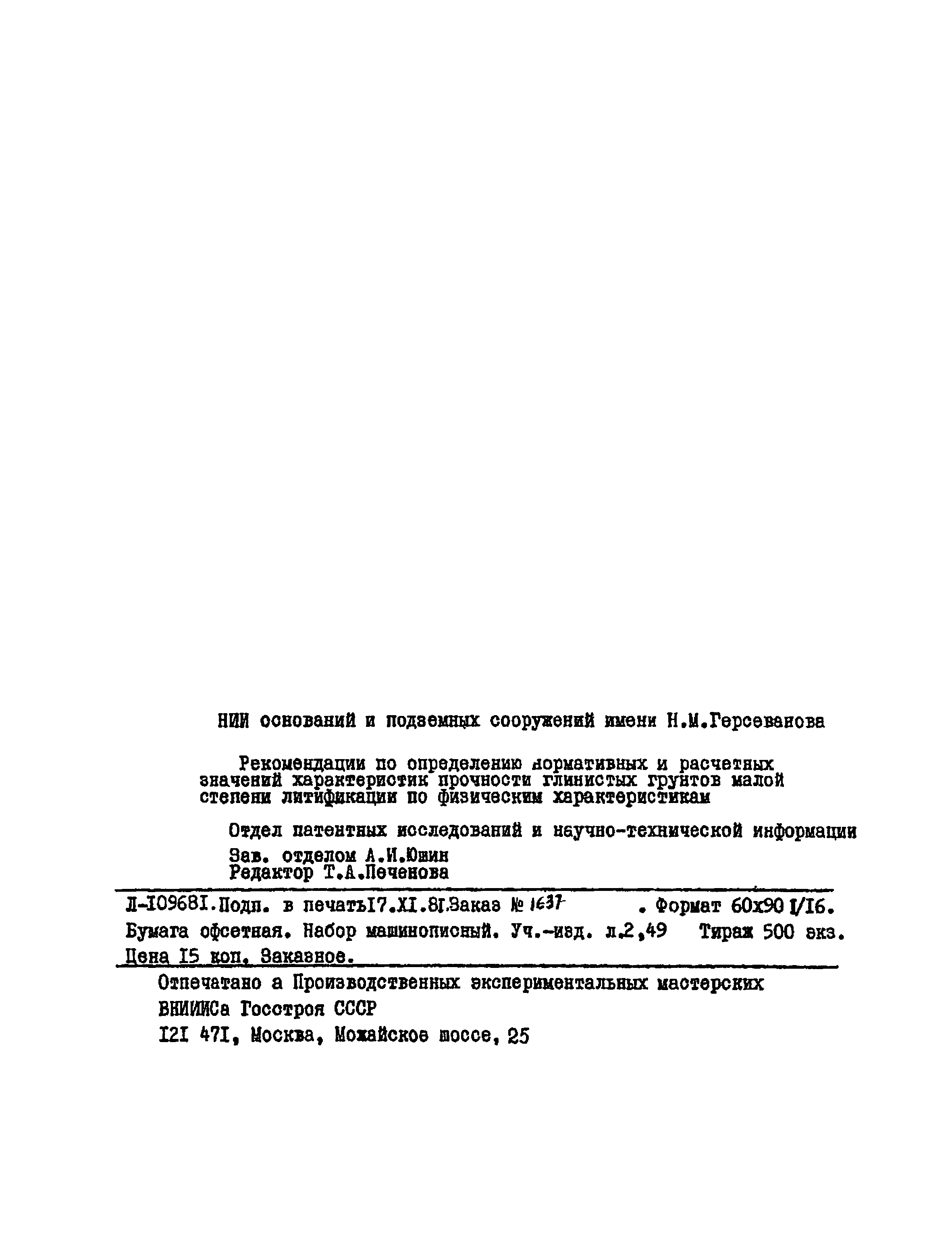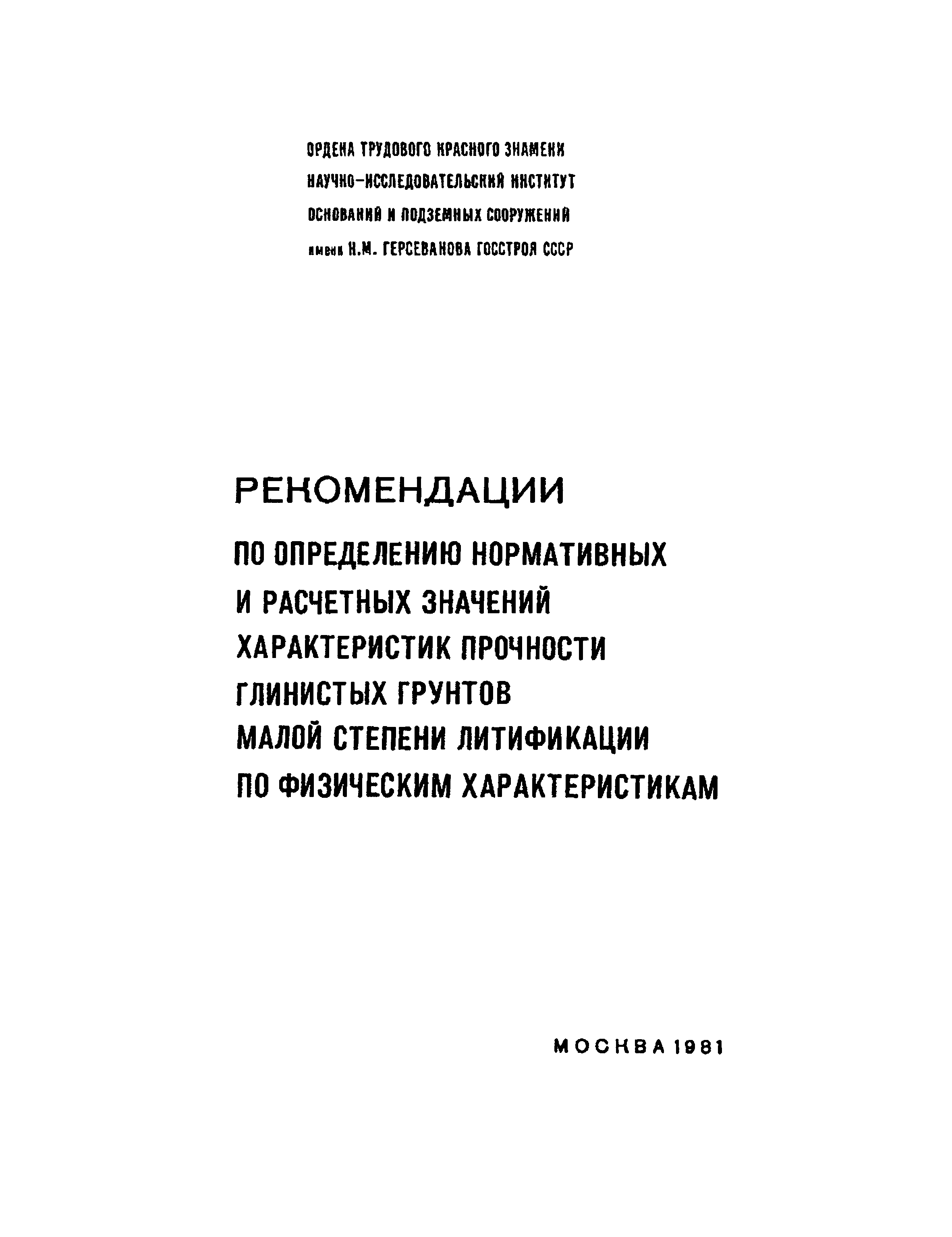 | Название рус.: | Рекомендации по определению нормативных и расчетных значений характеристик прочности глинистых грунтов малой степени литификации по физическим характеристикам |