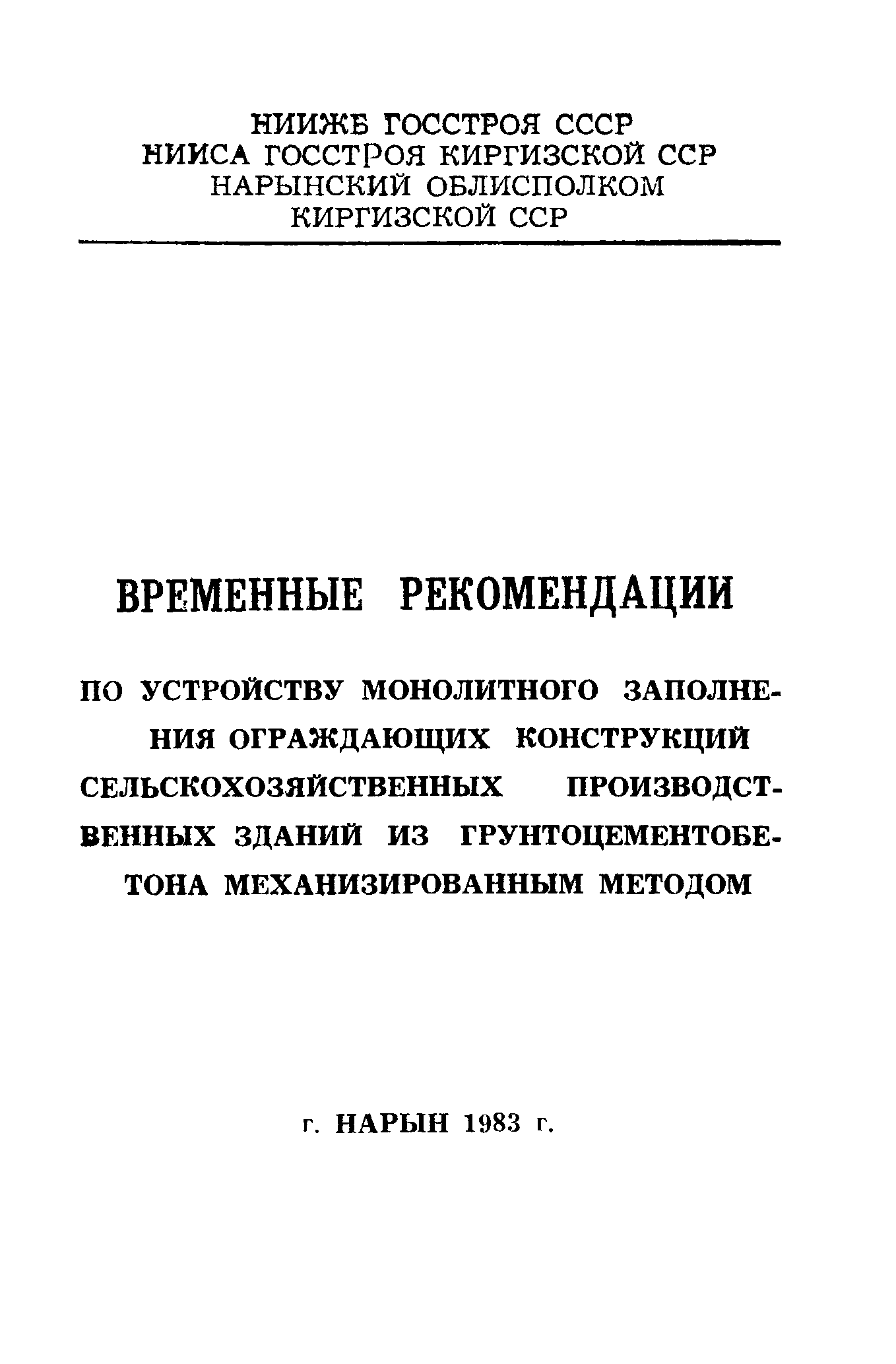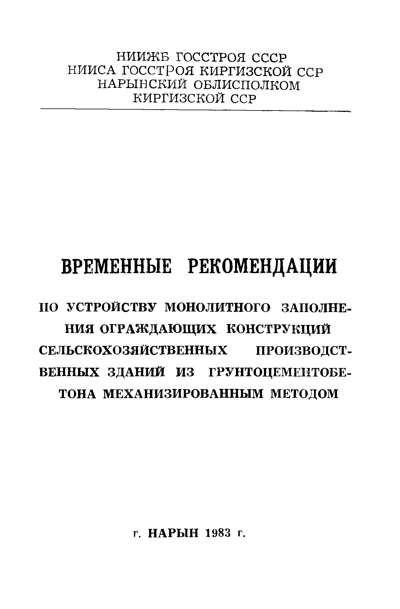 | Название рус.: | Временные рекомендации по устройству монолитного заполнения ограждающих конструкций сельскохозяйственных производственных зданий из грунтоцементобетона механизированным методом |