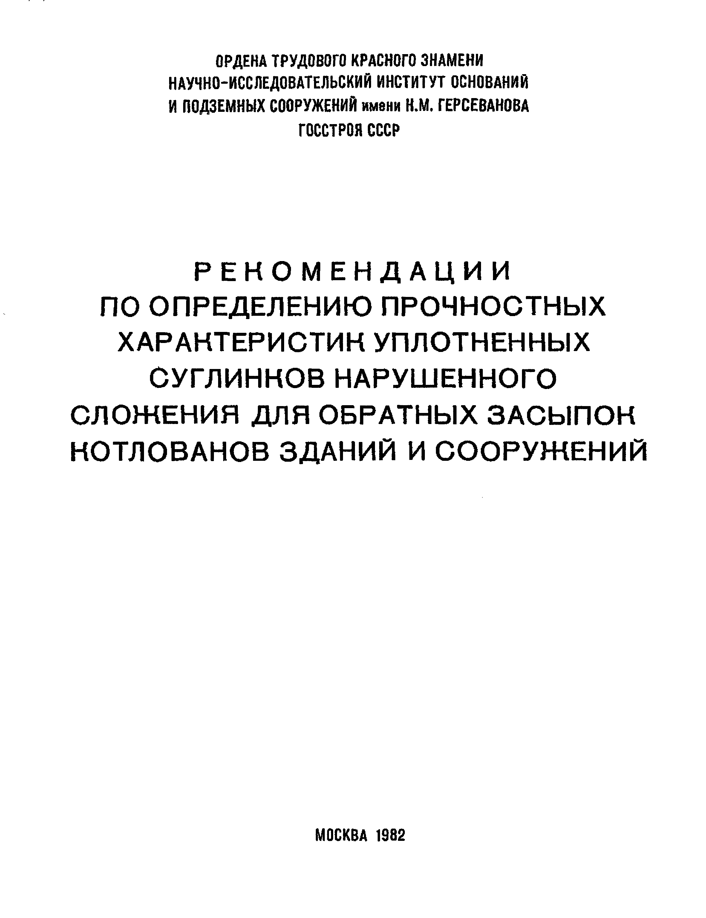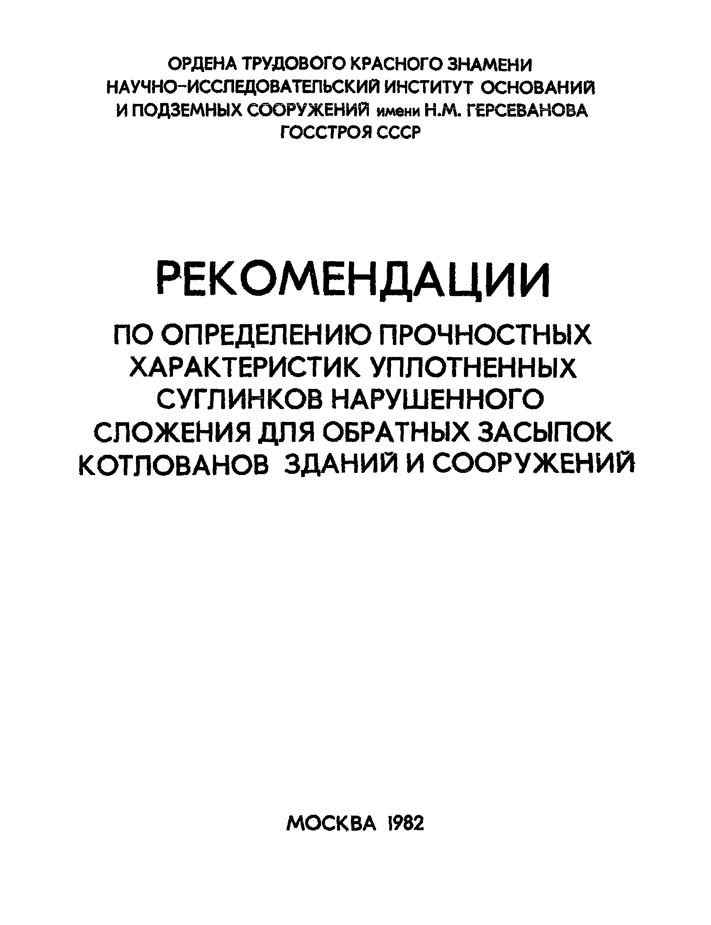 | Название рус.: | Рекомендации по определению прочностных характеристик уплотненных суглинков нарушенного сложения для обратных засыпок котлованов зданий и сооружений |