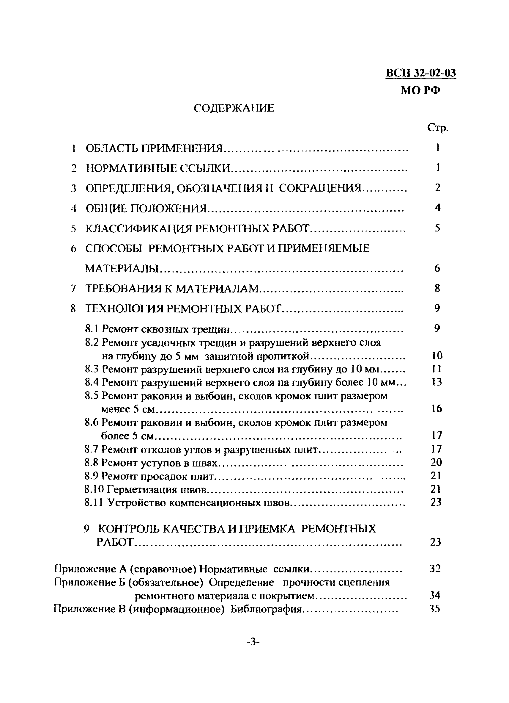 | Оглавление: | 1 Область применения 2 Нормативные ссылки 3 Определения, обозначения и сокращения 4 Общие положения 5 Классификация ремонтных работ 6 Способы ремонтных работ и применяемые материалы 7 Требования к материалам 8 Технология ремонтных работ 8.1 Ремонт сквозных трещин 8.2 Ремонт усадочных трещин и разрушений верхнего слоя на глубину до 5 мм защитной пропиткой 8.3 Ремонт разрушений верхнего слоя на глубину до 10 мм 8.4 Ремонт разрушений верхнего слоя на глубину более 10 мм 8.5 Ремонт раковин и выбоин, сколов кромок плит размером менее 5 см 8.6 Ремонт раковин и выбоин, сколов кромок плит размером более 5 см 8.7 Ремонт отколов углов и разрушенных плит 8.8 Ремонт уступов в швах 8.9 Ремонт просадок плит 8.10 Герметизация швов 8.11 Устройство компенсационных швов 9 Контроль качества и приемка ремонтных работ Приложение А (справочное). Нормативные ссылки Приложение Б (обязательное). Определение прочности сцепления ремонтного материала с покрытием Приложение В (информационное). Библиография |