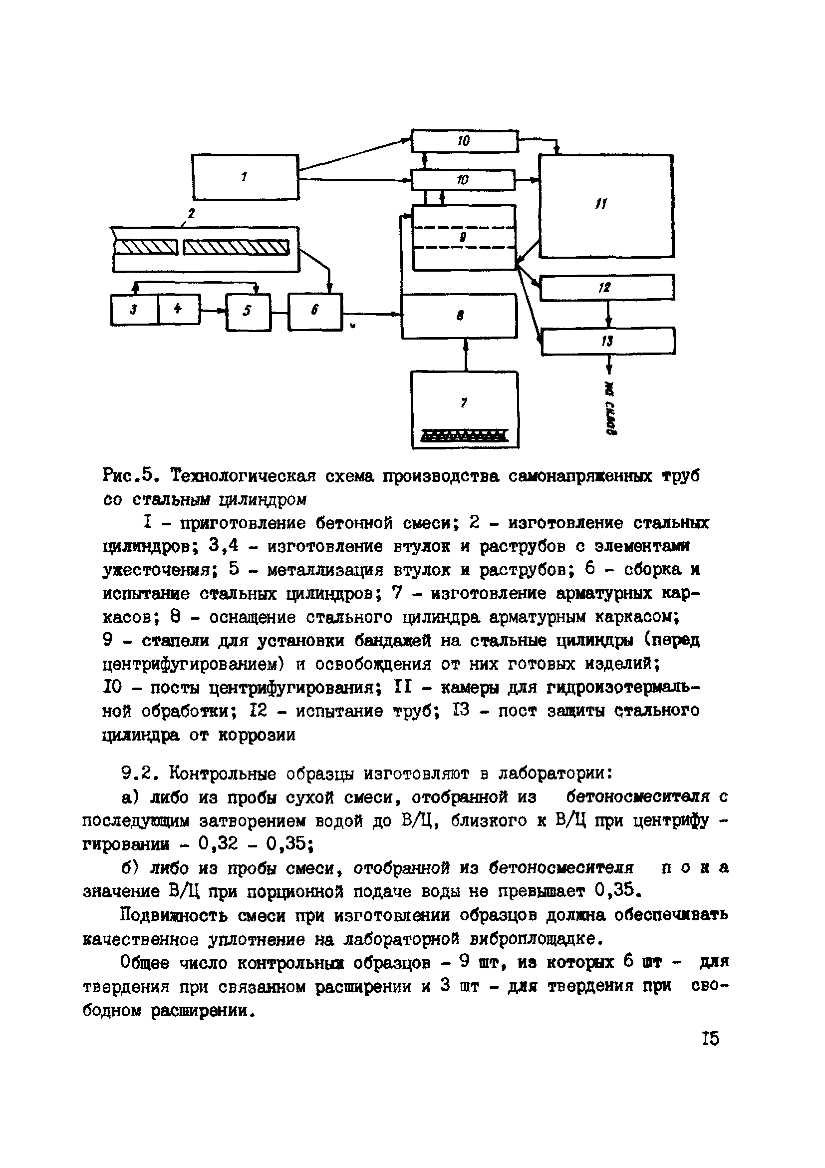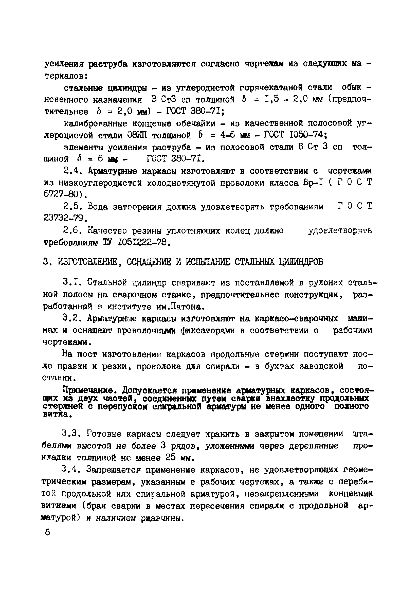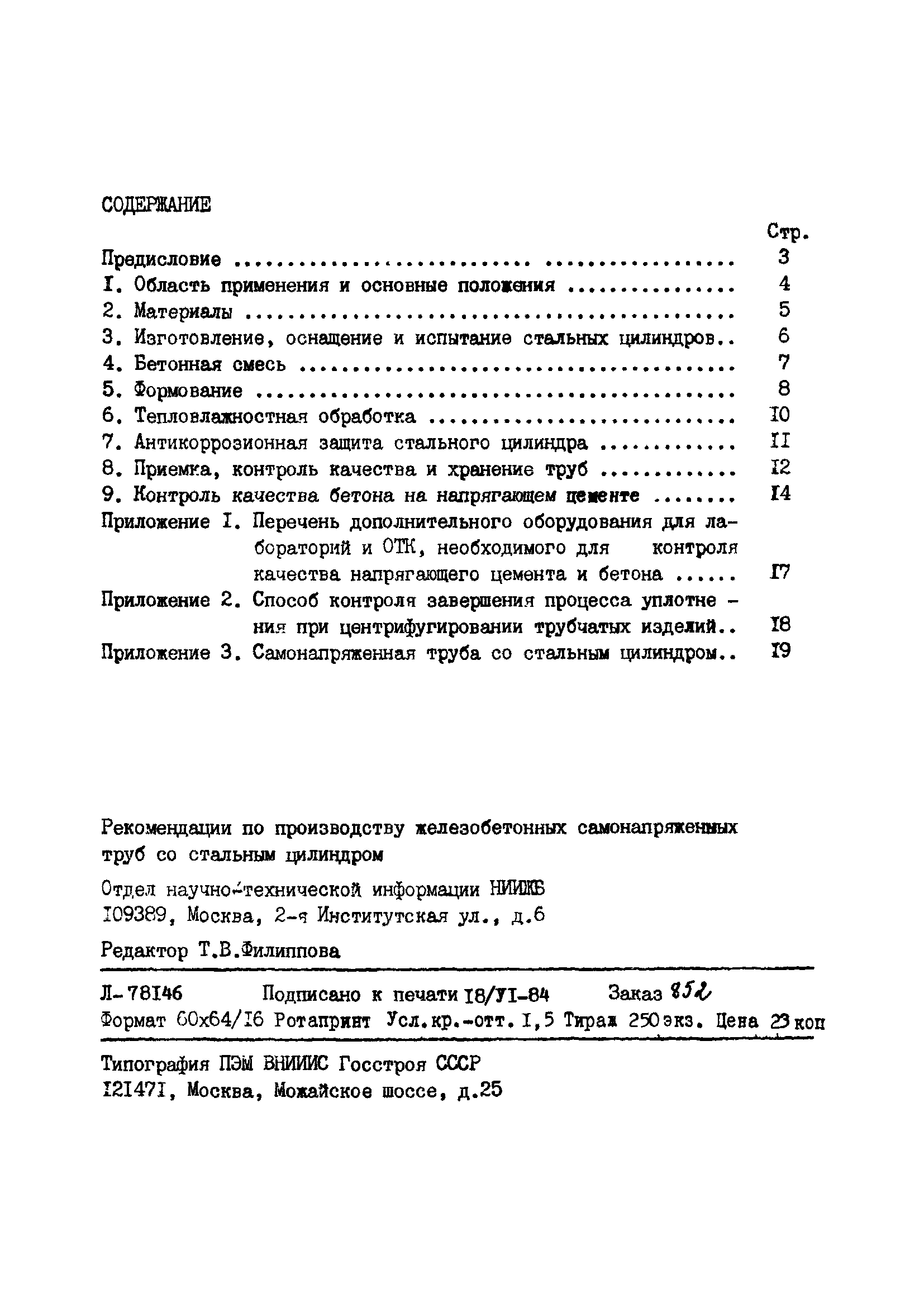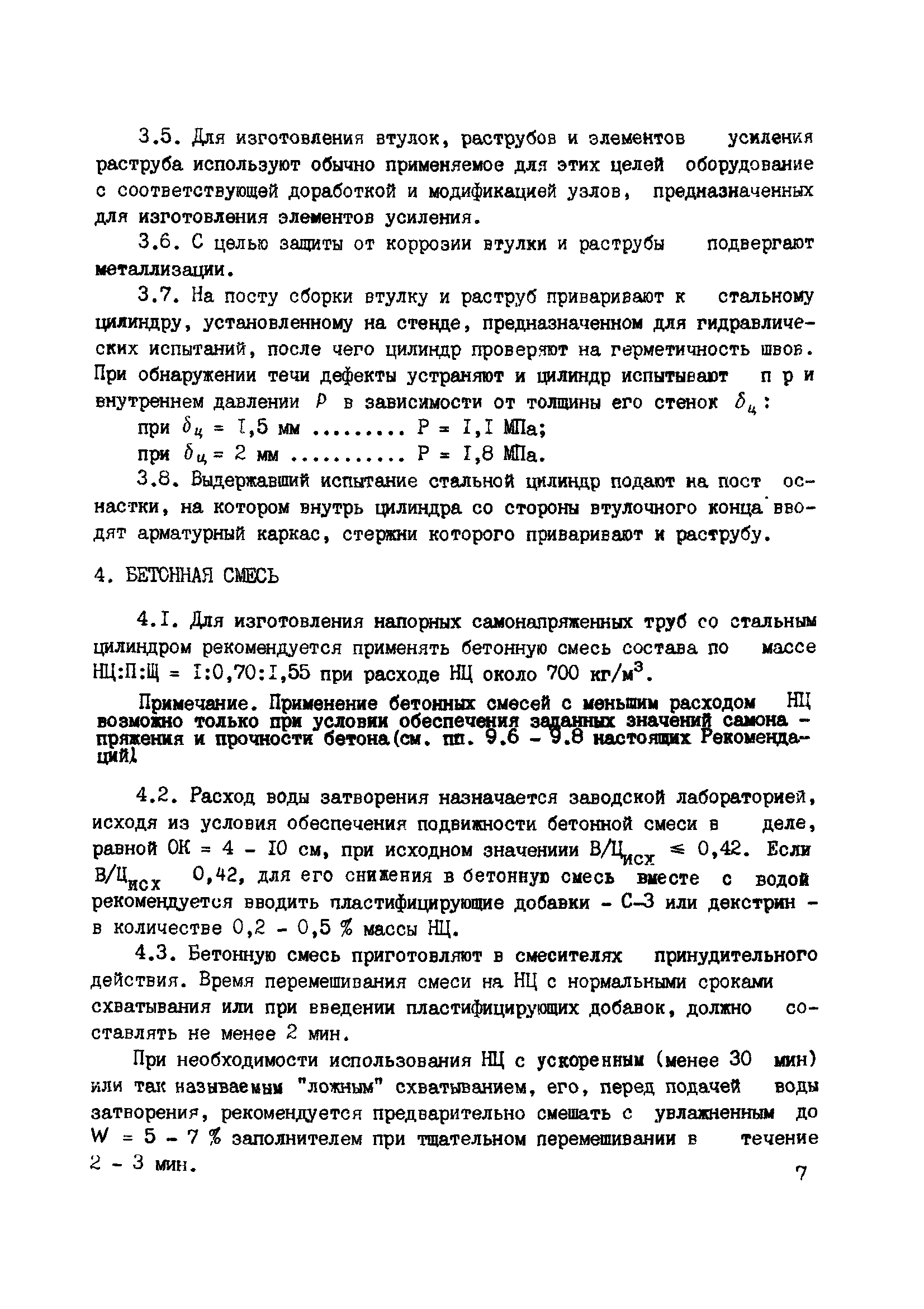 | Оглавление: | Предисловие 1. Область применения и основные положения 2. Материалы 3. Изготовление, оснащение и испытание стальных цилиндров 4. Бетонная смесь 5. Формование 6. Тепловлажностная обработка 7. Антикоррозионная защита стального цилиндра 8. Приемка, контроль качества и хранение труб 9. Контроль качества бетона на напрягающем цементе Приложение 1. Перечень дополнительного оборудования для лабораторий и ОТК необходимого для контроля качества напрягающего цемента и бетона Приложение 2. Способ контроля завершения процесса уплотнения при центрифугировании трубчатых изделий Приложение 3. Самонапряженная труба со стальным цилиндром |