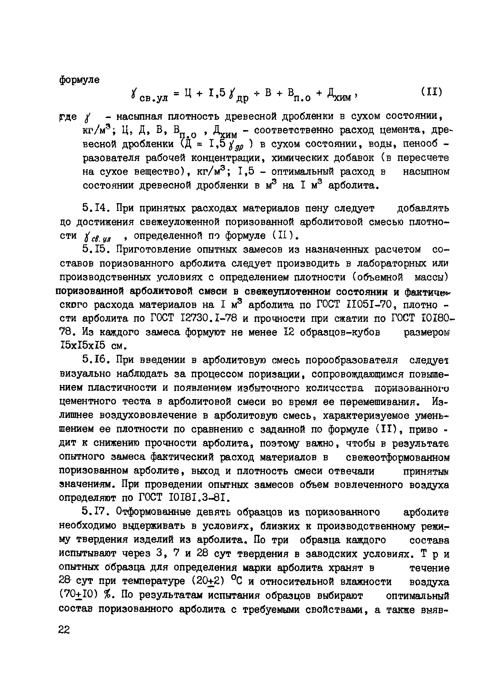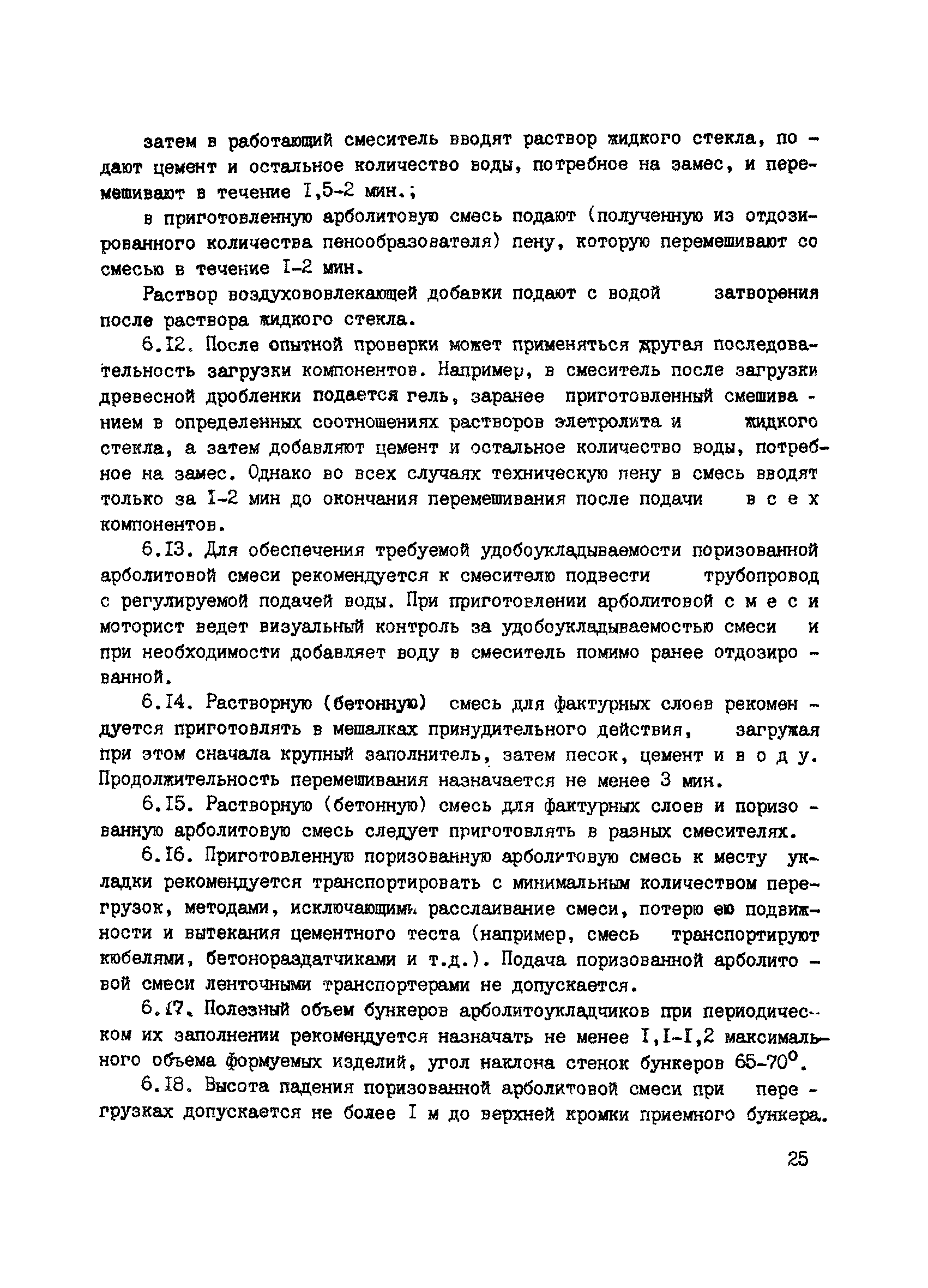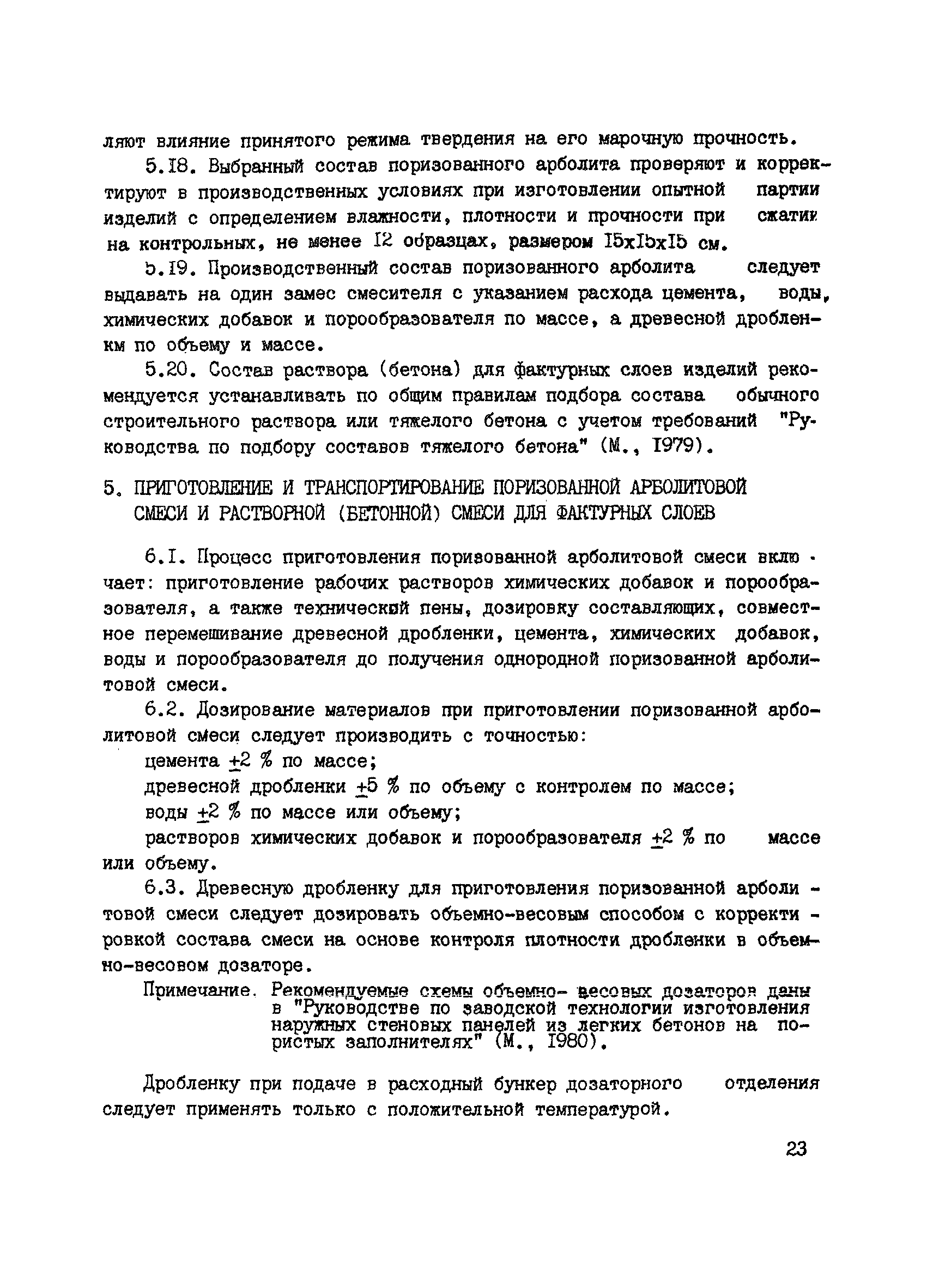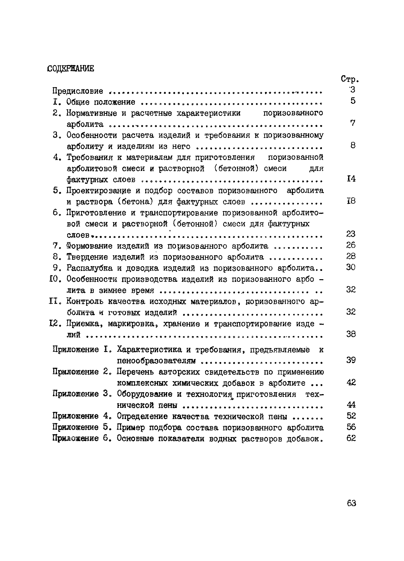 | Оглавление: | Предисловие 1. Общие положение 2, Нормативные и расчетные характеристики поризованного арболита 3, Особенности расчета изделий и требования к поризованному арболиту и изделиям из него 4. Требования к материалам для приготовления поризованной арболитовой смеси и растворной (бетонной) смеси для фактурных слоев 5. Проектирование и подбор составов поризованного арболита и раствора (бетона) для фактурных слоев 6. Приготовление и транспортирование поризованной арболитовой смеси и растворной (бетонной) смеси для фактурных слоев 7. Формование изделий из поризованного арболита 8. Твердение изделий из поризованного арболита 9. Распалубка и доводка изделий из поризозанного арболита 10. Особенности производства изделий из поризованного арболита в зимнее время 11. Контроль качества исходных материалов поризованного арболита и готовых изделий 12. Приемка, маркировка, хранение и транспортирование изделий Приложение 1. Характеристика и требования, предъявляемые к пенообразователям Приложение 2. Перечень авторских свидетельств по применению комплексных химических добавок в арболите Приложение 3, Оборудование и технология приготовления технической пены Приложение 4. Определение качества технической пены Приложение 5. Пример подбора состава поризованного арболита Приложение 6. Основные показатели водных растворов добавок |