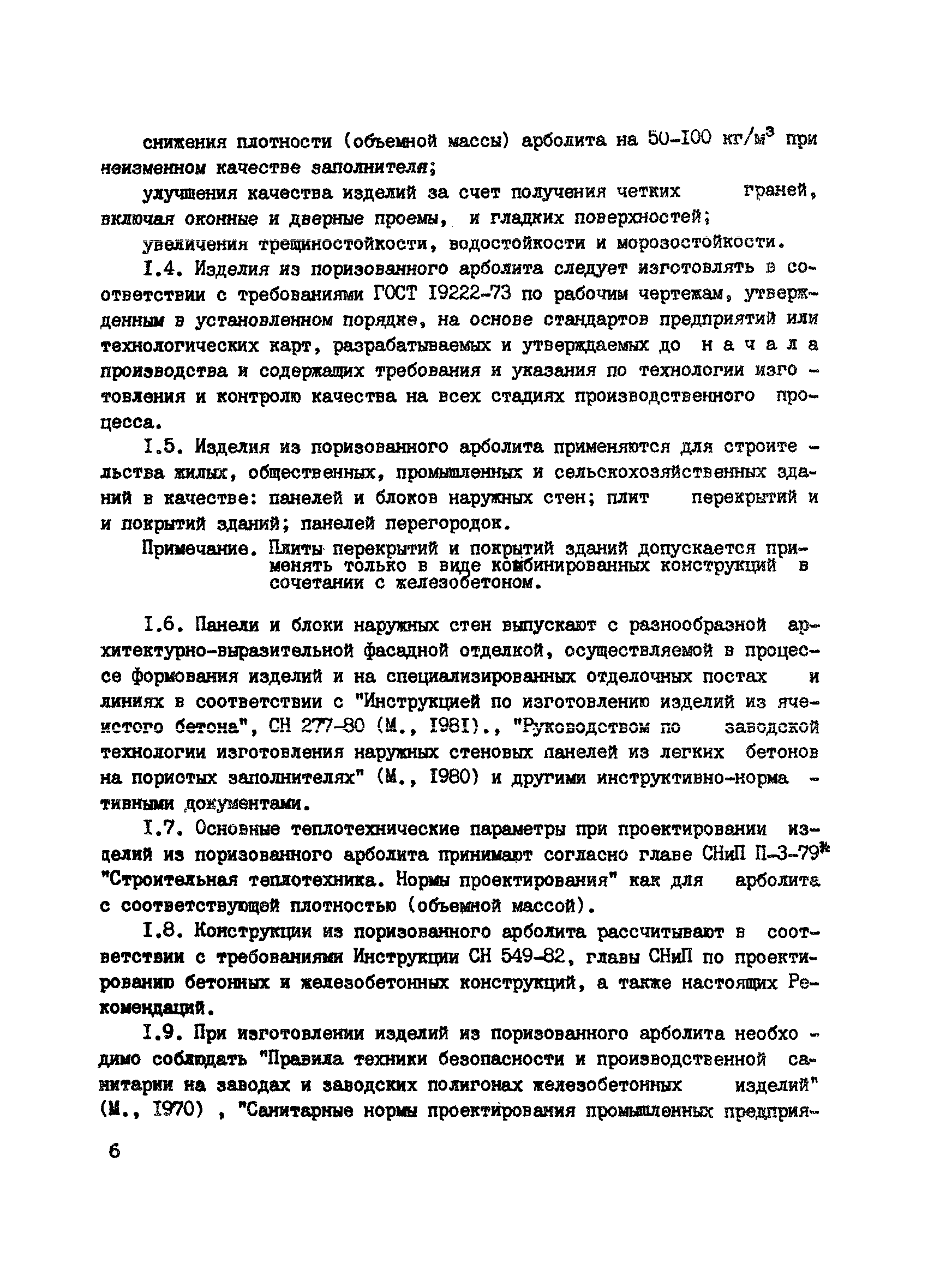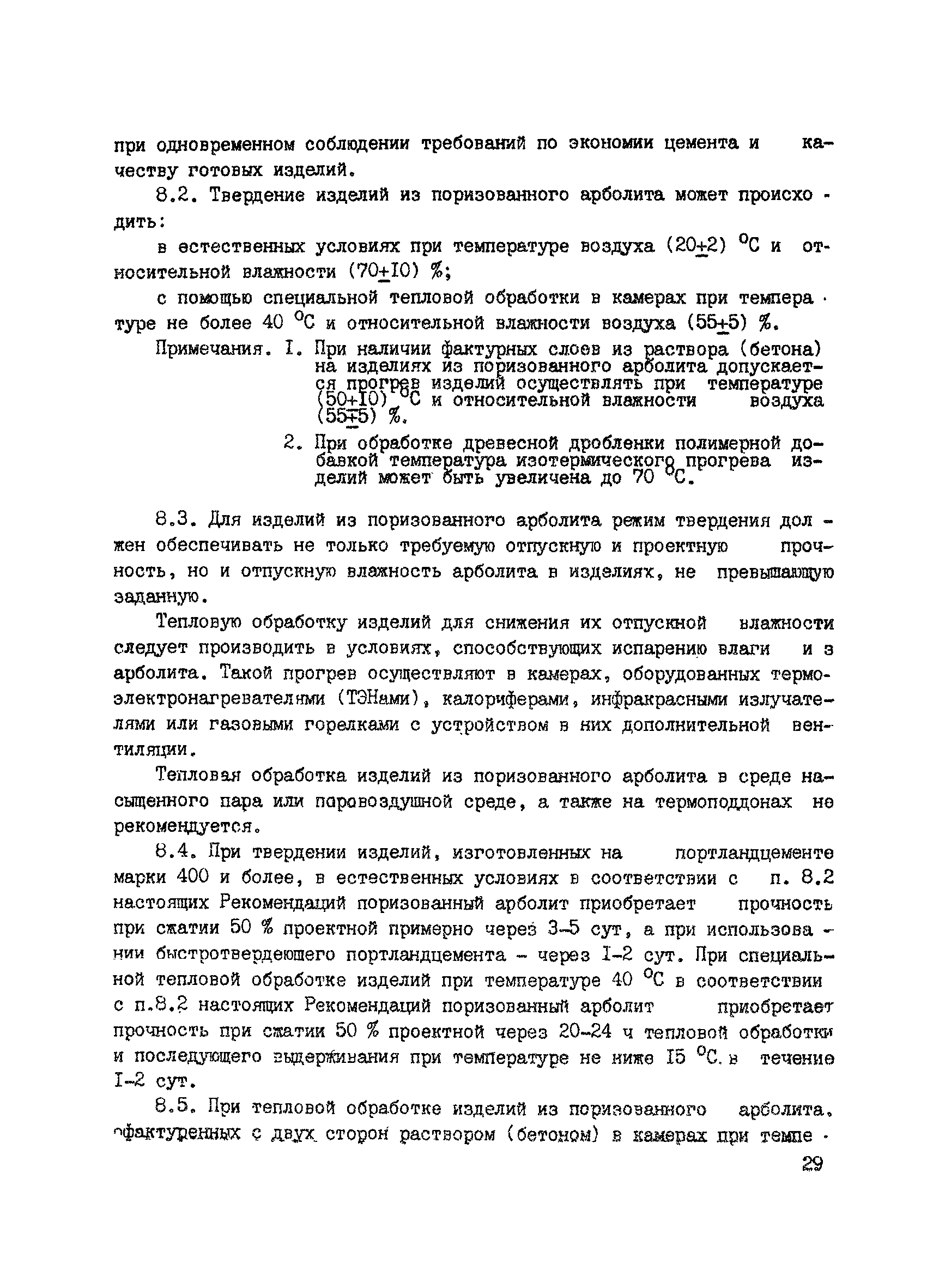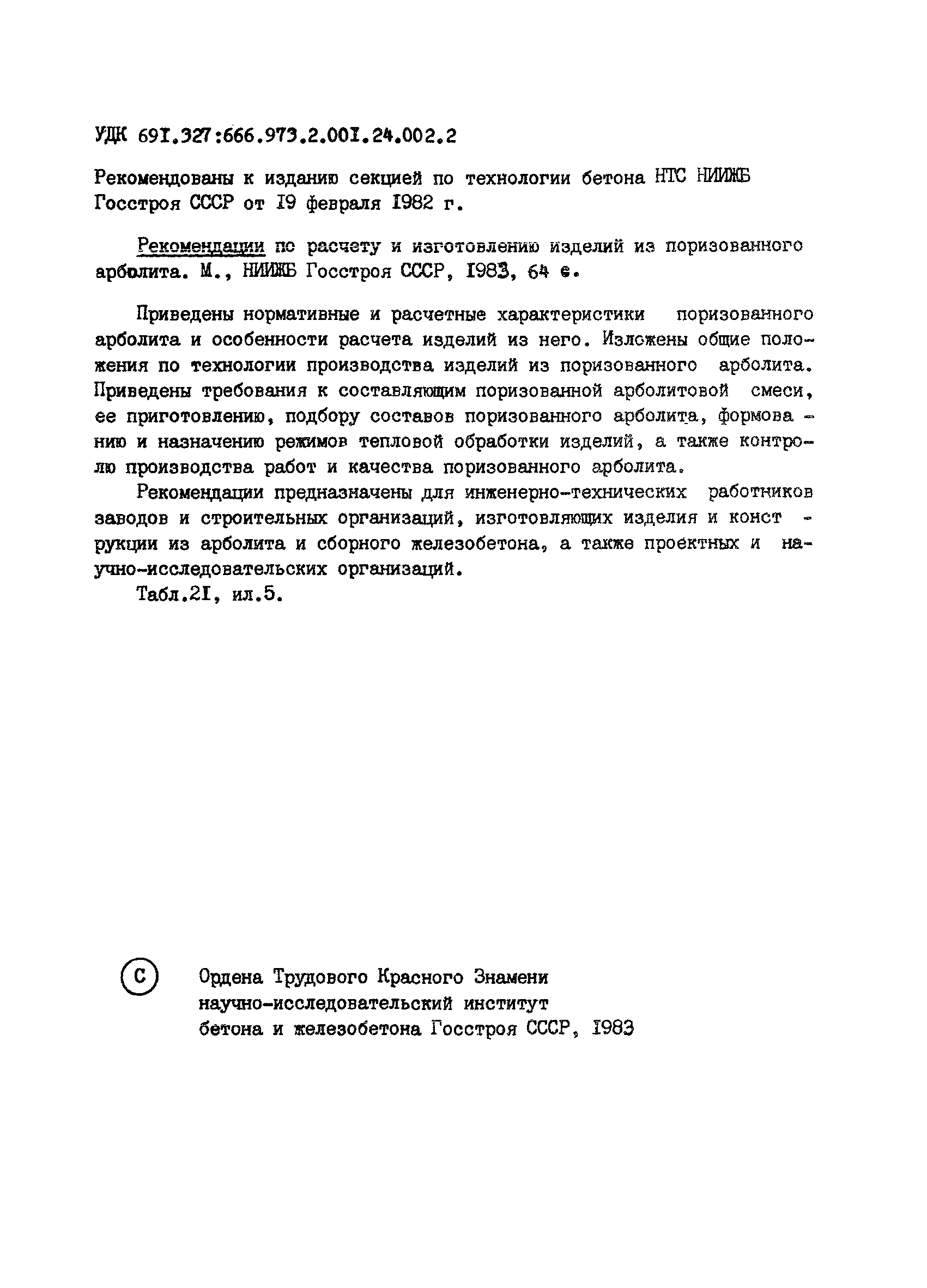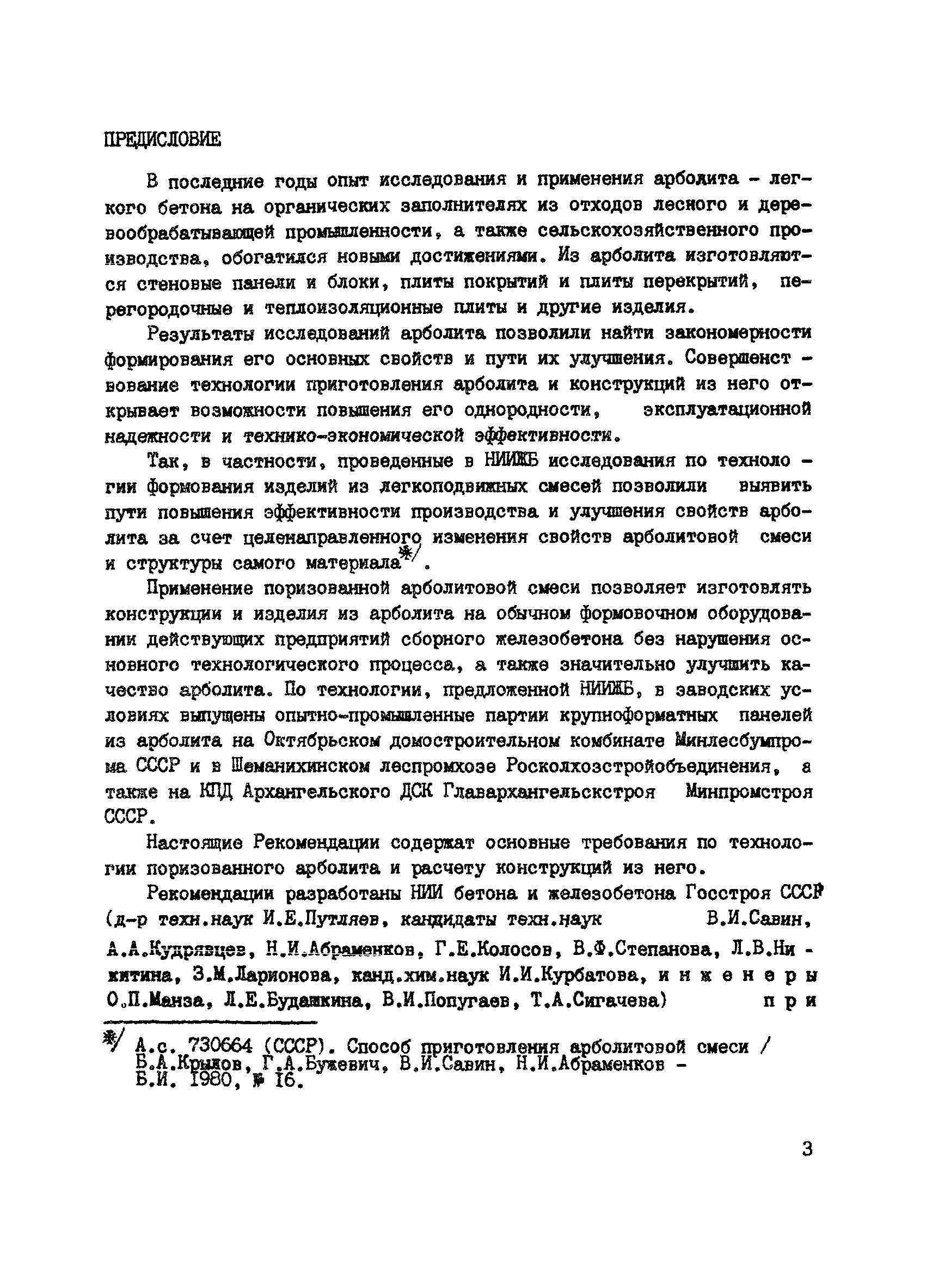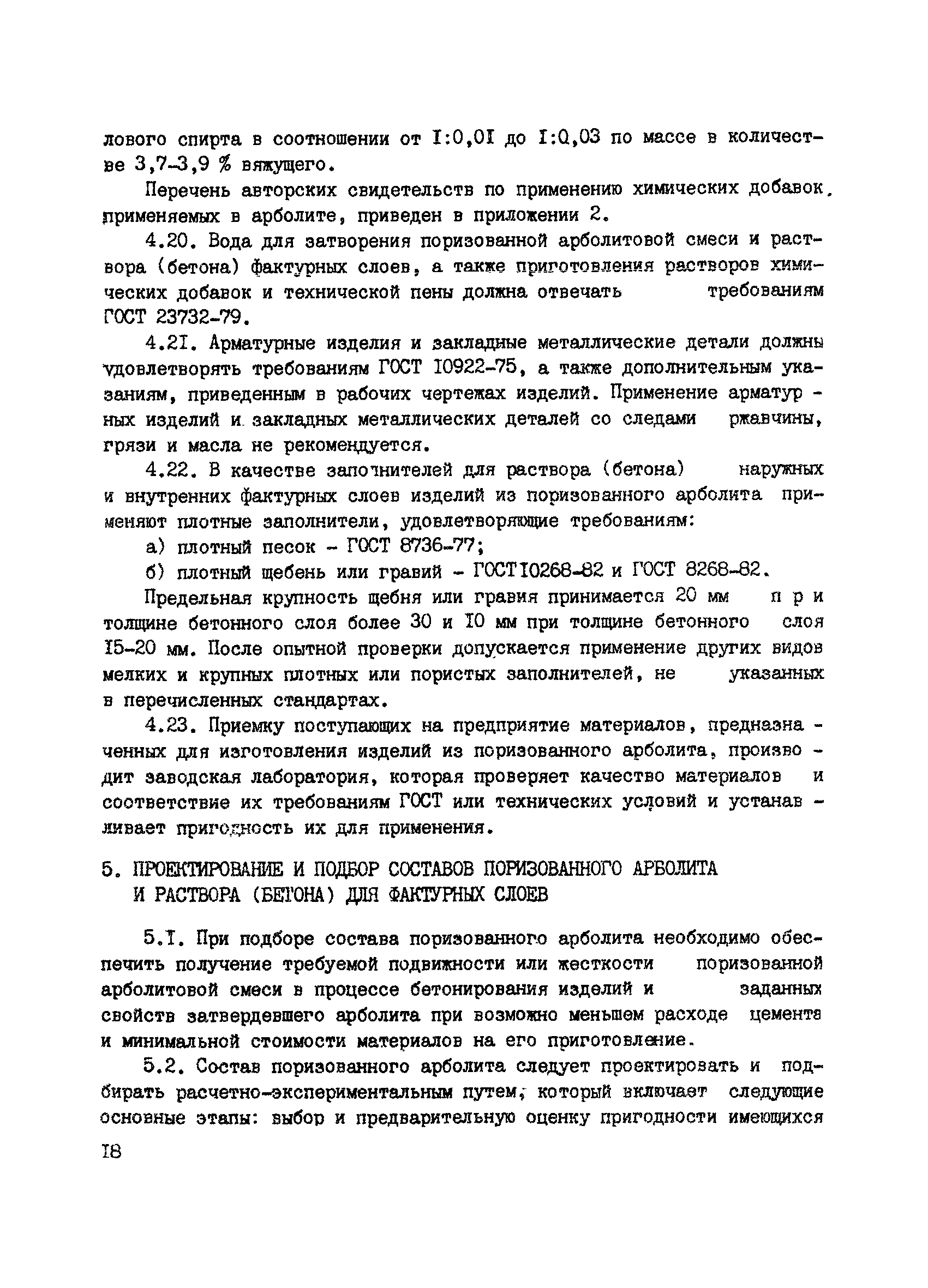| Оглавление: | Предисловие 1. Общие положение 2, Нормативные и расчетные характеристики поризованного арболита 3, Особенности расчета изделий и требования к поризованному арболиту и изделиям из него 4. Требования к материалам для приготовления поризованной арболитовой смеси и растворной (бетонной) смеси для фактурных слоев 5. Проектирование и подбор составов поризованного арболита и раствора (бетона) для фактурных слоев 6. Приготовление и транспортирование поризованной арболитовой смеси и растворной (бетонной) смеси для фактурных слоев 7. Формование изделий из поризованного арболита 8. Твердение изделий из поризованного арболита 9. Распалубка и доводка изделий из поризозанного арболита 10. Особенности производства изделий из поризованного арболита в зимнее время 11. Контроль качества исходных материалов поризованного арболита и готовых изделий 12. Приемка, маркировка, хранение и транспортирование изделий Приложение 1. Характеристика и требования, предъявляемые к пенообразователям Приложение 2. Перечень авторских свидетельств по применению комплексных химических добавок в арболите Приложение 3, Оборудование и технология приготовления технической пены Приложение 4. Определение качества технической пены Приложение 5. Пример подбора состава поризованного арболита Приложение 6. Основные показатели водных растворов добавок |