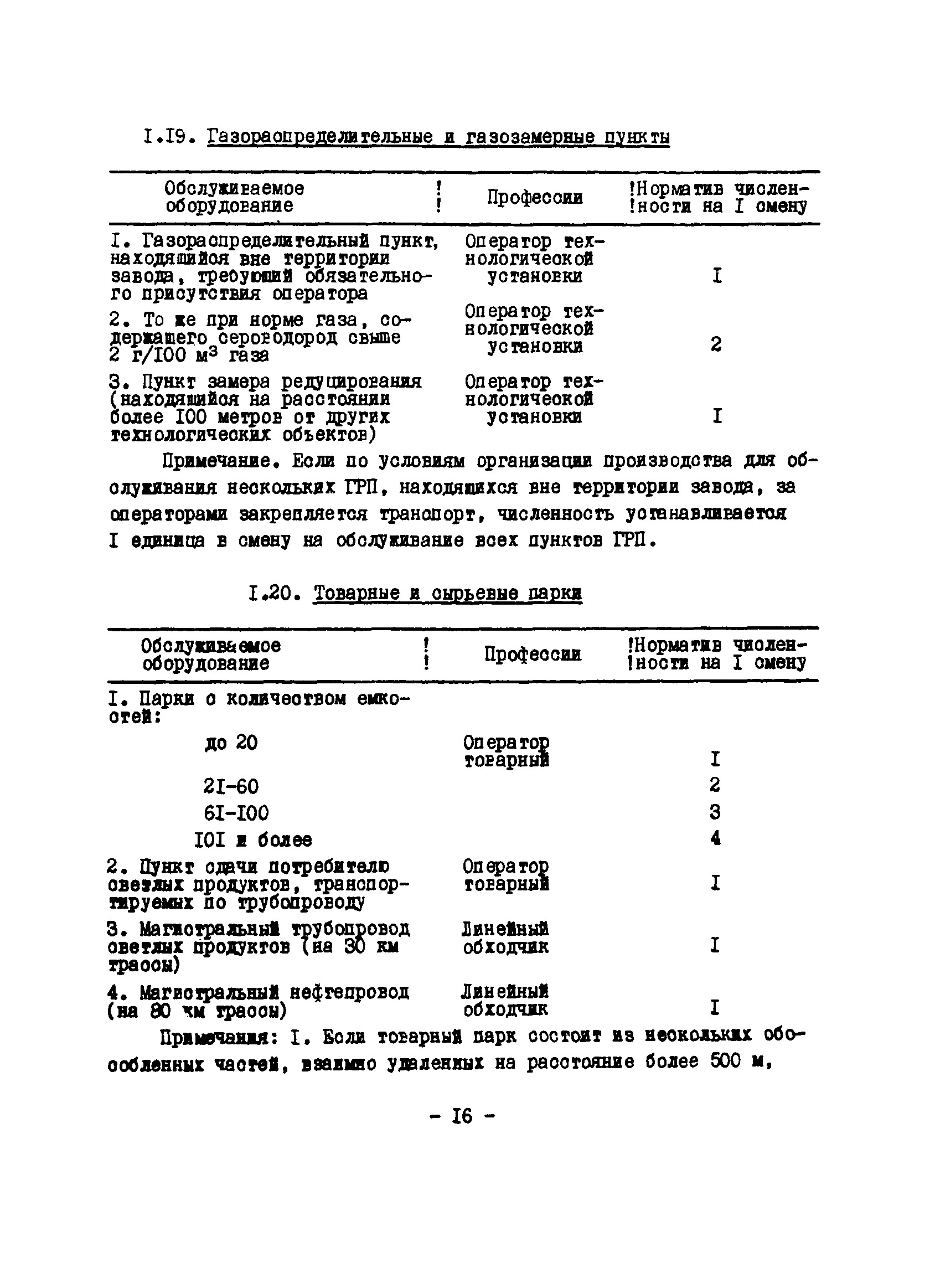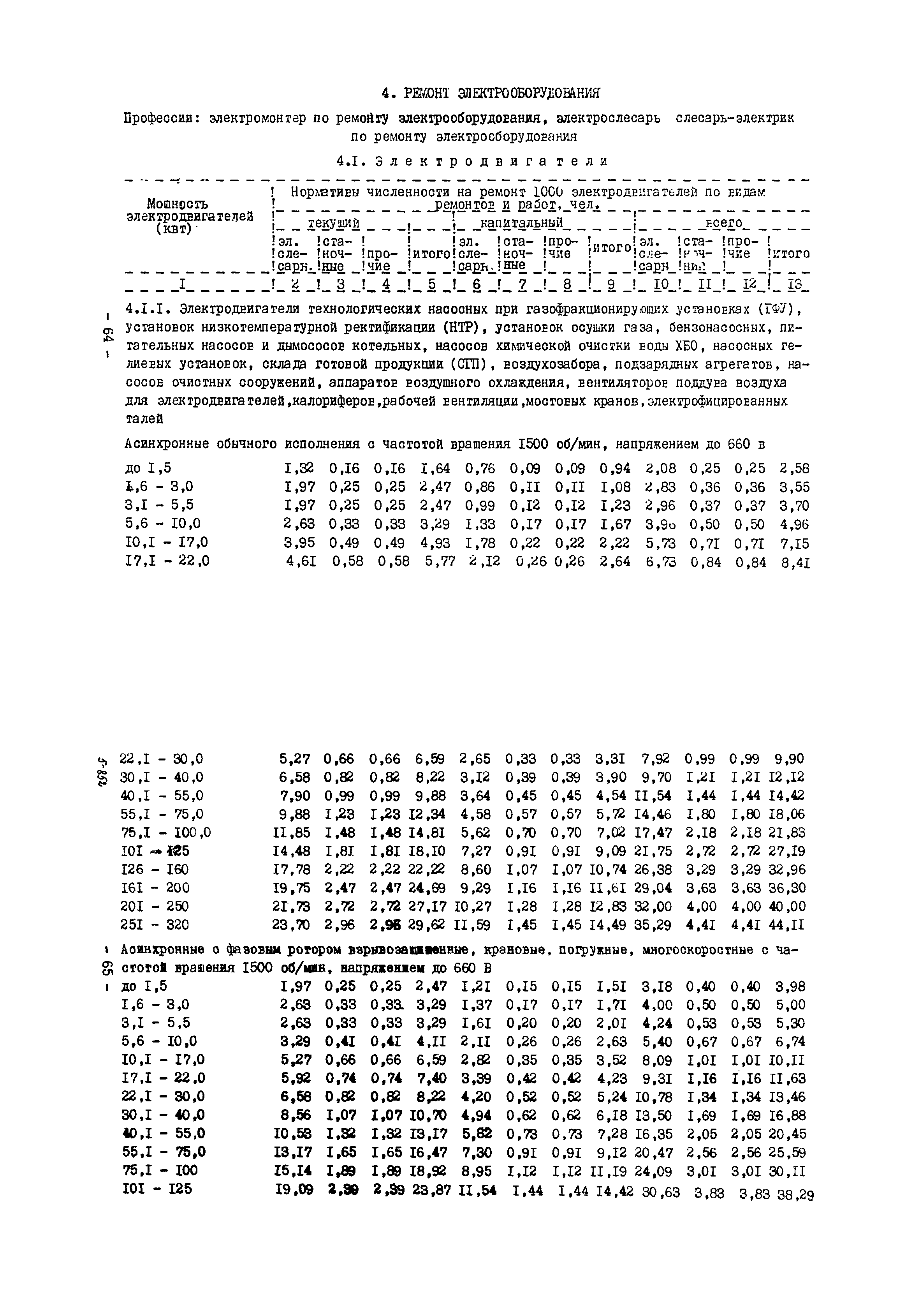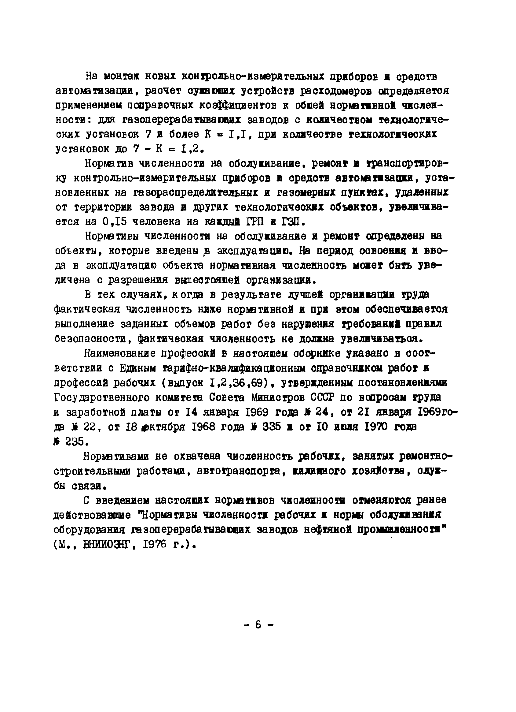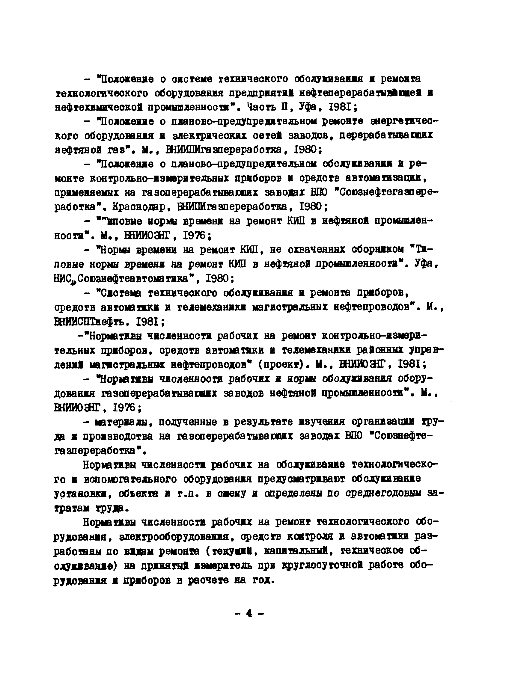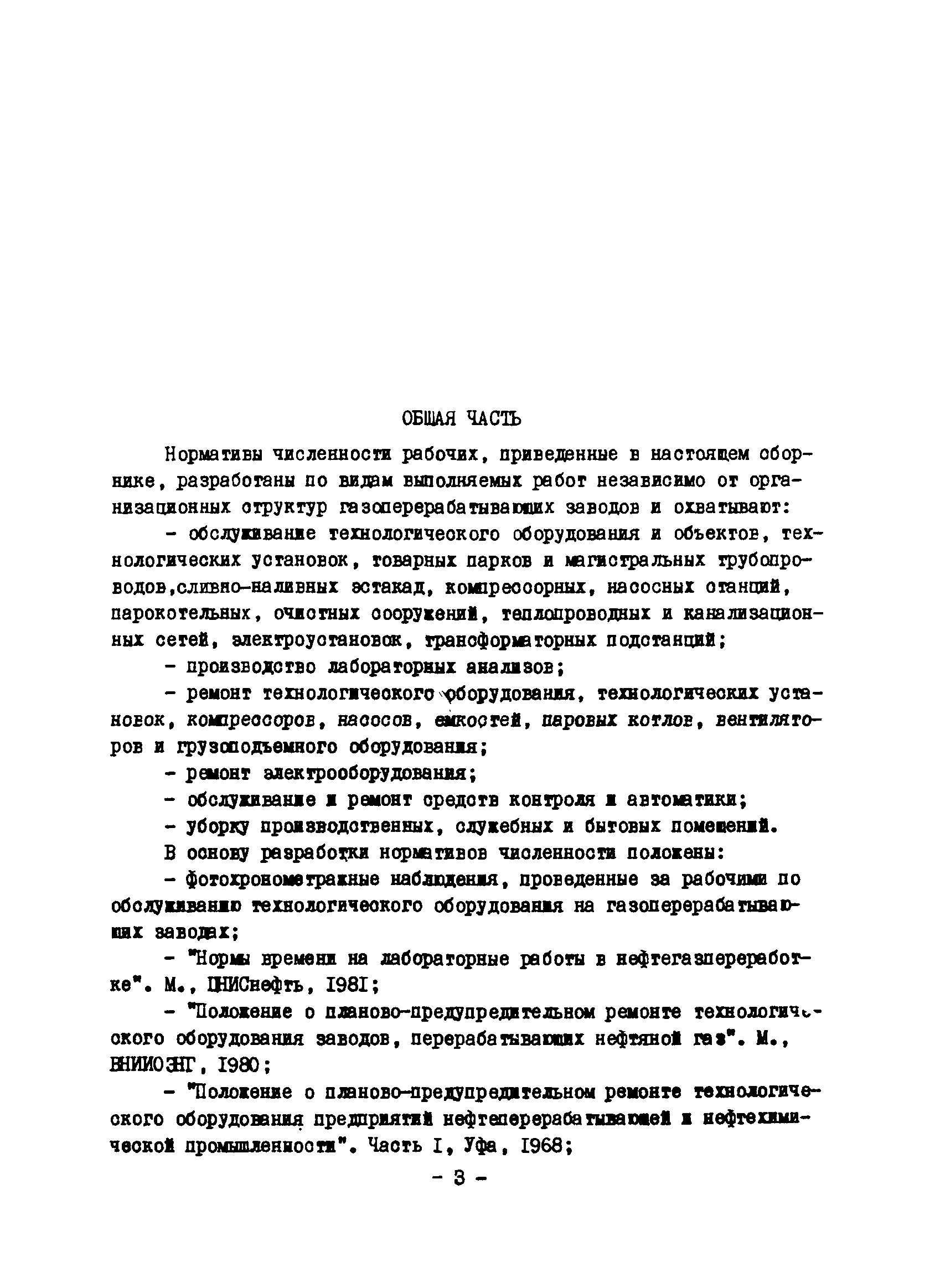 Нормативы численности рабочих газоперерабатывающих заводов нефтяной промышленности| Статус: | не действует | | Название рус.: | Нормативы численности рабочих газоперерабатывающих заводов нефтяной промышленности | | Дата добавления в базу: | 01.09.2013 | | Дата актуализации: | 01.01.2021 | | Область применения: | Нормативы численности предназначены для определения потребной численности и расстановки рабочих по рабочим местам на предприятиях ВПО “Союзнефтегазпереработка” Министерства нефтяной промышленности. | | Оглавление: | Общая часть 1. 0бслуживание технологического и вспомогательного оборудования 1.1. Установка по осушке и очистке газа 1.2. Установка низкотемпературной конденсации и осушке газа 1.3. Установка низкотемпературной конденсации и ректификация газа 1.4.Устаковка деэтанизации газа 1.5. Установка получения этана 1.6. Установка серочистки 1.7. Установка по выработке элементарной серы 1.8. Установка по переработке газового конденсата 1.9. Комбинированная установка комплексной подготовки нефти и газа 1.10. Маслоабсорбционная установка (МАУ) 1.11. Газофракционирующая установка (ГФУ) 1.12. Абсорбционно-газофракционирующая установка (АГФУ) 1.13.Уставовка по выработке гелия 1.14. Пропано-холодильная установка 1.15. Холодильная установка каскадного типа 1.16. Азотно-кислородная установка, станция 1.17. Аммиачно-холодильная установка 1.18. Установка получения пентана 1.19. Газораспределительные и газозамерные пункты 1.20. Товарные и сырьевые парки 1.21. Сливно-наливная эстакада 1.22. Компрессорные 1.23. Площадка охлаждения и сепарации 1.24. Комплексная технологическая установка, оснащенная комплексным импортным оборудованием фирмы «Флуор» 1.25. Пункт (установка) регенерации масел 1.26. Установка регенерации этиленгликоля 1.27. Насосные товарных парков, эстакад и водоснабжения 1.28. Очистные сооружения, ловушечное хозяйство 1.29. Реагентное хозяйство 1.30. Установки химической очистки и умягчение воды (оборотное водоснабжение и нейтрализация воды) 1.31. Парокотельные 1.32. Тепло-паро-водопроводные и канализационные сети 1.33. Артезианские скважины 2. Производство лабораторных работ (анализов) 2.1. Подготовительные работы 2.2. Анализы газов 2.3. Анализы бензина 2.4. Анализы масел и других нефтепродуктов 2.5. Анализы электролита 2.6. Анализы воды 2.7. Анализы серы 2.8. Анализы растворителей 2.9. Прочие работы 3 Ремонт технологического оборудования 3.1. Оборудование технологических установок 3.2. Компрессоры 3.3. Насосы 3.4. Котлы, вентиляторы 3.5. Емкости, резервуары 3.6. Грузоподъемное оборудование 3.7.Регенерационная установка 4 Ремонт оборудования 4.1. Электродвигатели 4.2. Трансформаторы 4.3. Аппараты напряжением выше 1000 В 4.4. Аппараты напряжением до 1000 В 4.5. Оборудование (элементы) электрического освещения 4.6. Электротехнологическое оборудование 4.7. Установки конденсаторные 4.8. Батареи аккумуляторные 4.9. Релейная защита, электроавтоматика и вторичные цепи 4.10. Электрические сети 4.11. Заземляющие устройства 4.12. Испытание защитных средств 4.13. Обслуживание электрооборудования технологических установок и объектов 5. Обслуживание и ремонт средств контроля и автоматики 5.1. Приборы системы «АУС» и «СТАРТ» 5.2. Приборы для измерения температуры 5.3. Приборы расхода и уровня, диафрагмы, регуляторы 5.4. Приборы для измерения давления, регуляторы давления 5.5. Приборы качества, газосигнализаторы 5.6. Исполнительные мех