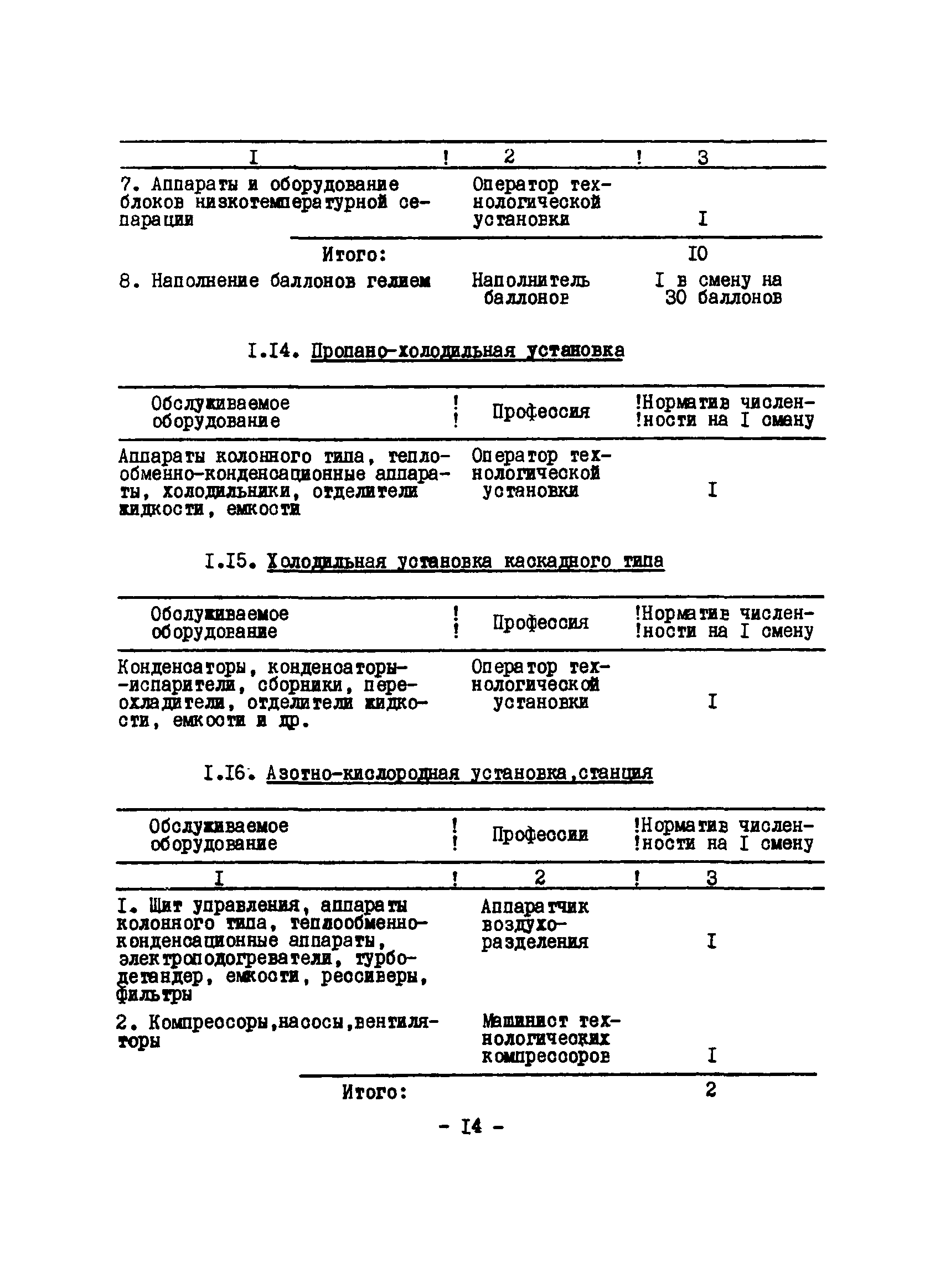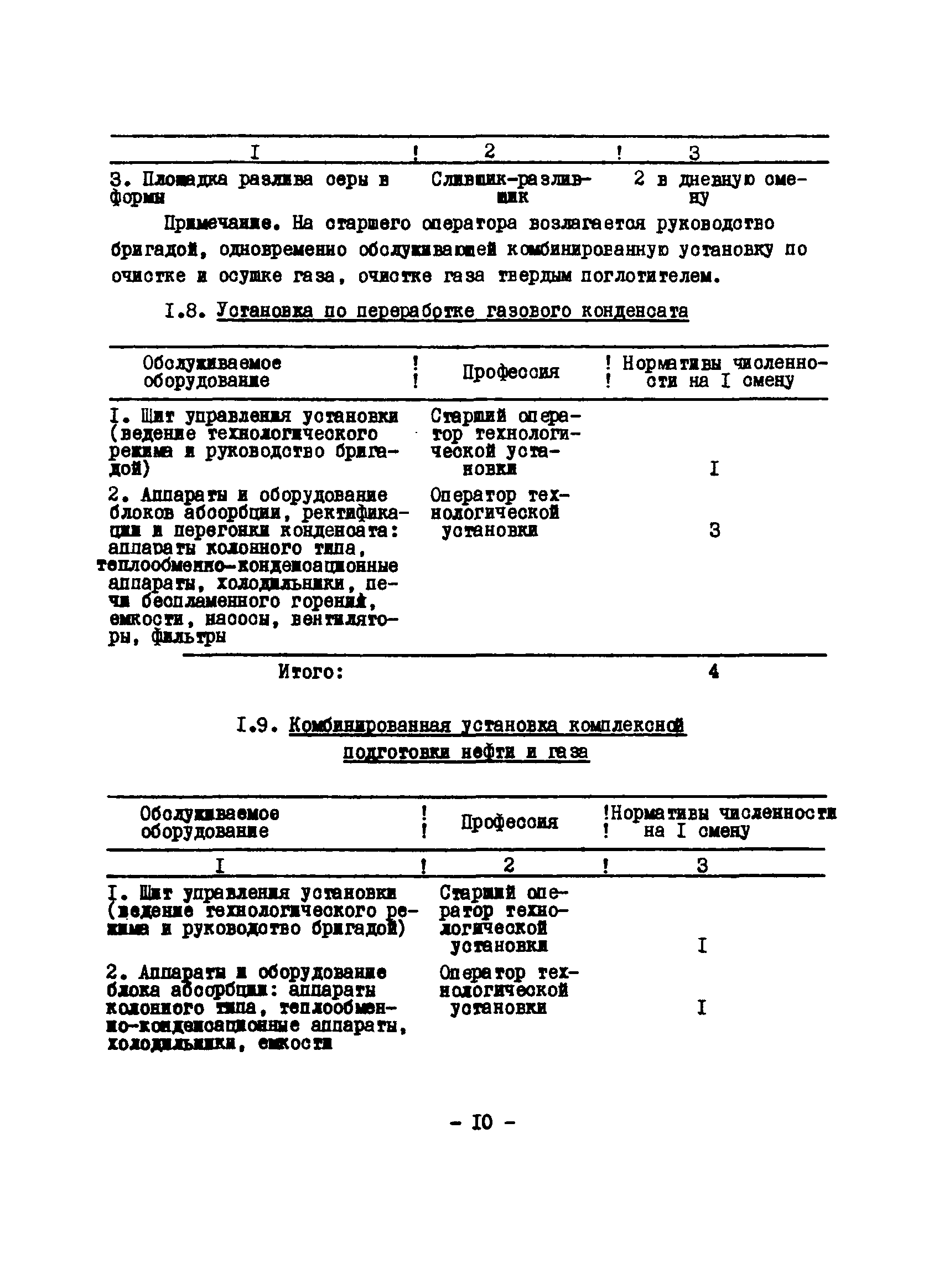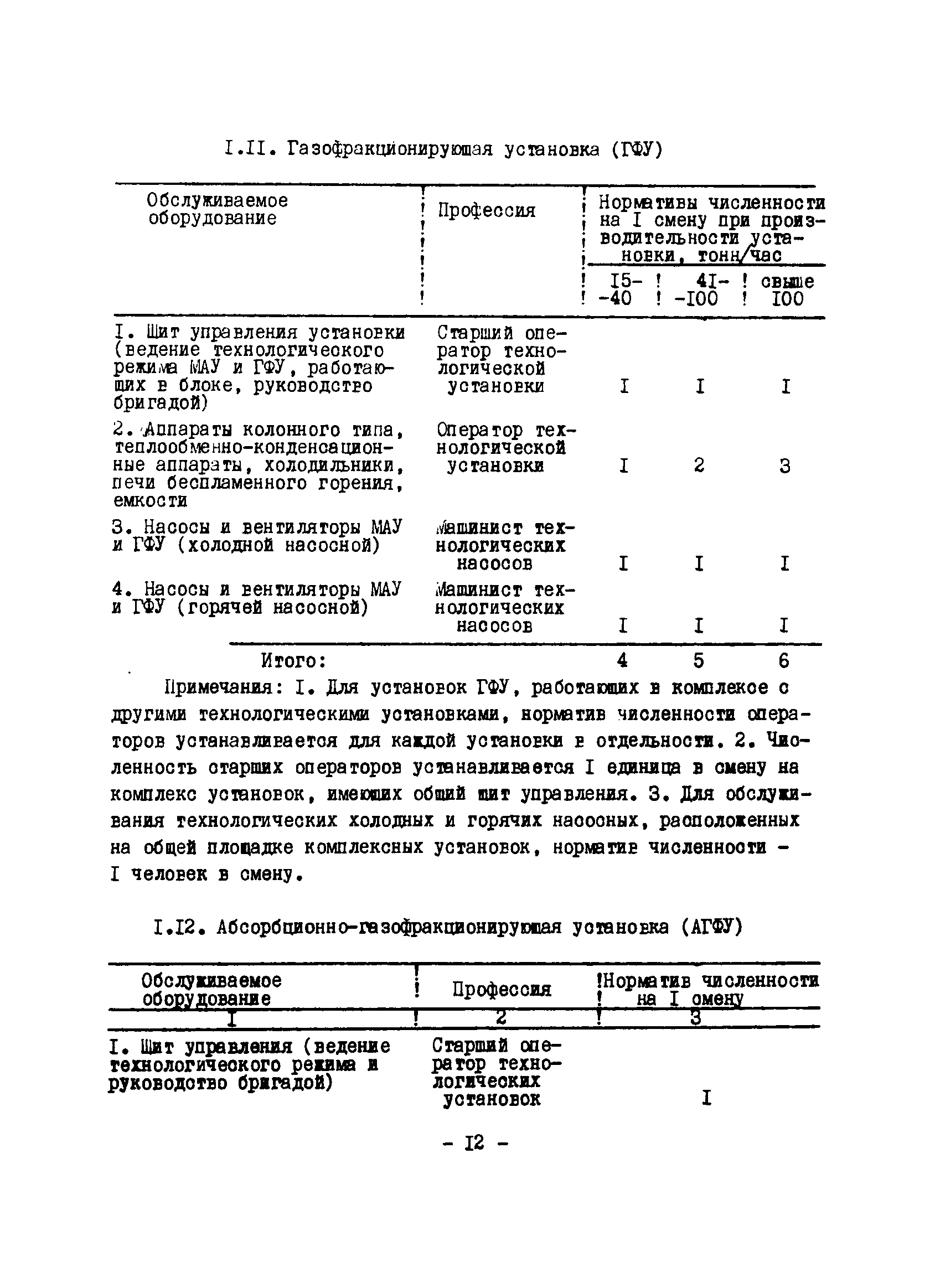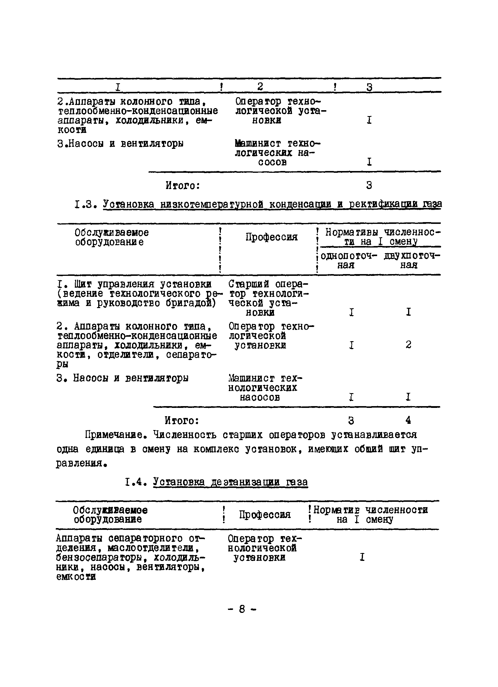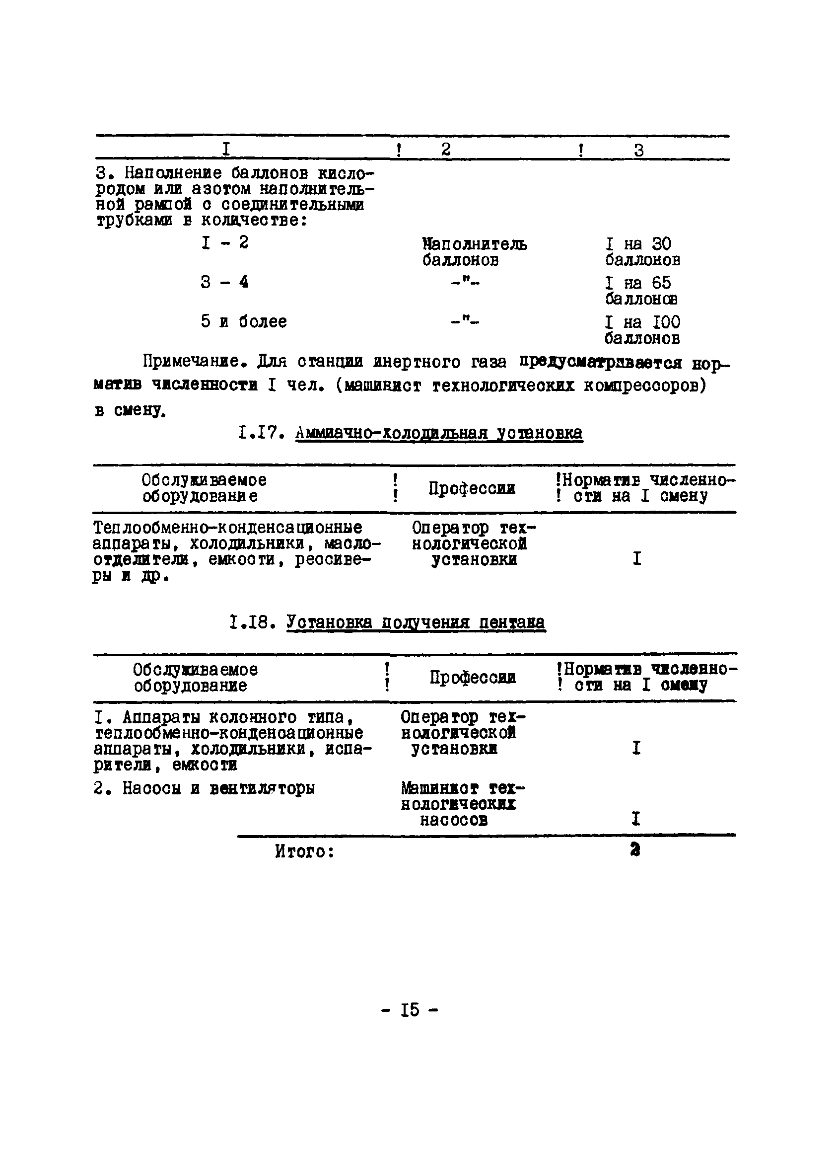Нормативы численности рабочих газоперерабатывающих заводов нефтяной промышленности| Статус: | не действует | | Название рус.: | Нормативы численности рабочих газоперерабатывающих заводов нефтяной промышленности | | Дата добавления в базу: | 01.09.2013 | | Дата актуализации: | 01.01.2021 | | Область применения: | Нормативы численности предназначены для определения потребной численности и расстановки рабочих по рабочим местам на предприятиях ВПО “Союзнефтегазпереработка” Министерства нефтяной промышленности. | | Оглавление: | Общая часть 1. 0бслуживание технологического и вспомогательного оборудования 1.1. Установка по осушке и очистке газа 1.2. Установка низкотемпературной конденсации и осушке газа 1.3. Установка низкотемпературной конденсации и ректификация газа 1.4.Устаковка деэтанизации газа 1.5. Установка получения этана 1.6. Установка серочистки 1.7. Установка по выработке элементарной серы 1.8. Установка по переработке газового конденсата 1.9. Комбинированная установка комплексной подготовки нефти и газа 1.10. Маслоабсорбционная установка (МАУ) 1.11. Газофракционирующая установка (ГФУ) 1.12. Абсорбционно-газофракционирующая установка (АГФУ) 1.13.Уставовка по выработке гелия 1.14. Пропано-холодильная установка 1.15. Холодильная установка каскадного типа 1.16. Азотно-кислородная установка, станция 1.17. Аммиачно-холодильная установка 1.18. Установка получения пентана 1.19. Газораспределительные и газозамерные пункты 1.20. Товарные и сырьевые парки 1.21. Сливно-наливная эстакада 1.22. Компрессорные 1.23. Площадка охлаждения и сепарации 1.24. Комплексная технологическая установка, оснащенная комплексным импортным оборудованием фирмы «Флуор» 1.25. Пункт (установка) регенерации масел 1.26. Установка регенерации этиленгликоля 1.27. Насосные товарных парков, эстакад и водоснабжения 1.28. Очистные сооружения, ловушечное хозяйство 1.29. Реагентное хозяйство 1.30. Установки химической очистки и умягчение воды (оборотное водоснабжение и нейтрализация воды) 1.31. Парокотельные 1.32. Тепло-паро-водопроводные и канализационные сети 1.33. Артезианские скважины 2. Производство лабораторных работ (анализов) 2.1. Подготовительные работы 2.2. Анализы газов 2.3. Анализы бензина 2.4. Анализы масел и других нефтепродуктов 2.5. Анализы электролита 2.6. Анализы воды 2.7. Анализы серы 2.8. Анализы растворителей 2.9. Прочие работы 3 Ремонт технологического оборудования 3.1. Оборудование технологических установок 3.2. Компрессоры 3.3. Насосы 3.4. Котлы, вентиляторы 3.5. Емкости, резервуары 3.6. Грузоподъемное оборудование 3.7.Регенерационная установка 4 Ремонт оборудования 4.1. Электродвигатели 4.2. Трансформаторы 4.3. Аппараты напряжением выше 1000 В 4.4. Аппараты напряжением до 1000 В 4.5. Оборудование (элементы) электрического освещения 4.6. Электротехнологическое оборудование 4.7. Установки конденсаторные 4.8. Батареи аккумуляторные 4.9. Релейная защита, электроавтоматика и вторичные цепи 4.10. Электрические сети 4.11. Заземляющие устройства 4.12. Испытание защитных средств 4.13. Обслуживание электрооборудования технологических установок и объектов 5. Обслуживание и ремонт средств контроля и автоматики 5.1. Приборы системы «АУС» и «СТАРТ» 5.2. Приборы для измерения температуры 5.3. Приборы расхода и уровня, диафрагмы, регуляторы 5.4. Приборы для измерения давления, регуляторы давления 5.5. Приборы качества, газосигнализаторы 5.6. Исполнительные мех