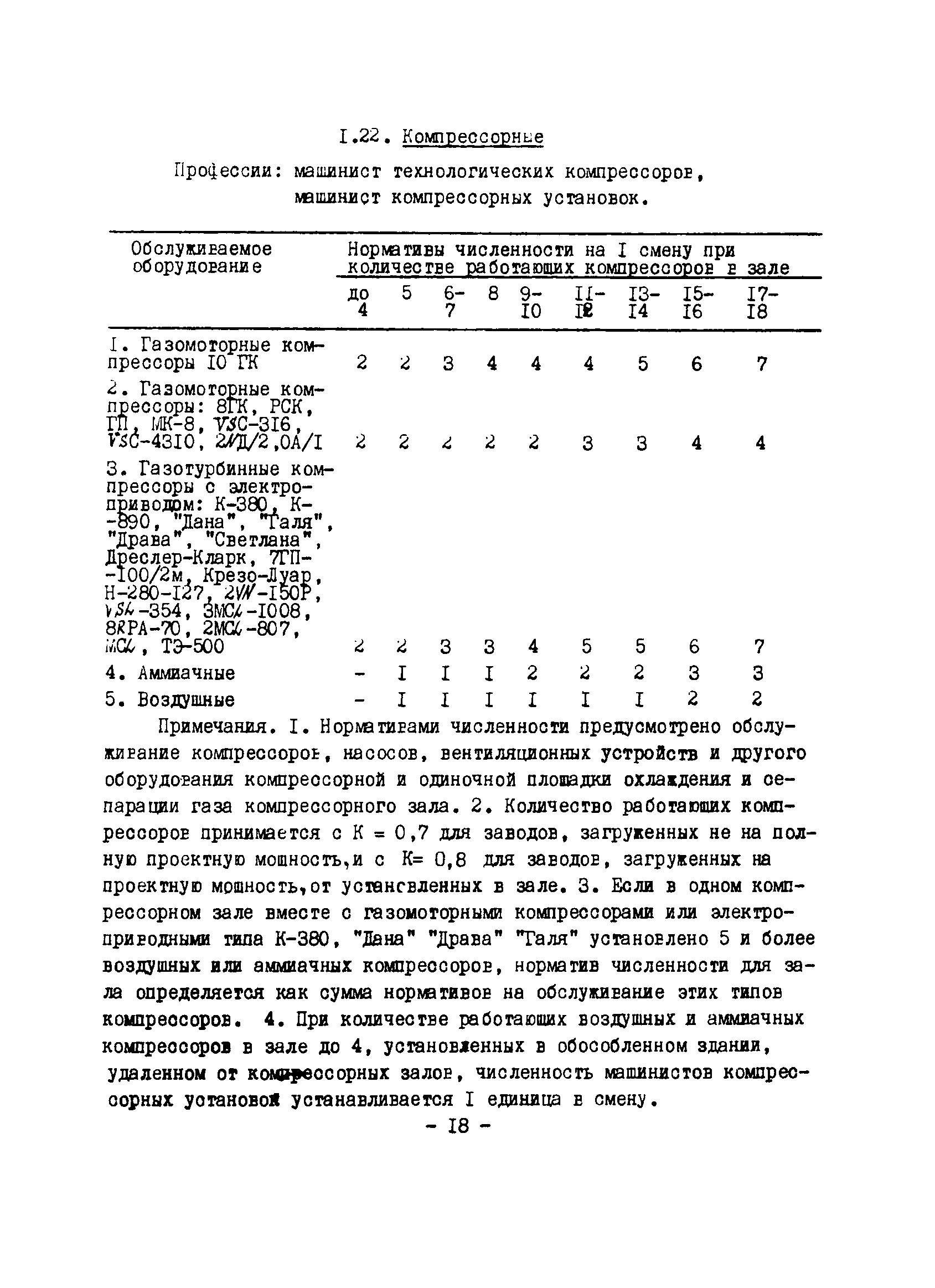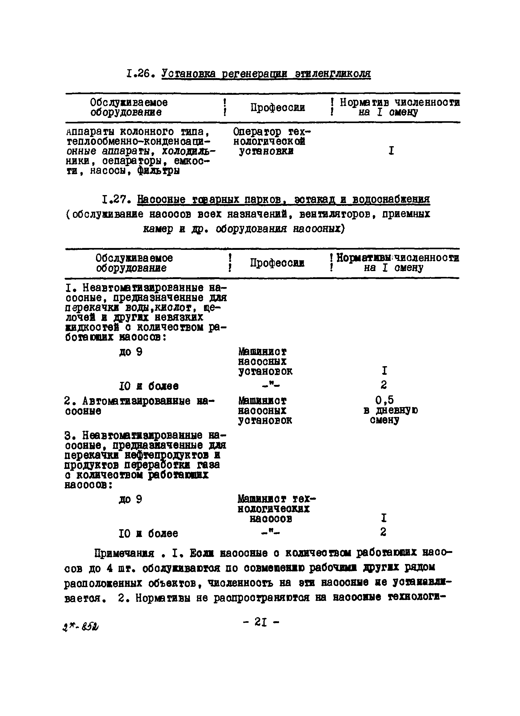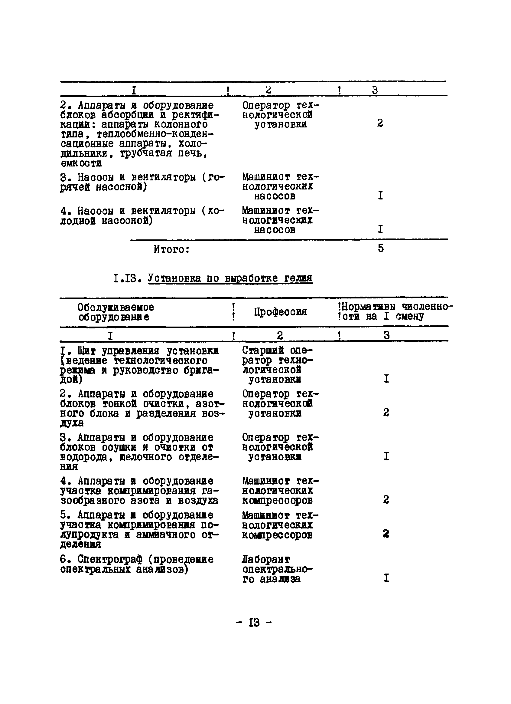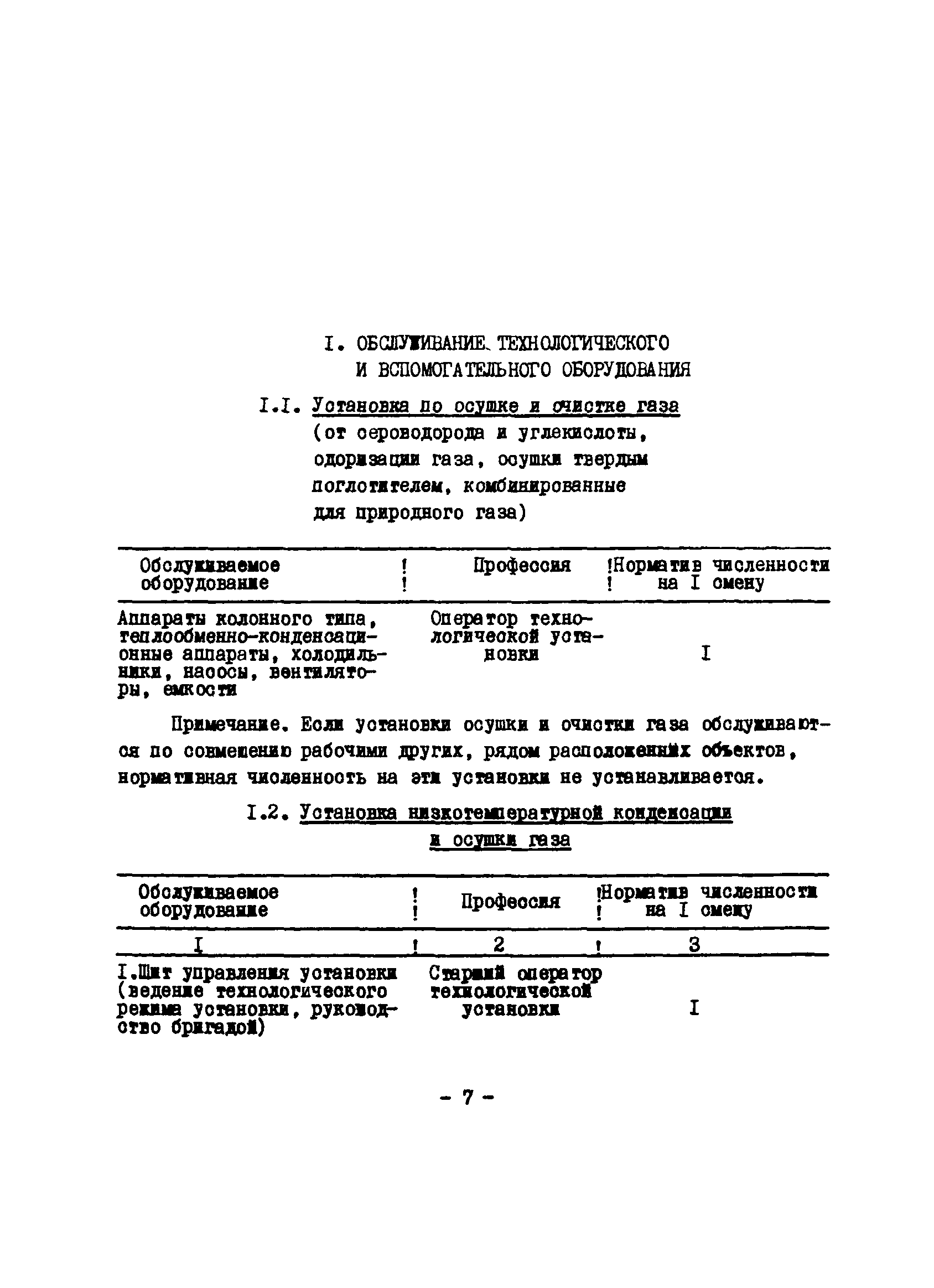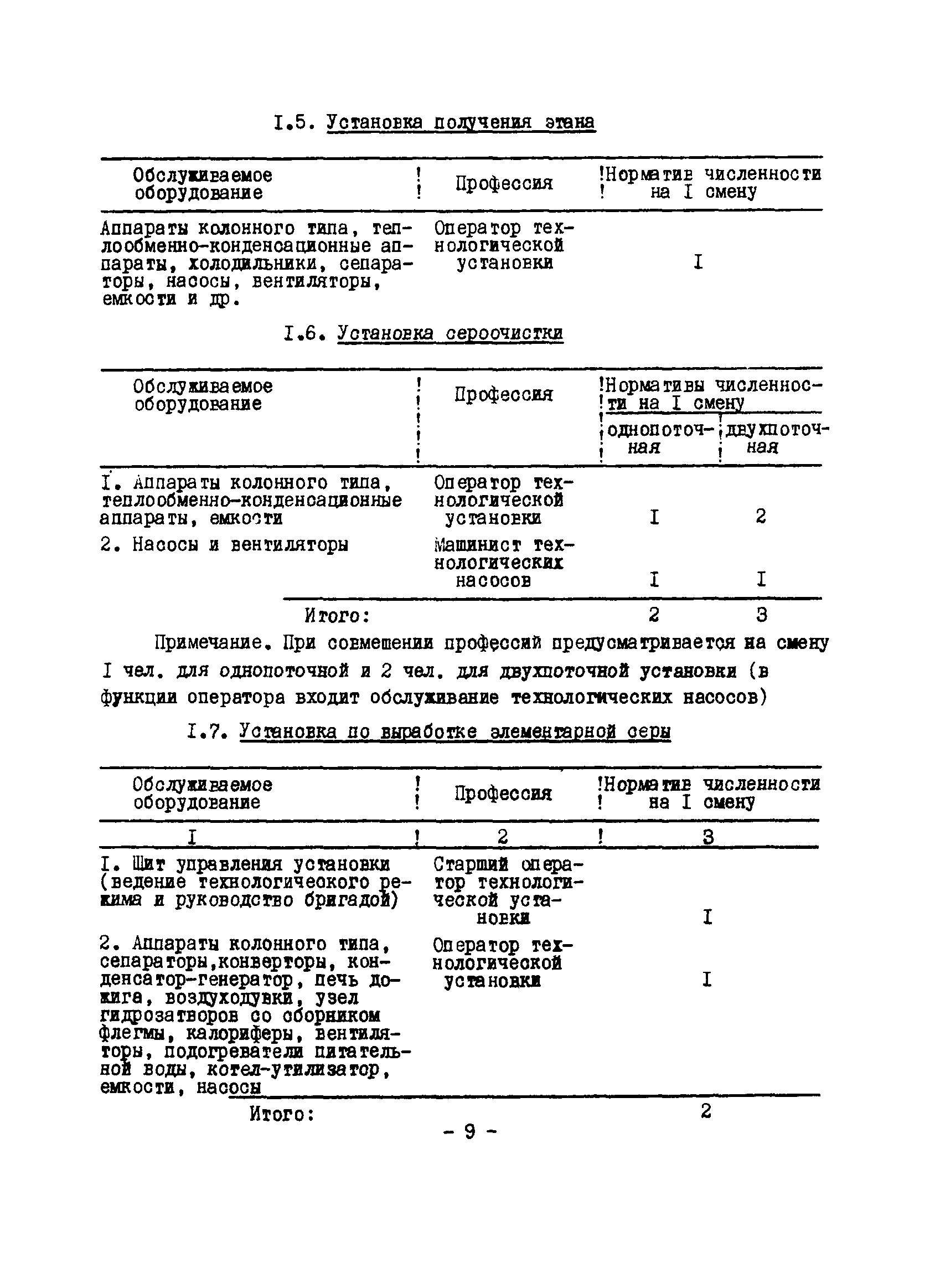 Нормативы численности рабочих газоперерабатывающих заводов нефтяной промышленности| Статус: | не действует | | Название рус.: | Нормативы численности рабочих газоперерабатывающих заводов нефтяной промышленности | | Дата добавления в базу: | 01.09.2013 | | Дата актуализации: | 01.01.2021 | | Область применения: | Нормативы численности предназначены для определения потребной численности и расстановки рабочих по рабочим местам на предприятиях ВПО “Союзнефтегазпереработка” Министерства нефтяной промышленности. | | Оглавление: | Общая часть 1. 0бслуживание технологического и вспомогательного оборудования 1.1. Установка по осушке и очистке газа 1.2. Установка низкотемпературной конденсации и осушке газа 1.3. Установка низкотемпературной конденсации и ректификация газа 1.4.Устаковка деэтанизации газа 1.5. Установка получения этана 1.6. Установка серочистки 1.7. Установка по выработке элементарной серы 1.8. Установка по переработке газового конденсата 1.9. Комбинированная установка комплексной подготовки нефти и газа 1.10. Маслоабсорбционная установка (МАУ) 1.11. Газофракционирующая установка (ГФУ) 1.12. Абсорбционно-газофракционирующая установка (АГФУ) 1.13.Уставовка по выработке гелия 1.14. Пропано-холодильная установка 1.15. Холодильная установка каскадного типа 1.16. Азотно-кислородная установка, станция 1.17. Аммиачно-холодильная установка 1.18. Установка получения пентана 1.19. Газораспределительные и газозамерные пункты 1.20. Товарные и сырьевые парки 1.21. Сливно-наливная эстакада 1.22. Компрессорные 1.23. Площадка охлаждения и сепарации 1.24. Комплексная технологическая установка, оснащенная комплексным импортным оборудованием фирмы «Флуор» 1.25. Пункт (установка) регенерации масел 1.26. Установка регенерации этиленгликоля 1.27. Насосные товарных парков, эстакад и водоснабжения 1.28. Очистные сооружения, ловушечное хозяйство 1.29. Реагентное хозяйство 1.30. Установки химической очистки и умягчение воды (оборотное водоснабжение и нейтрализация воды) 1.31. Парокотельные 1.32. Тепло-паро-водопроводные и канализационные сети 1.33. Артезианские скважины 2. Производство лабораторных работ (анализов) 2.1. Подготовительные работы 2.2. Анализы газов 2.3. Анализы бензина 2.4. Анализы масел и других нефтепродуктов 2.5. Анализы электролита 2.6. Анализы воды 2.7. Анализы серы 2.8. Анализы растворителей 2.9. Прочие работы 3 Ремонт технологического оборудования 3.1. Оборудование технологических установок 3.2. Компрессоры 3.3. Насосы 3.4. Котлы, вентиляторы 3.5. Емкости, резервуары 3.6. Грузоподъемное оборудование 3.7.Регенерационная установка 4 Ремонт оборудования 4.1. Электродвигатели 4.2. Трансформаторы 4.3. Аппараты напряжением выше 1000 В 4.4. Аппараты напряжением до 1000 В 4.5. Оборудование (элементы) электрического освещения 4.6. Электротехнологическое оборудование 4.7. Установки конденсаторные 4.8. Батареи аккумуляторные 4.9. Релейная защита, электроавтоматика и вторичные цепи 4.10. Электрические сети 4.11. Заземляющие устройства 4.12. Испытание защитных средств 4.13. Обслуживание электрооборудования технологических установок и объектов 5. Обслуживание и ремонт средств контроля и автоматики 5.1. Приборы системы «АУС» и «СТАРТ» 5.2. Приборы для измерения температуры 5.3. Приборы расхода и уровня, диафрагмы, регуляторы 5.4. Приборы для измерения давления, регуляторы давления 5.5. Приборы качества, газосигнализаторы 5.6. Исполнительные мех